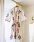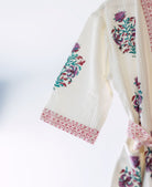 Soft, soothing, and handcrafted — the Gulbahar Buti Hand Block Bath Robe features delicate pink and blue buti motifs printed on a pure white base. Made from breathable Madurai waffle cotton, it offers lightweight comfort and excellent absorbency, making it perfect for relaxed mornings or post-shower ease.