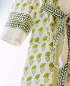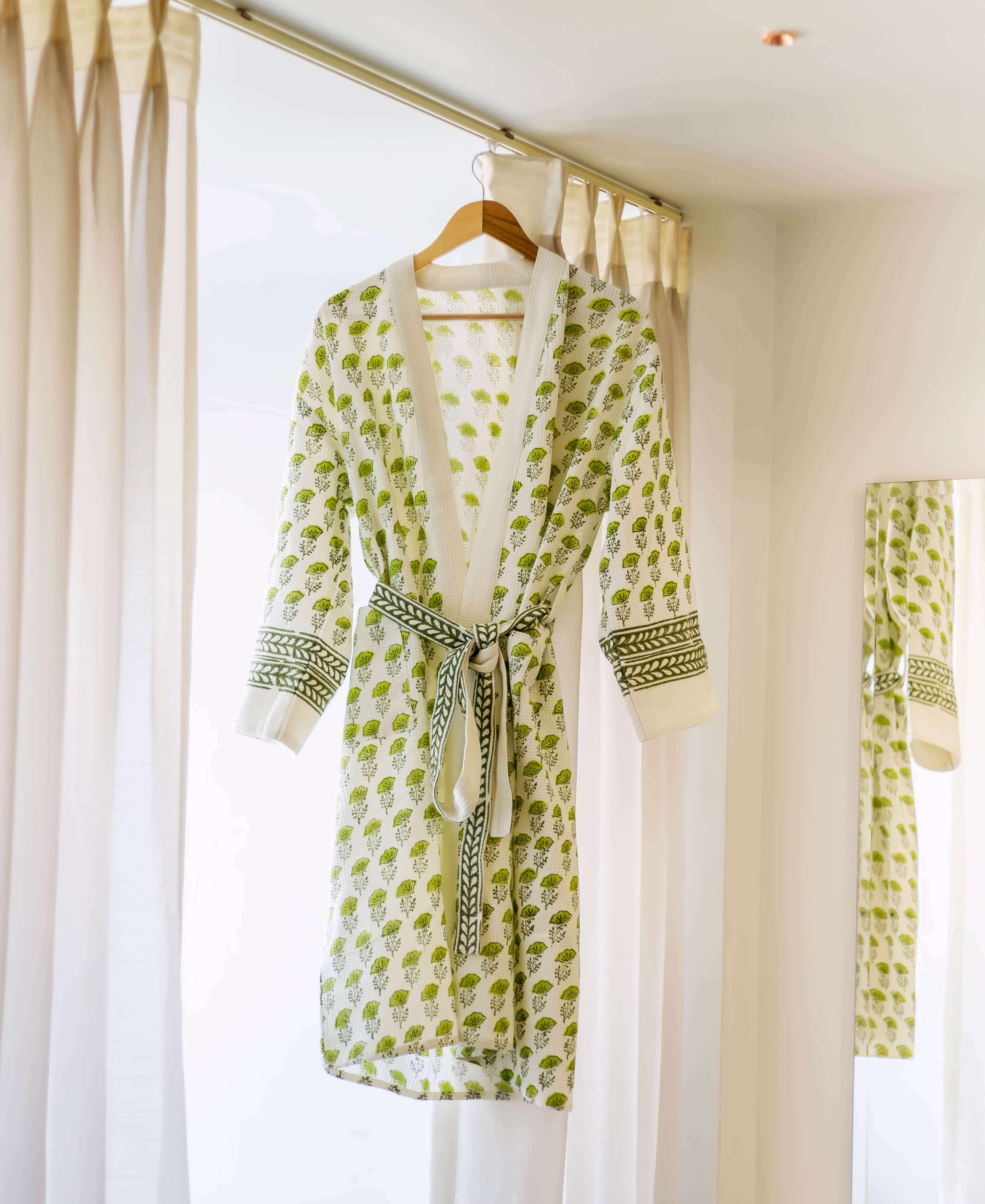 Wrap yourself in the freshness of handcrafted elegance with our Verdant Buti Hand Block Bath Robe. Adorned with delicate green buti motifs on a pristine white base, this robe is made from soft and breathable Madurai waffle cotton. Lightweight, absorbent, and beautifully detailed, it’s the perfect blend of comfort and artisanal charm.