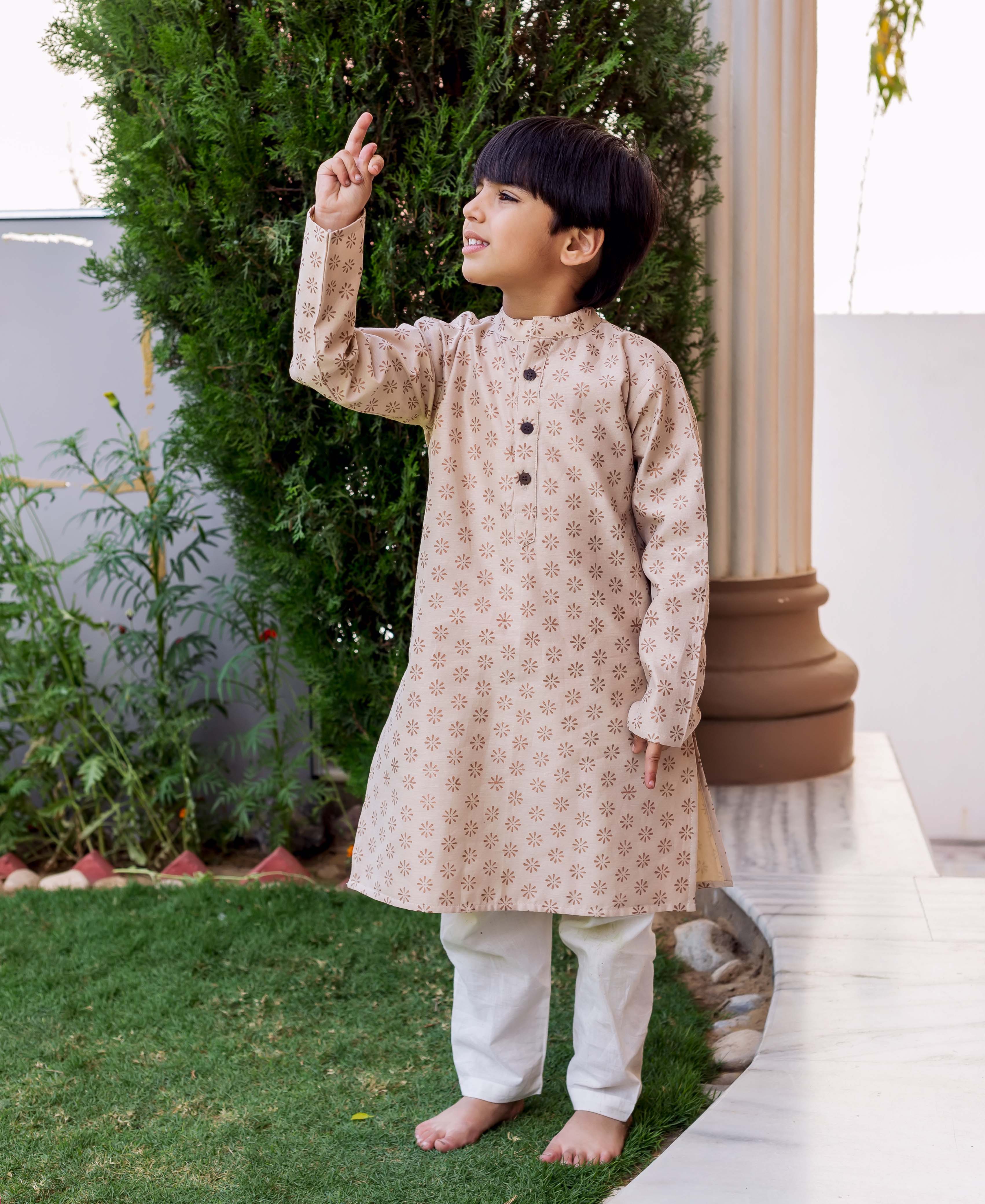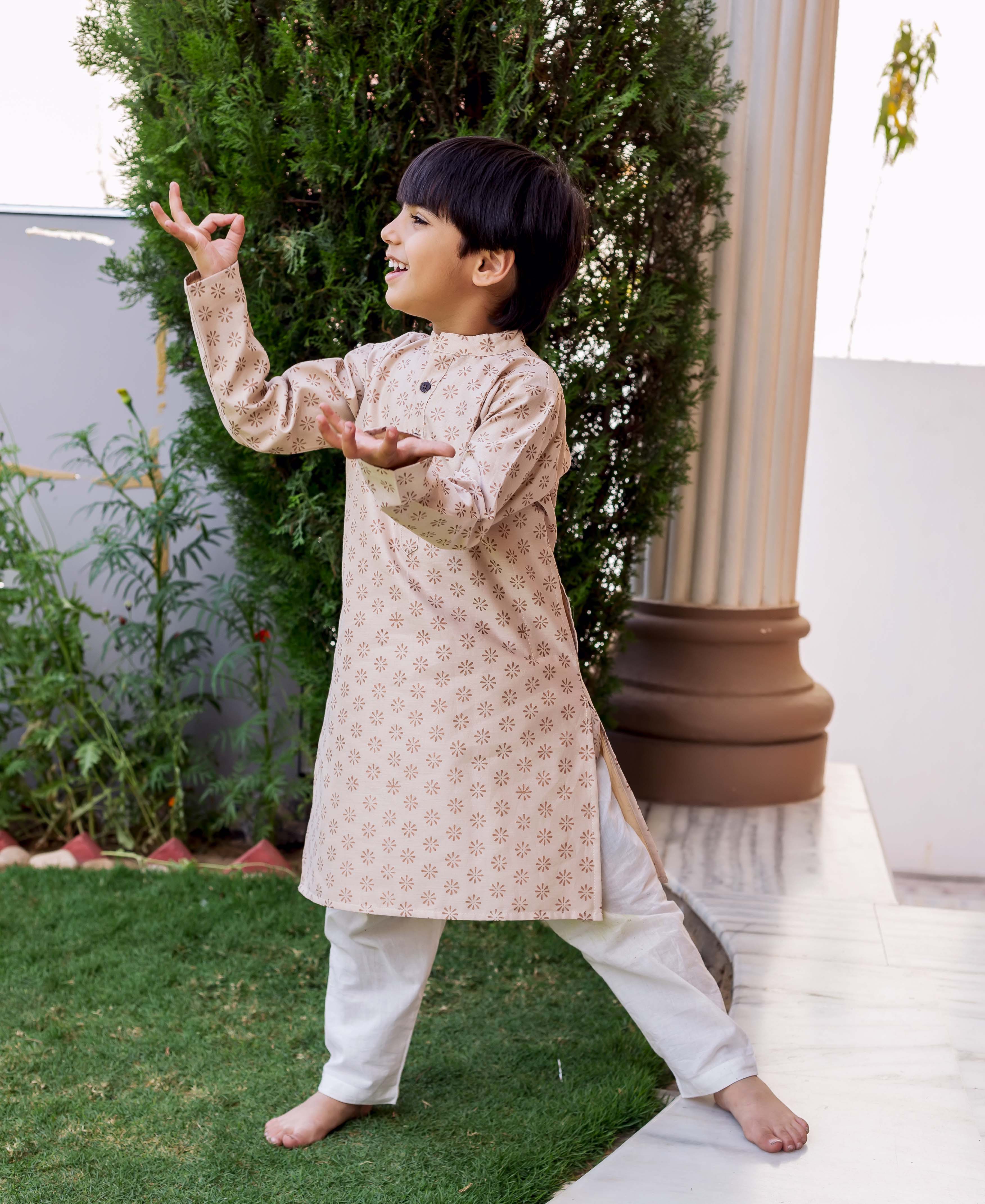 Beige Chanderi Block Printed Kurta Pajama Set