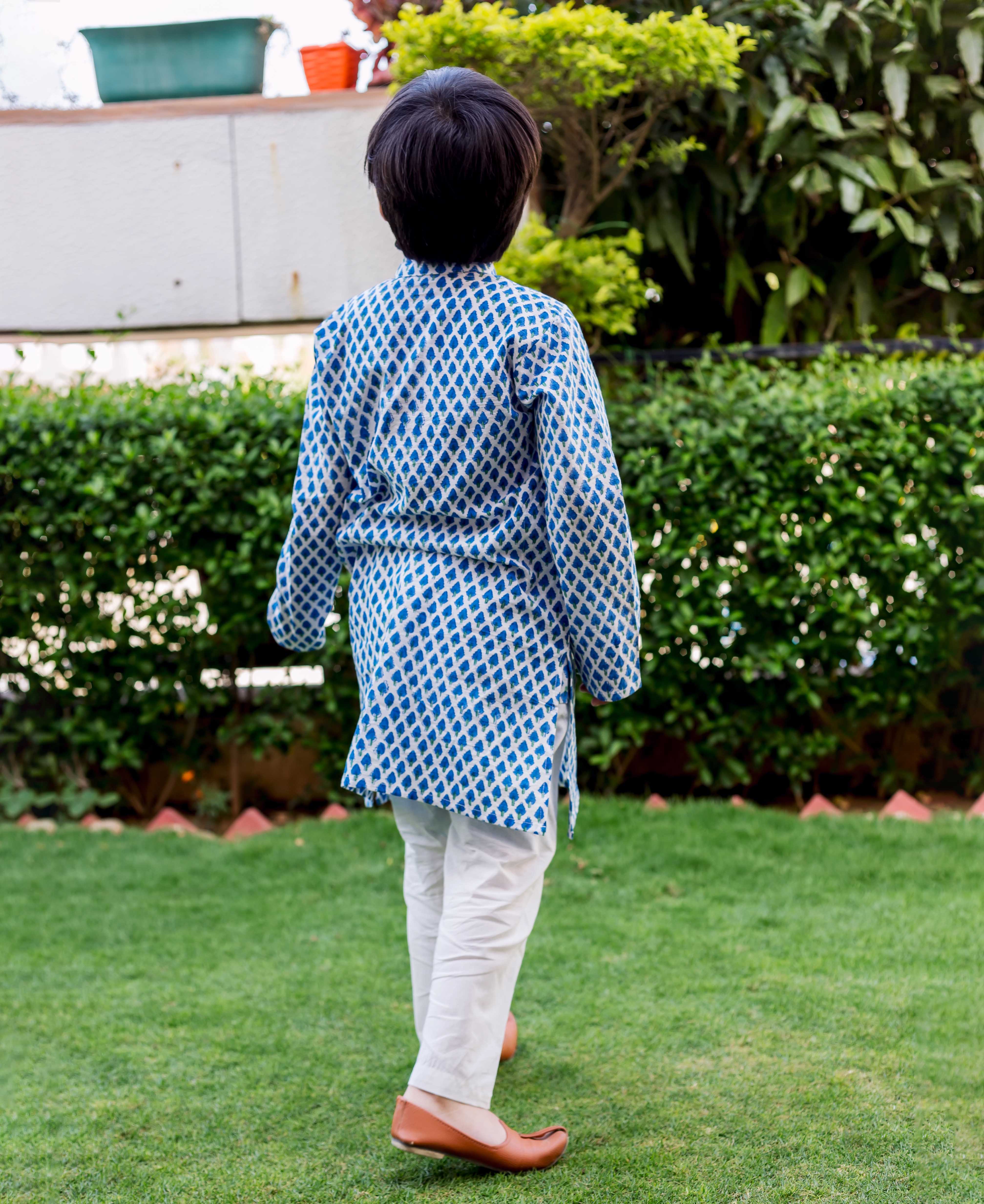 Cotton Blue and White Booti Printed Kurta Pajama Set