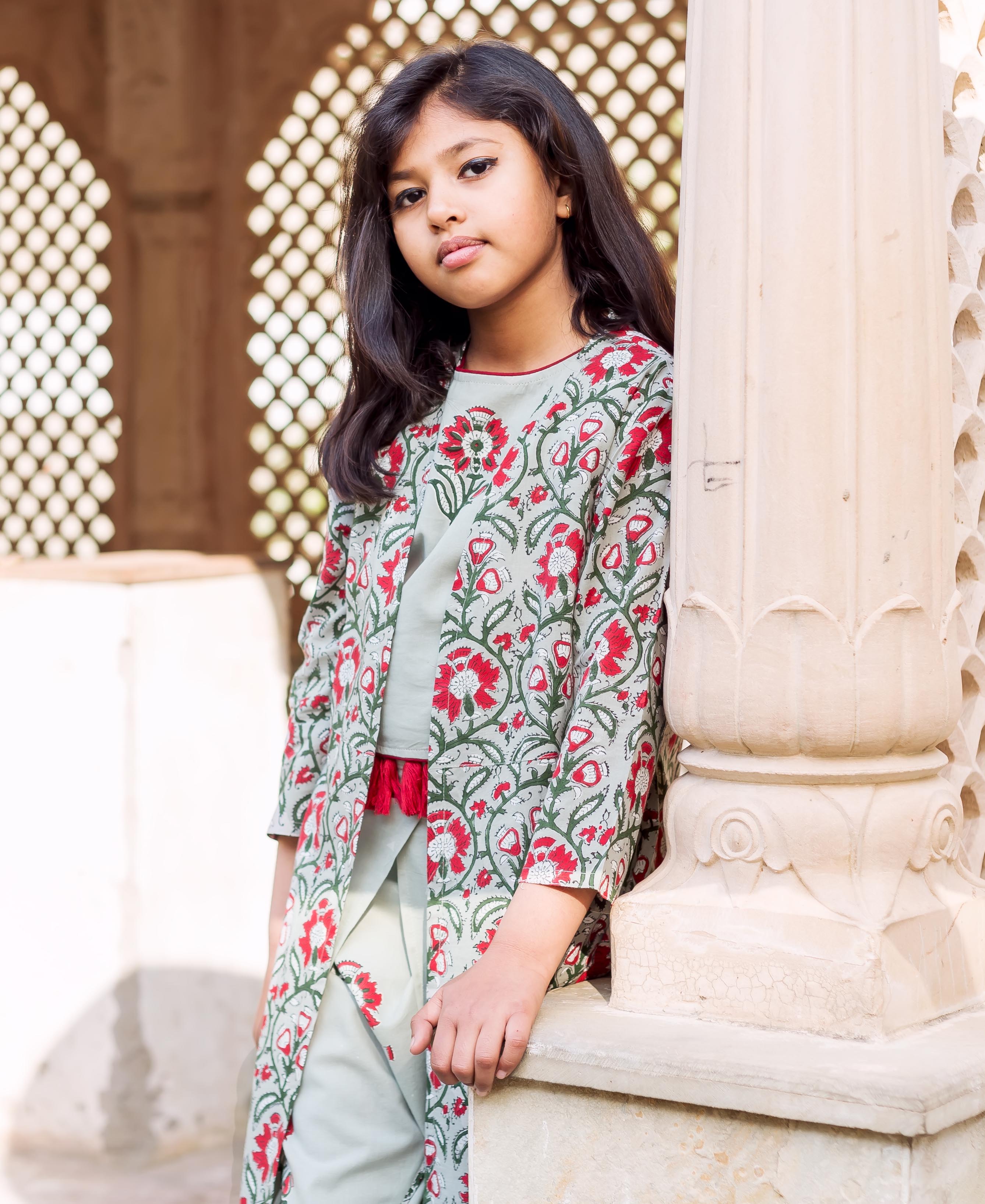 Frosty Mint Block Printed Crop Top with Dhoti and Detachable Jacket for Baby Girl