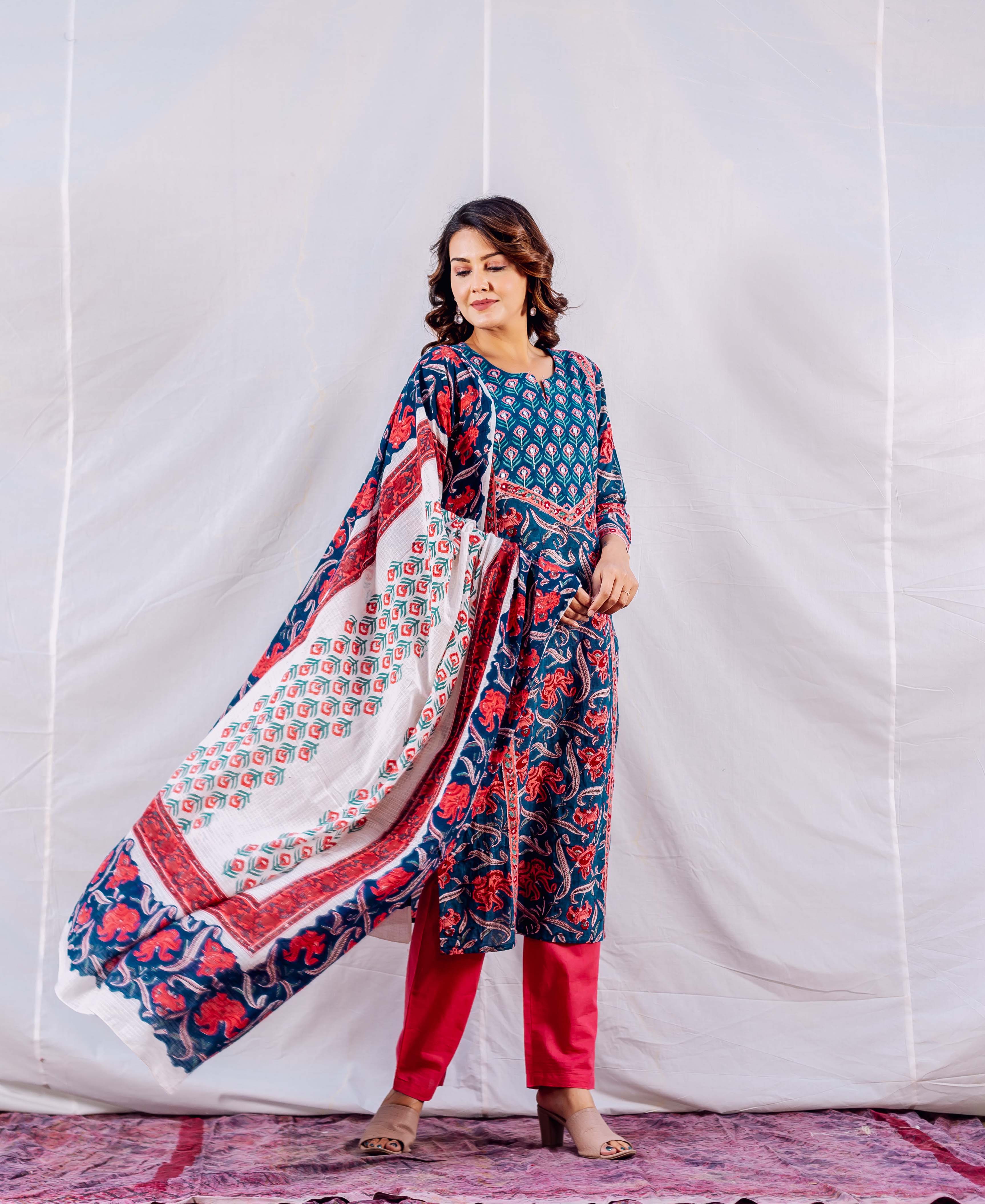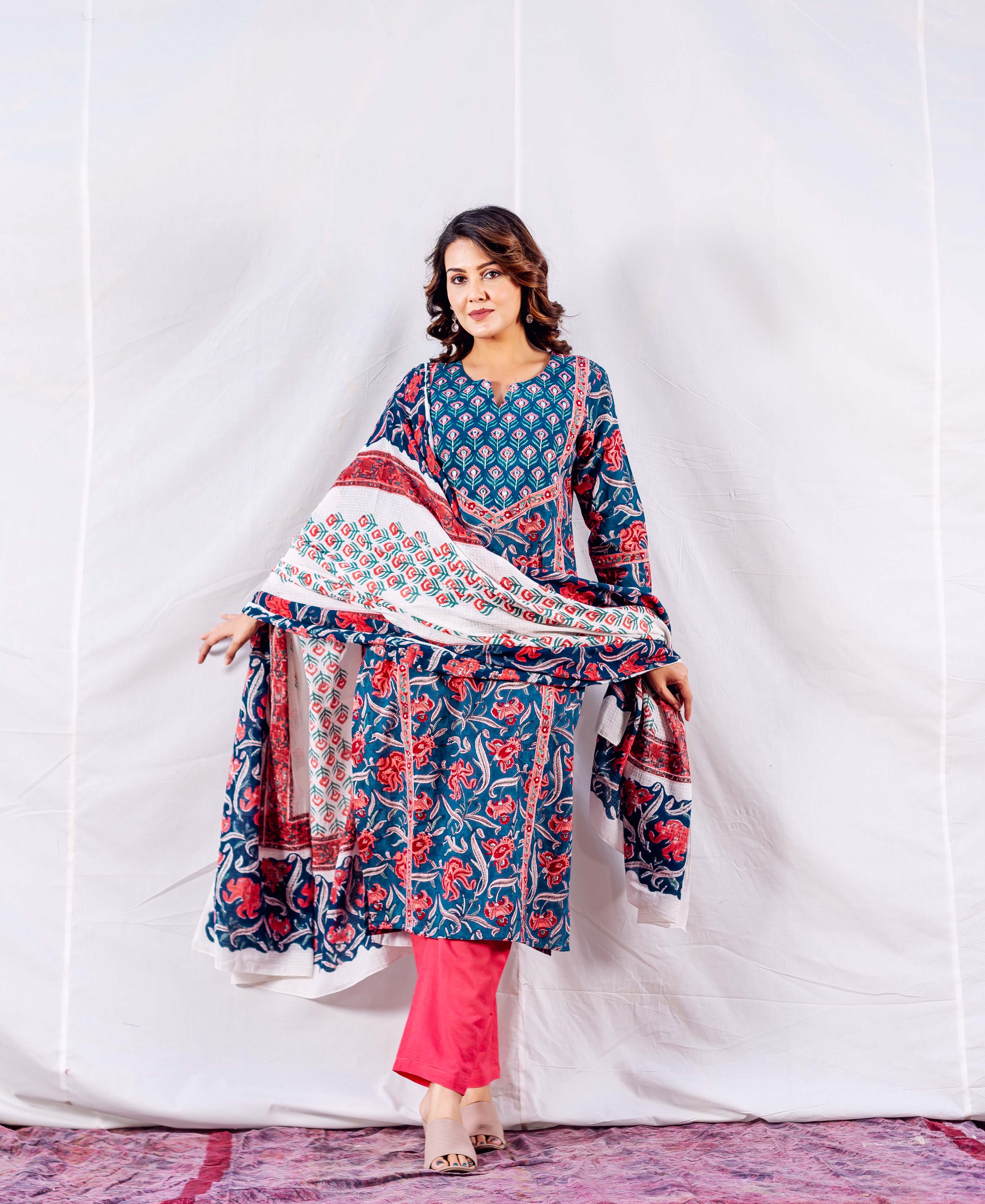 Blue Hand Block Printed Kaftan With Red Motifs