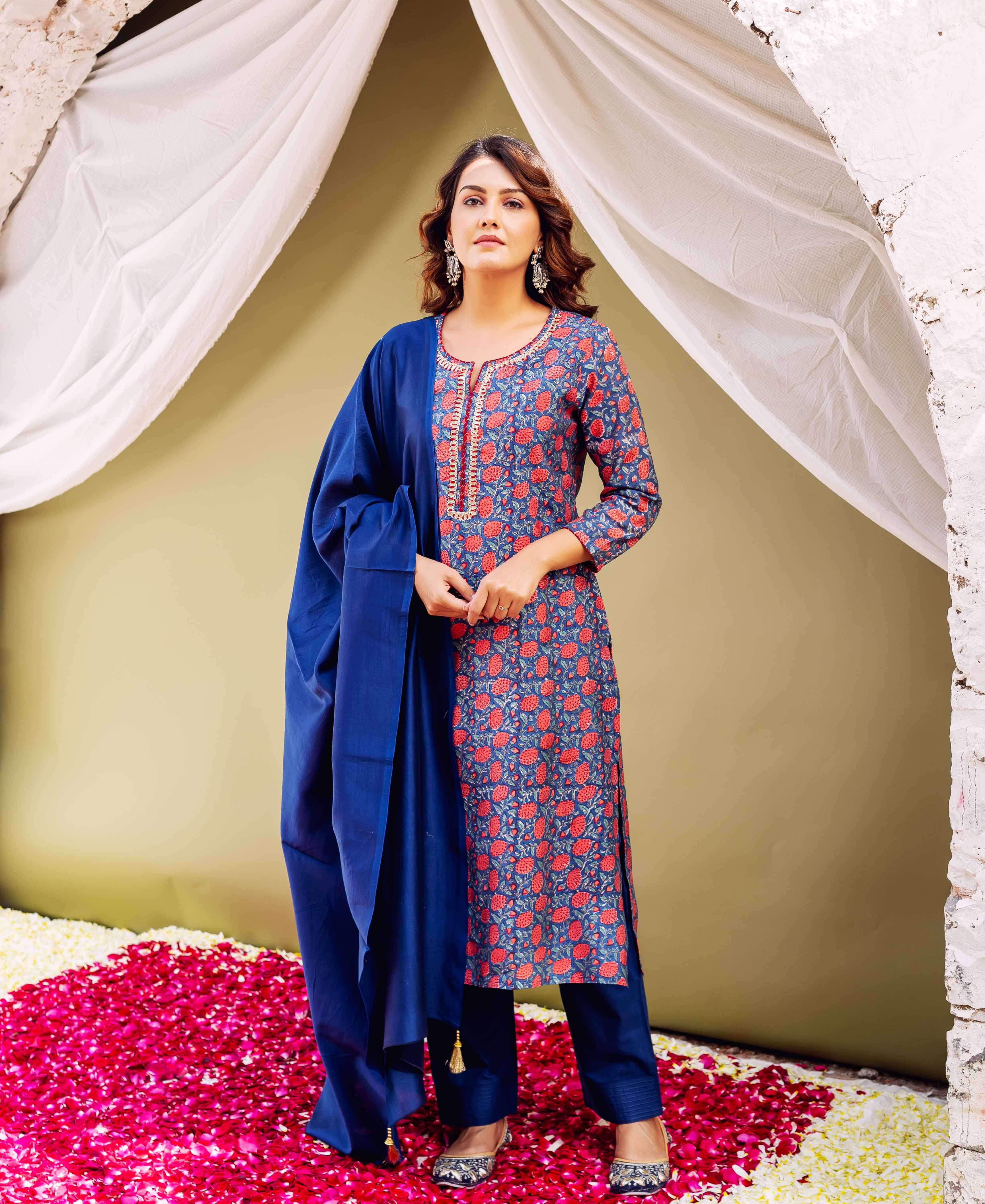 Blue and White Block Printed Cotton Kurta Pajama Set