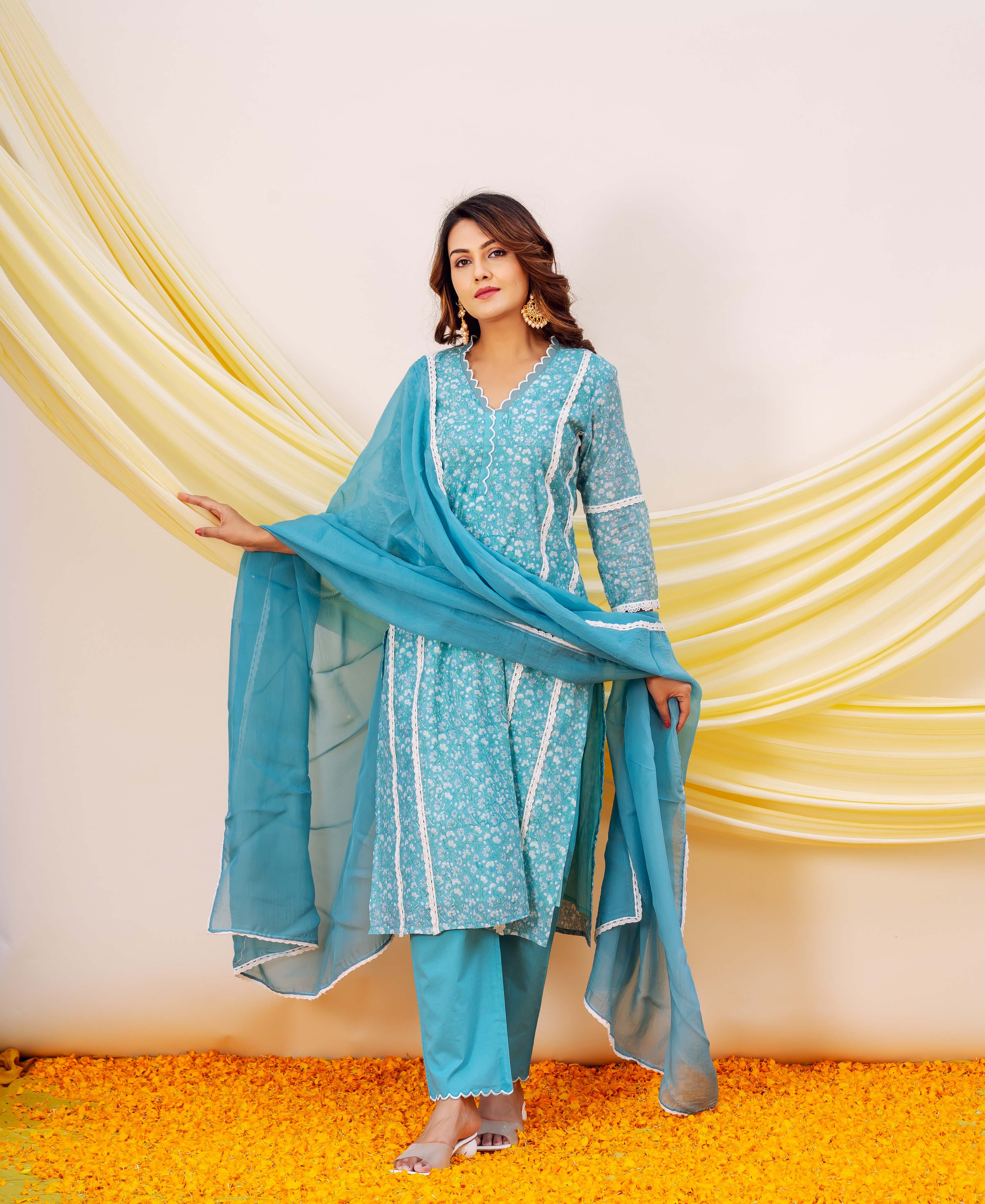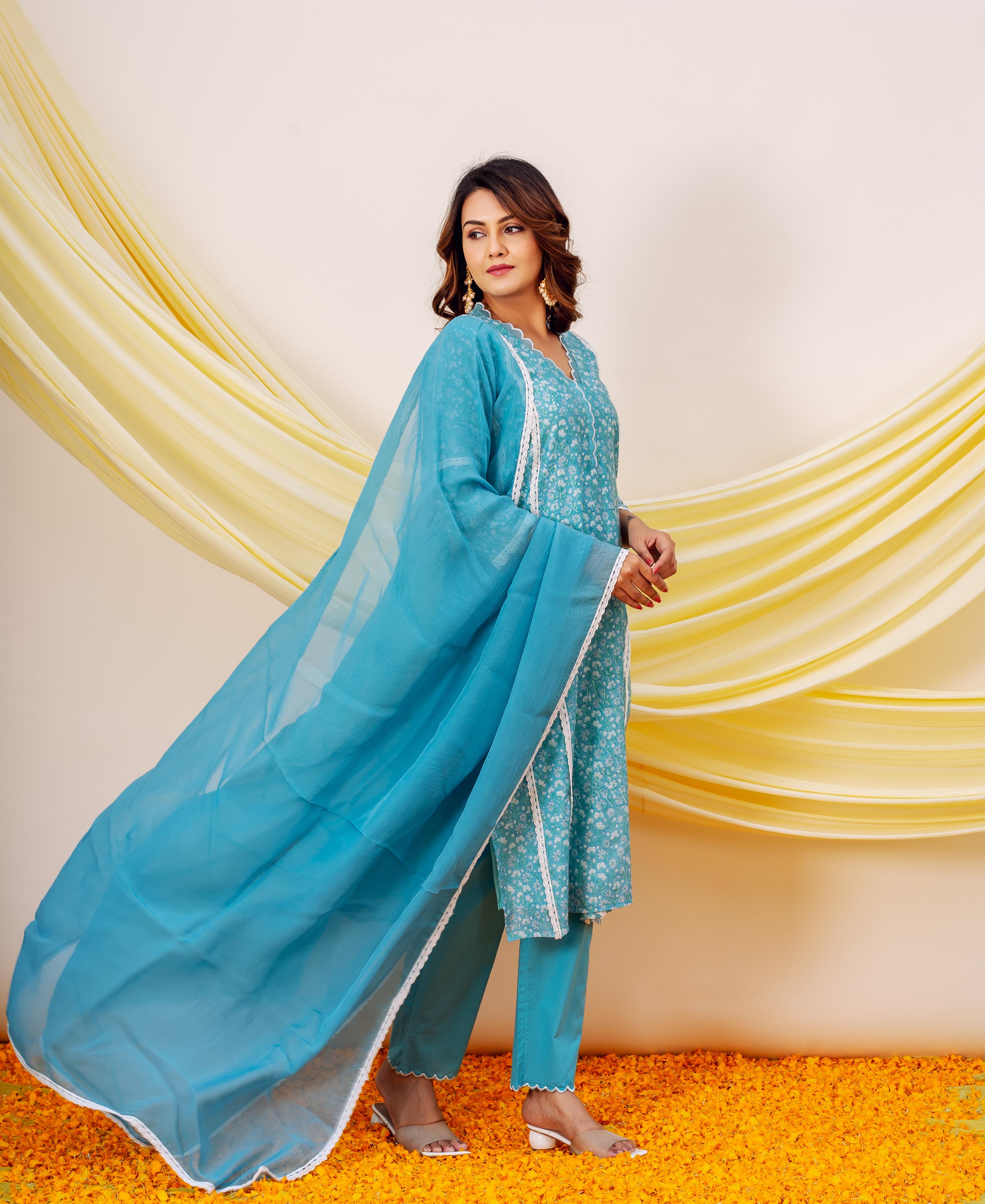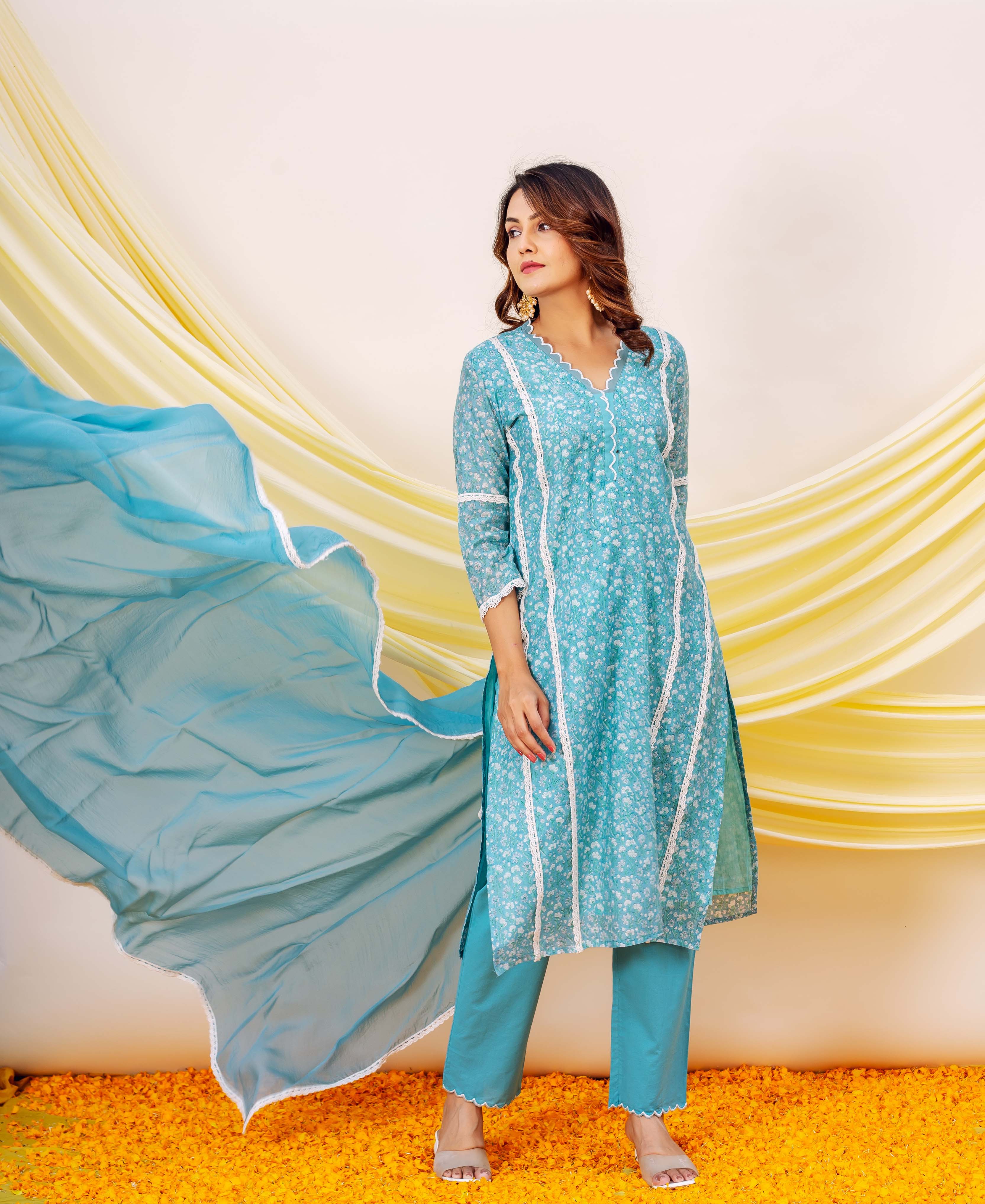 Blue Floral Cotton Lace Kurta