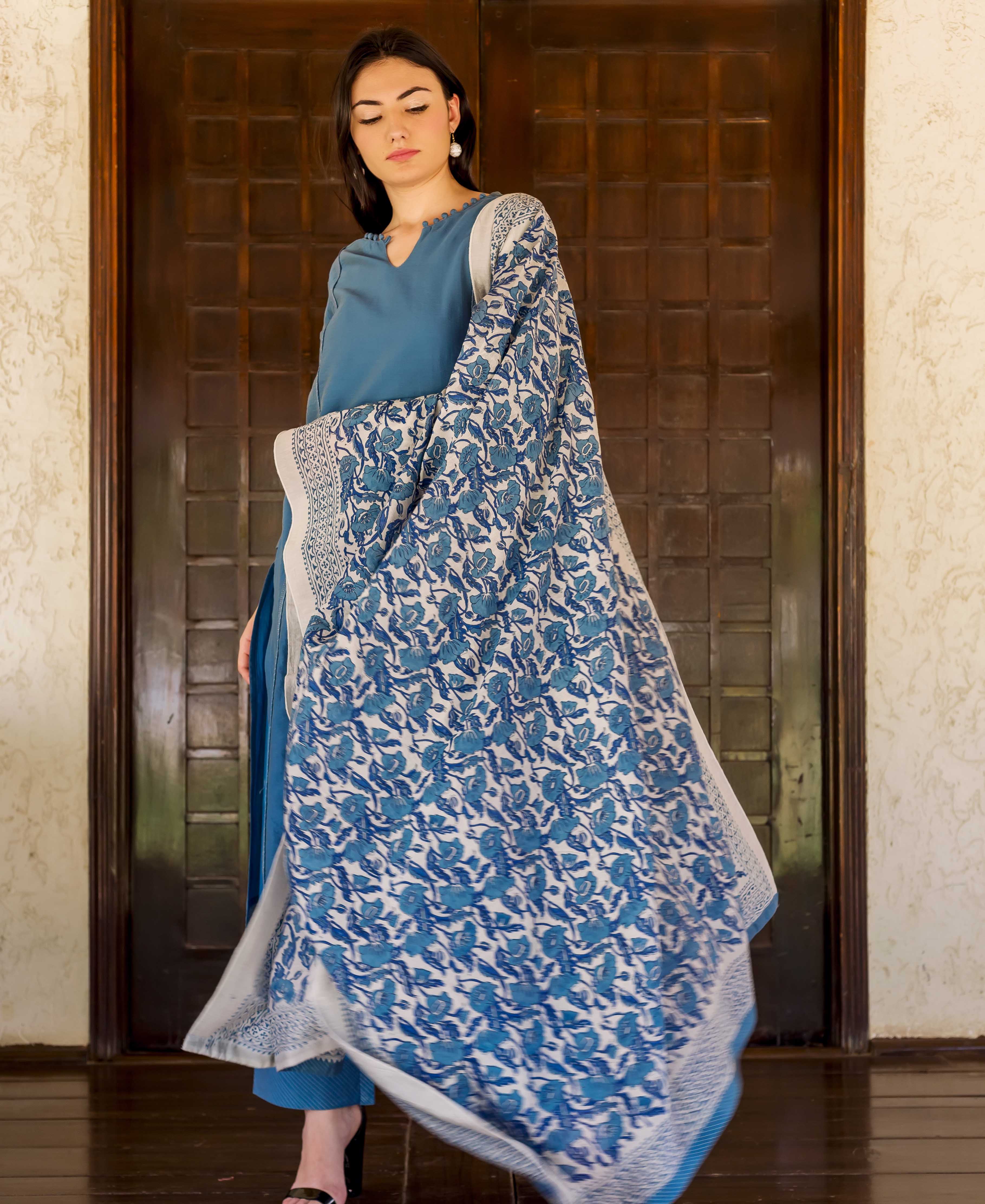 Blue and Grey Block Printed Chanderi Dupatta