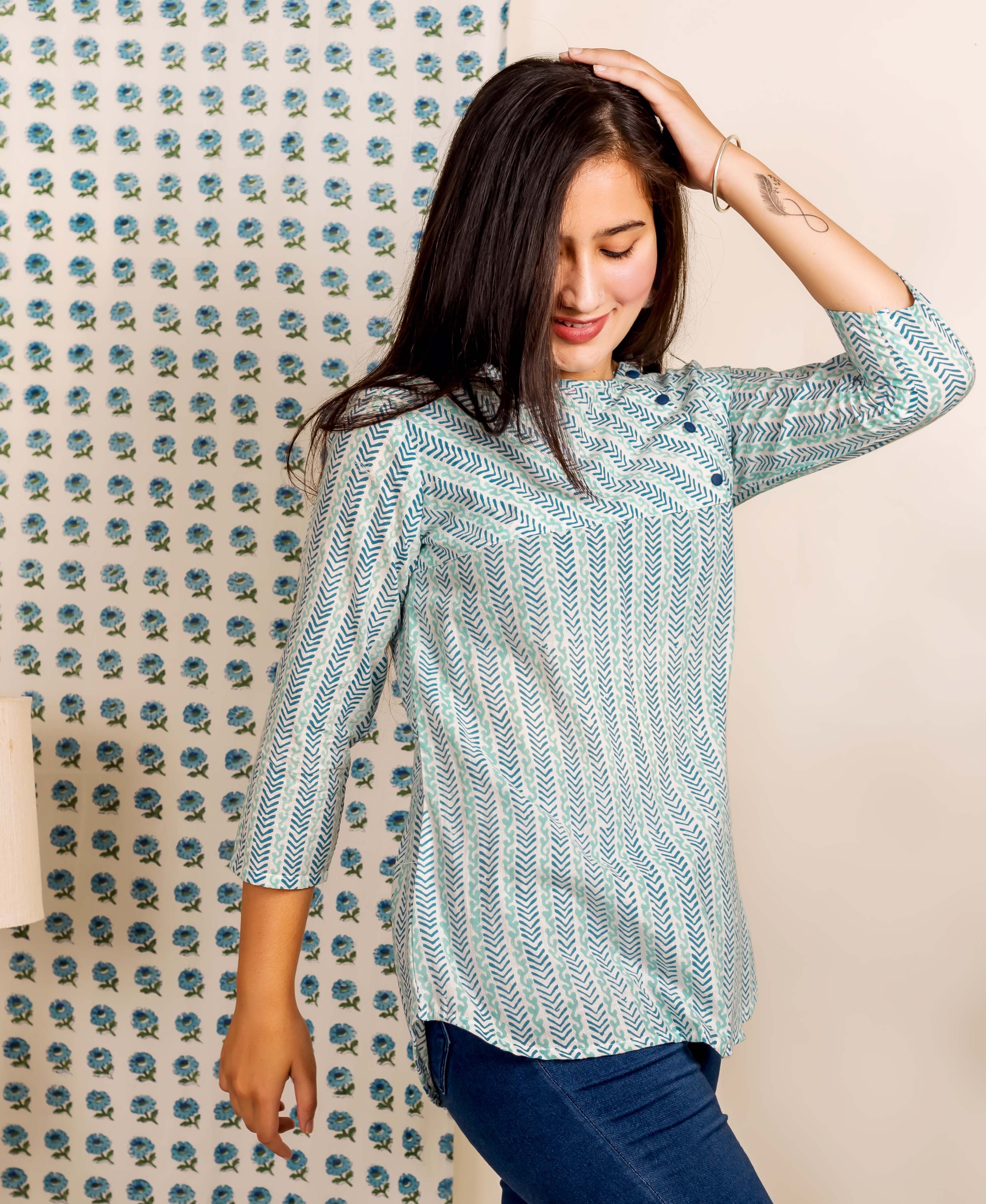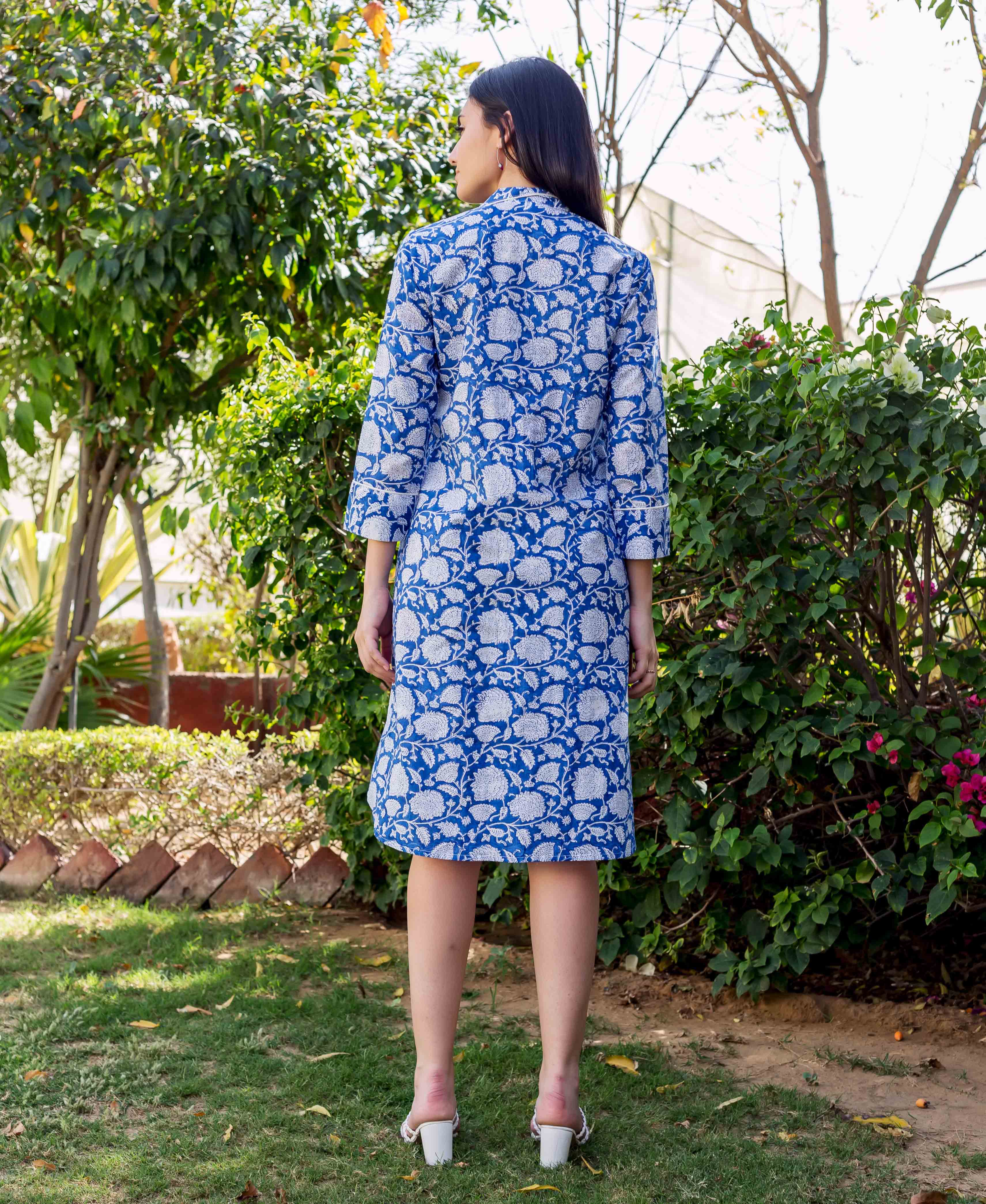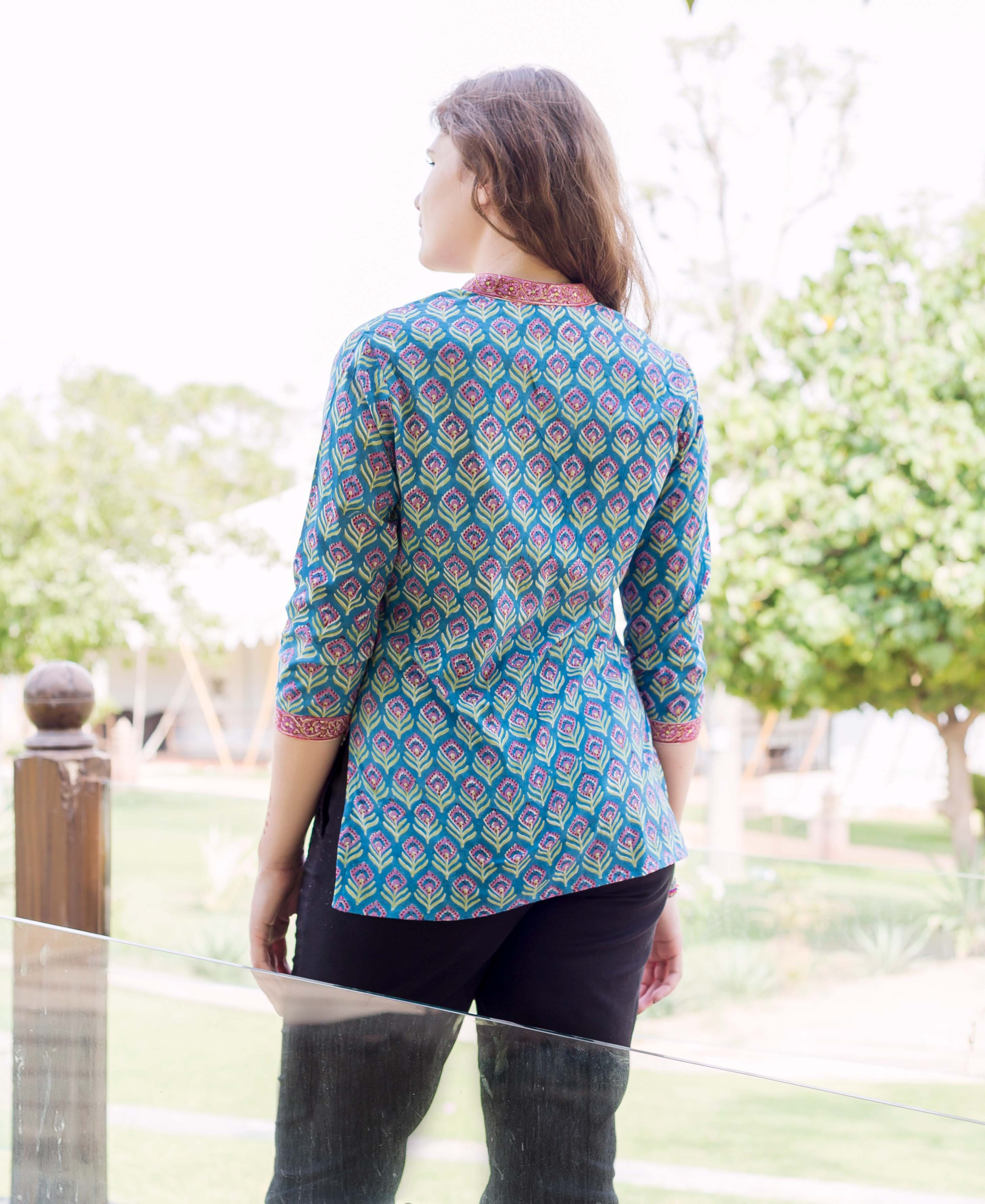 Blue White Floral Hand Block Printed Ethnic Short Kurti With Mandarin Collar And Front Buttons