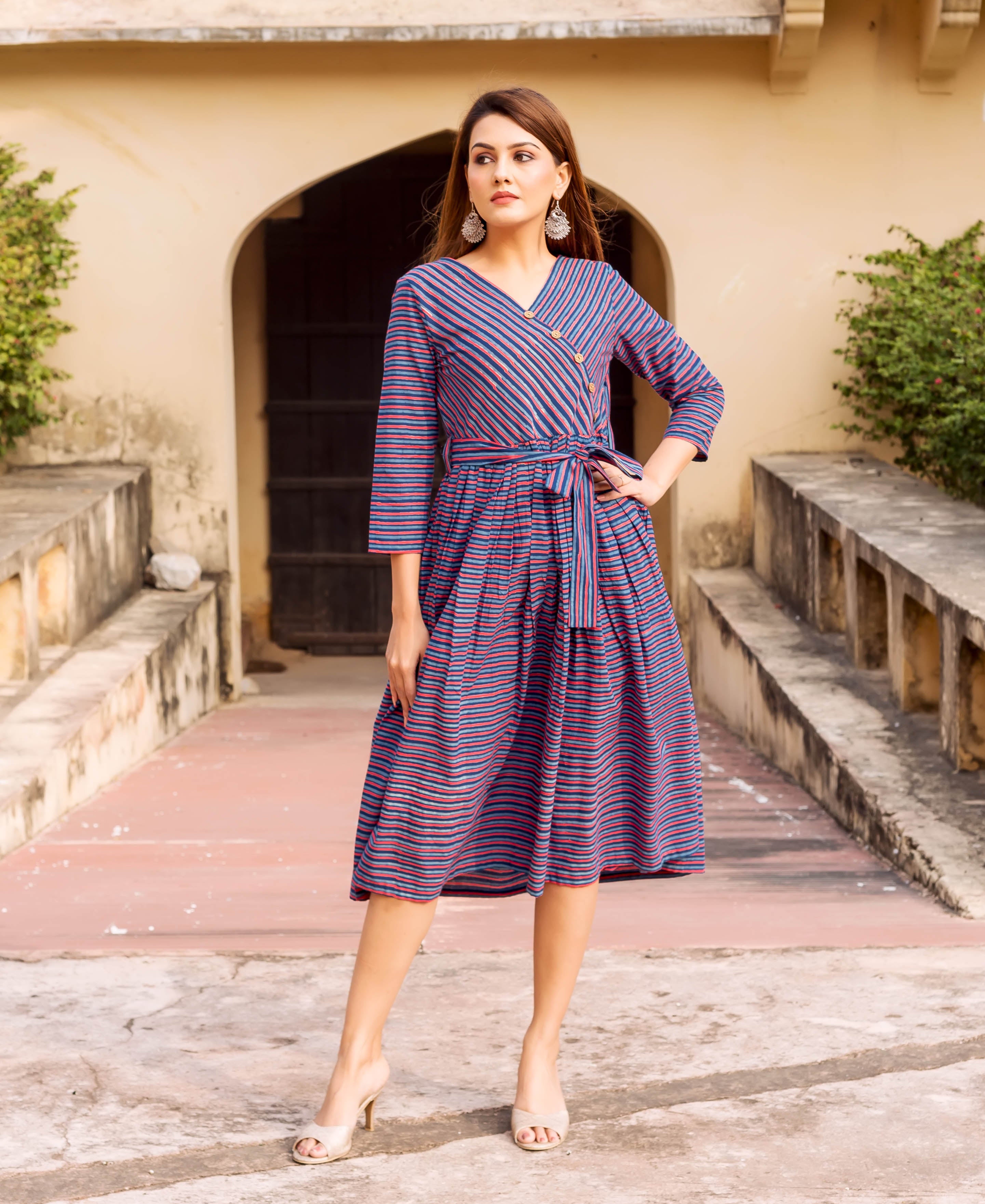 Blue Hand Block Printed Drop Waist Dress