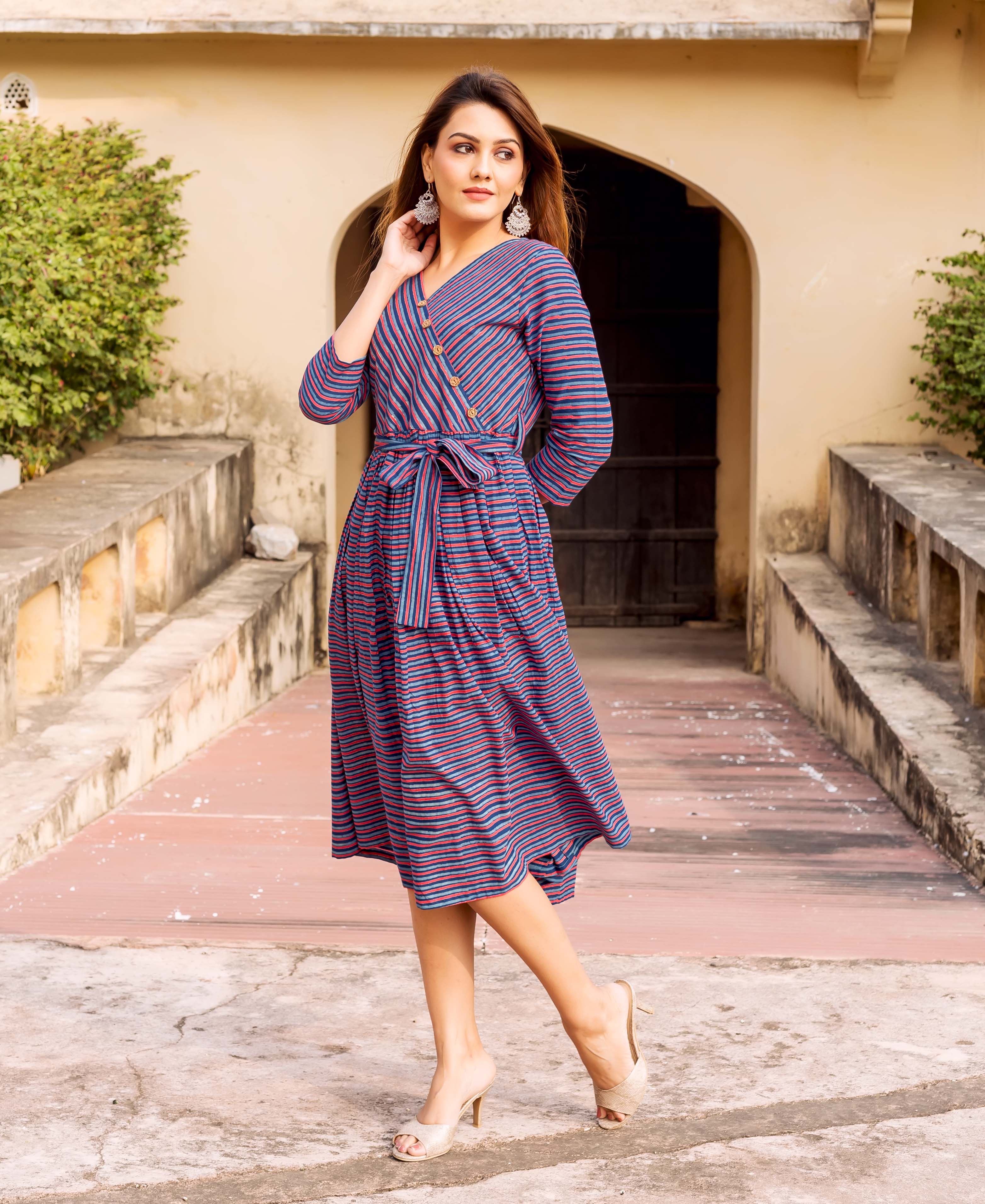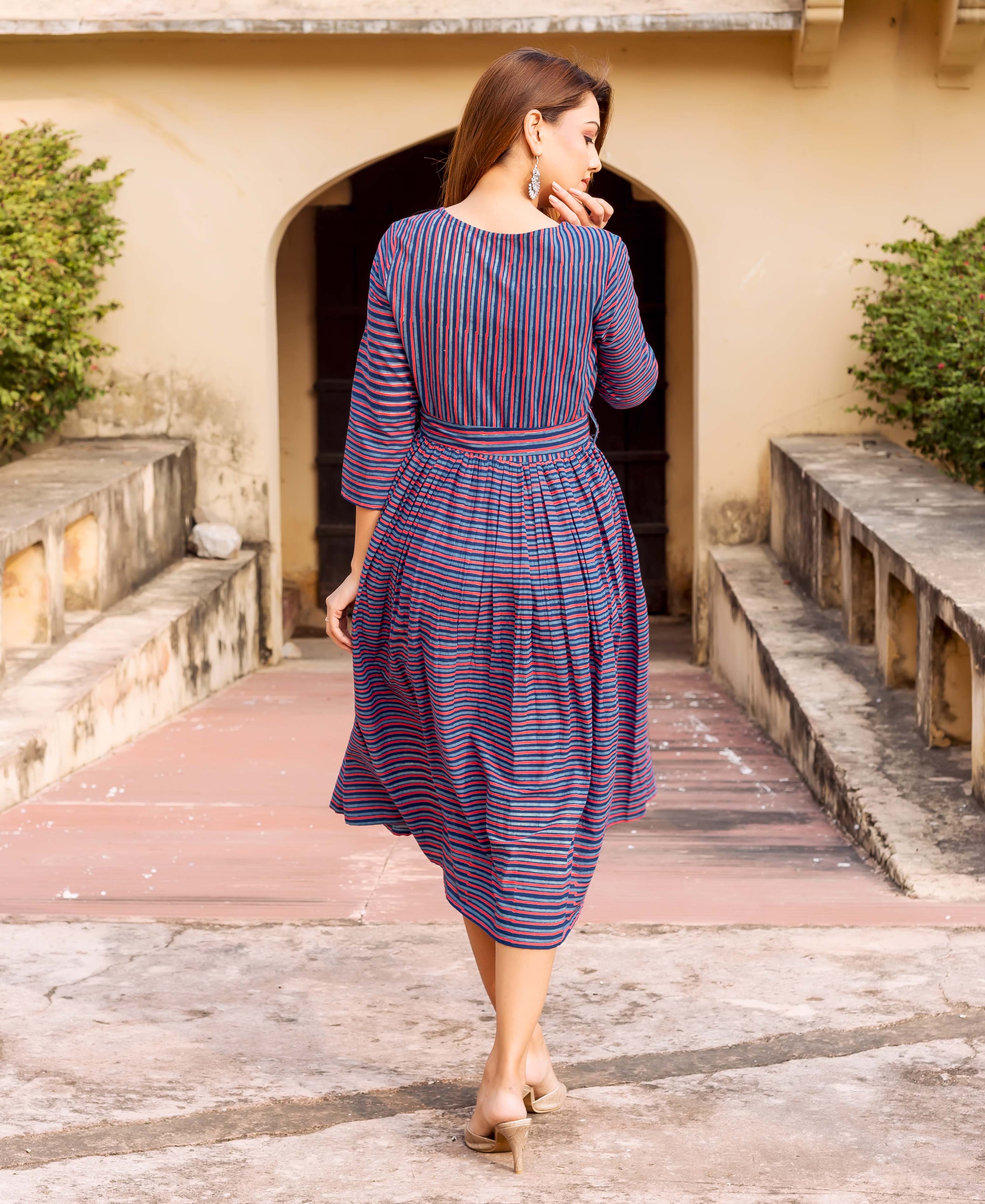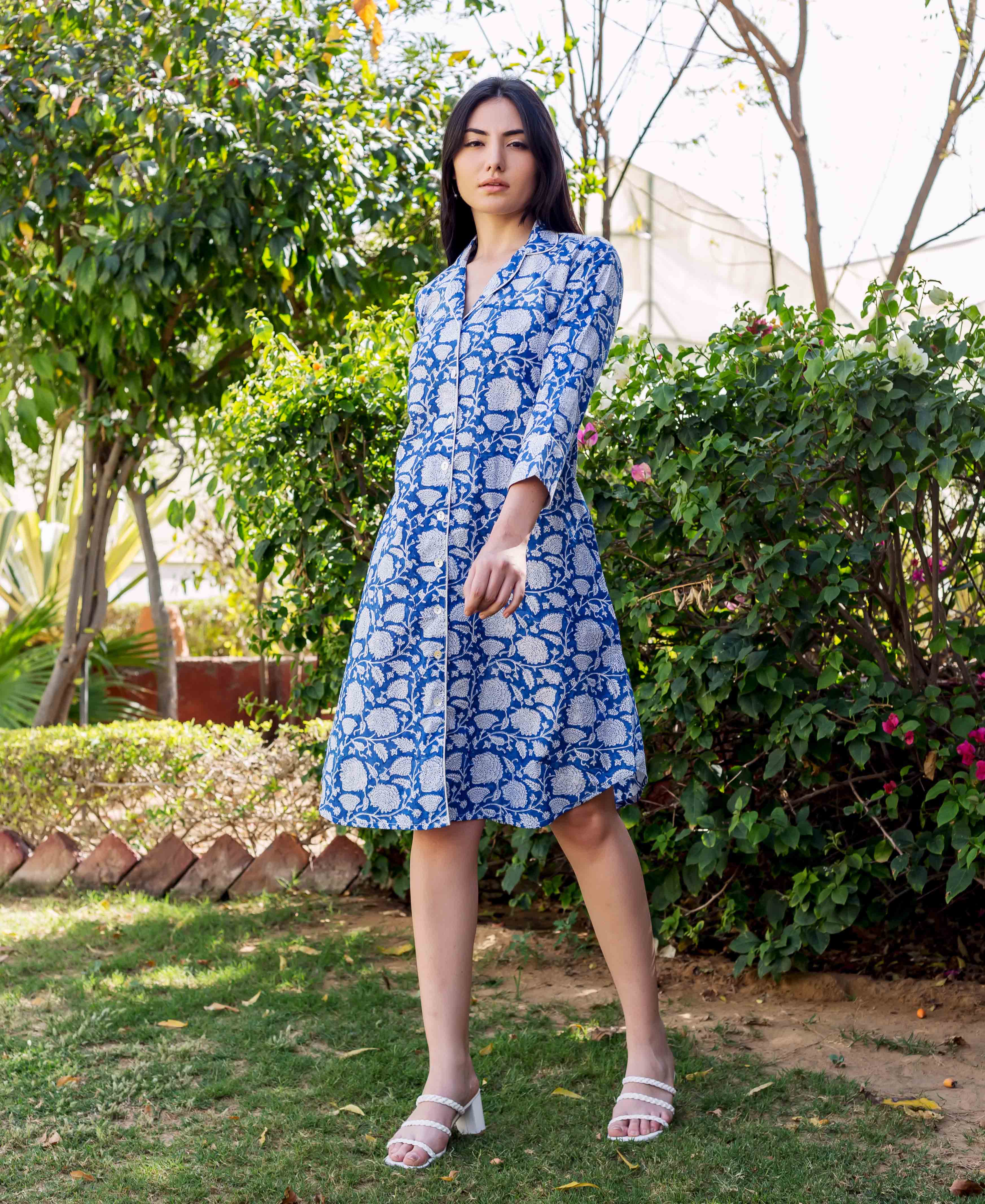 Blue Hand Block Printed Indo Western Dress