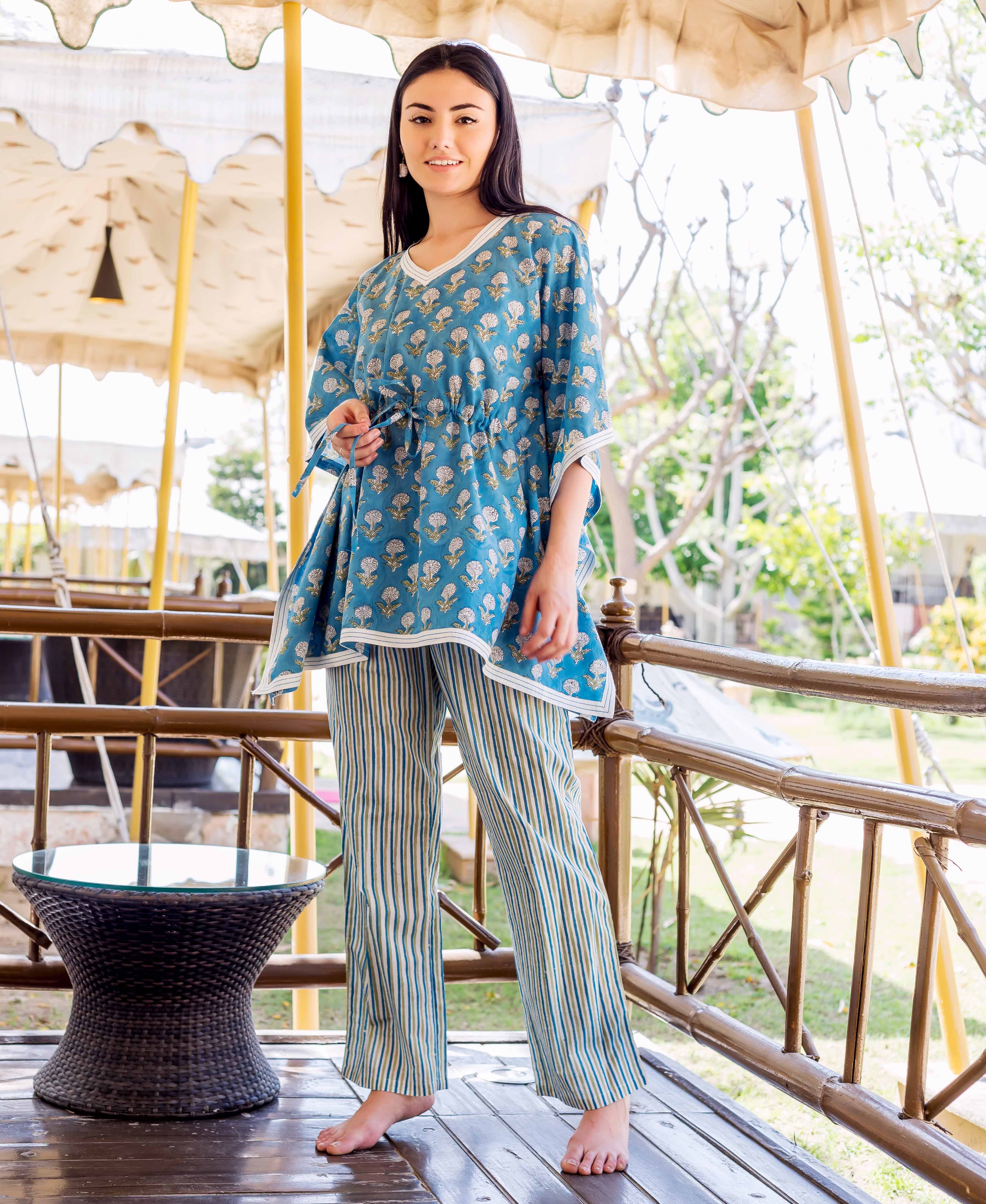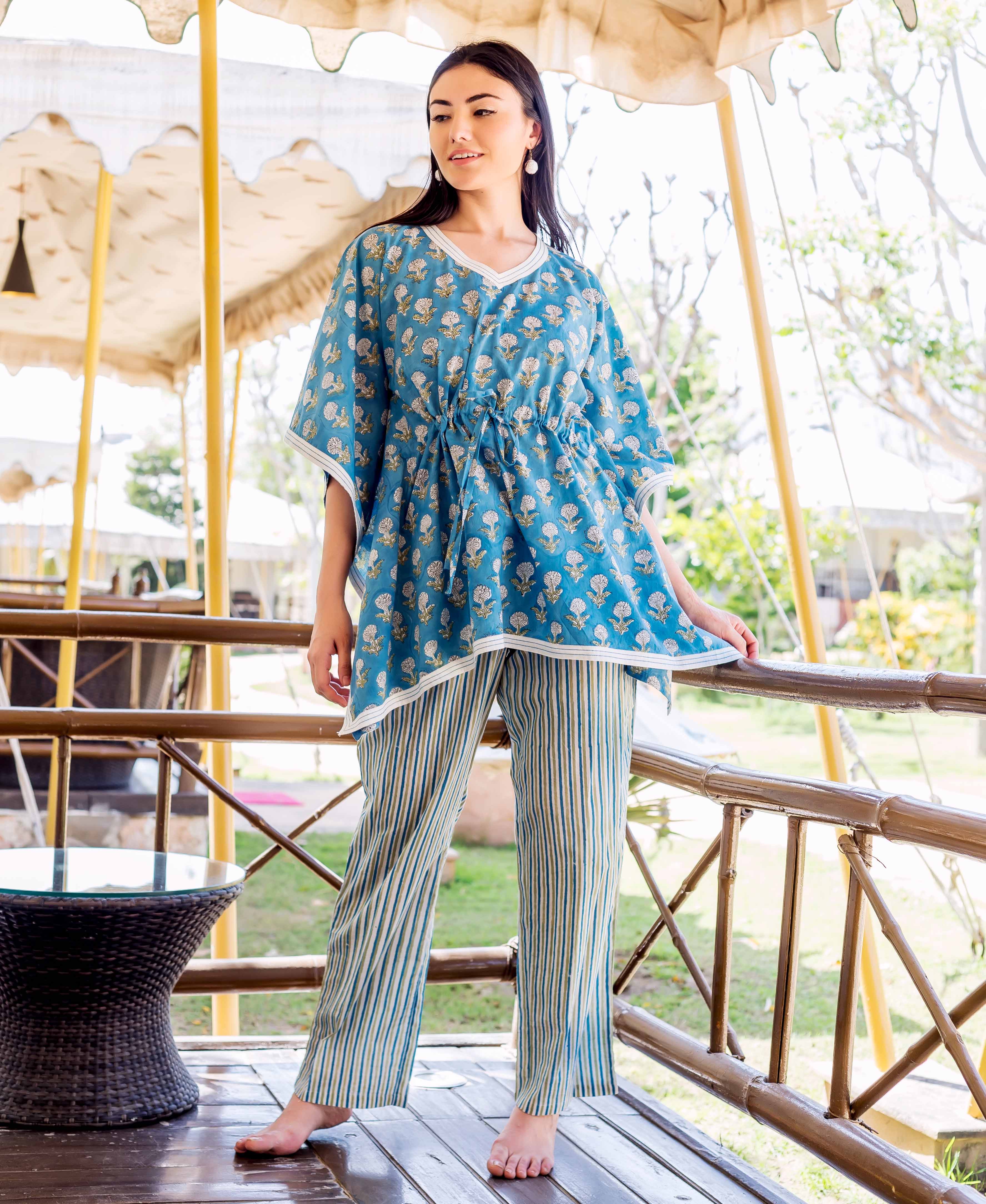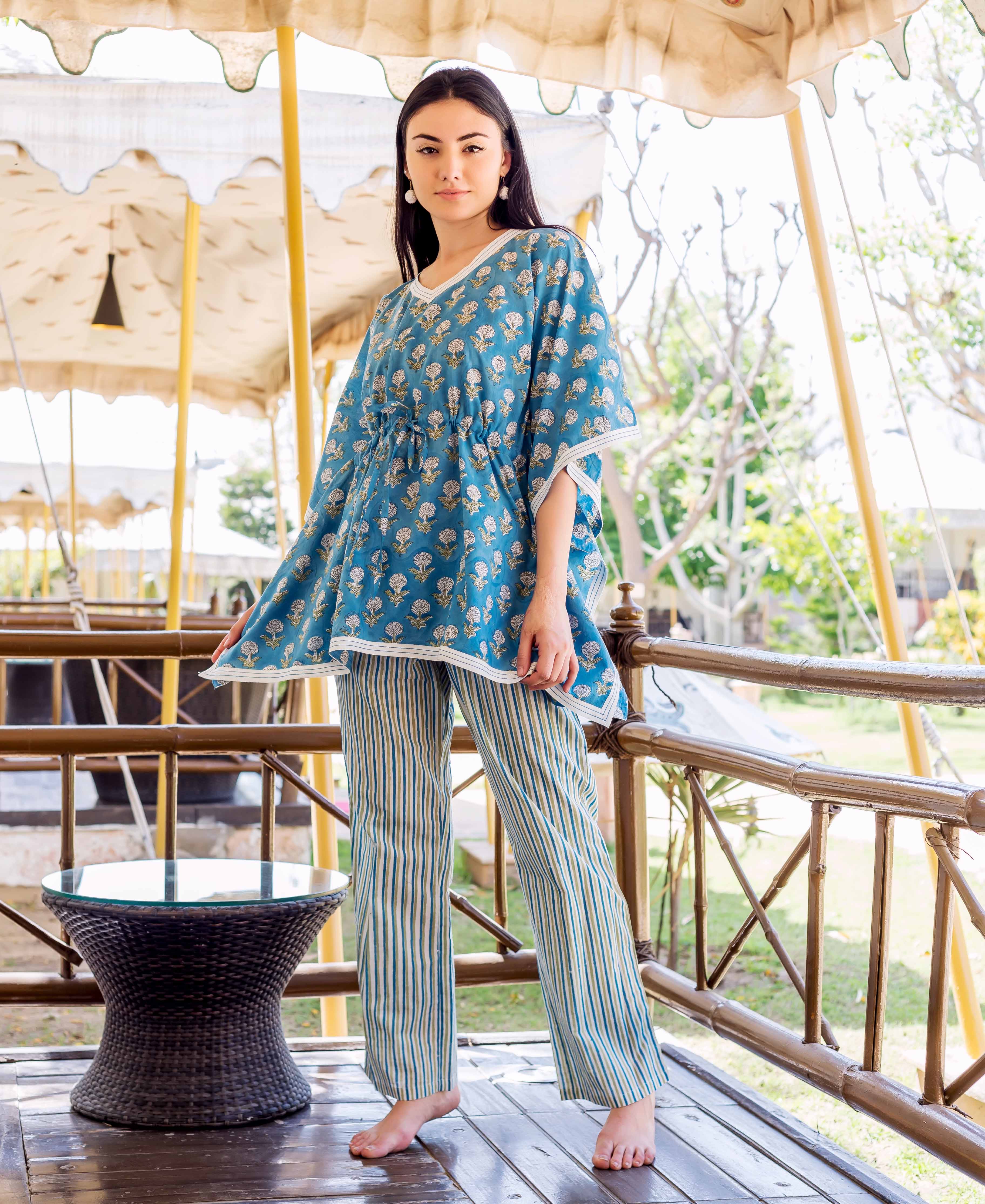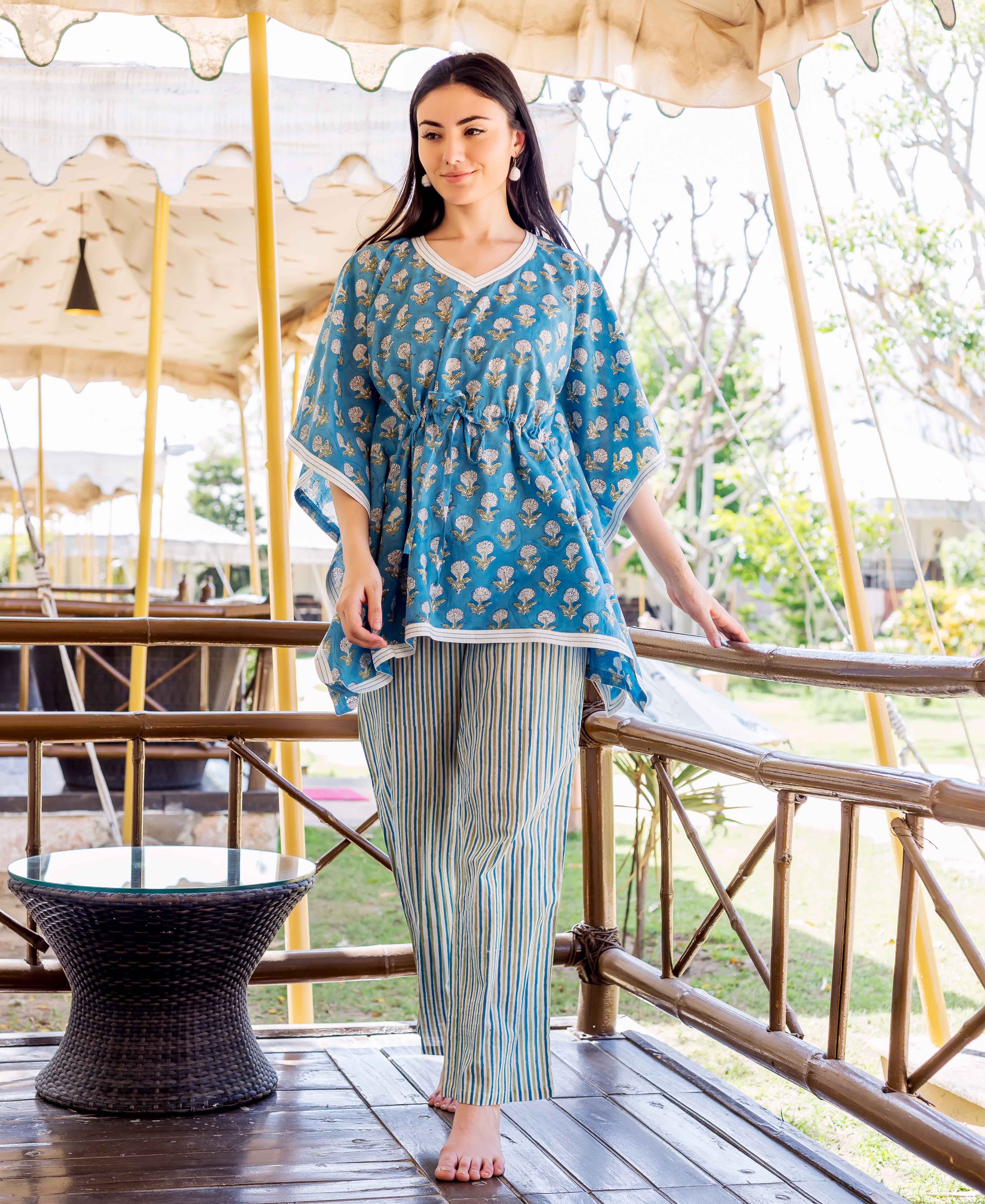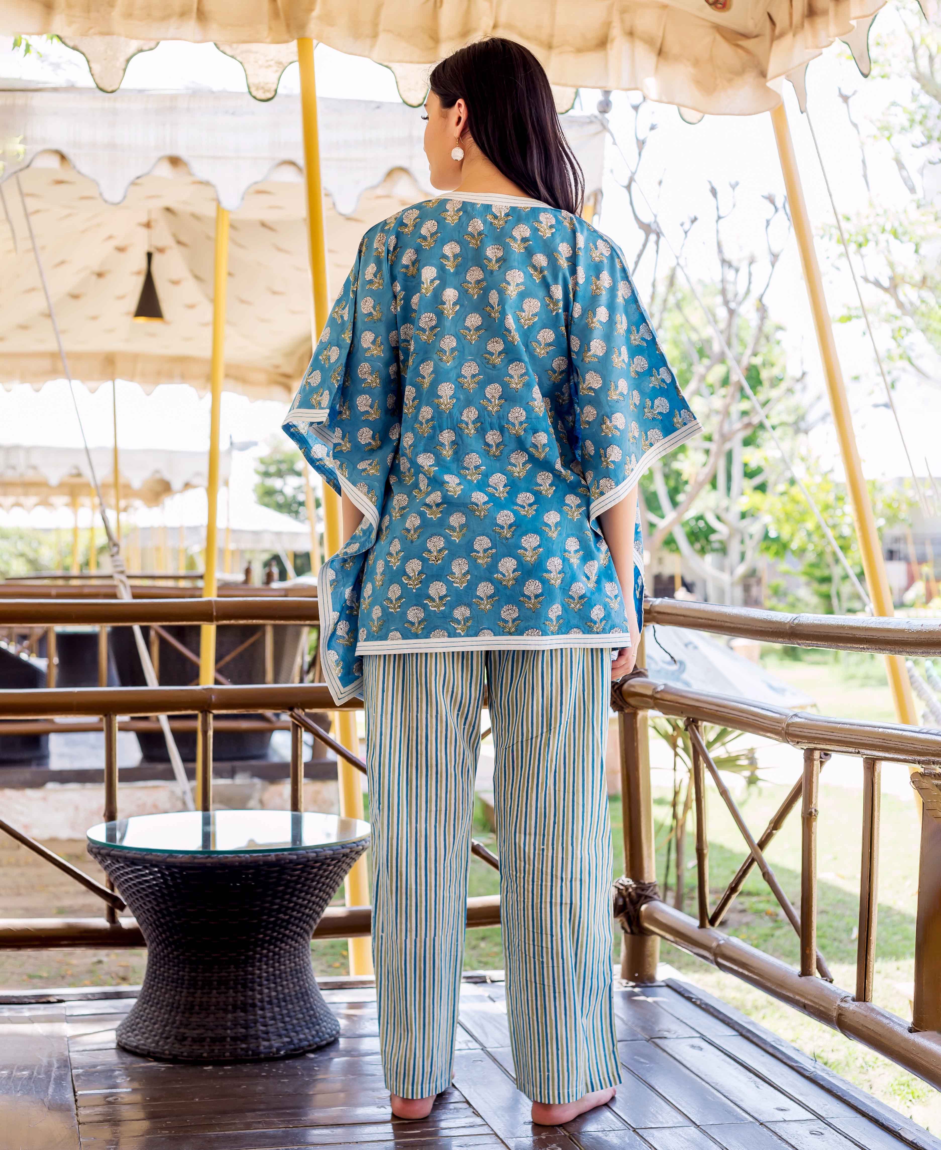 Blue Kaftan Style Top With Printed Trouser