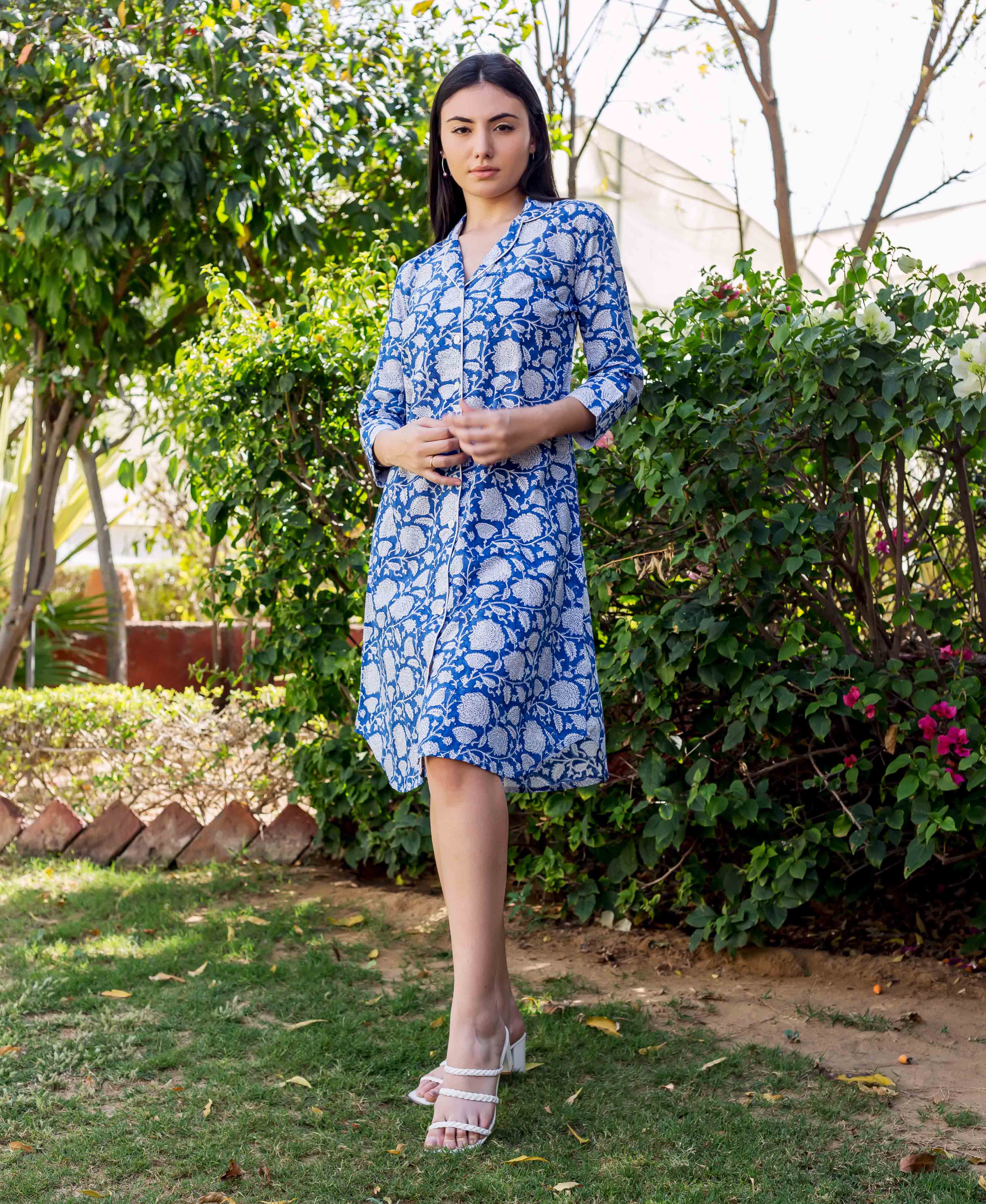 Blue Printed Shirt Style Lounge Wear