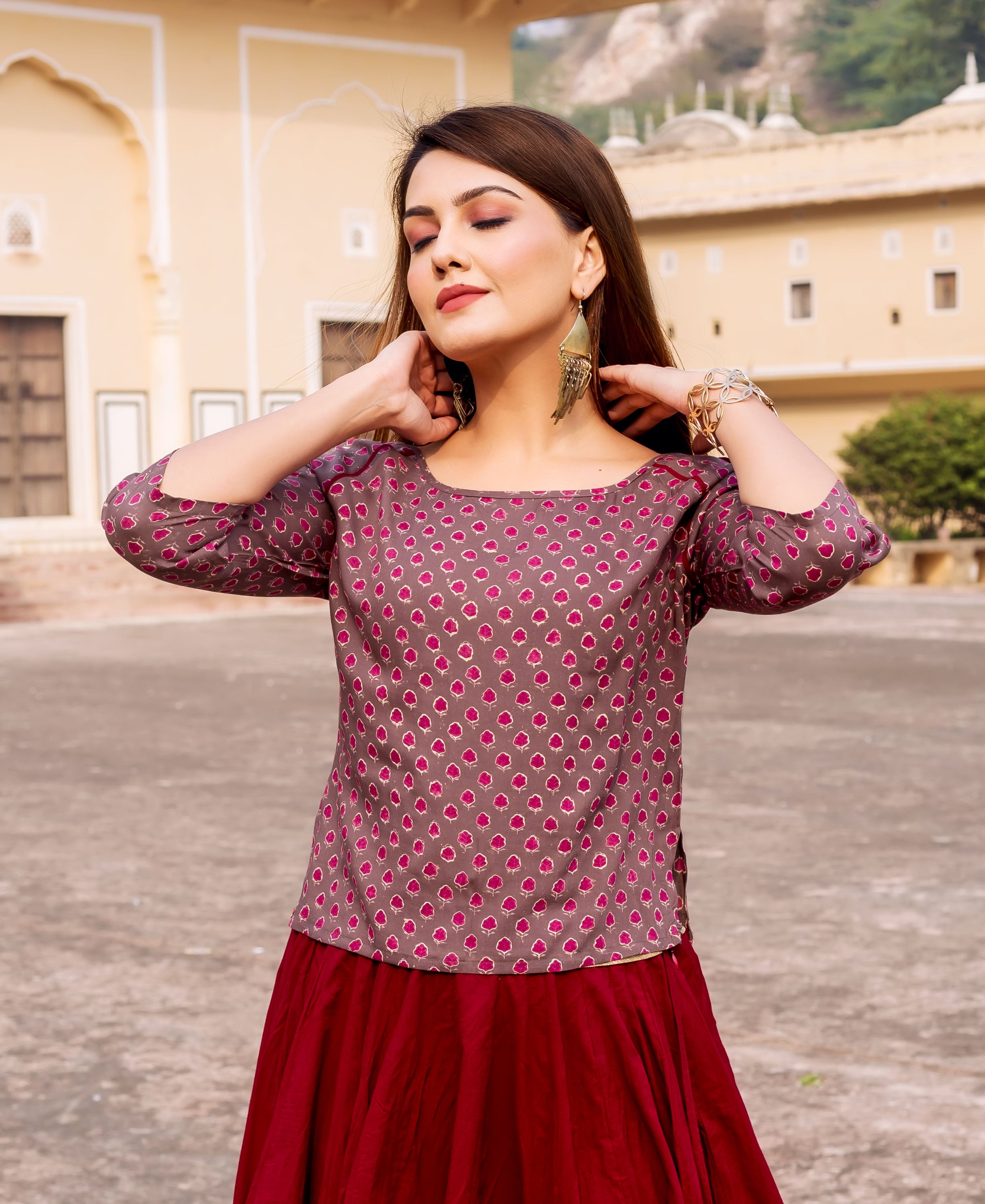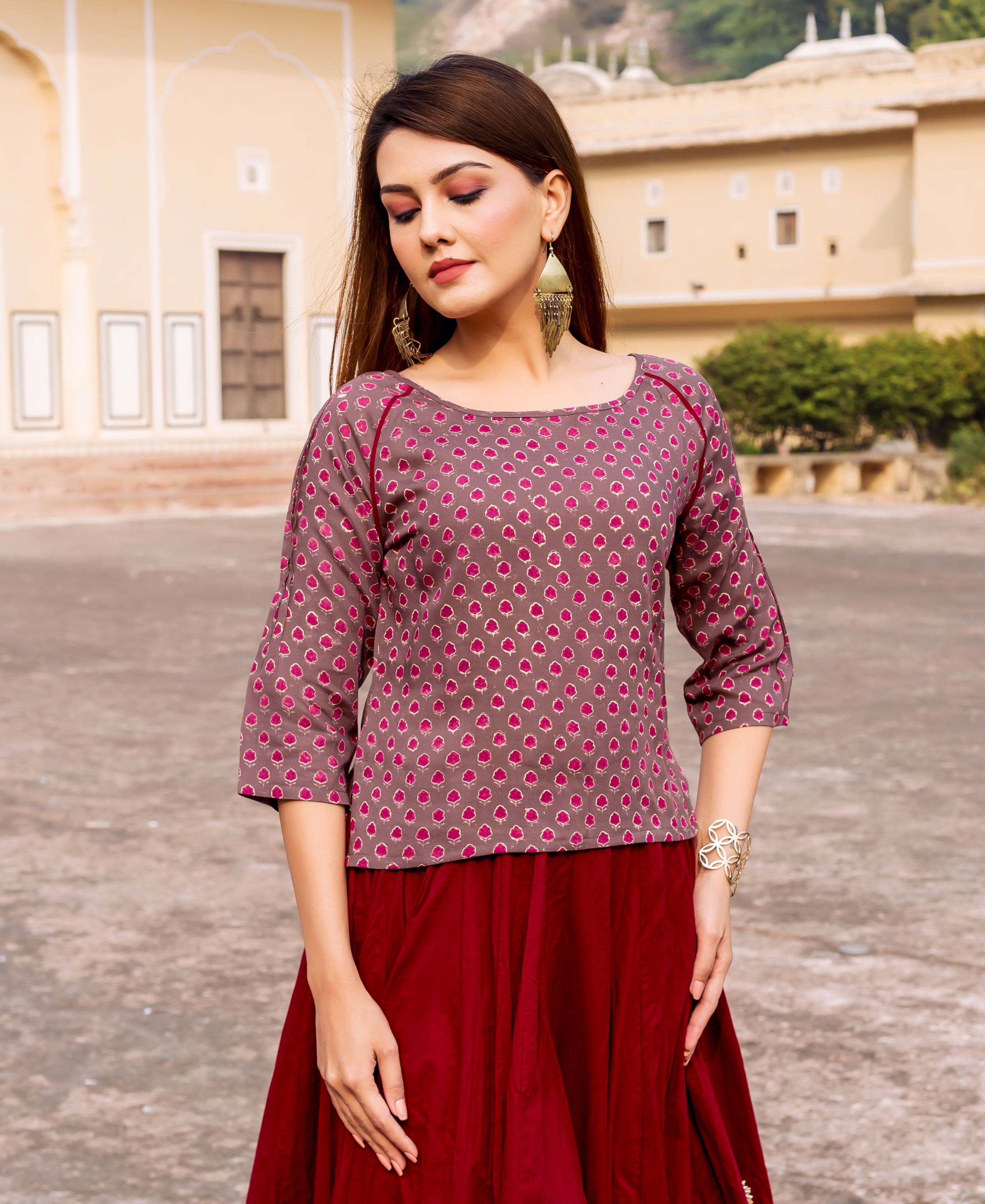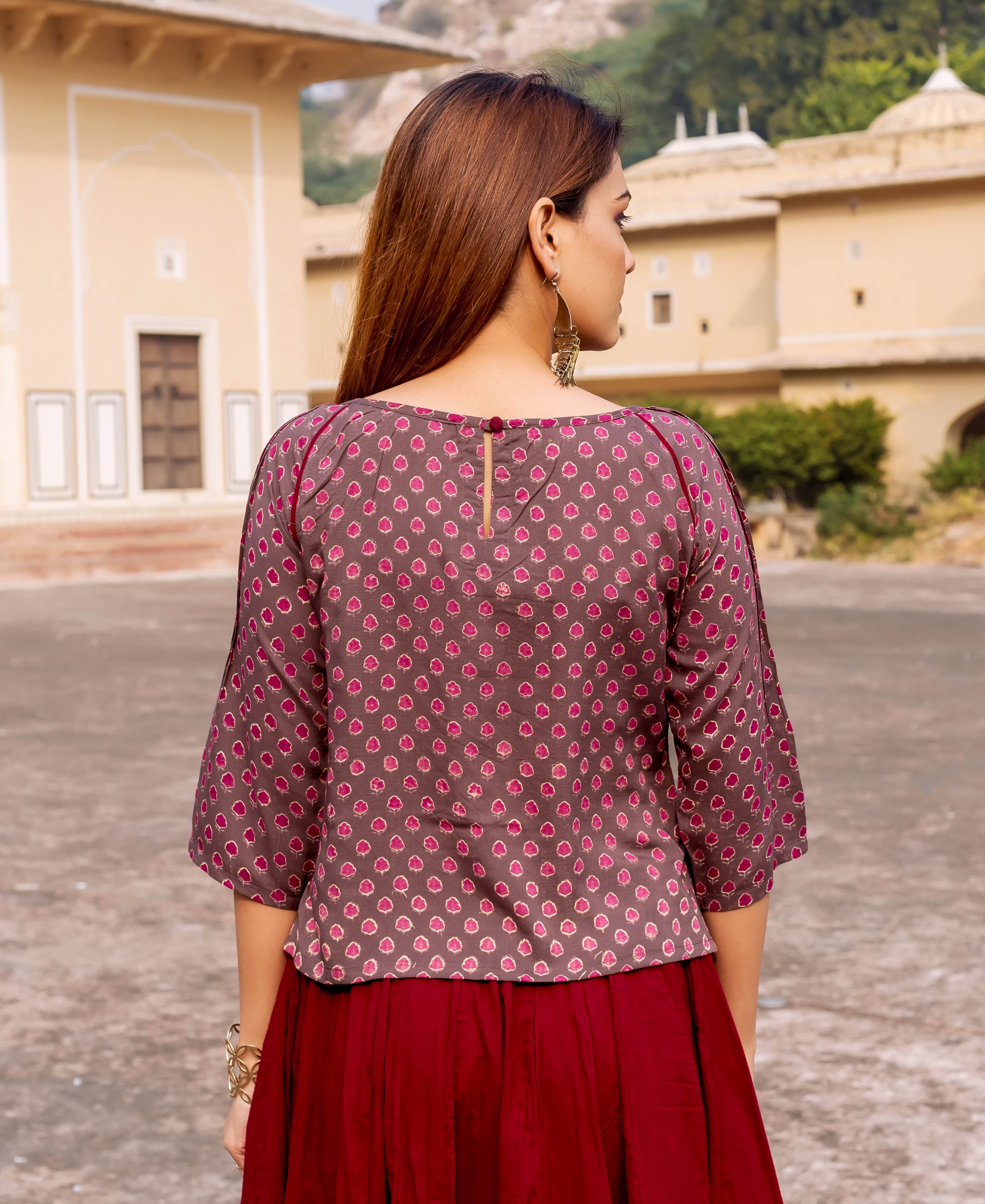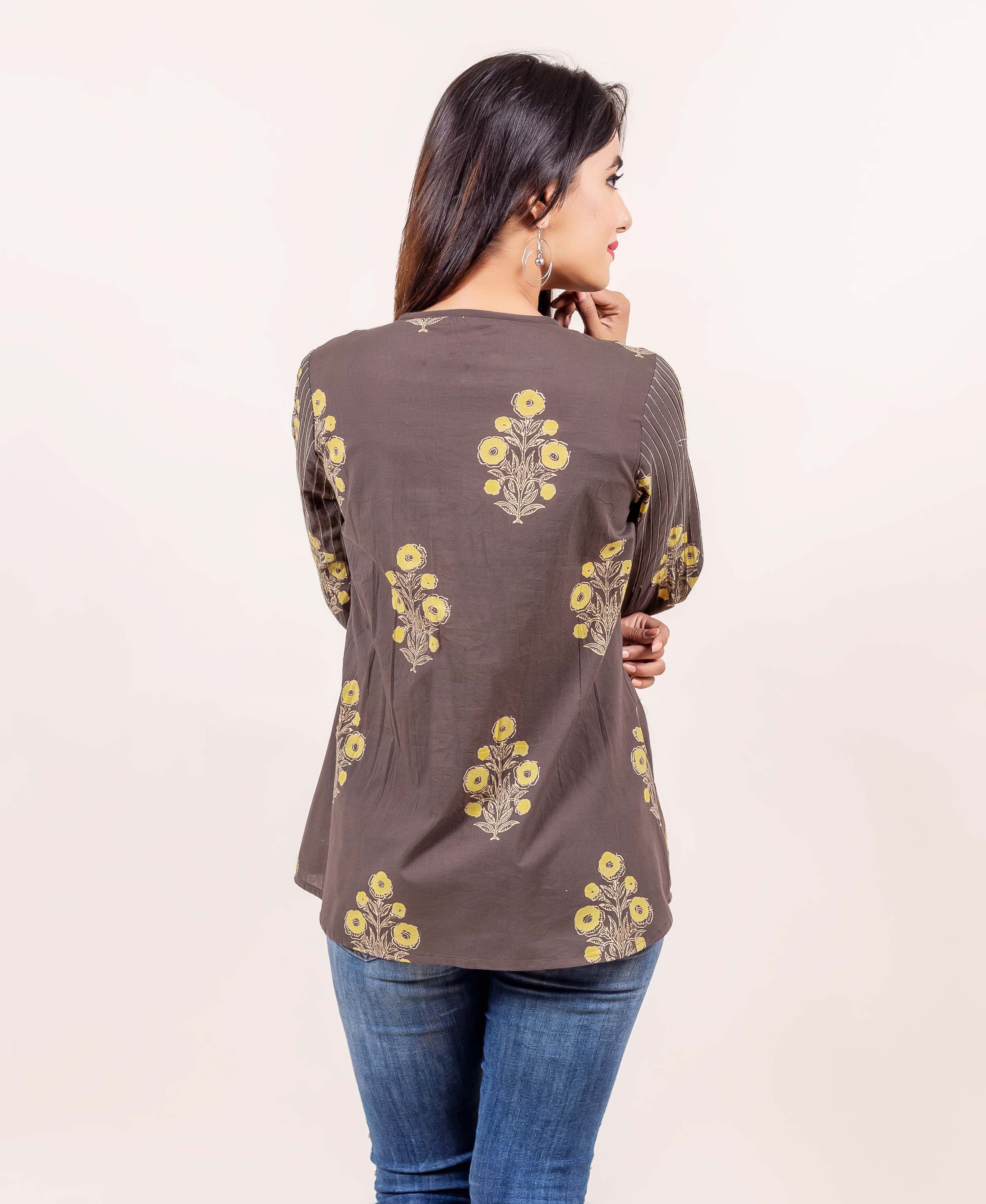 Brown Hand Block Printed Cotton Top with Stitch details