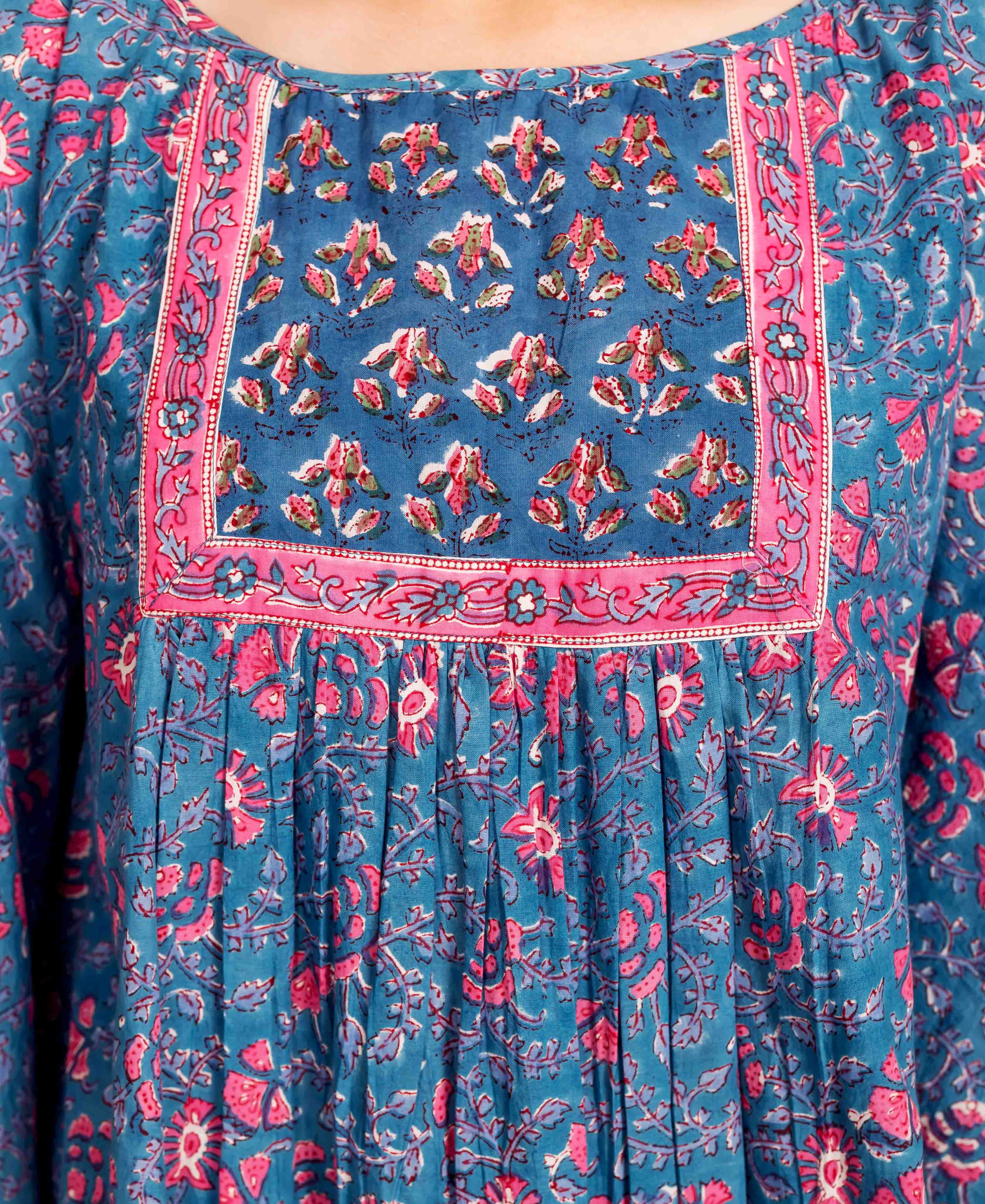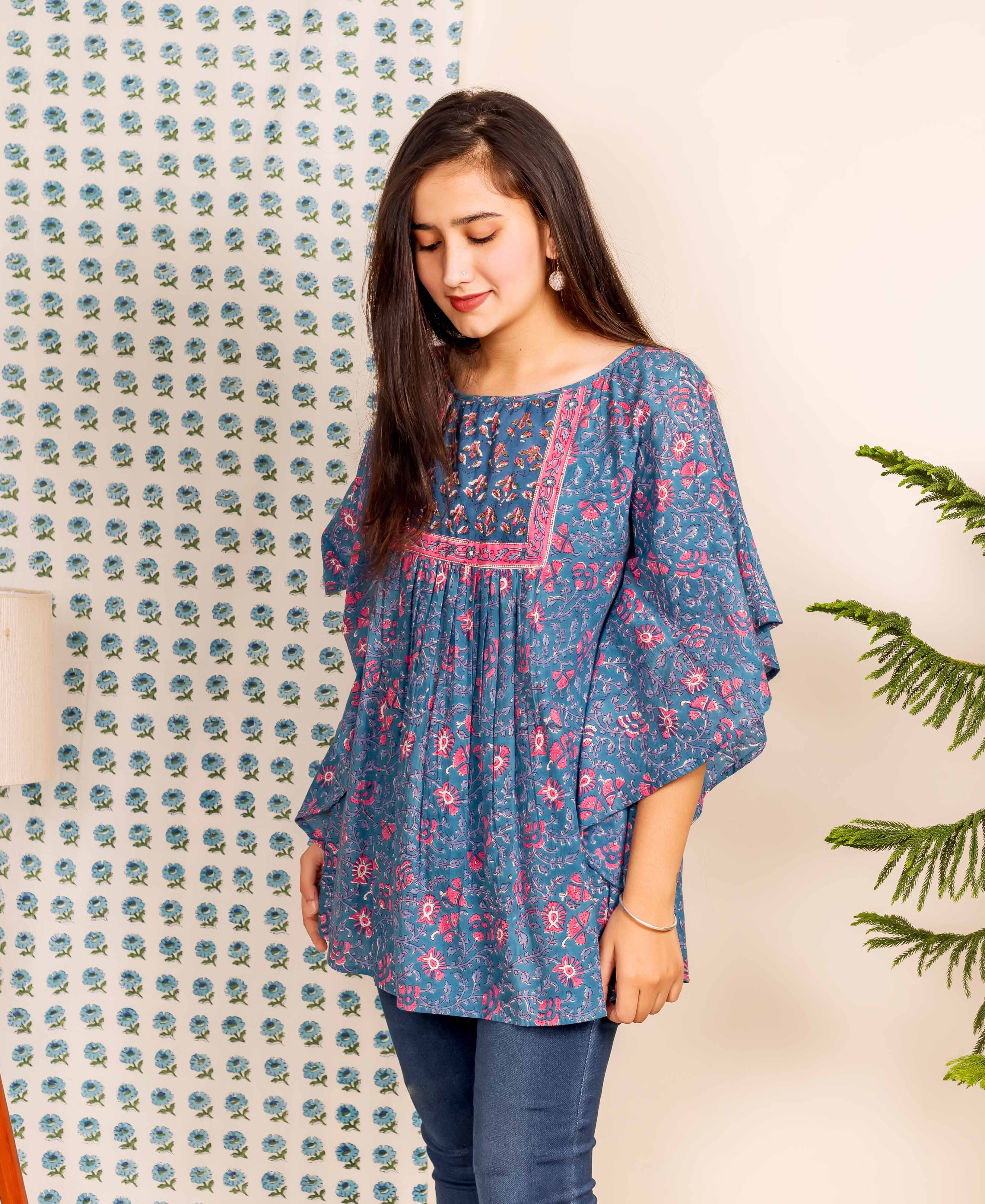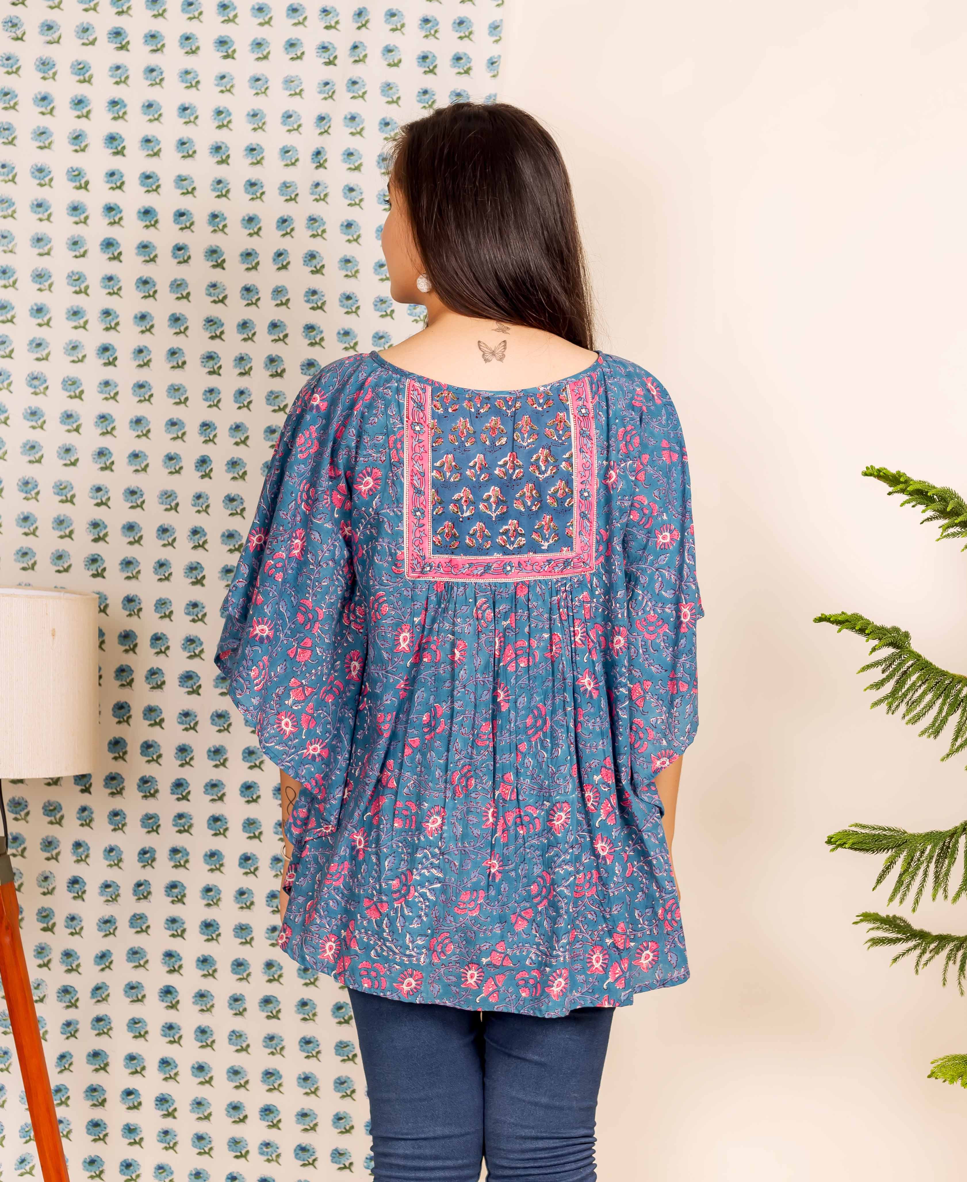 Blue and Pink Hand Block Printed Kaftan Top