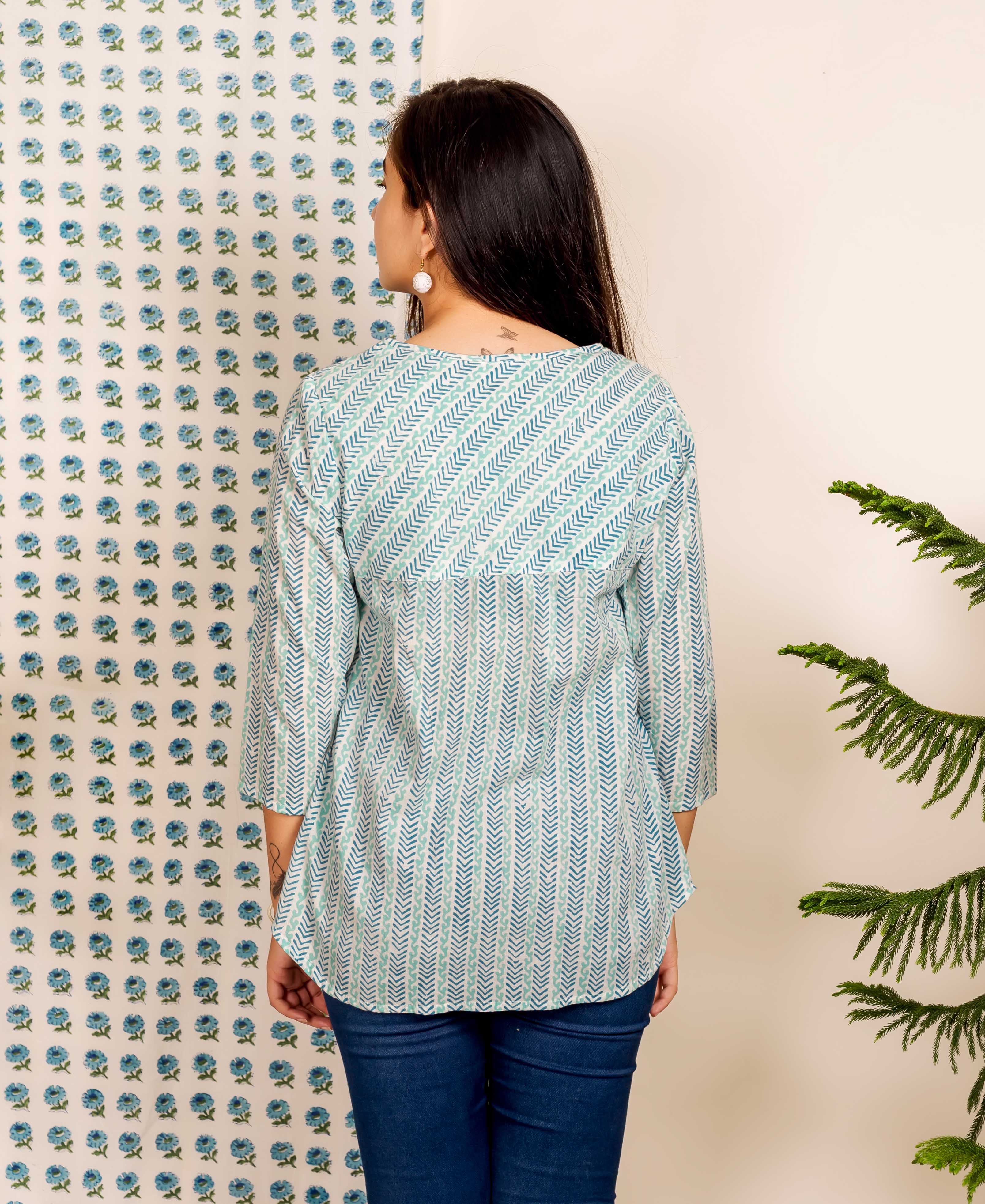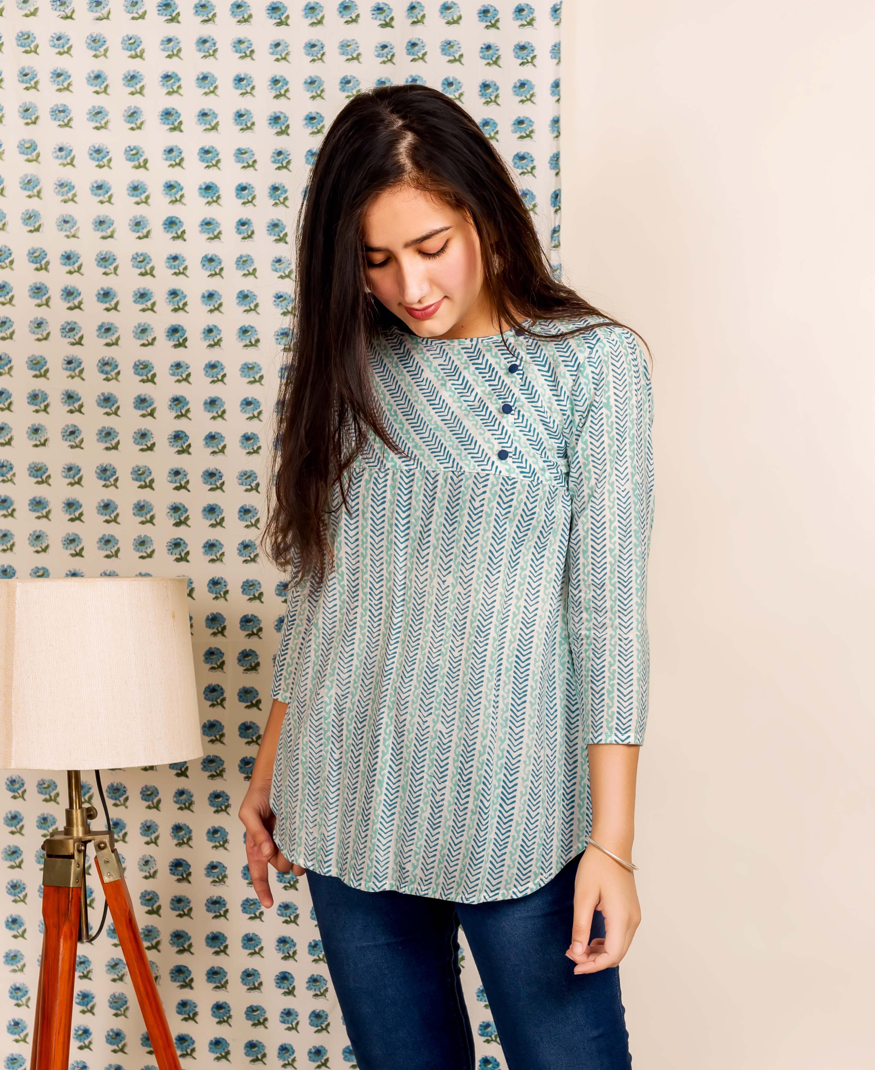 Blue and Green Block Printed Kaftan Top