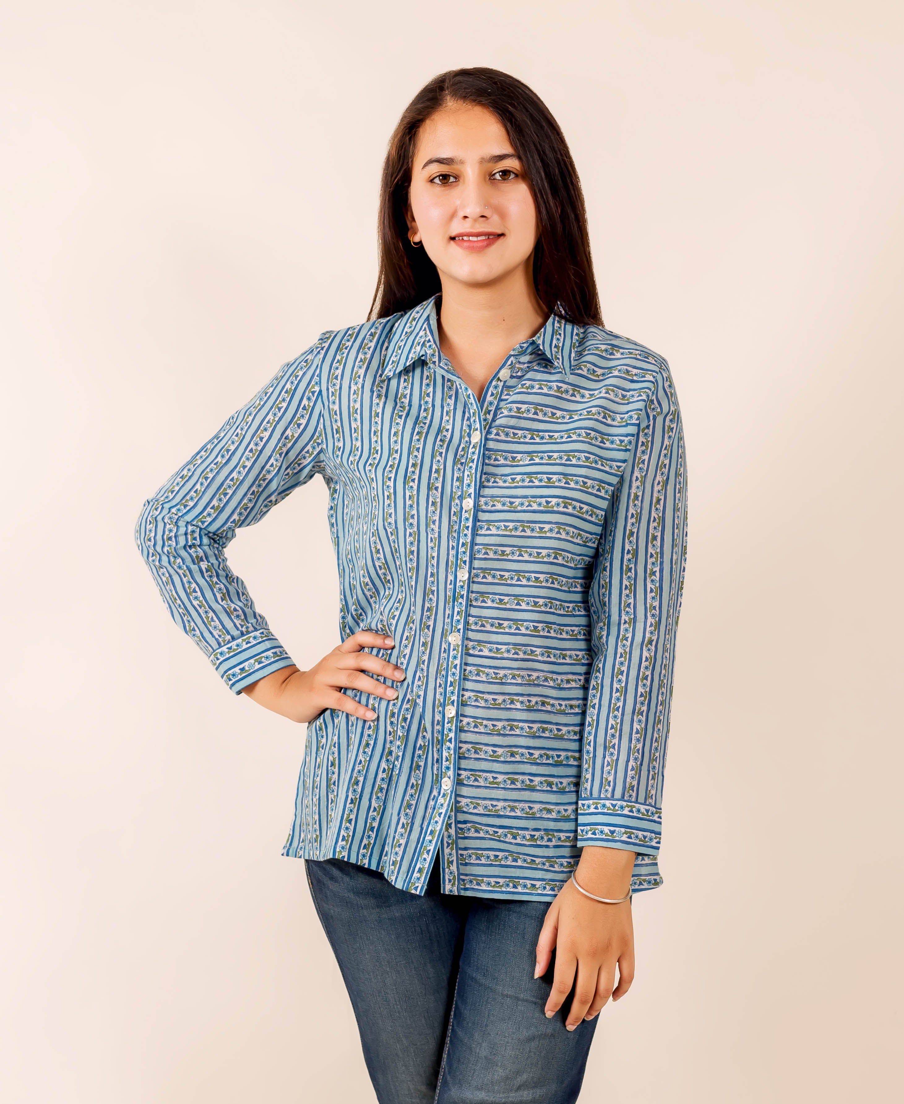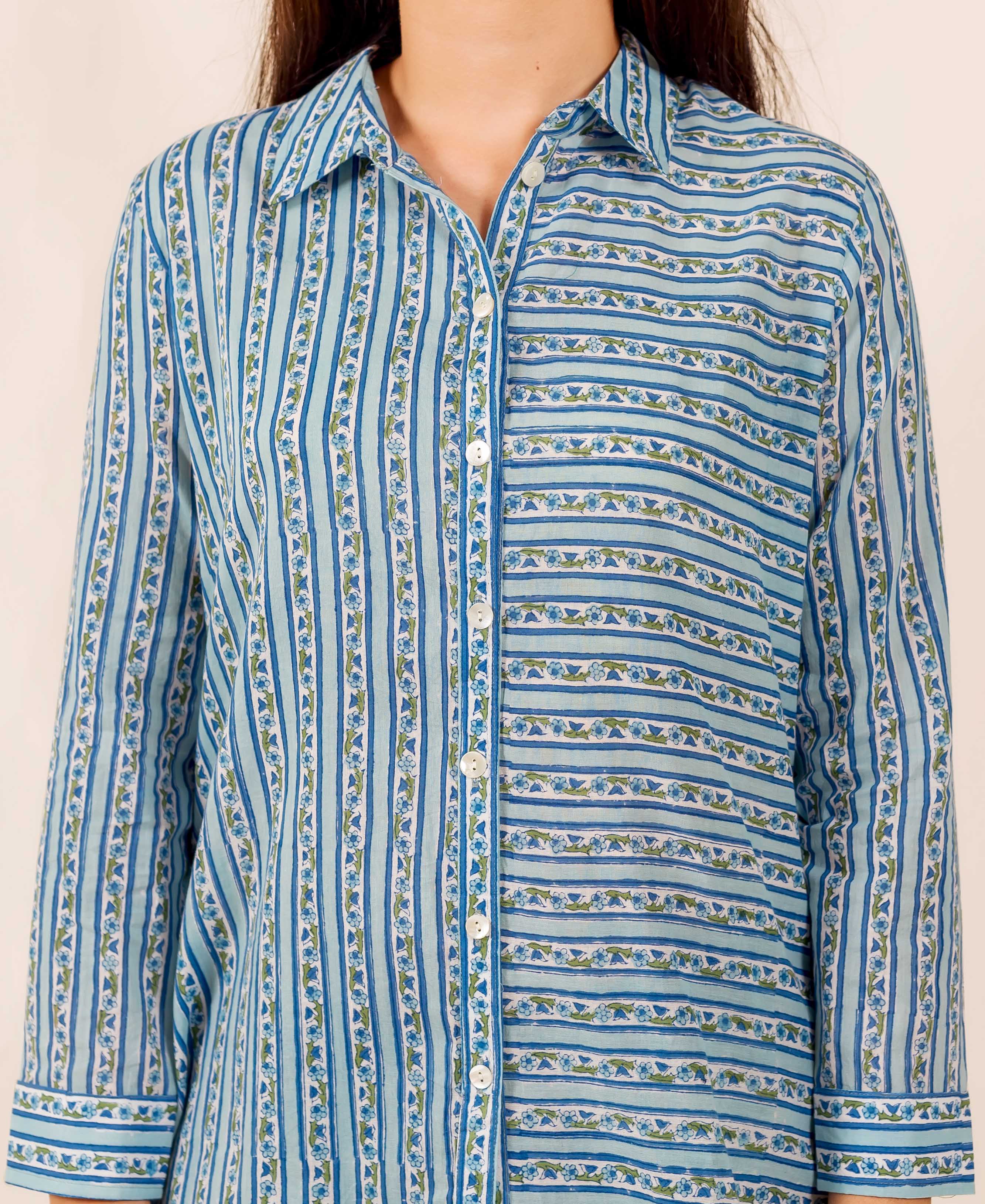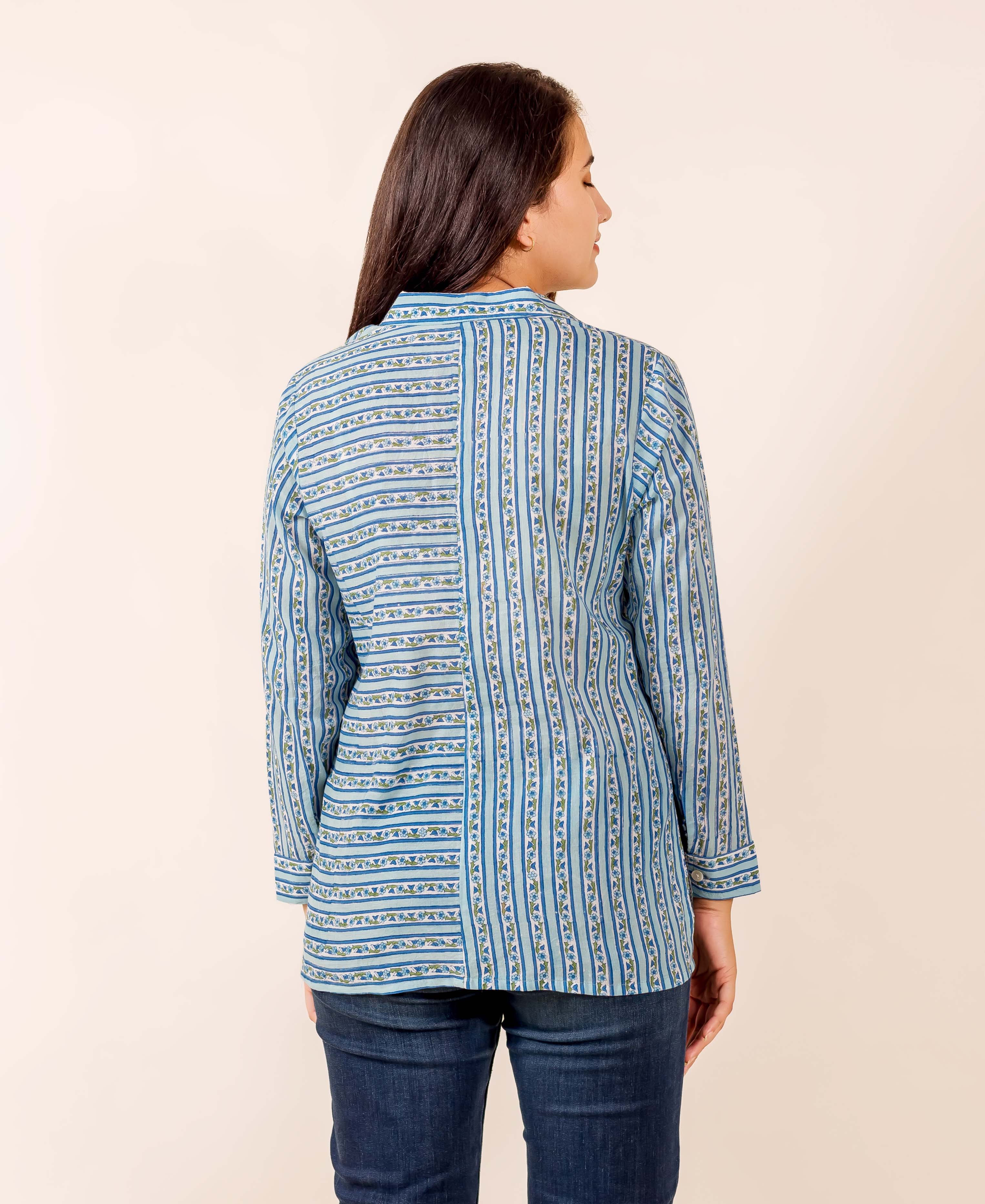 Blue and White Button Down Block Printed Cotton Top