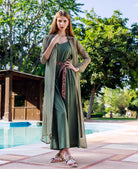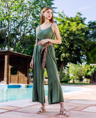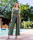 Enveloped in the color of olive, this summer jumpsuit is perfect for the modern chic. Expertly crafted from modal and organza fabrics, it features a side zipper for maximum comfort and a hand block printed belt. Its sophisticated and unique design is sure to elevate any look.