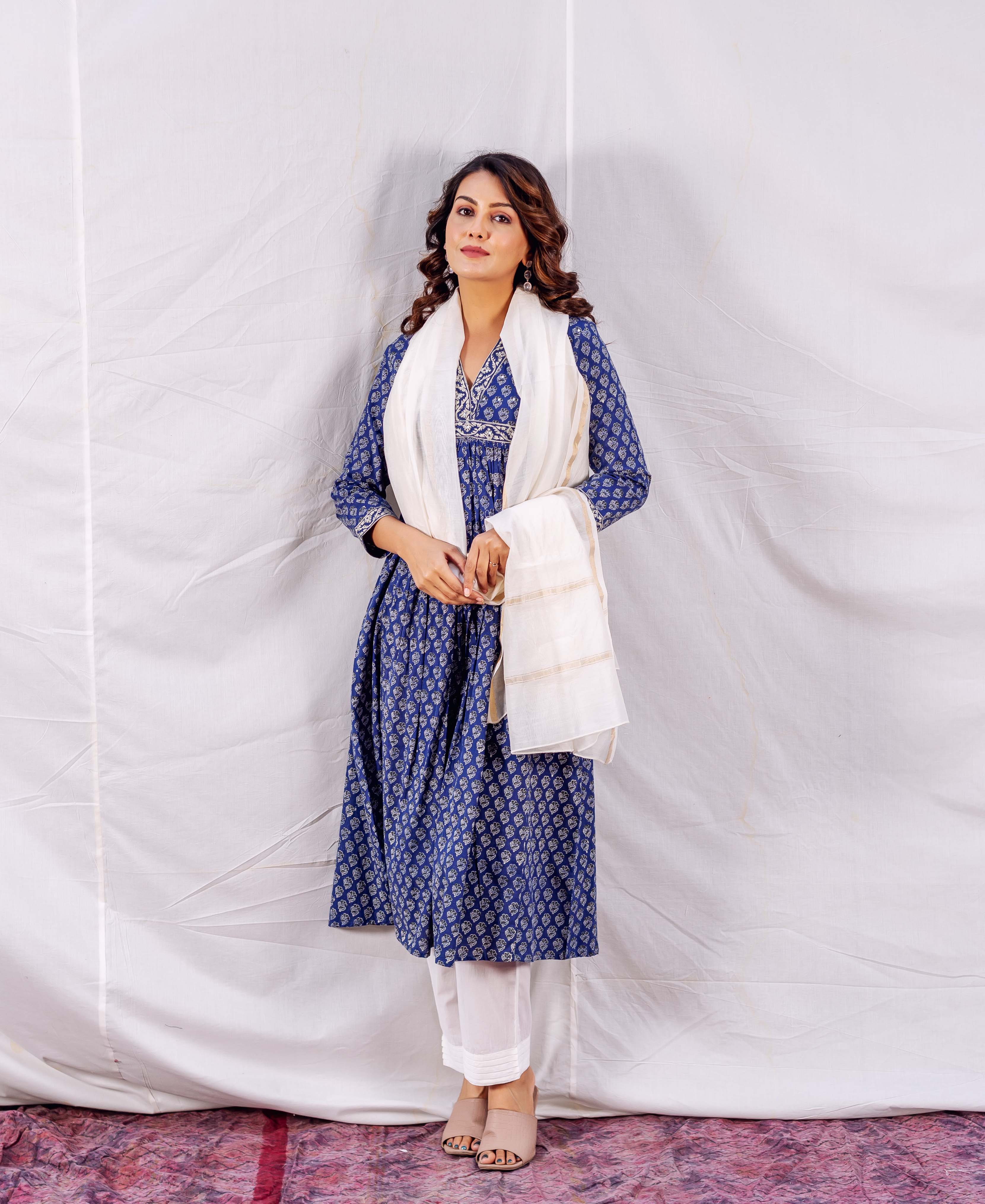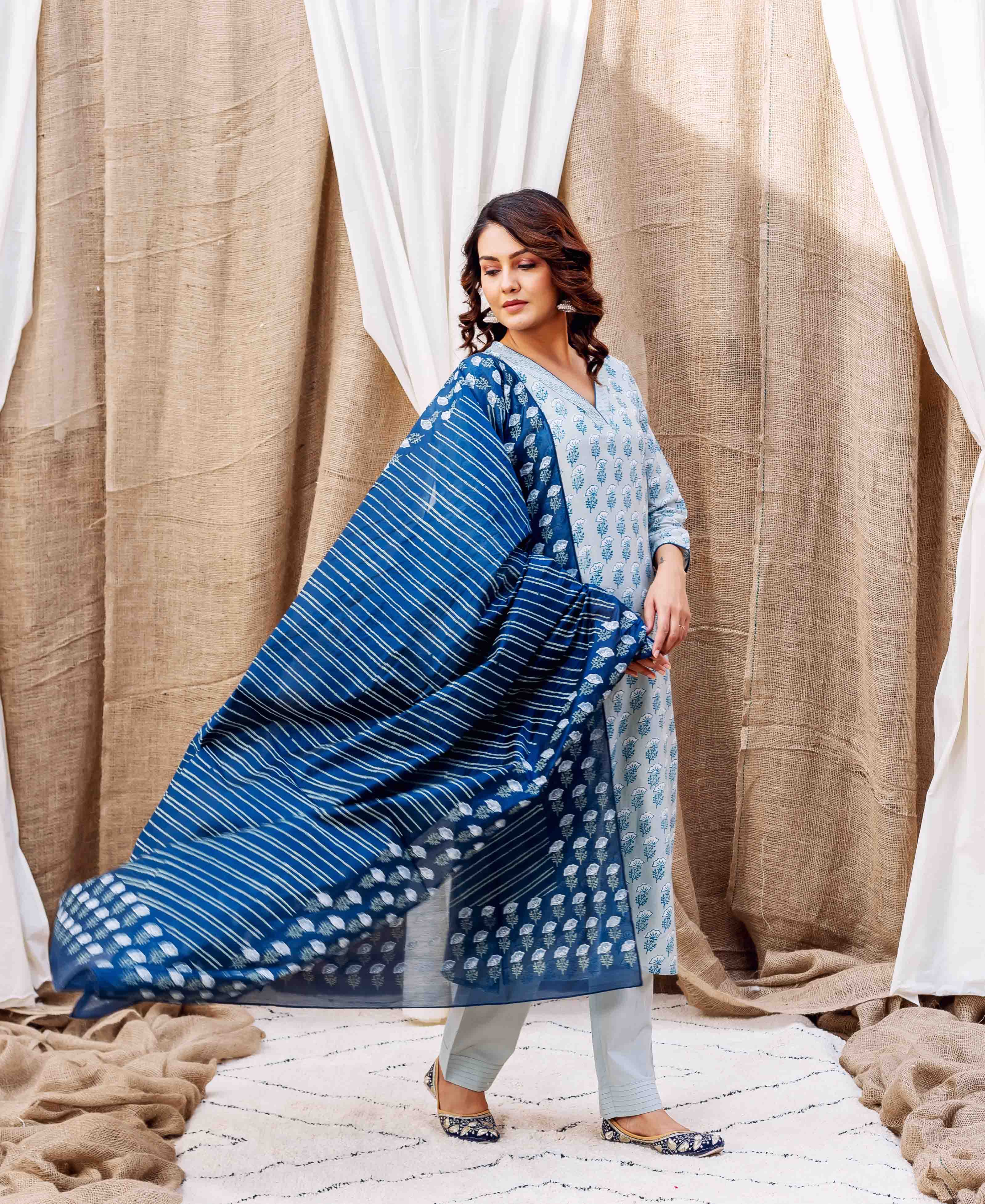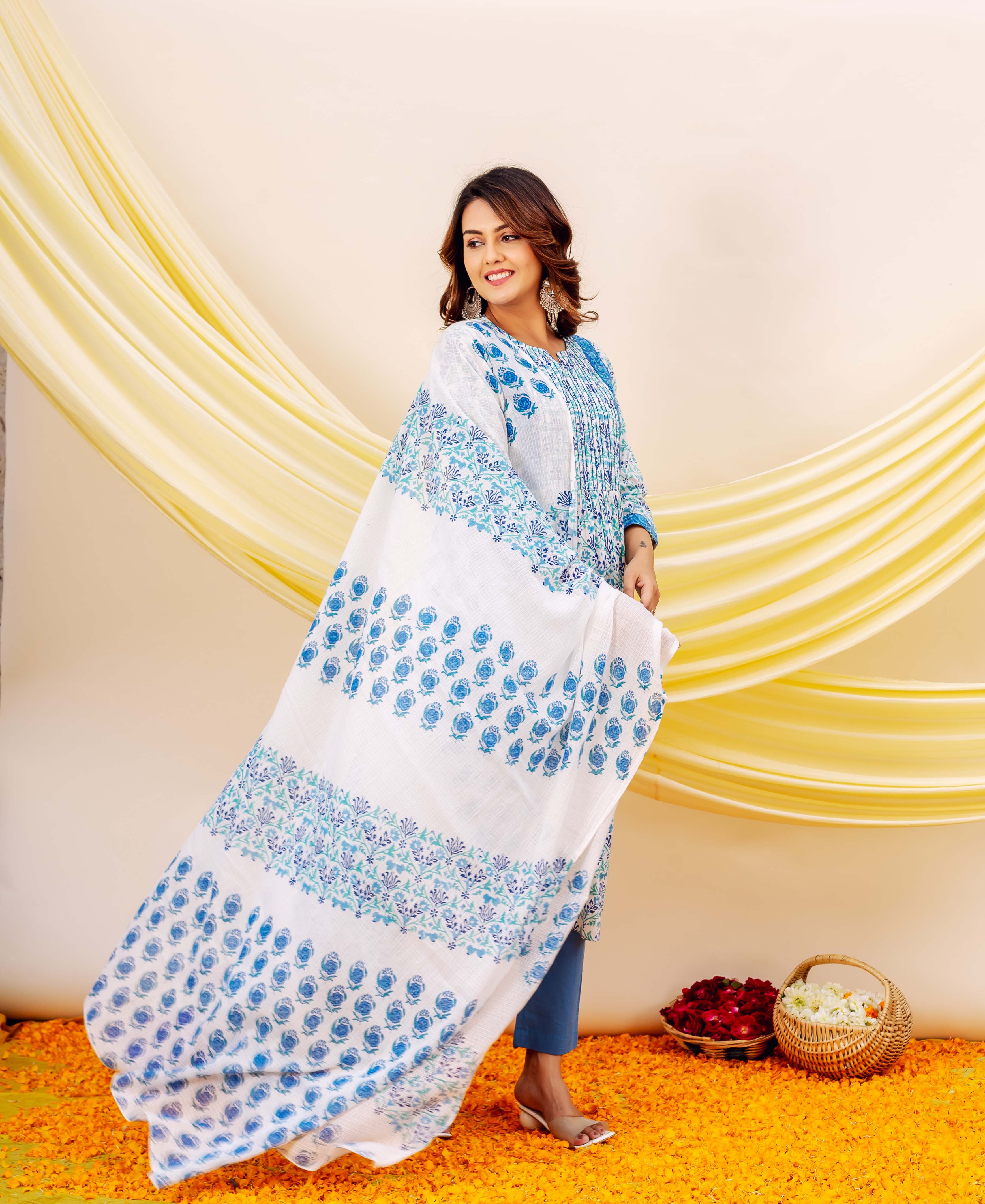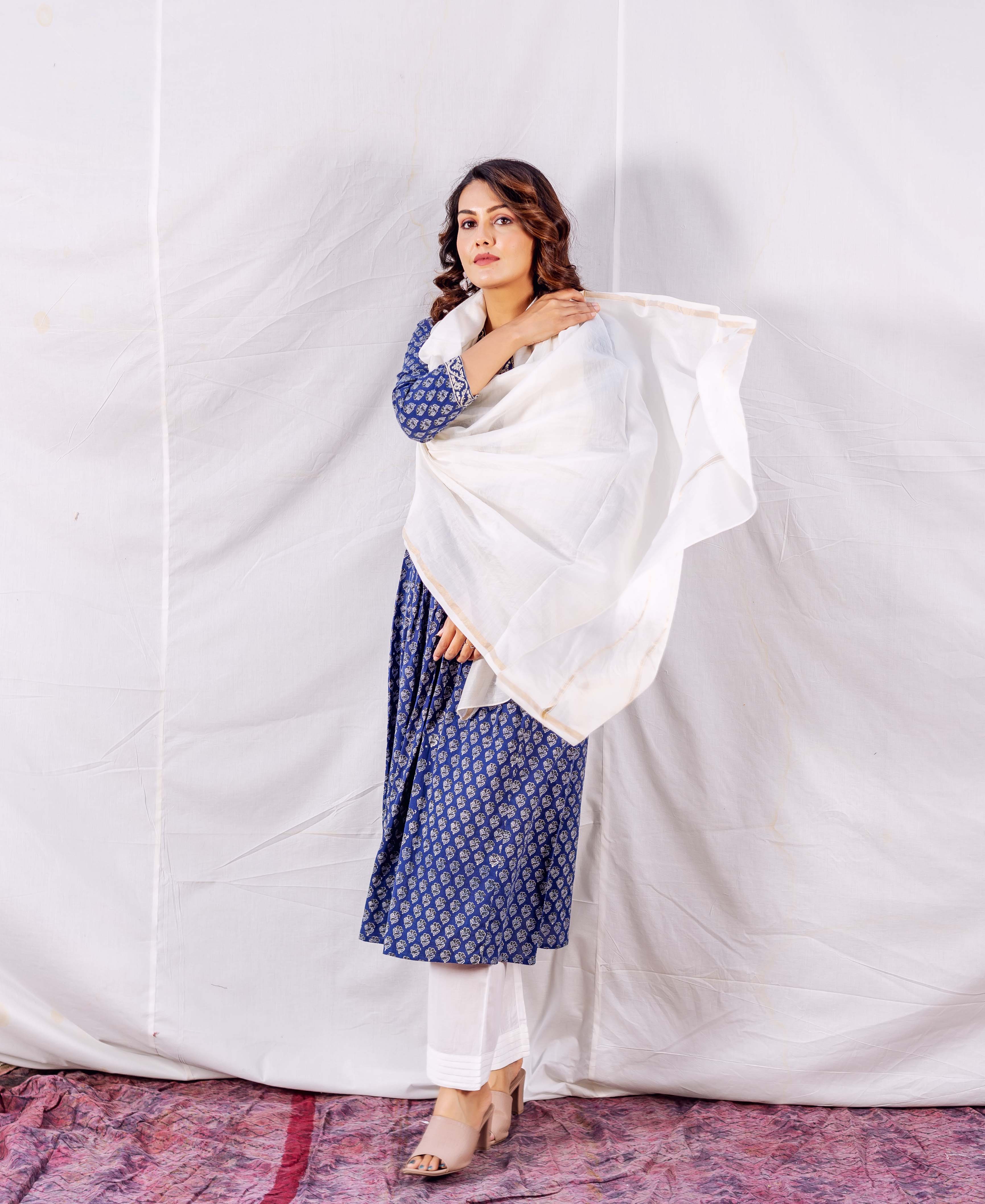 White and Blue Kota Doriya Hand Block Printed Dupatta