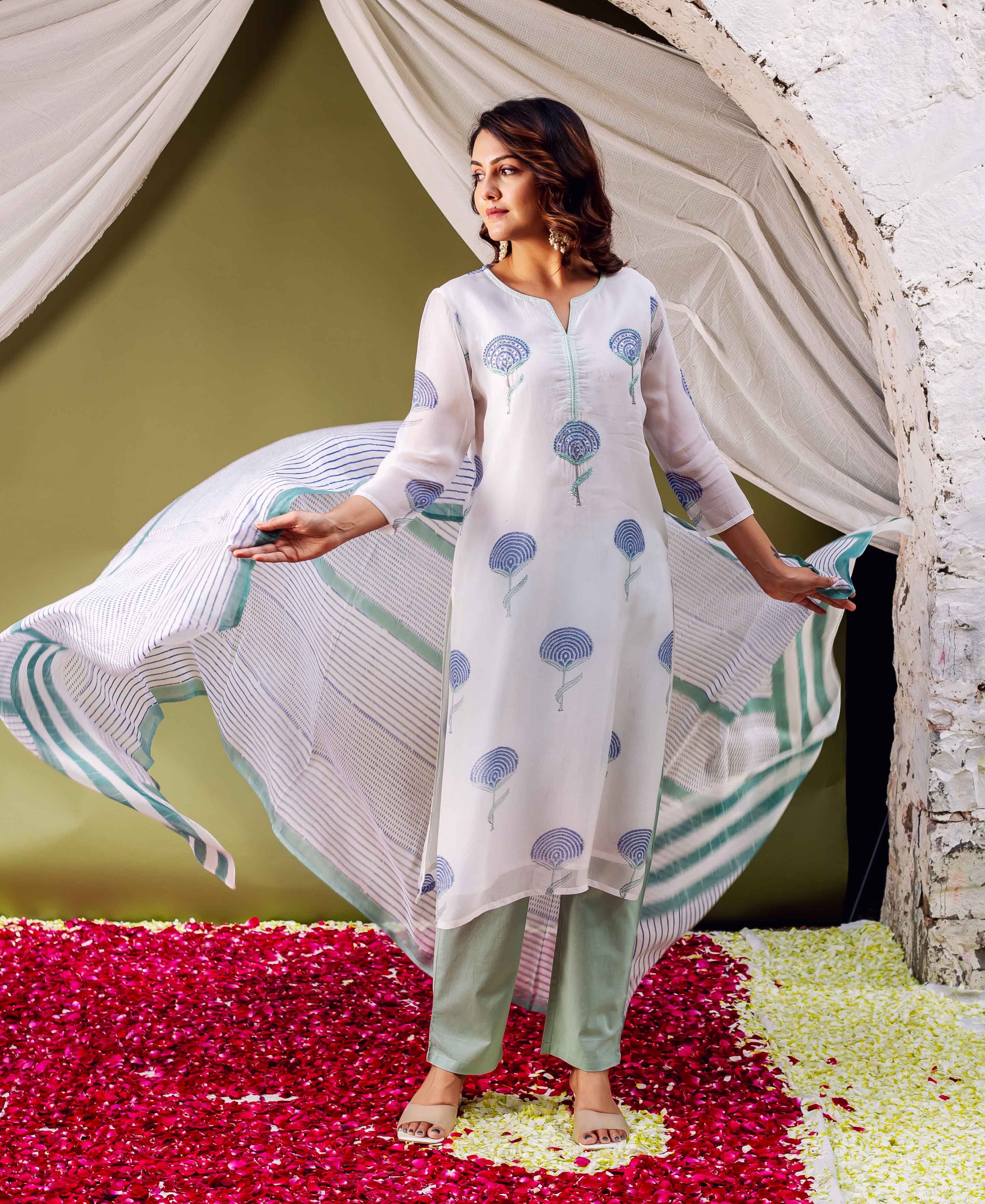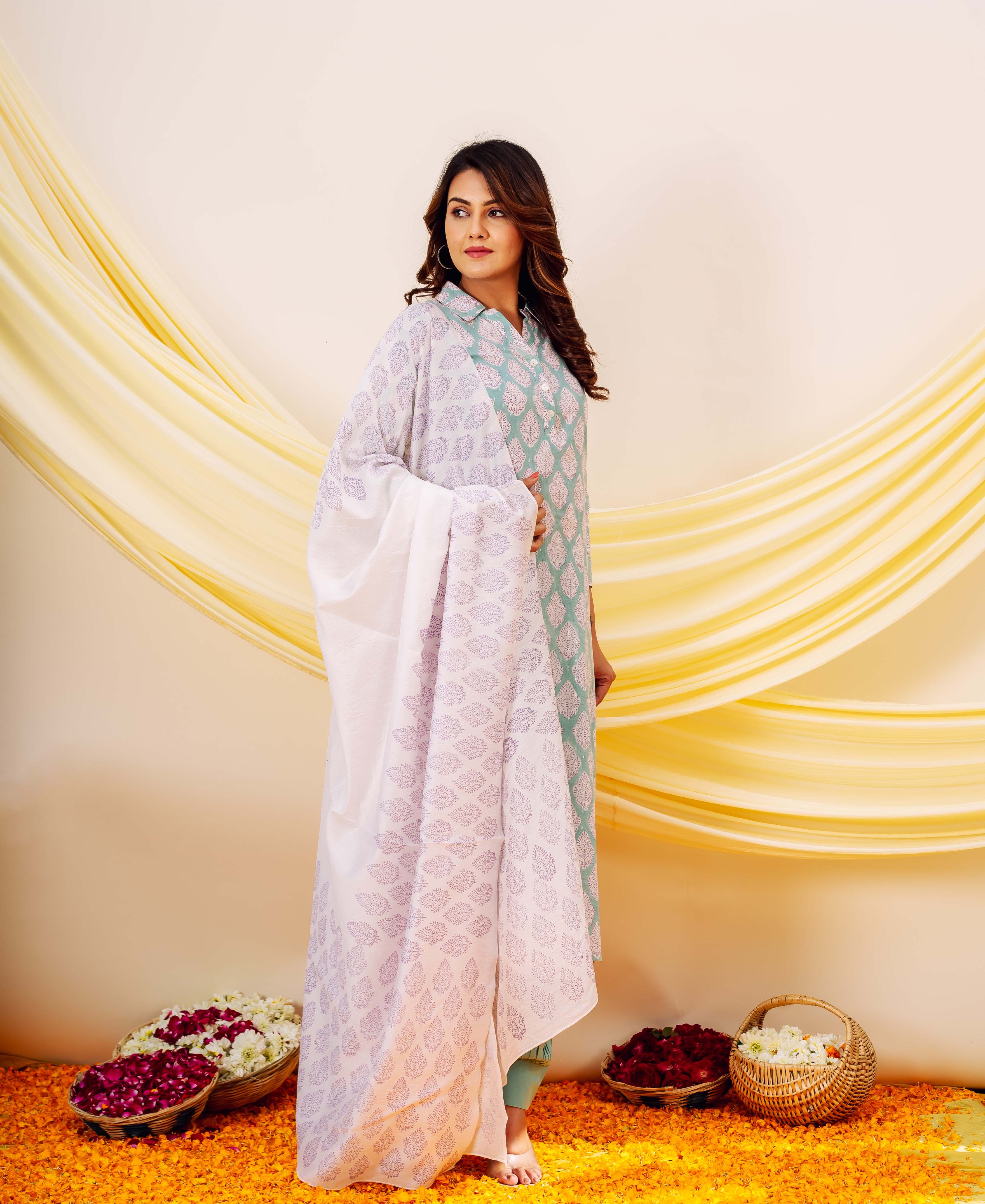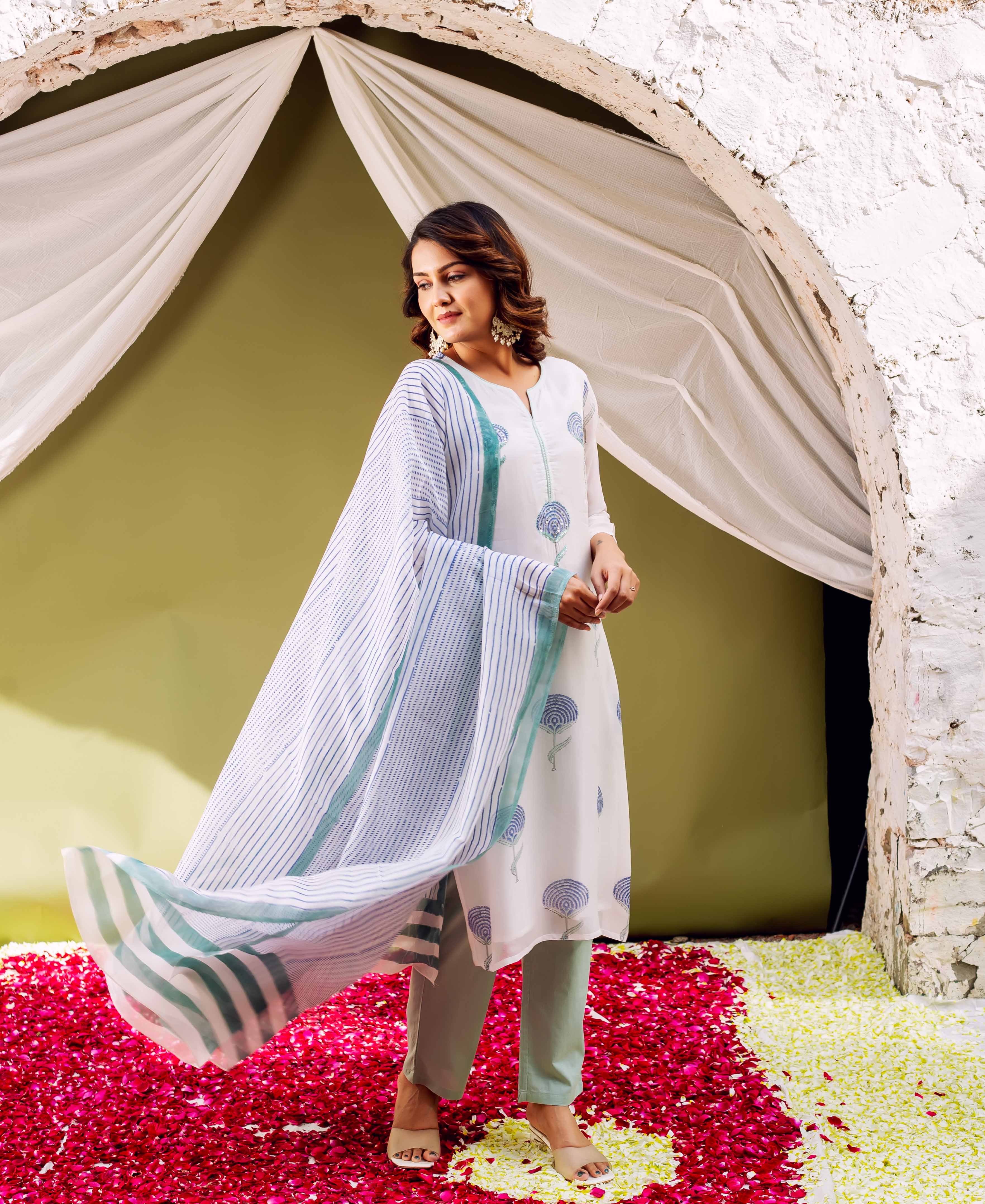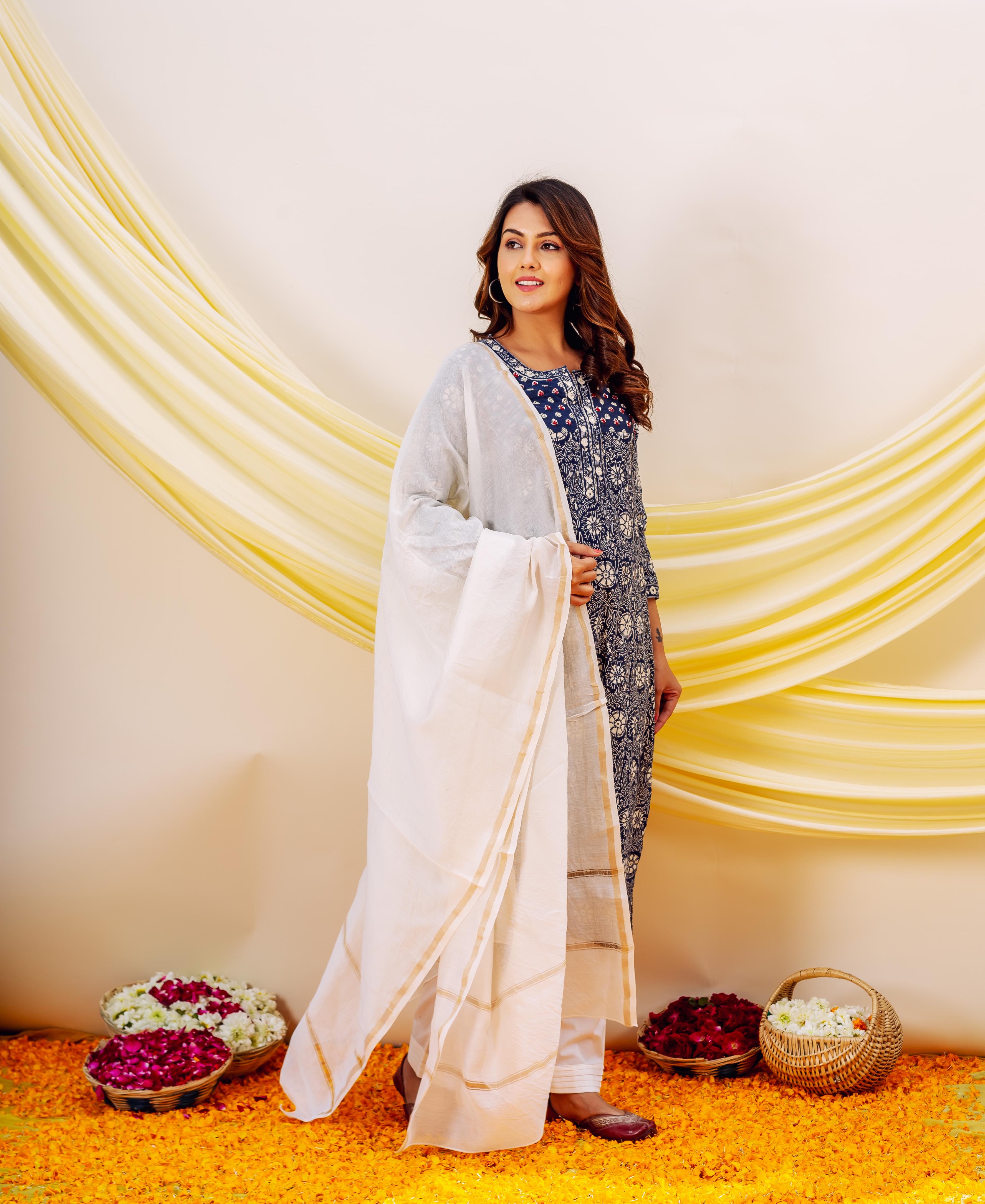White and Blue Kota Doriya Hand Block Printed Dupatta