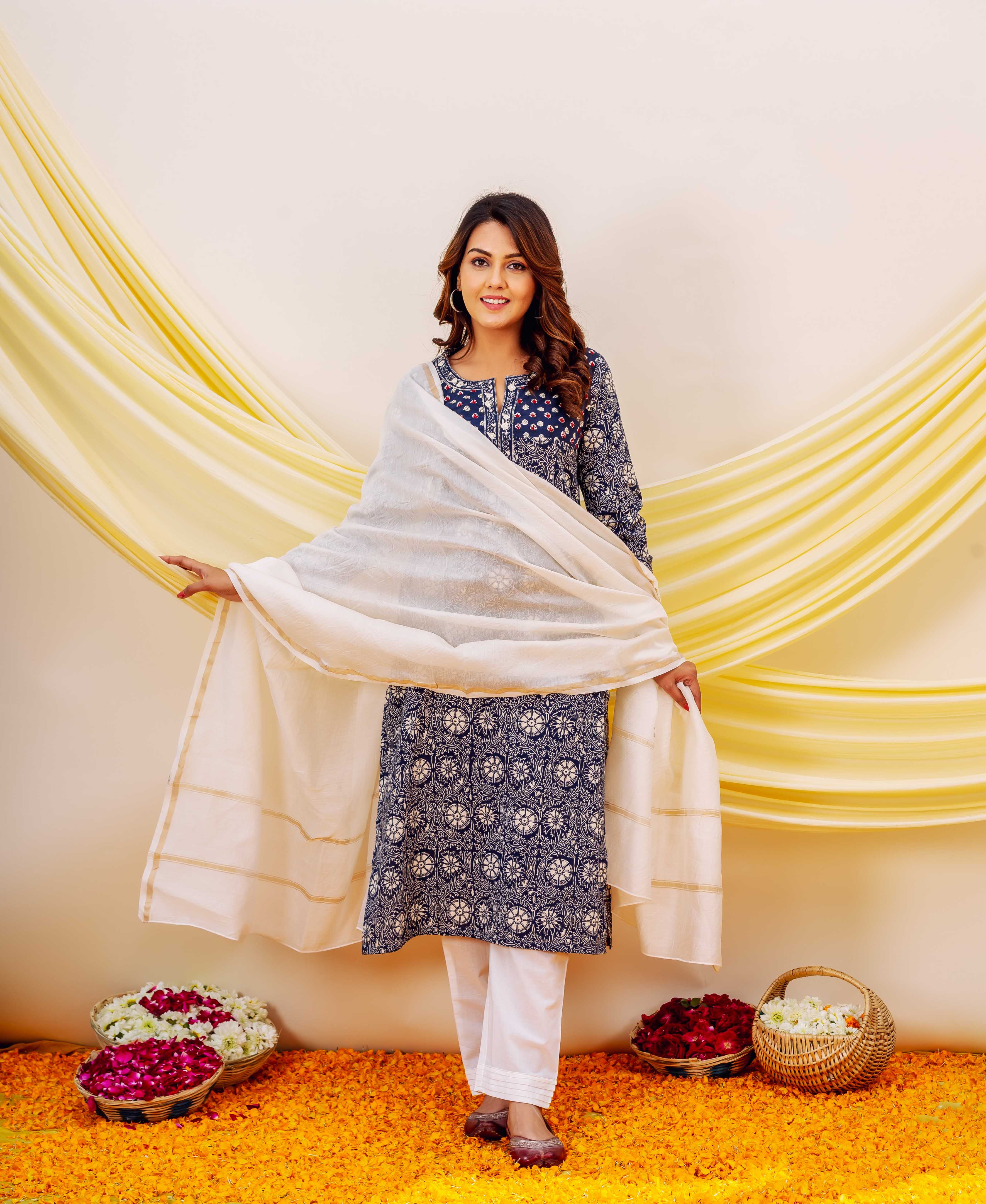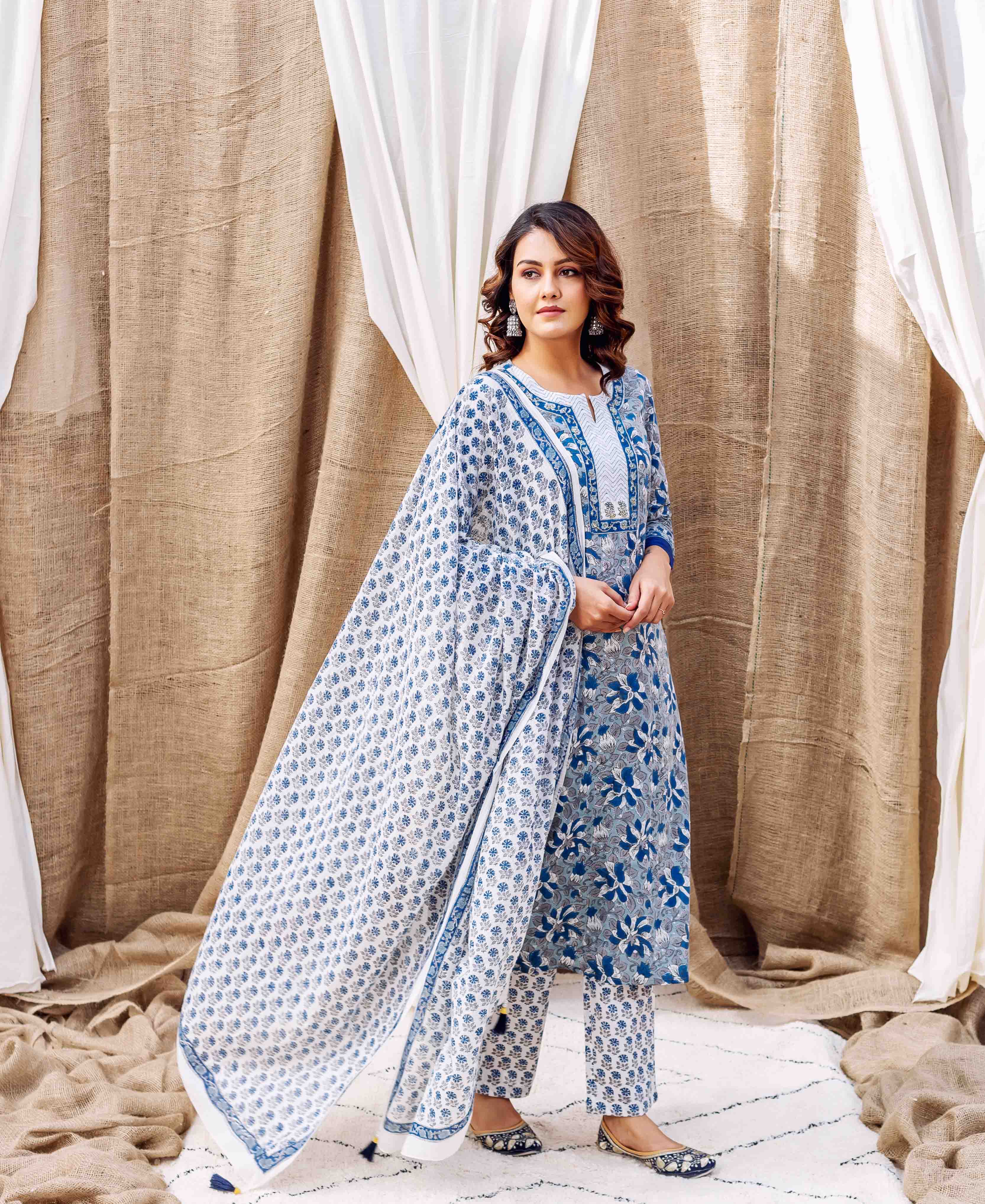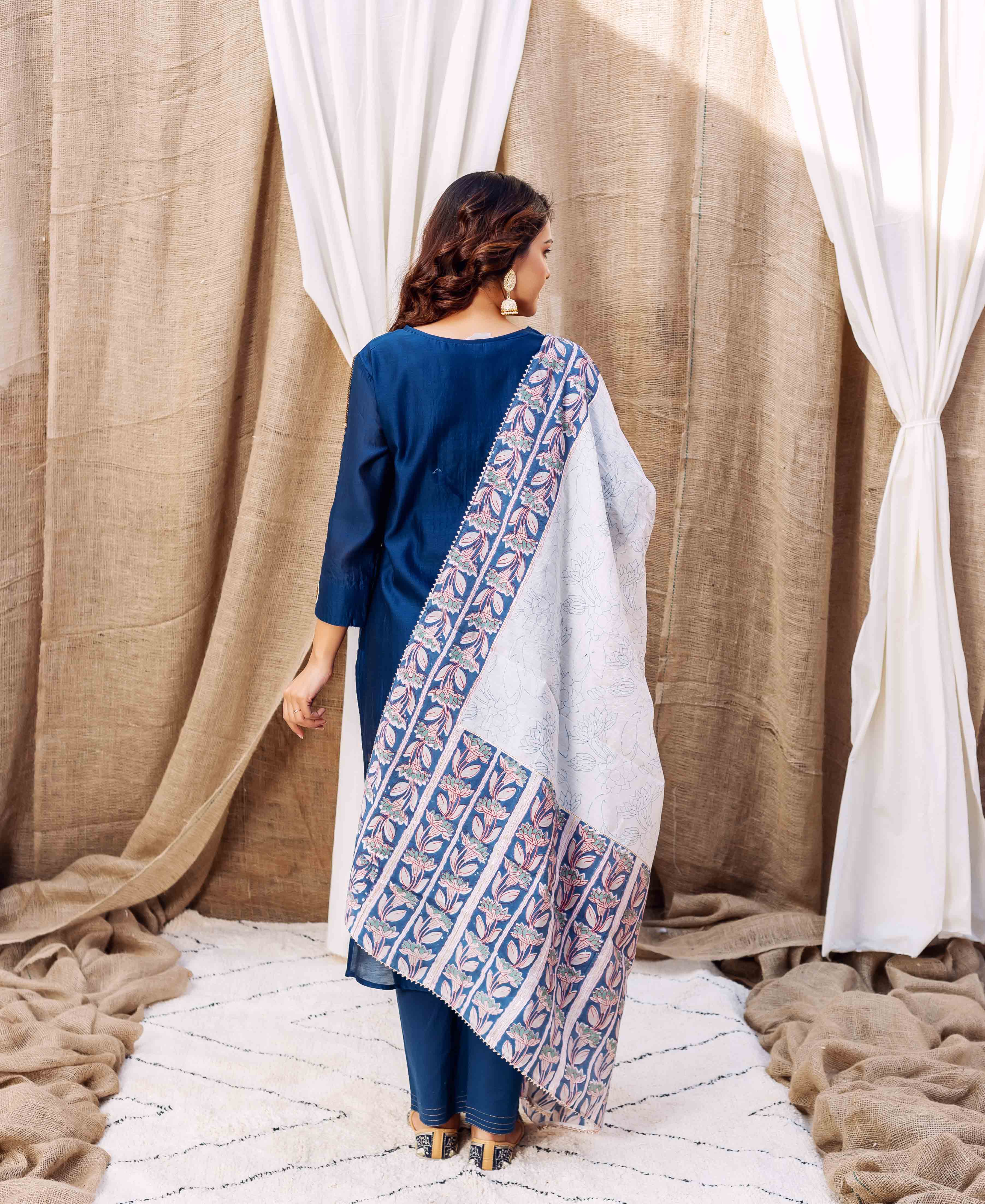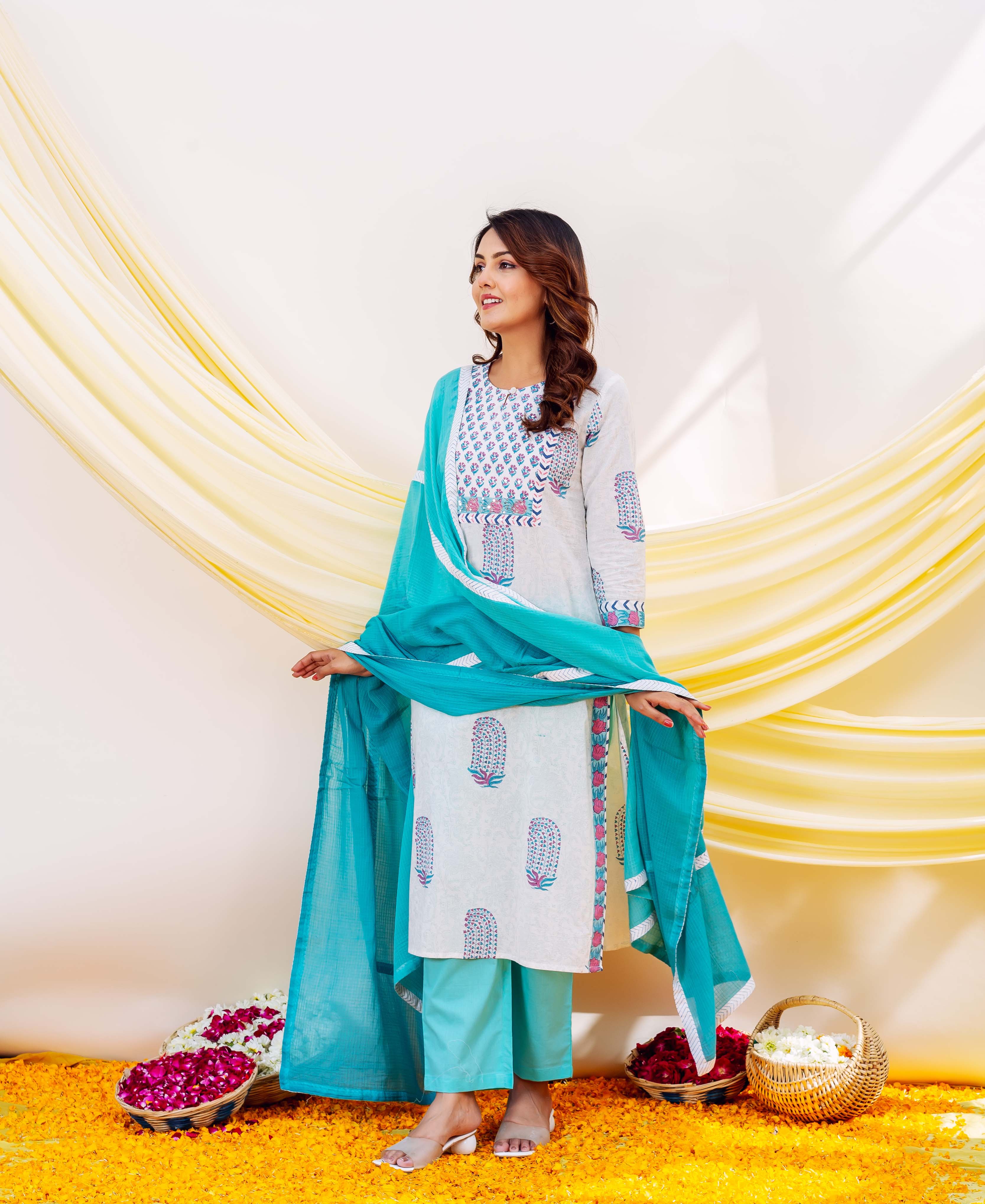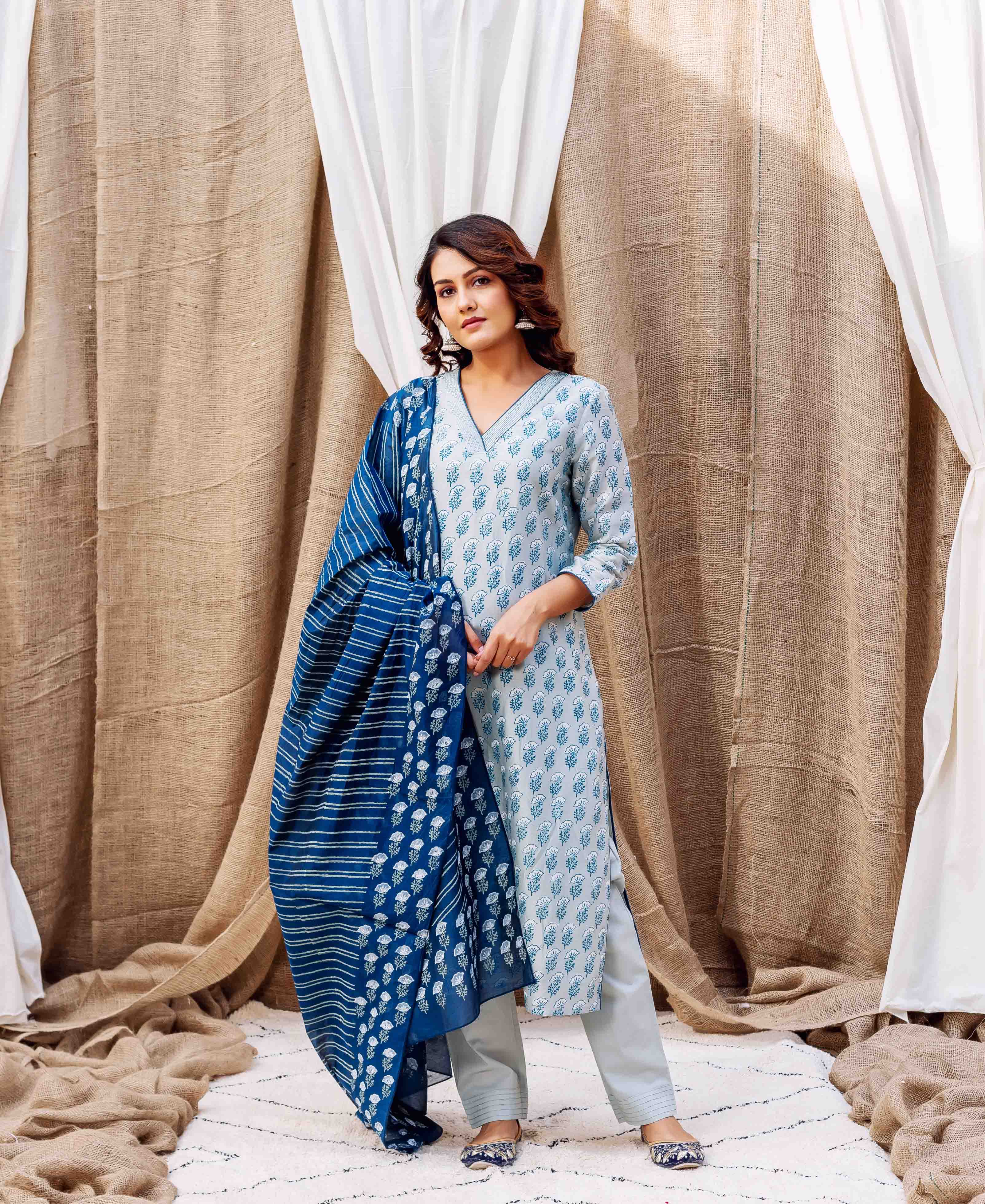 White and Blue Kota Doriya Hand Block Printed Dupatta