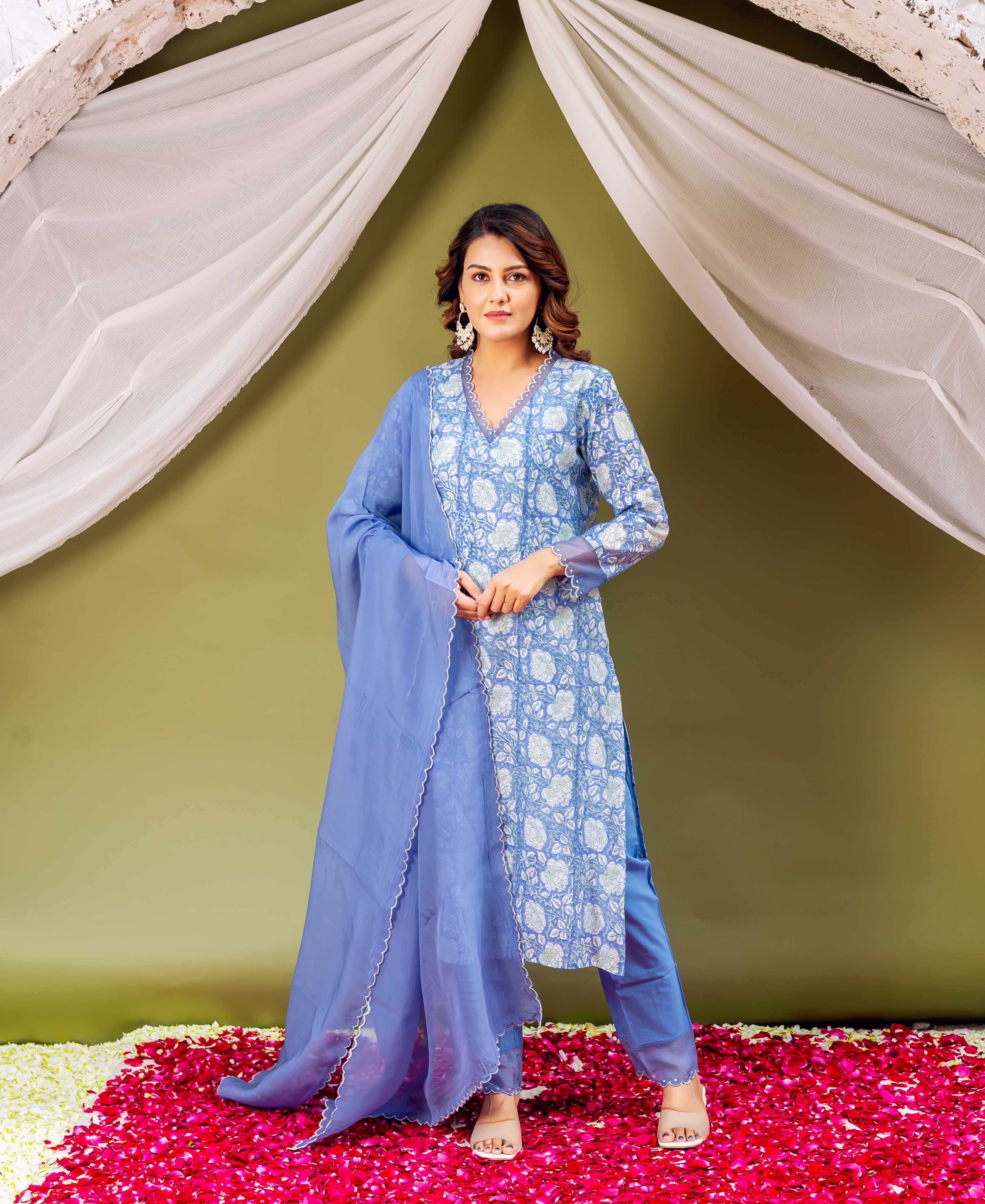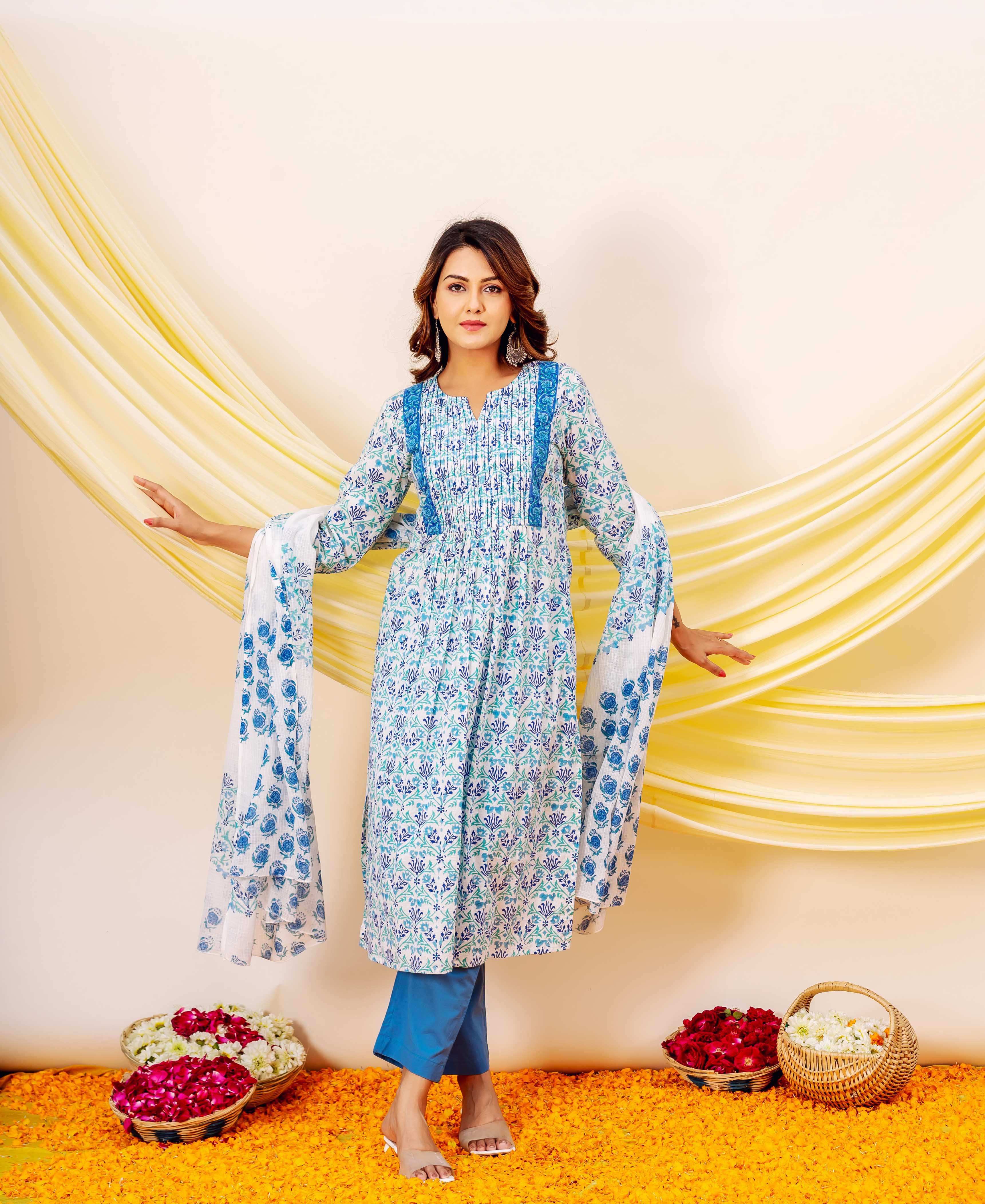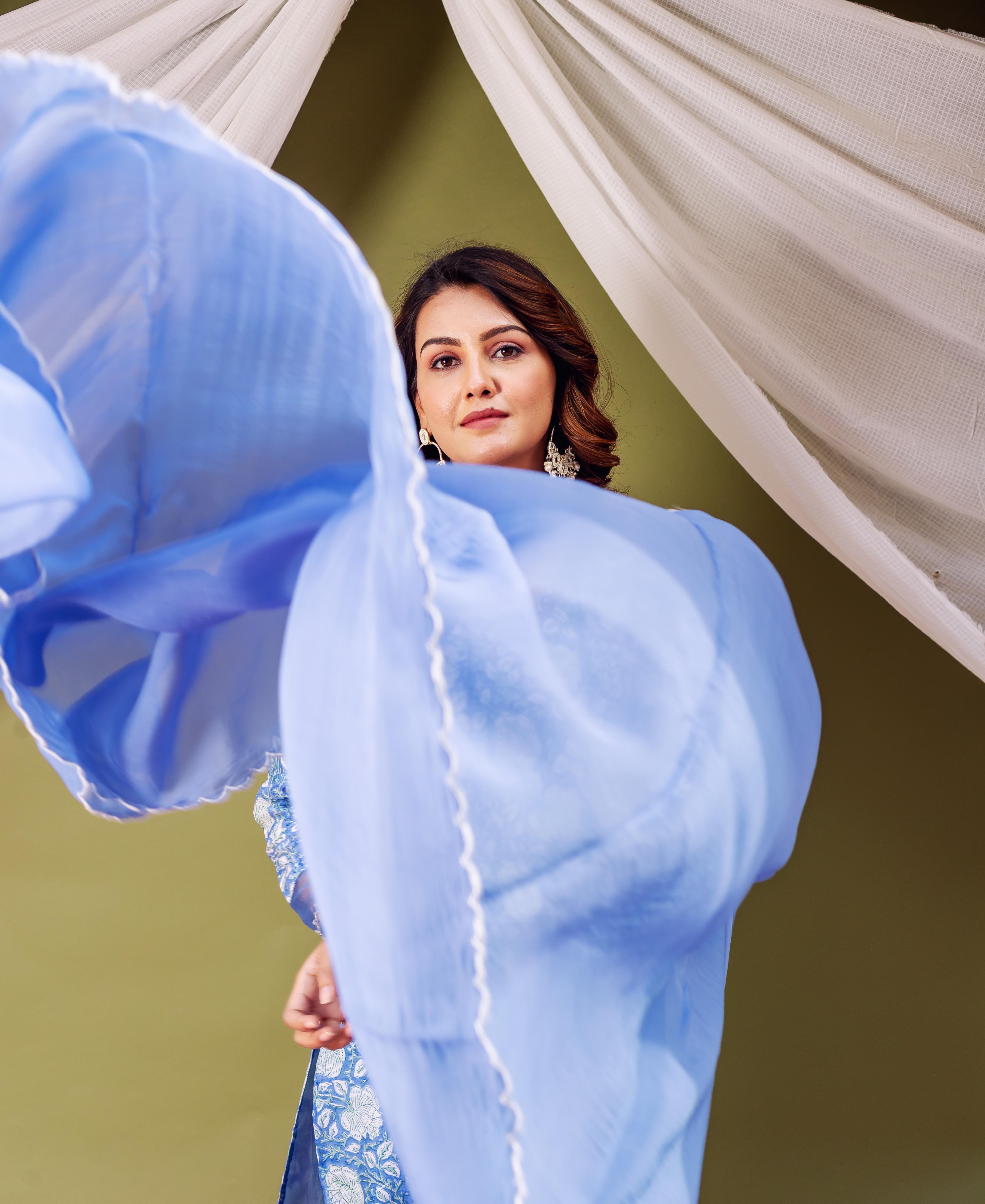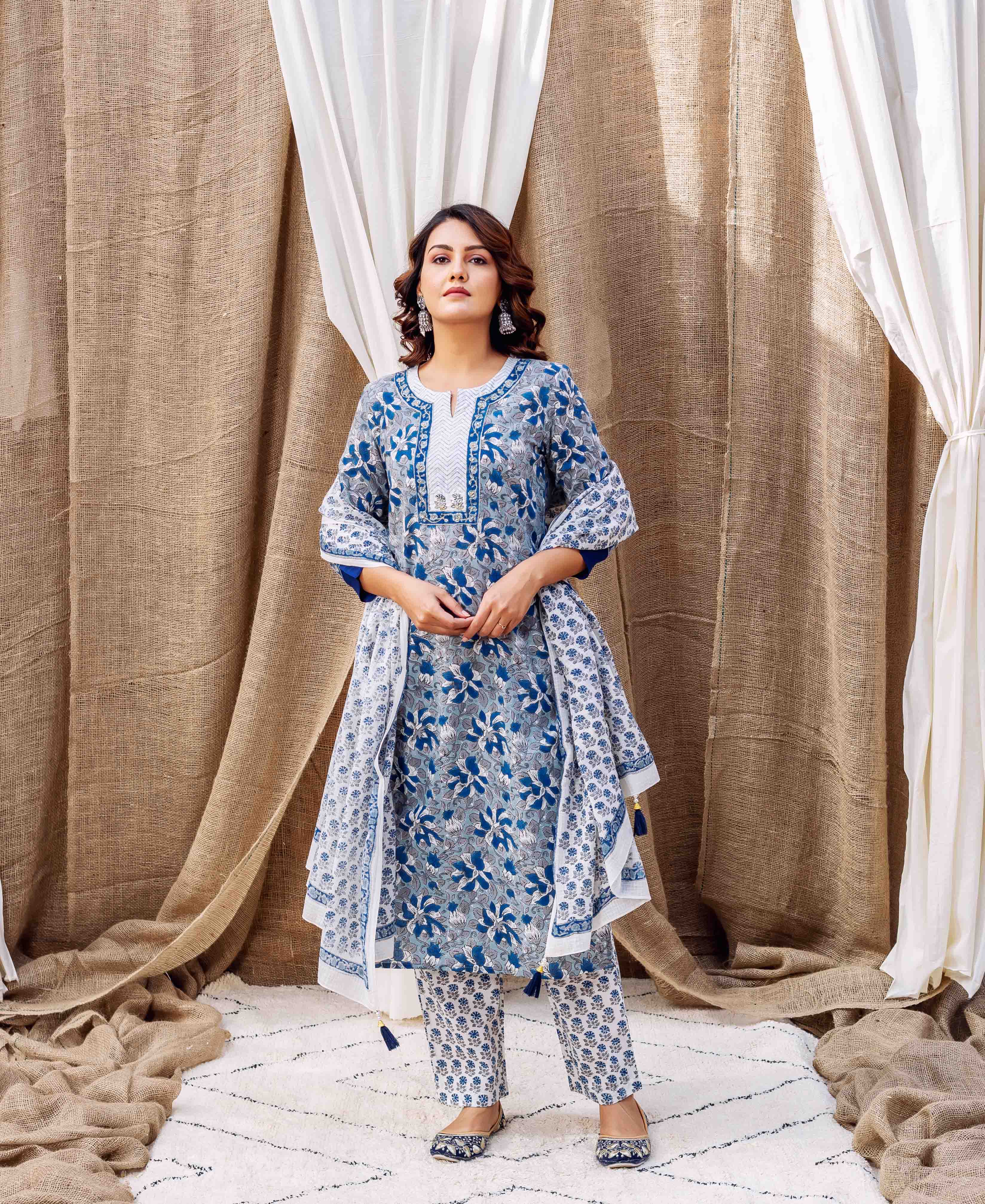 White and Blue Kota Doriya Hand Block Printed Dupatta