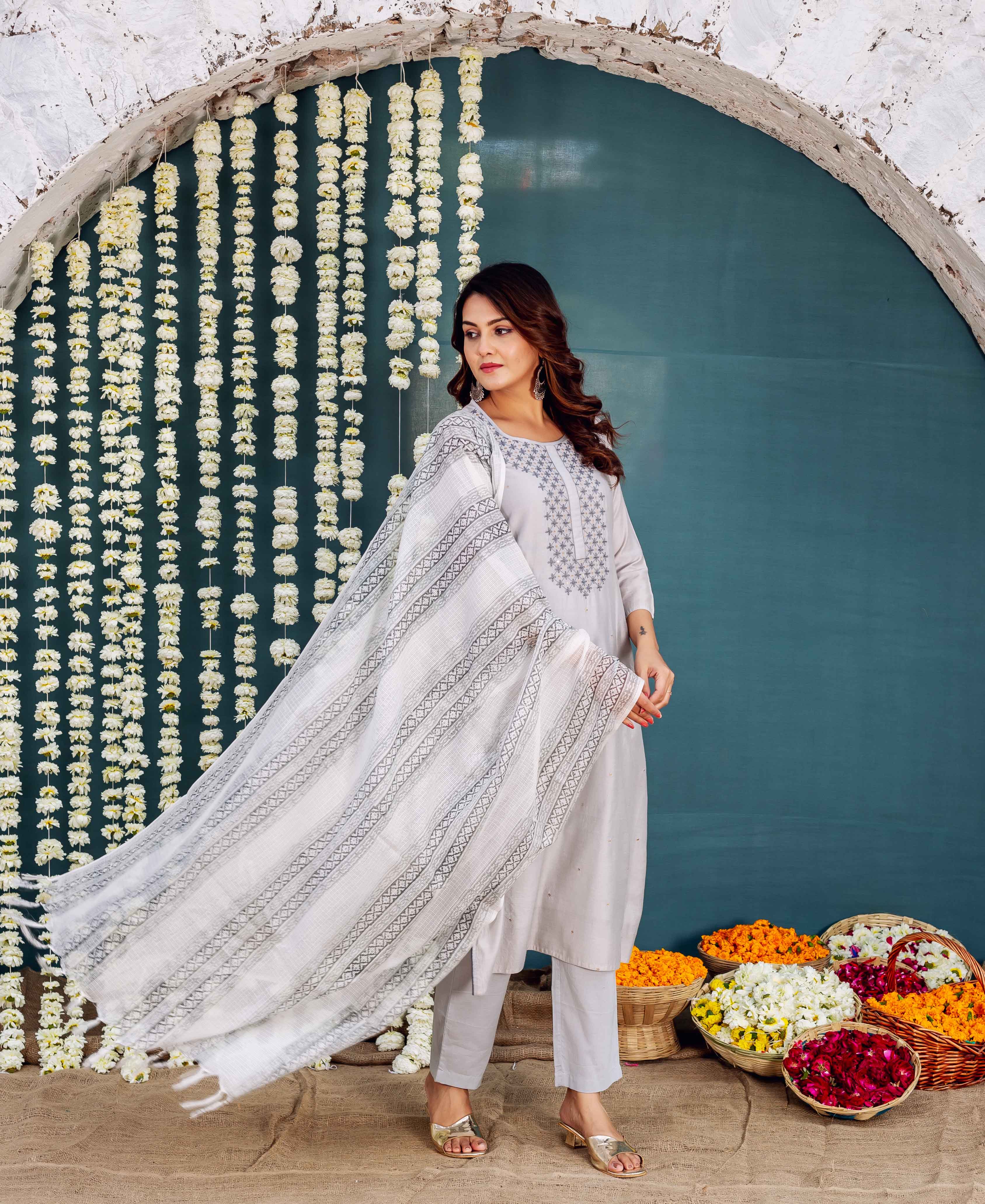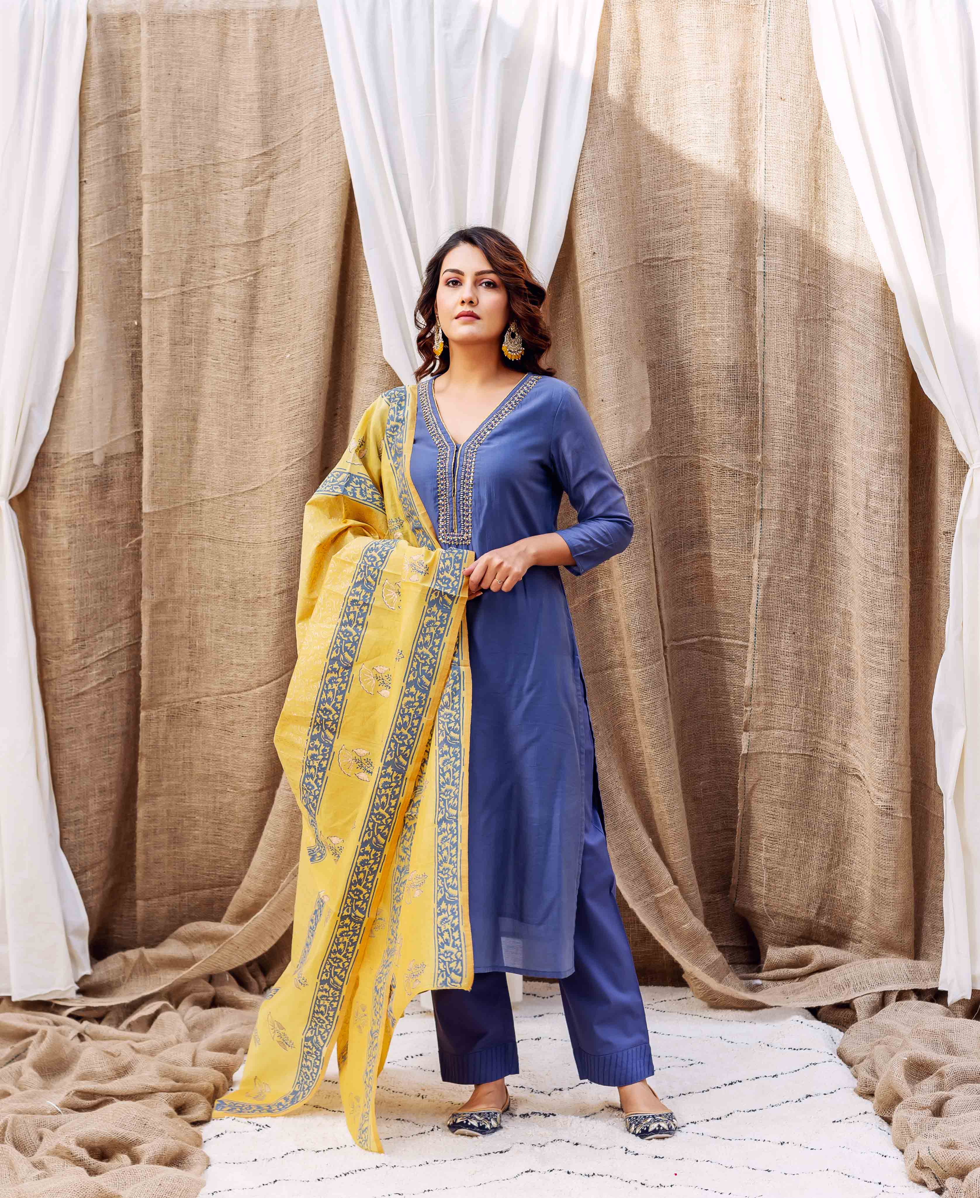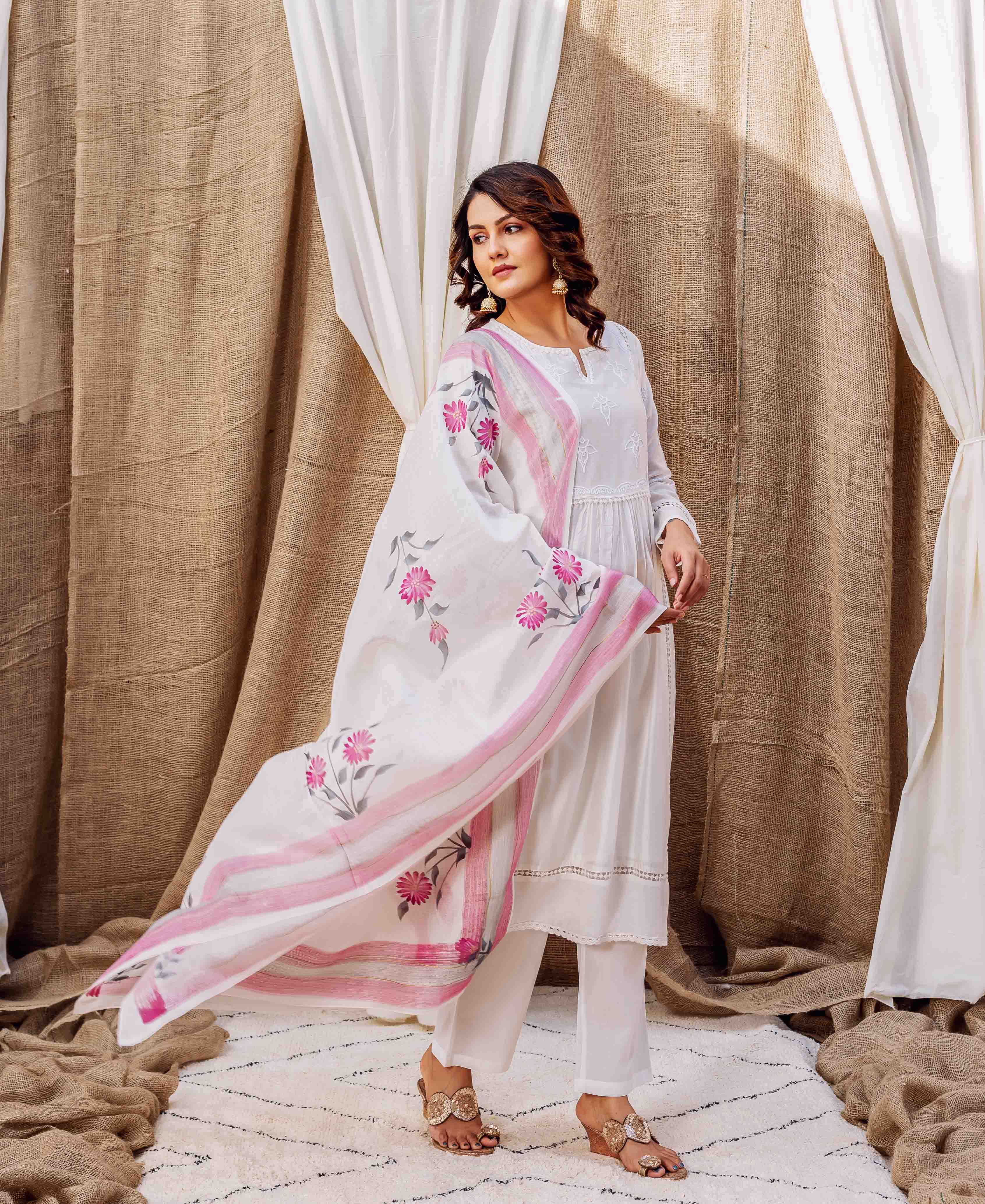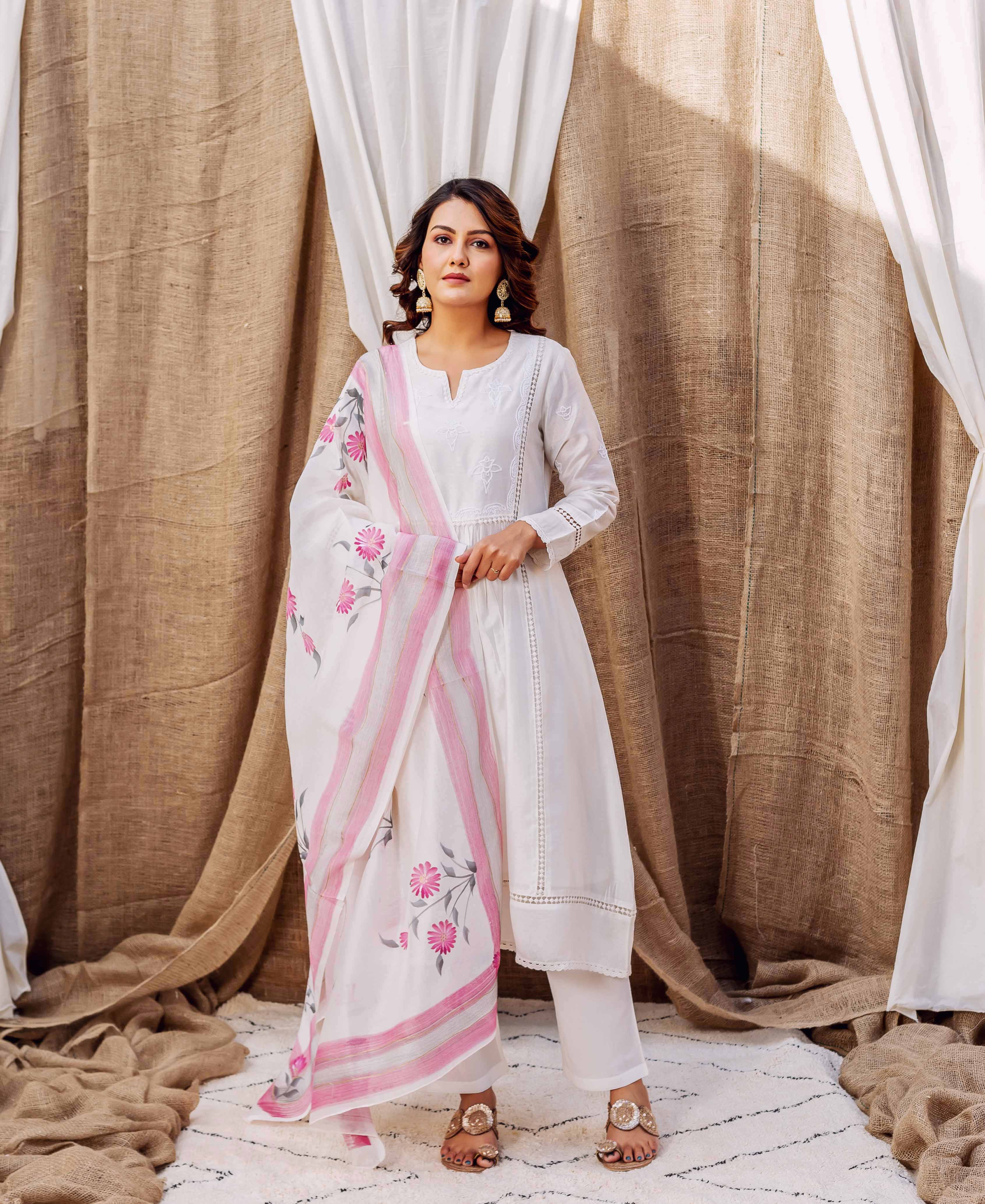 White and Blue Kota Doriya Hand Block Printed Dupatta
