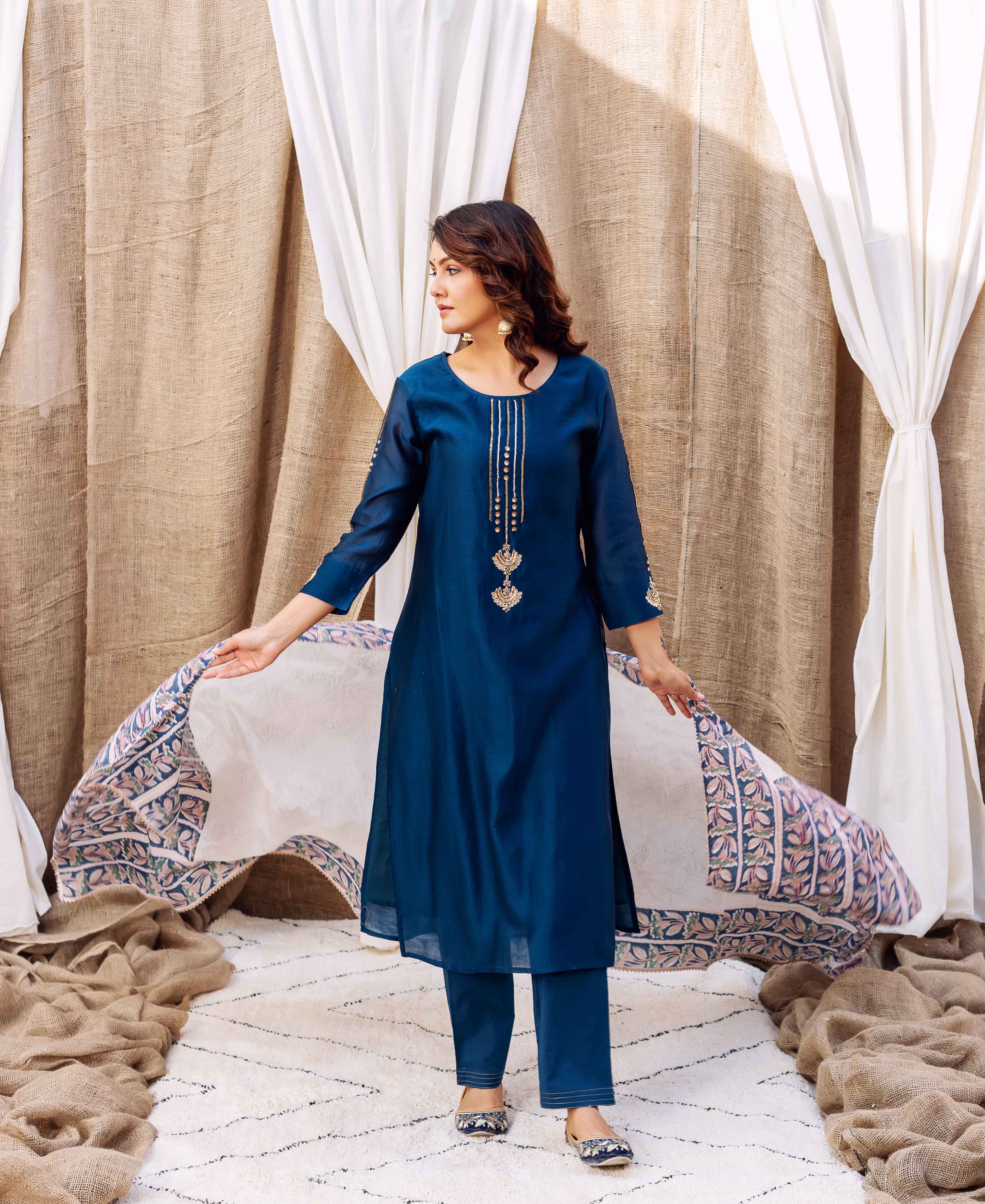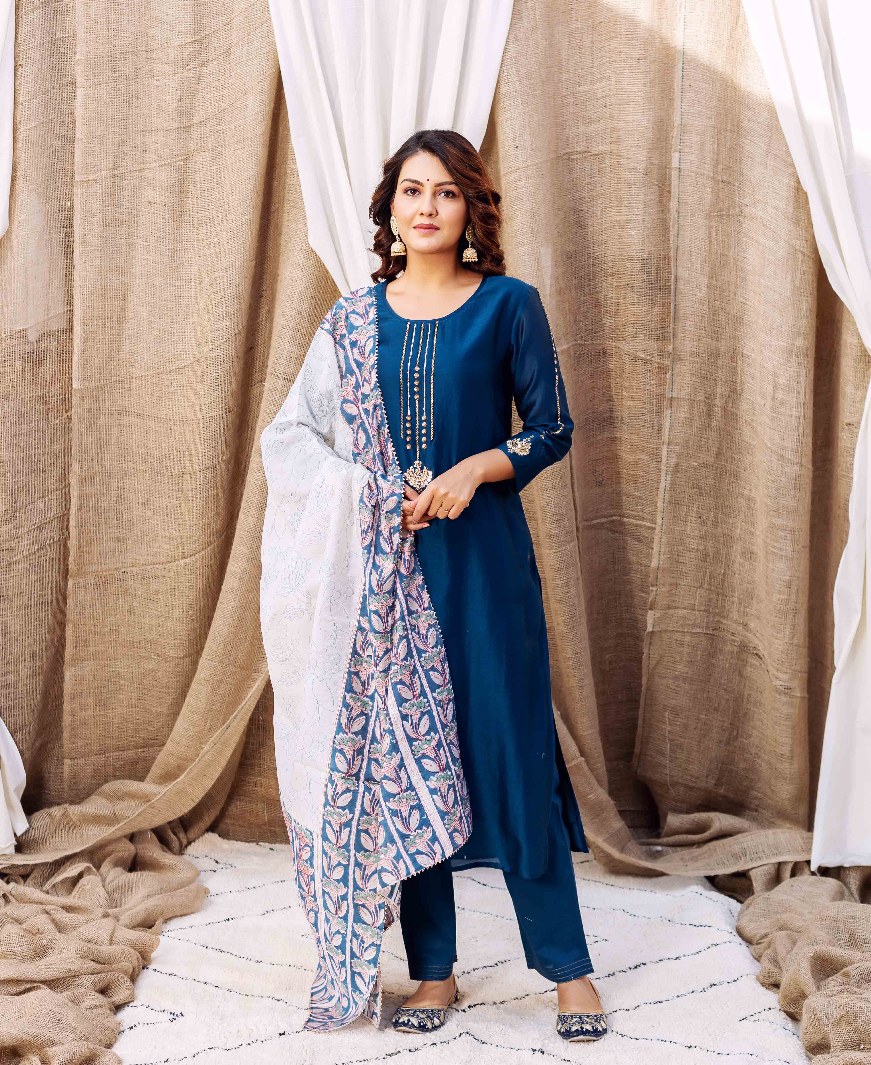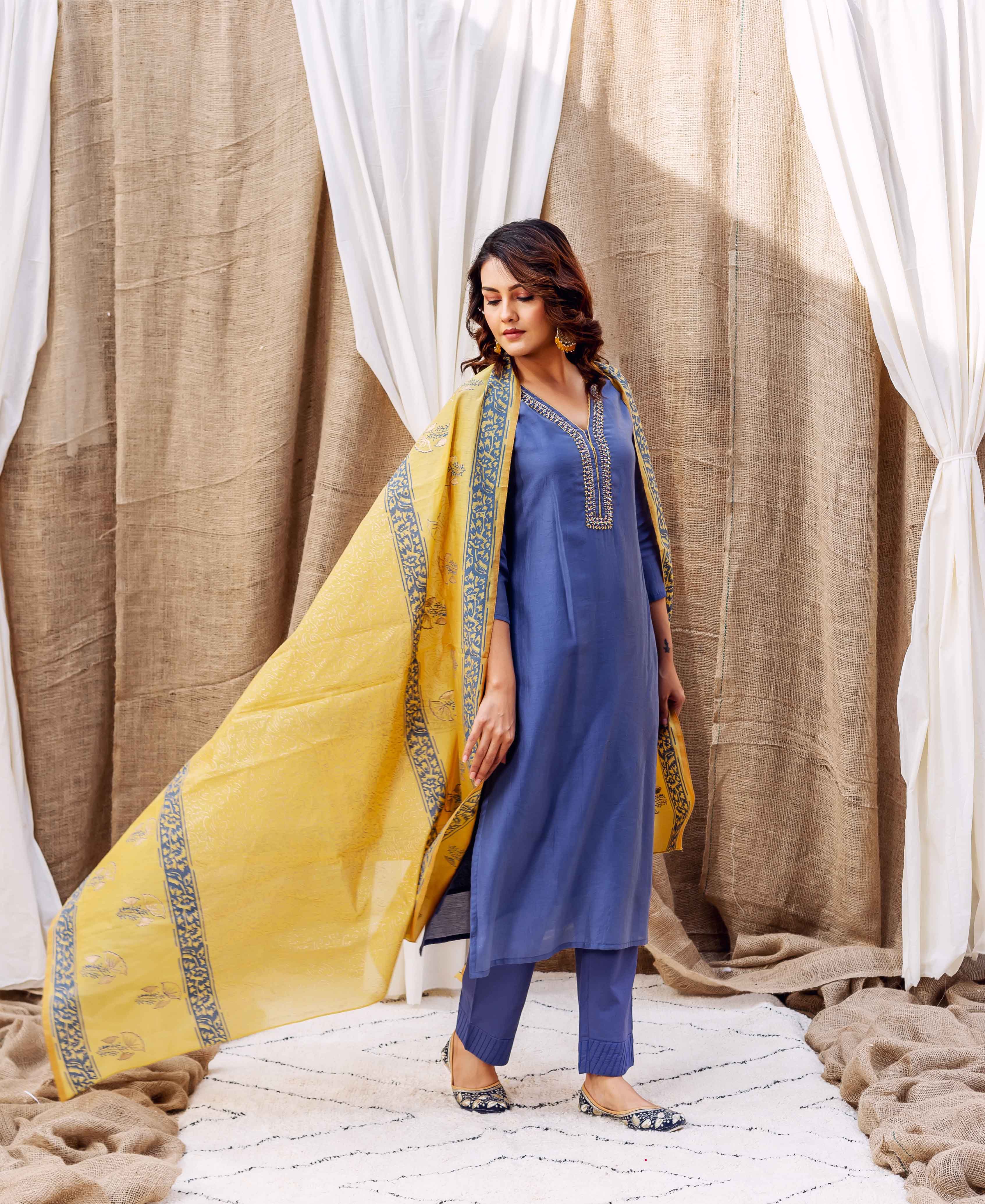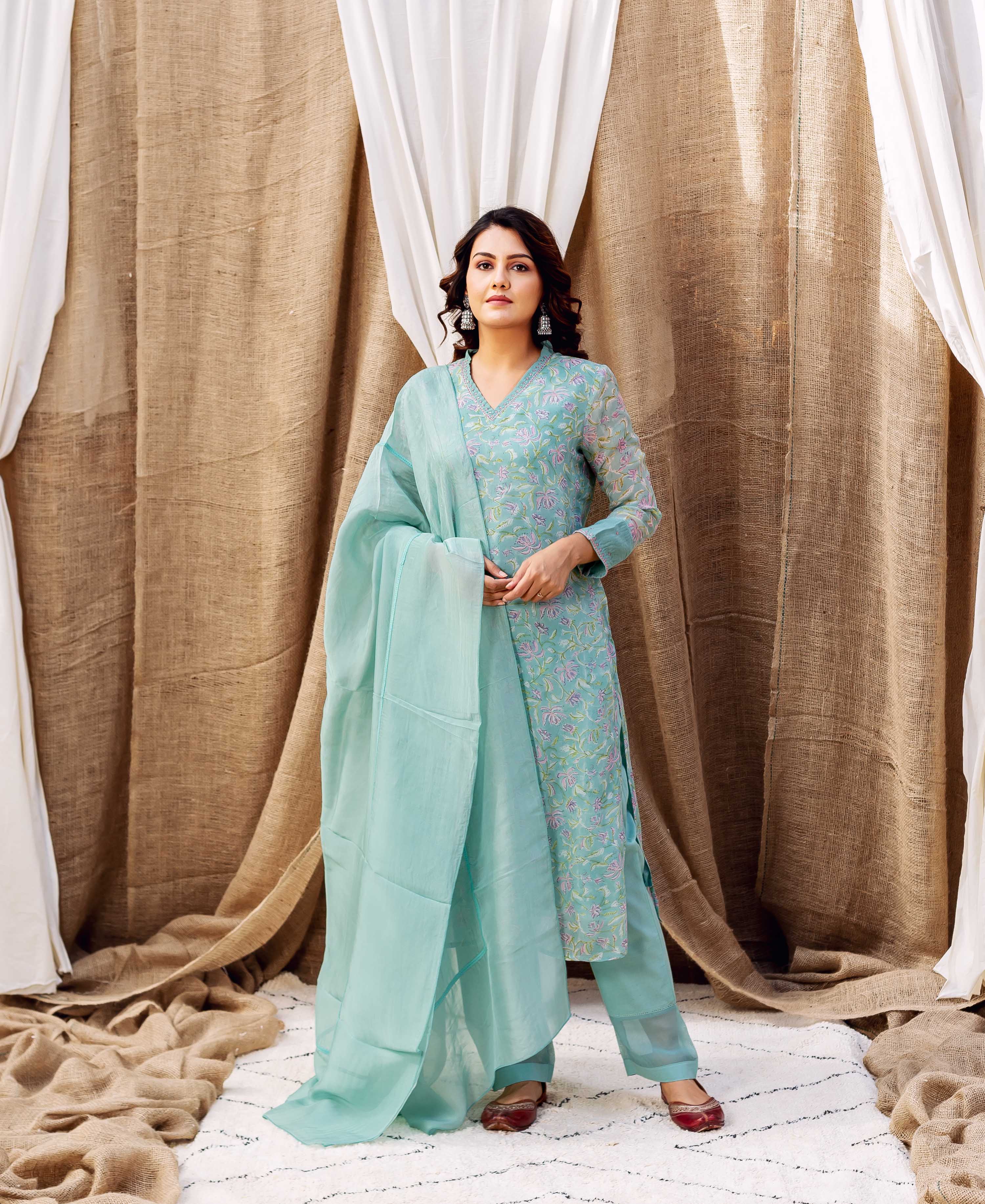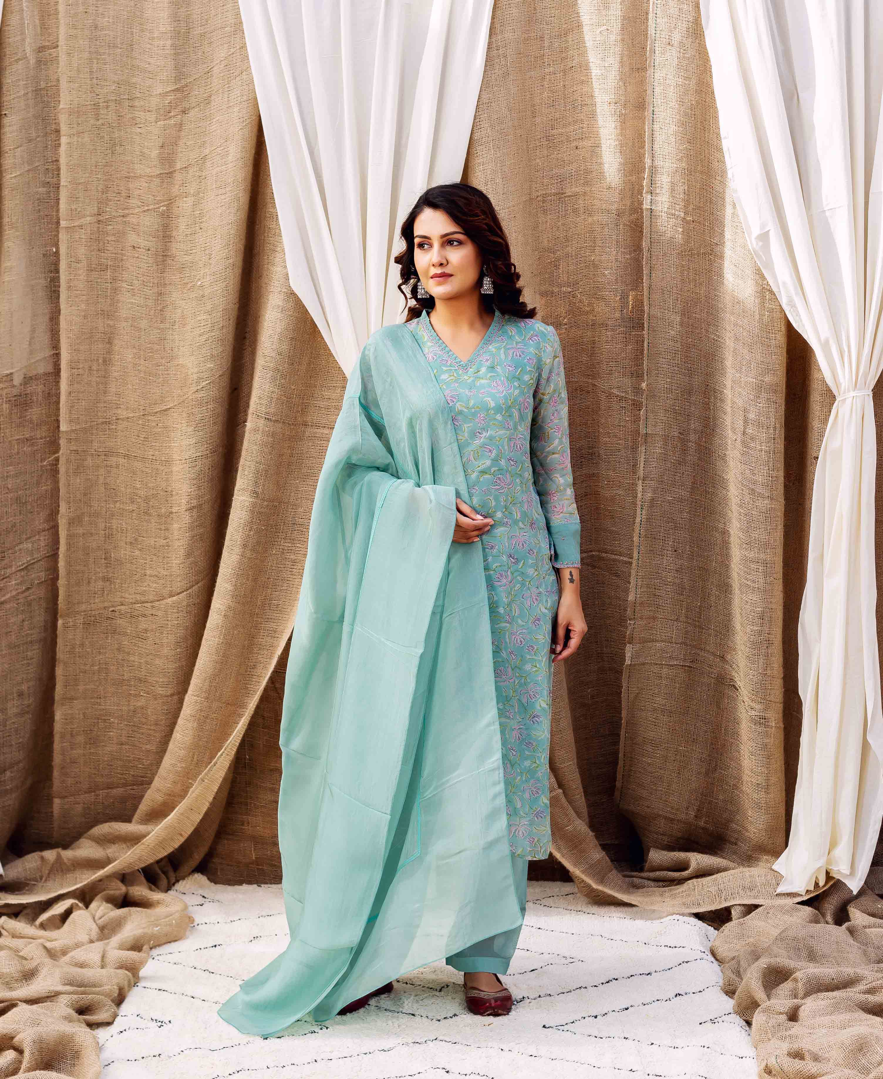 Teal Blue Silk Chanderi Hand Block Printed Dupatta