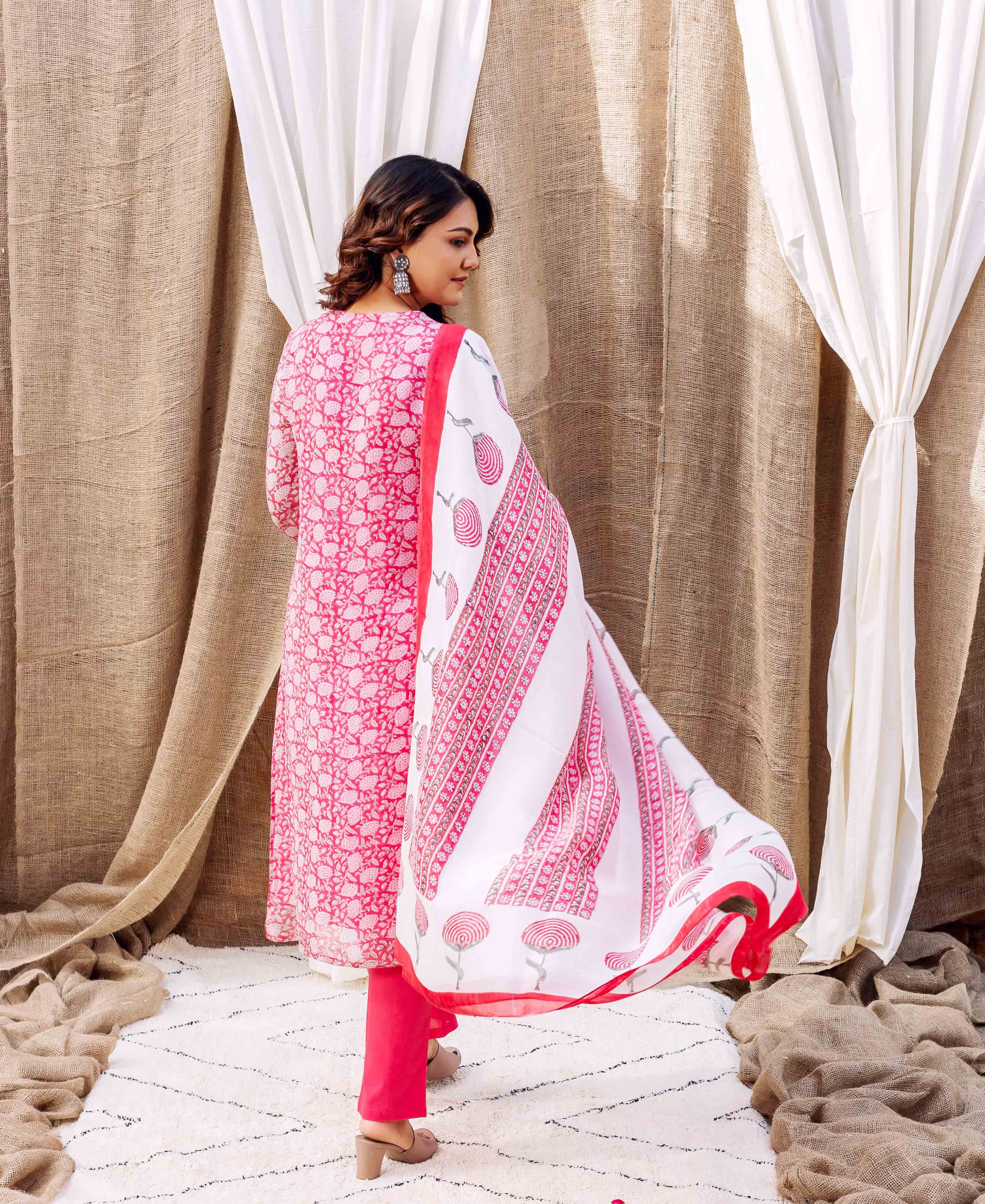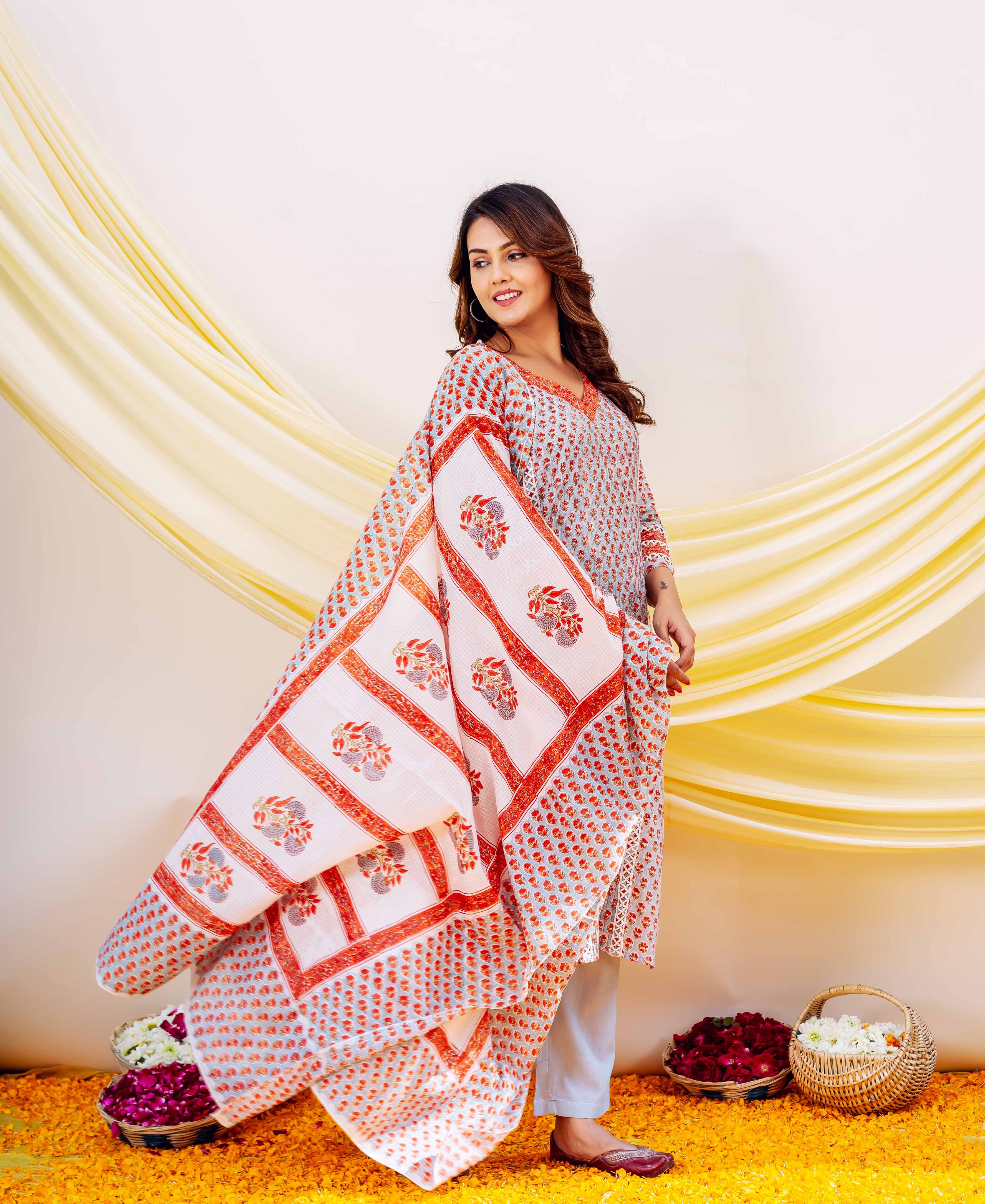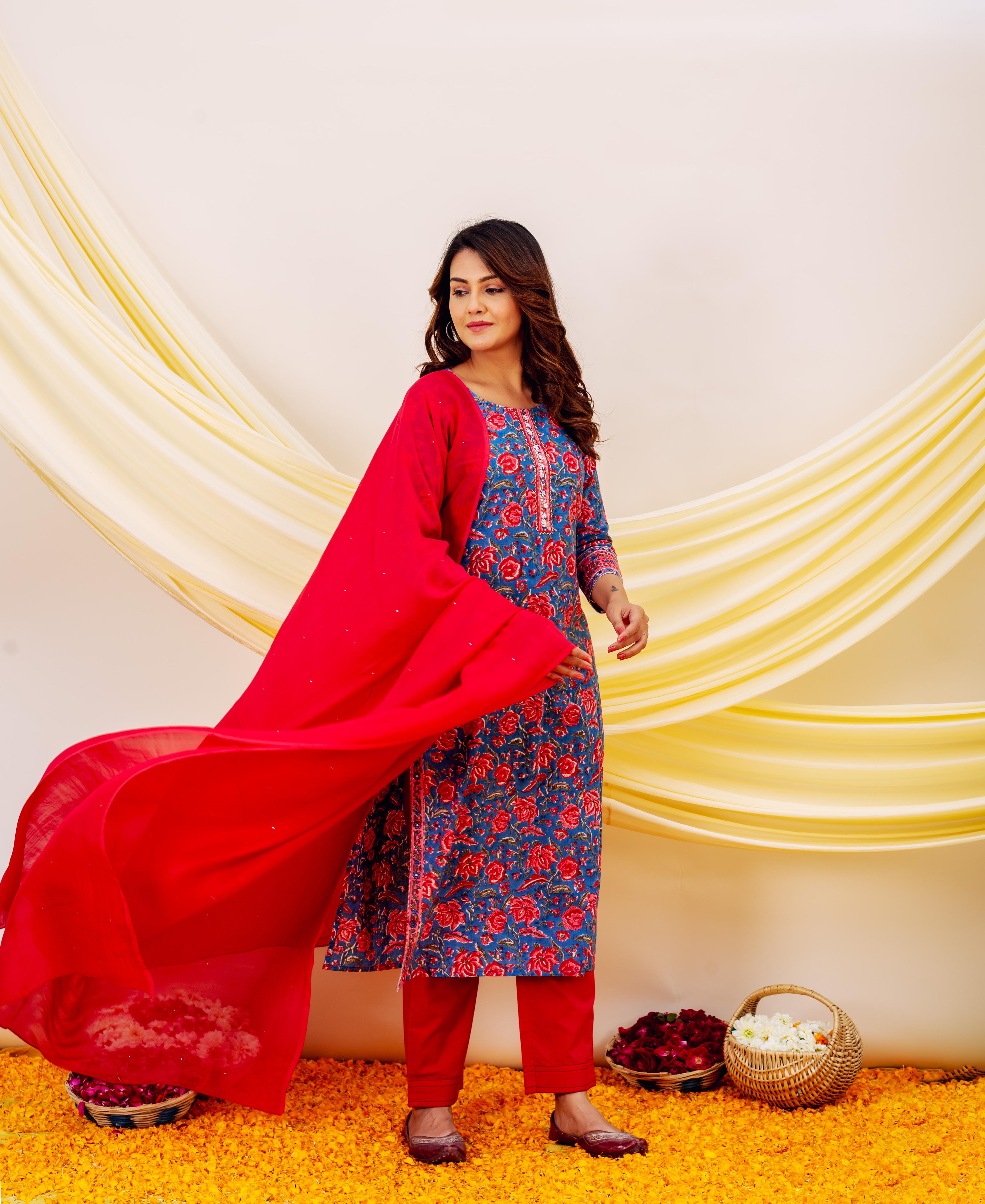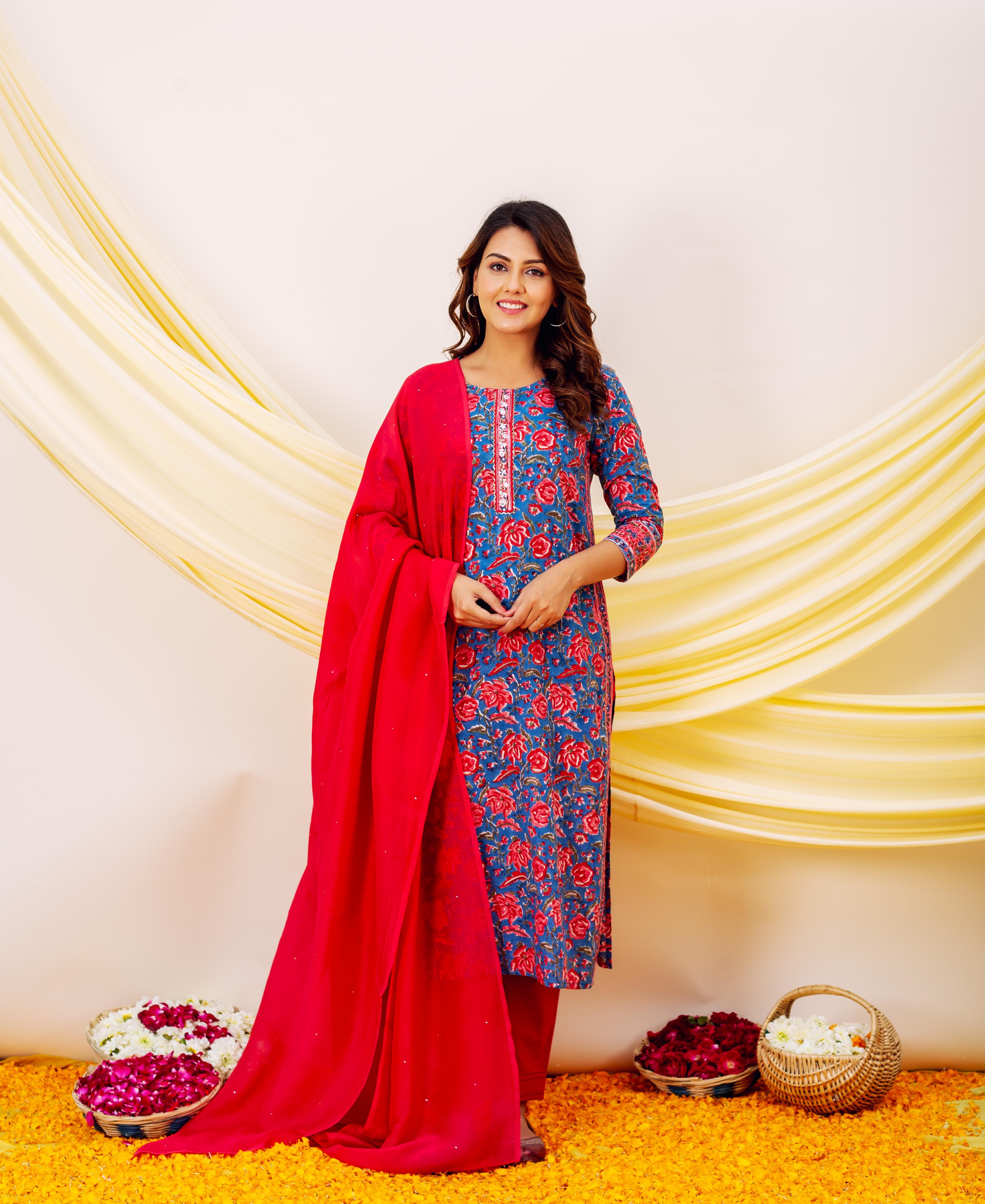 Blue and Red Floral Kota Doriya Hand Block Printed Dupatta