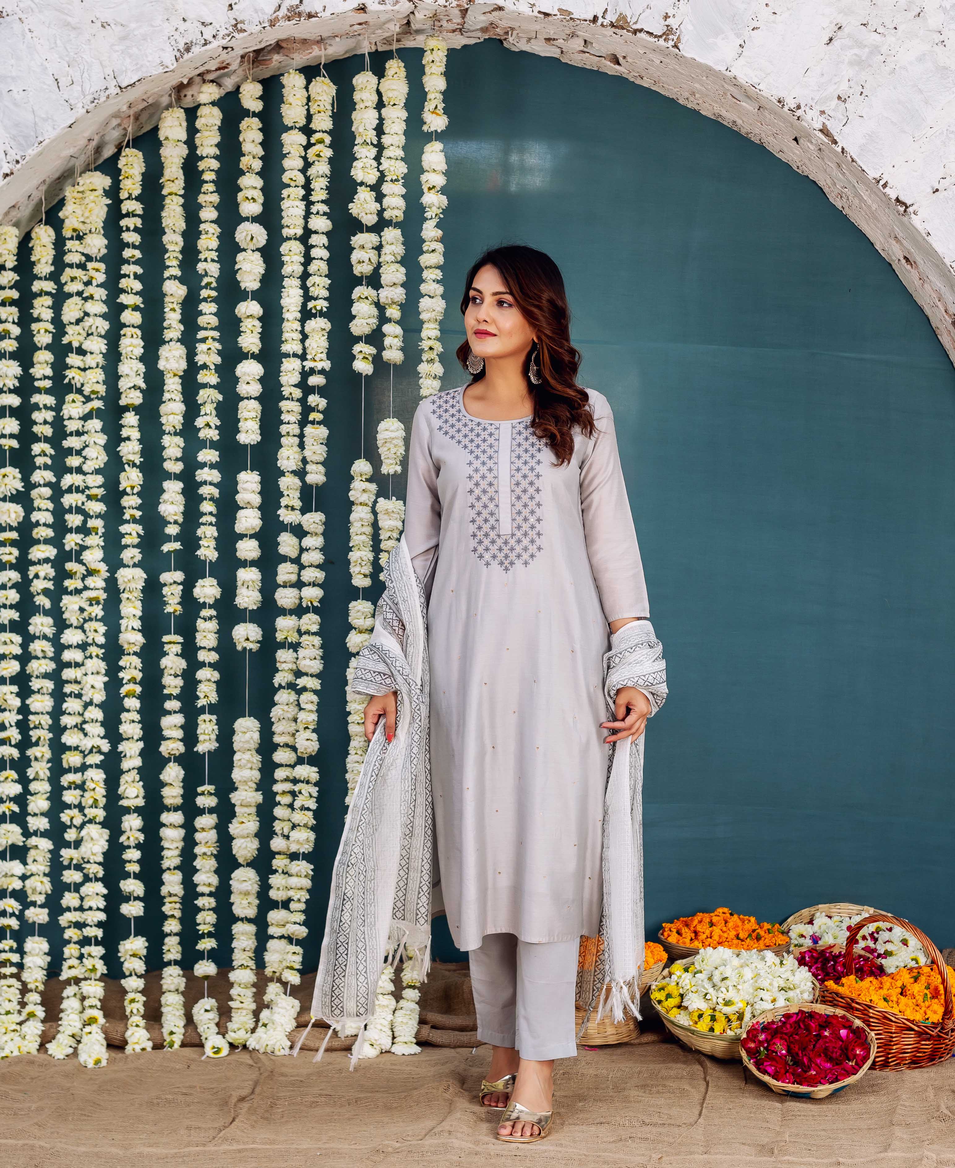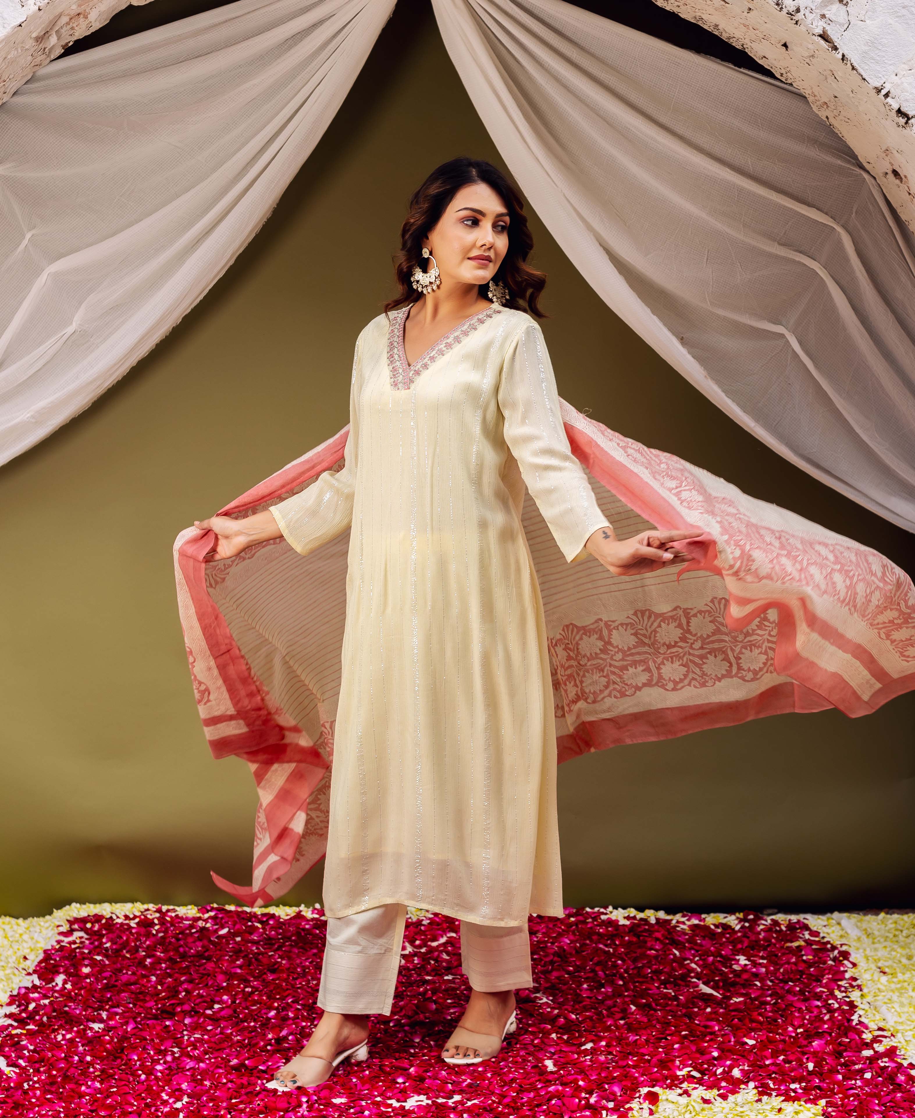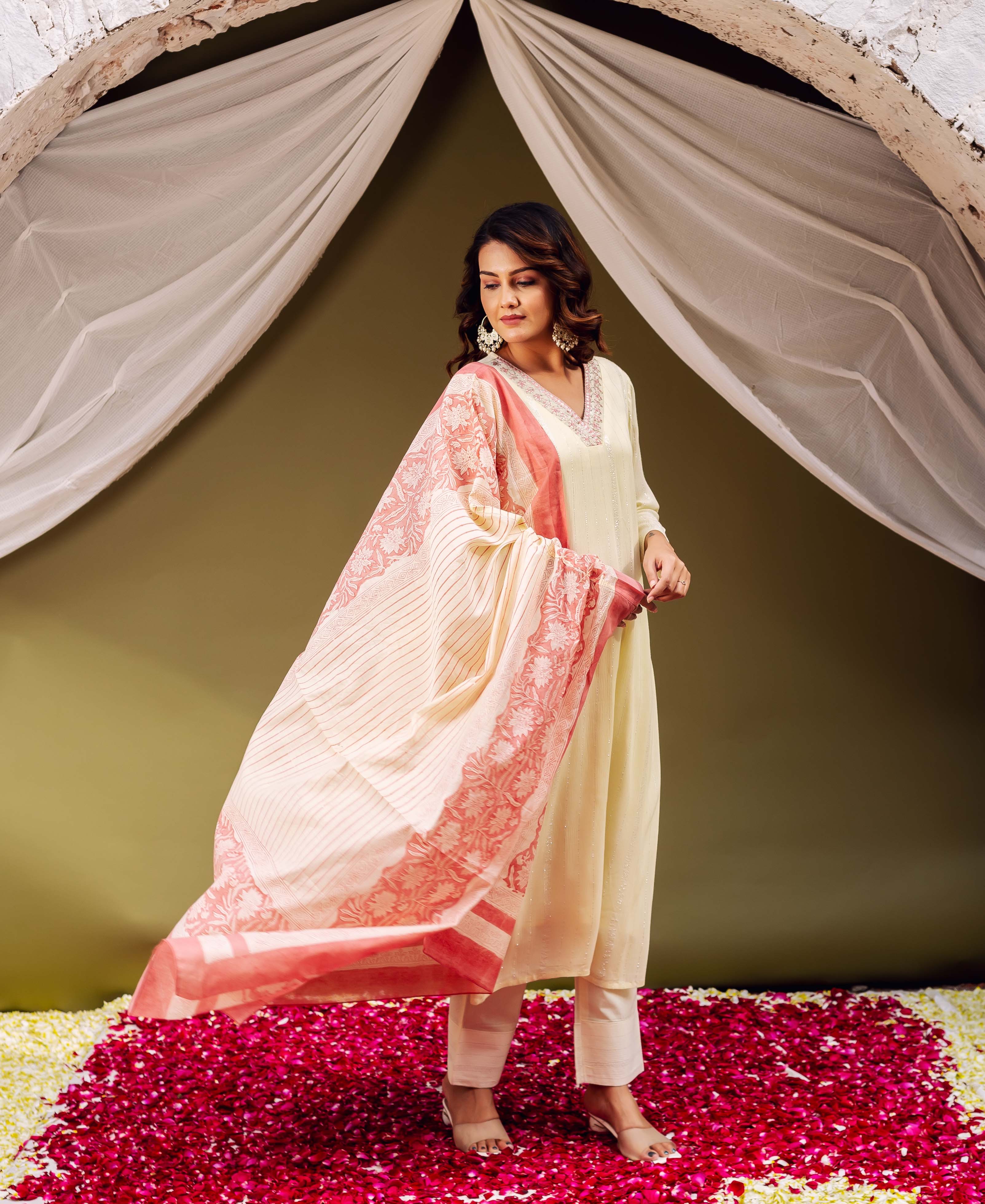 Beige Silk Chanderi Hand Block Printed Dupatta