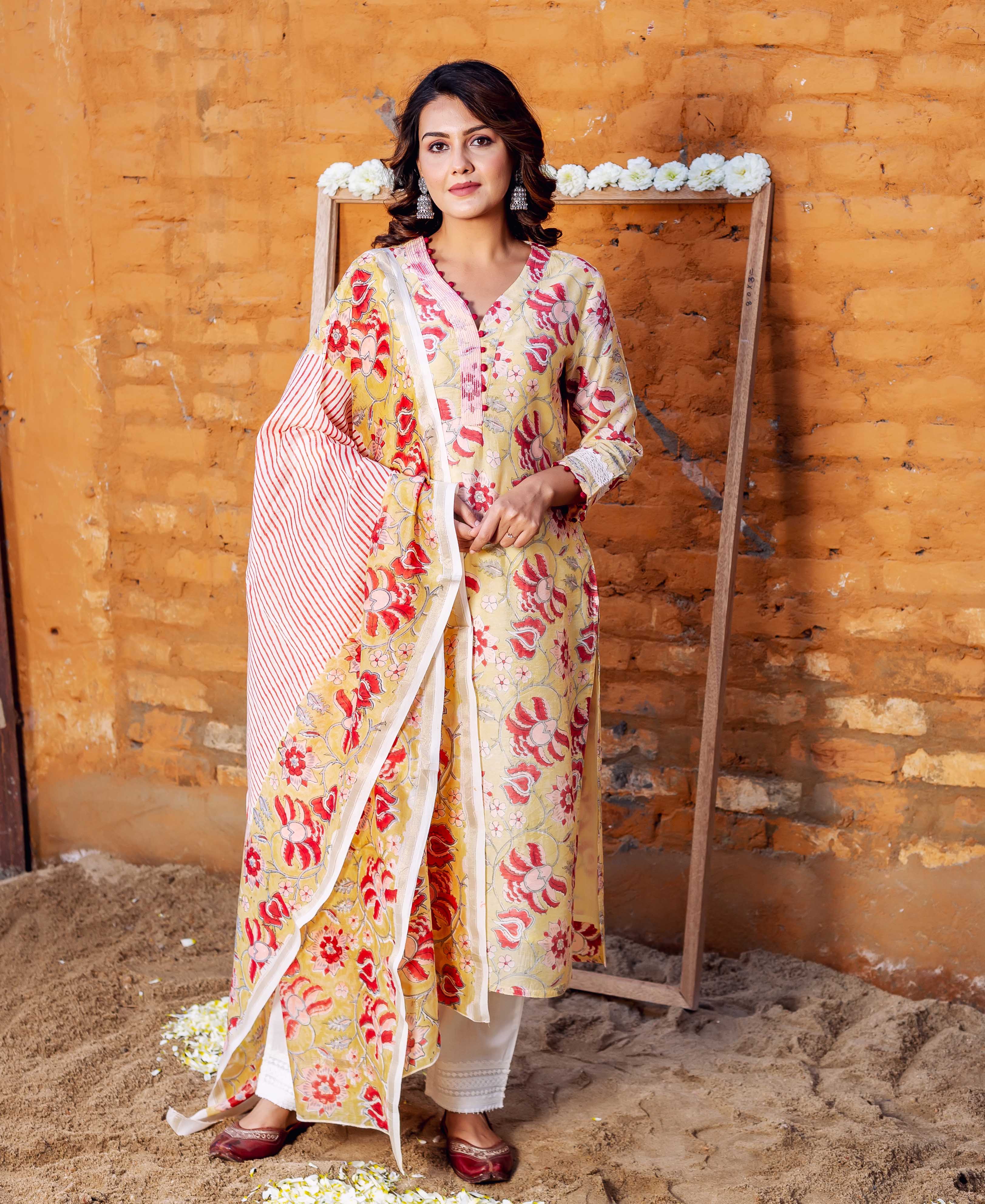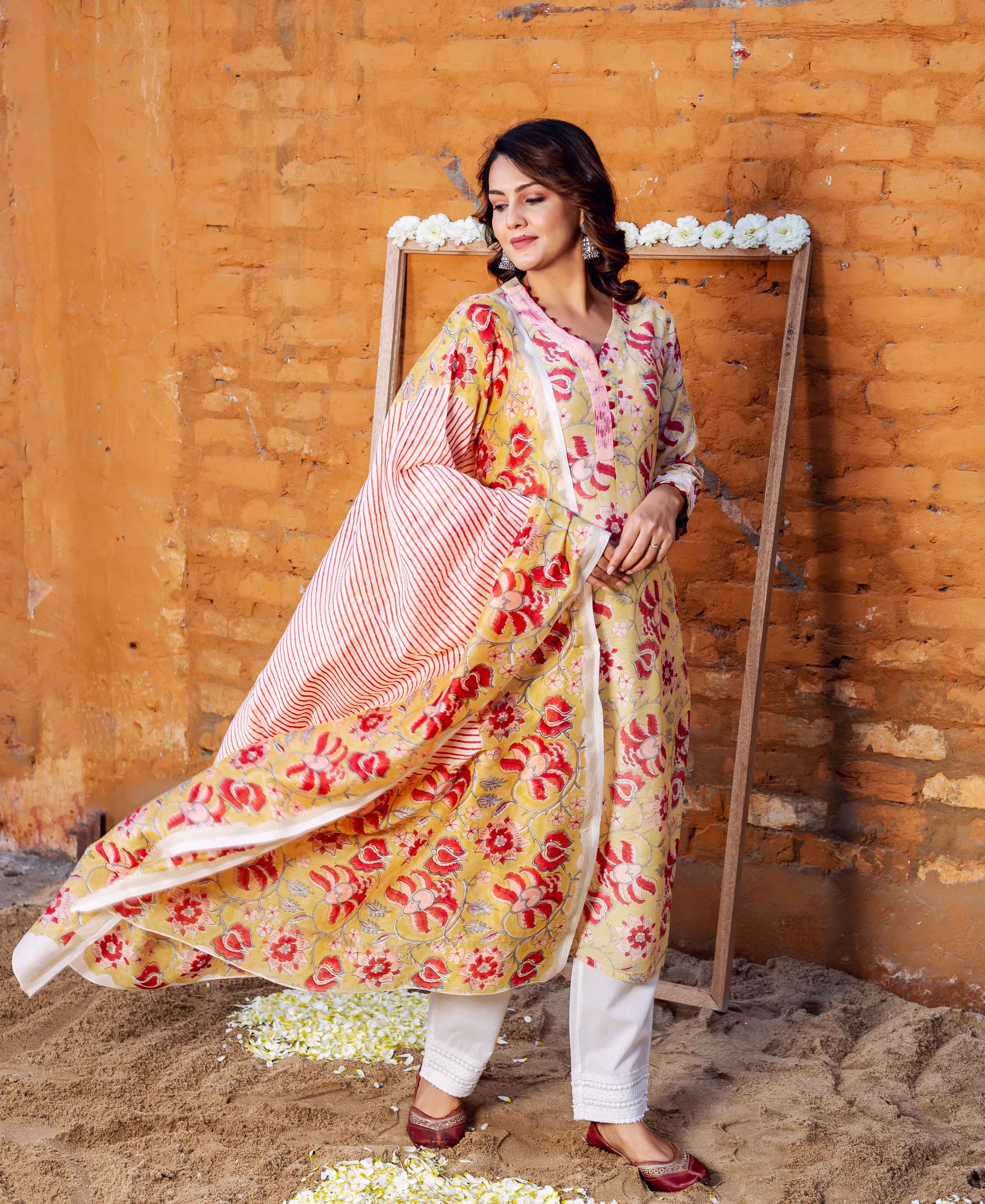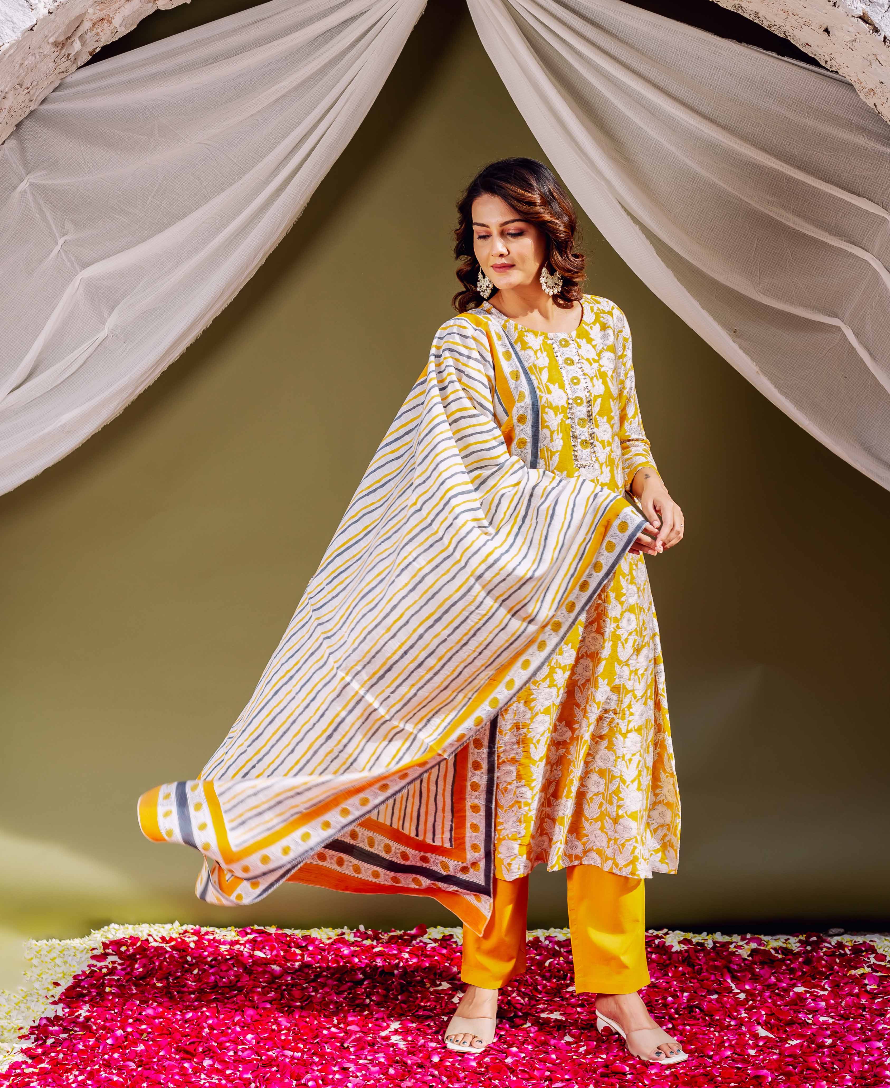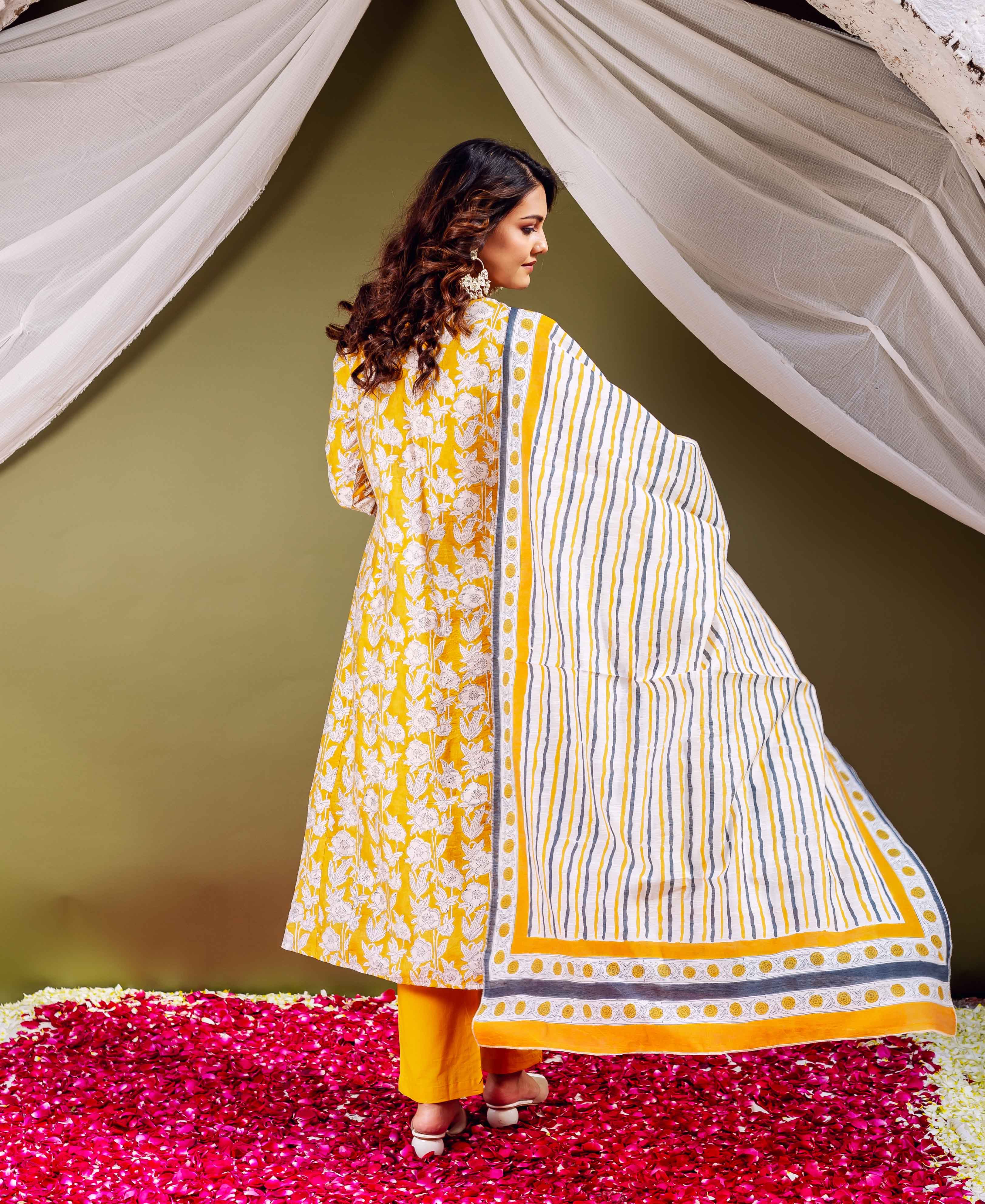Sunflower Yellow Chanderi Hand Block Printed Dupatta