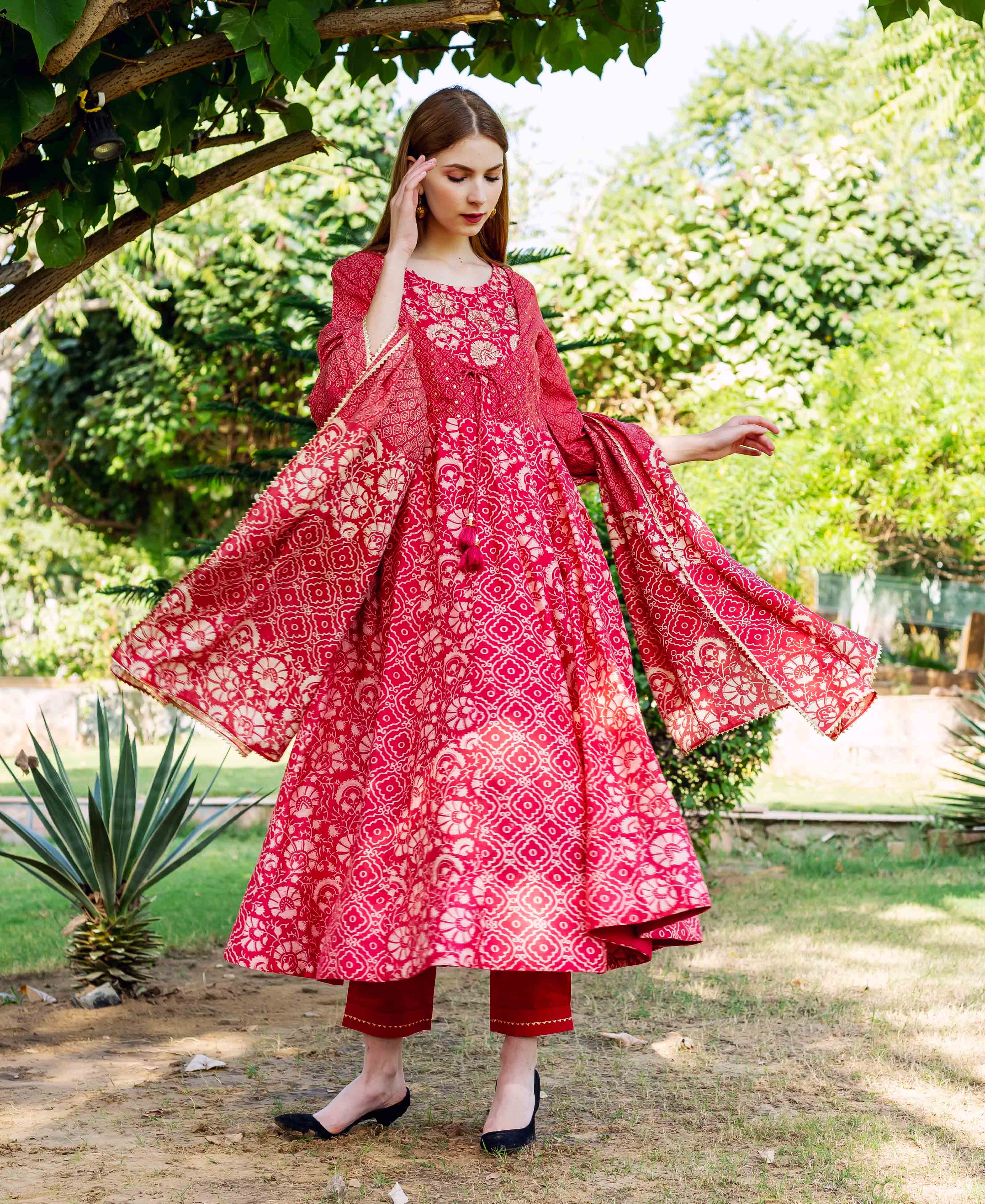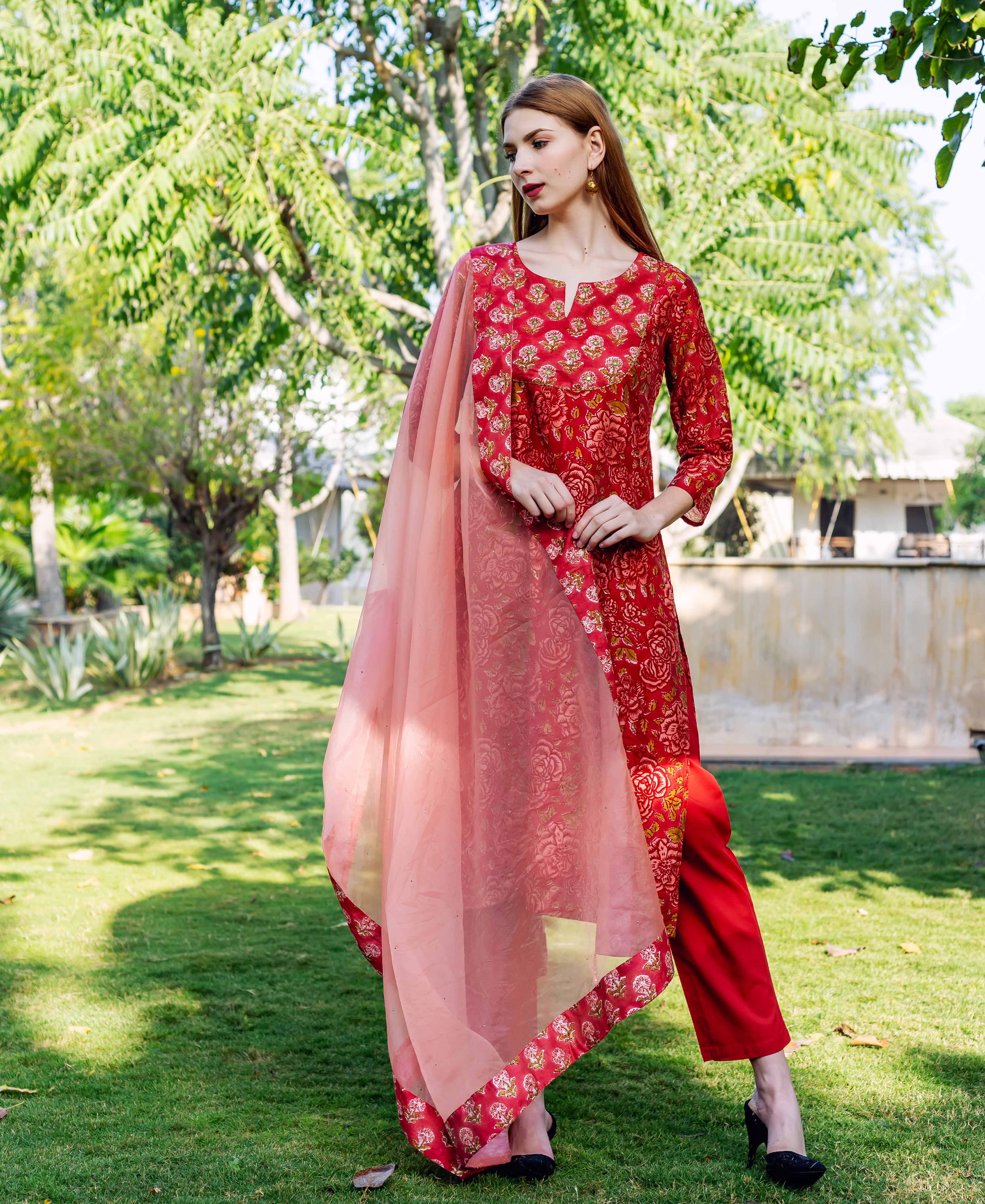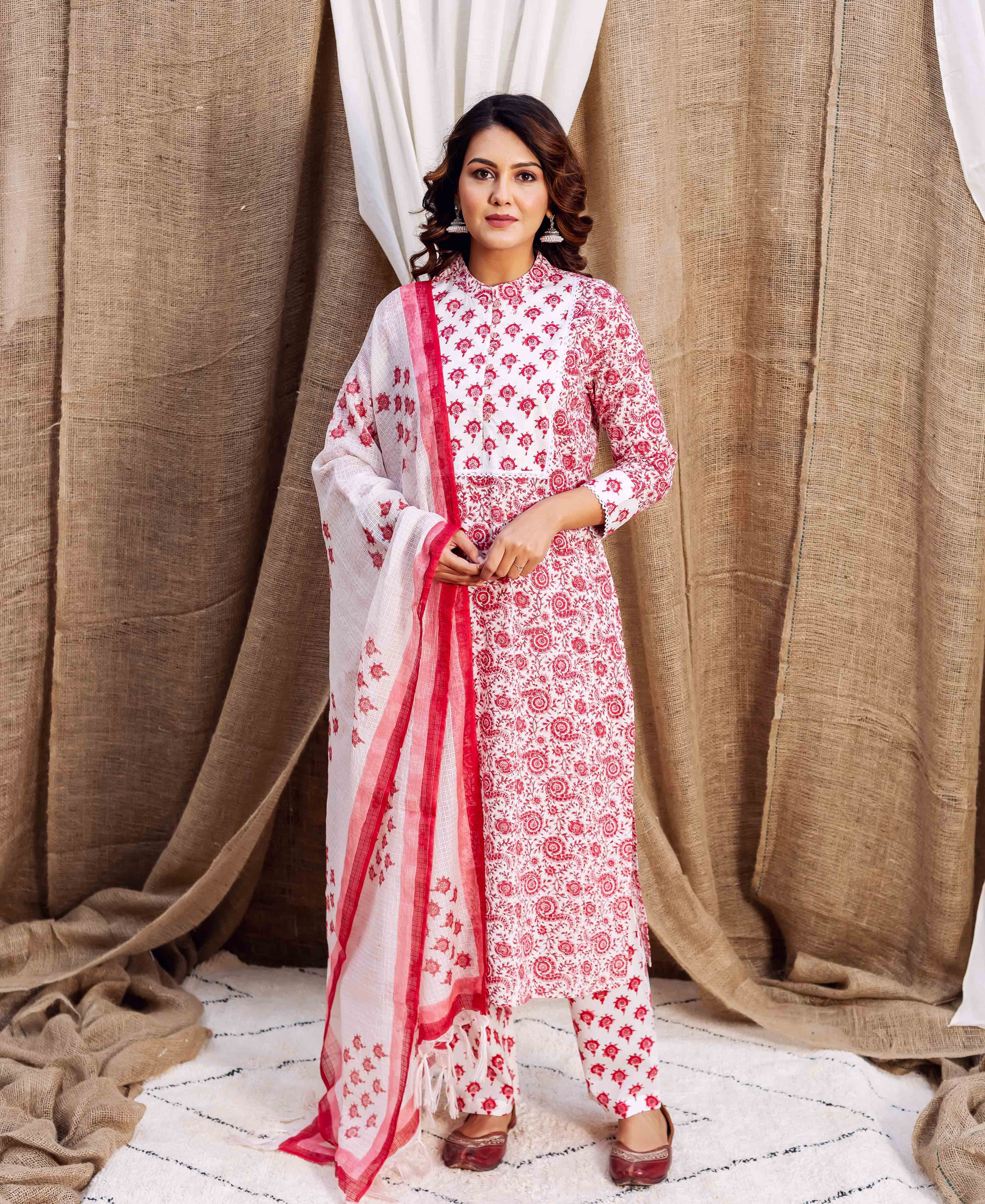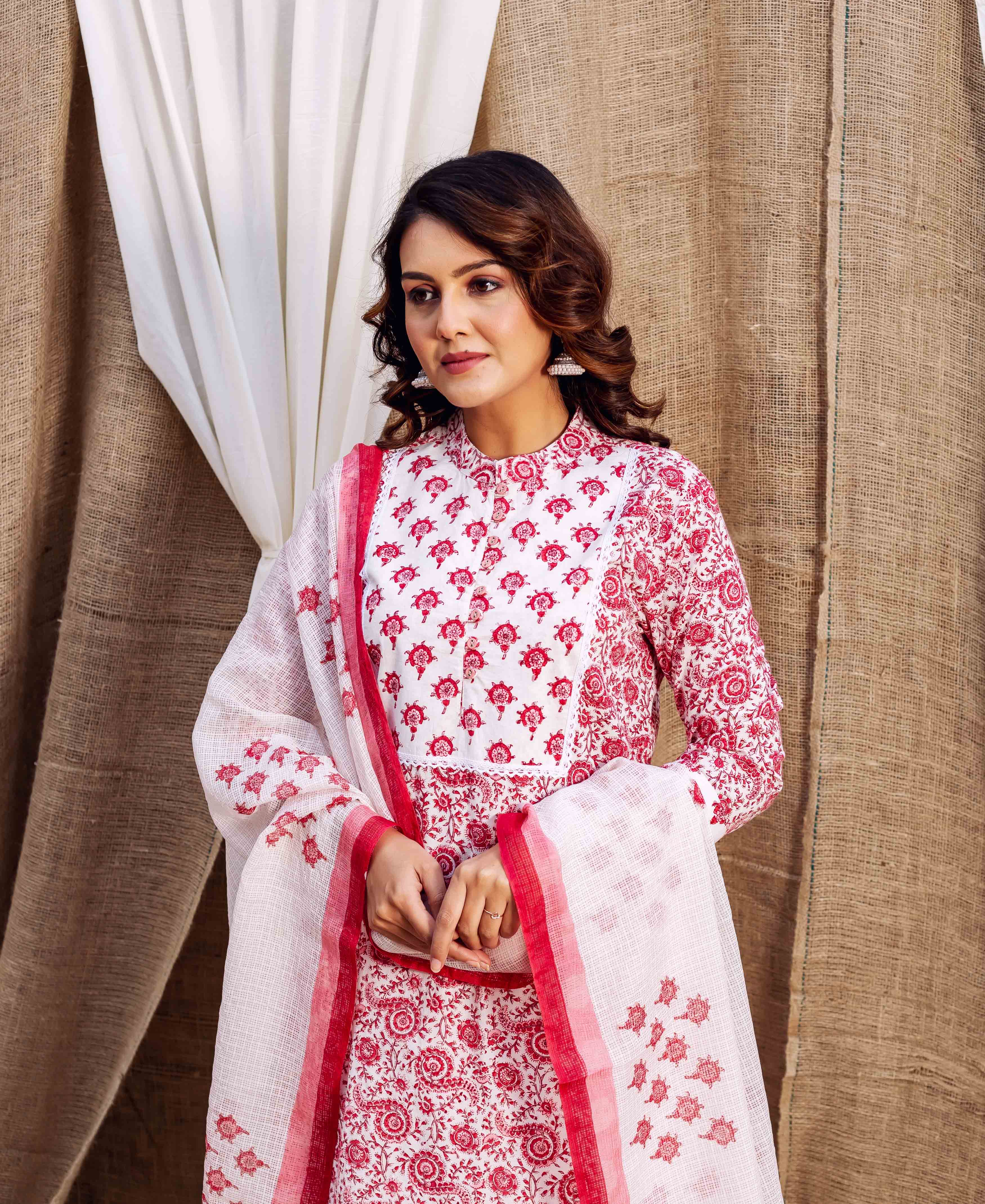 Red and White Kota Doriya Hand Bloc Printed Dupatta