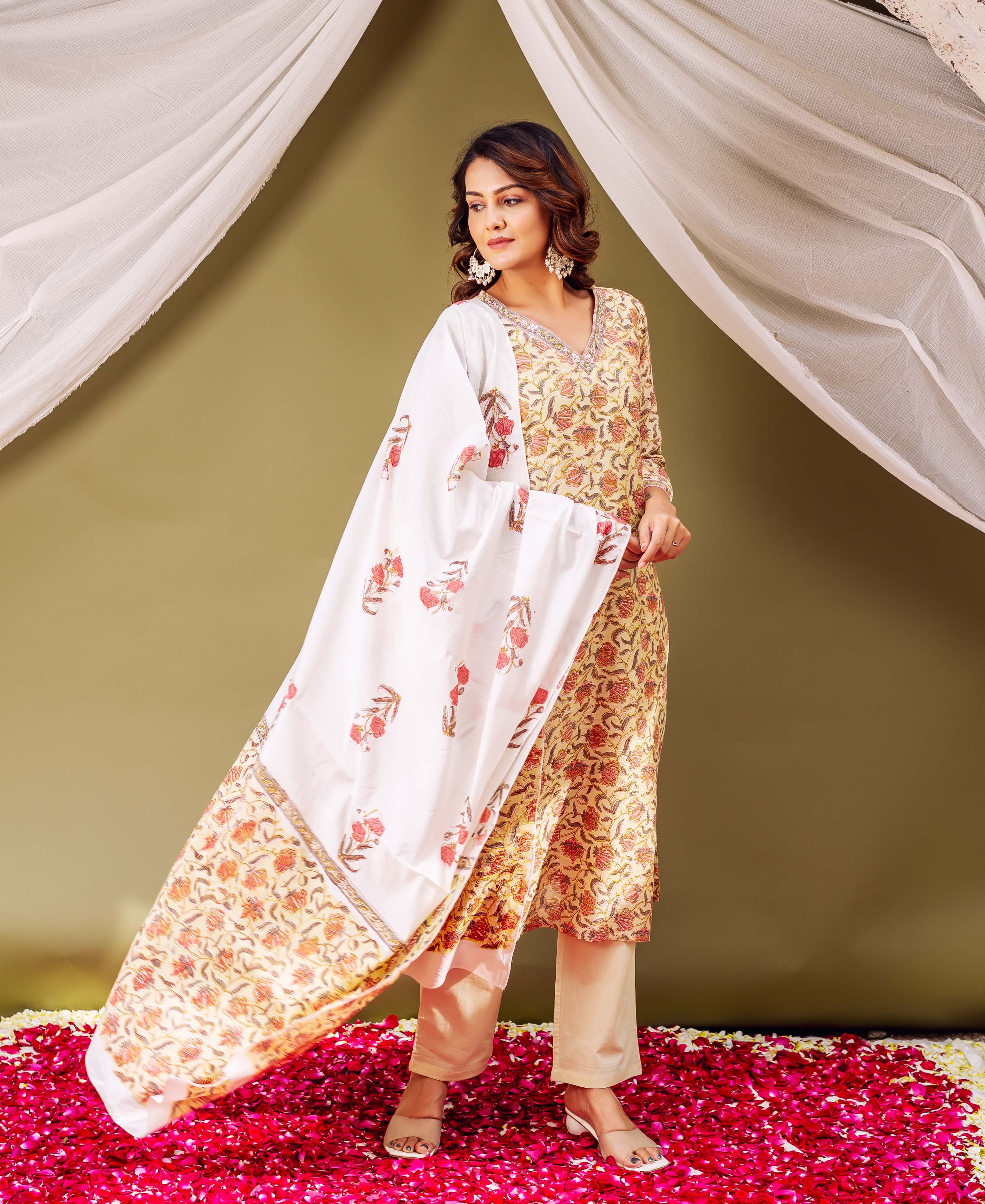 Beige and Peach Hand Block Printed Cotton Dupatta