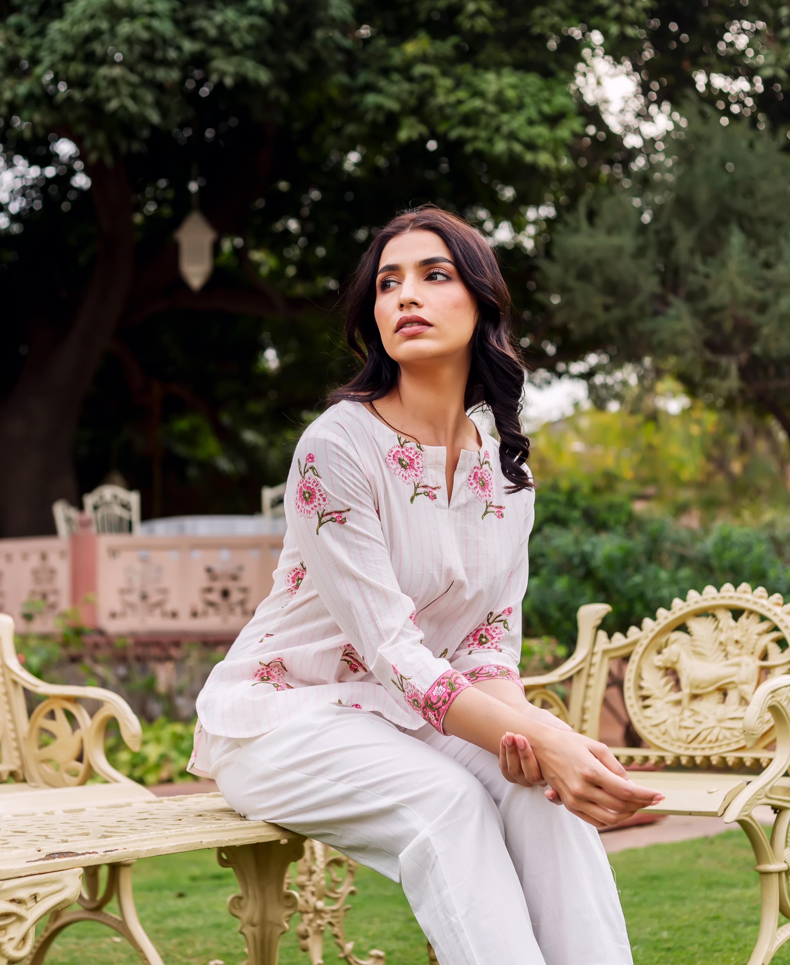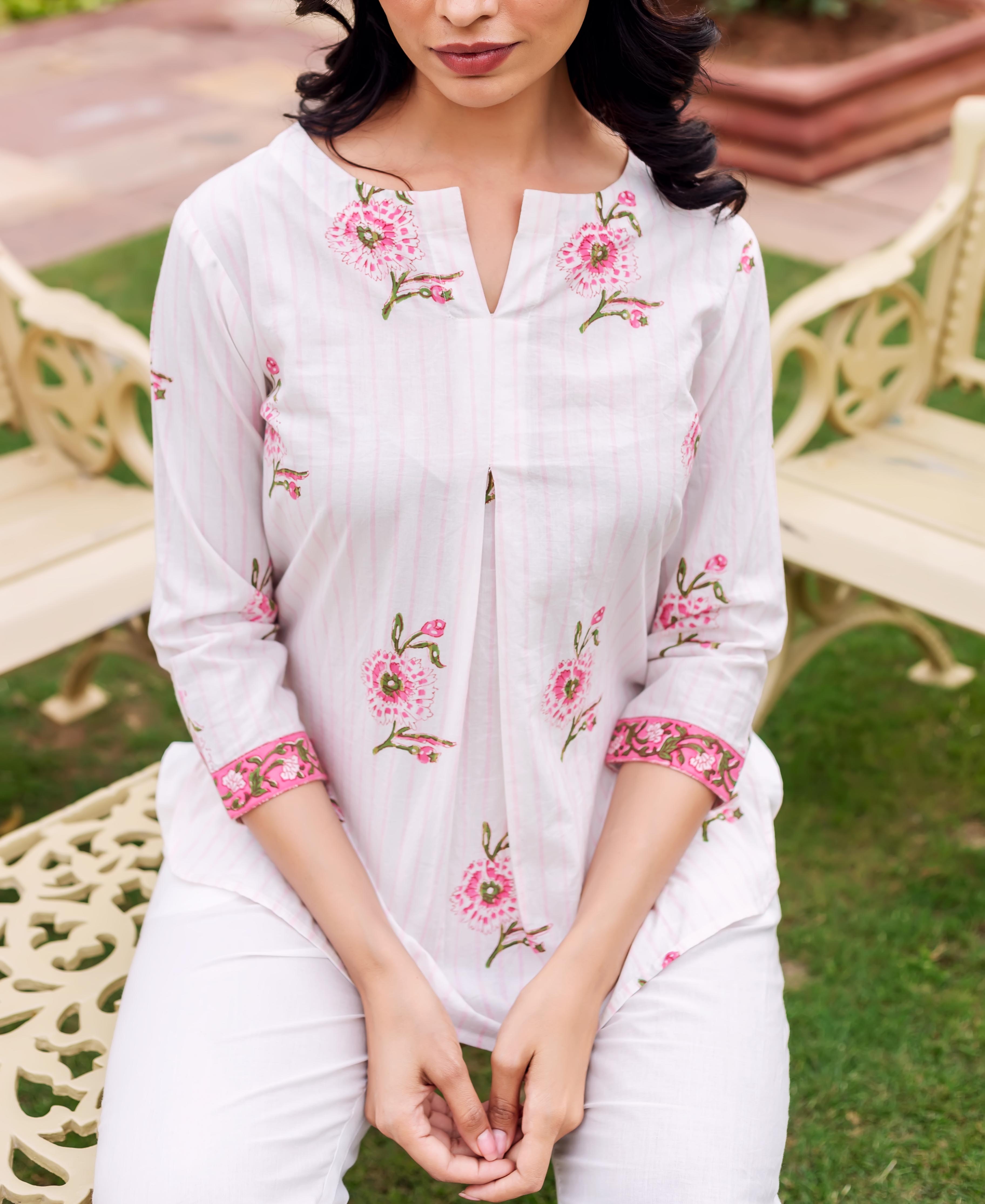 - Color: Off-white with pink stripes and a delicate block-printed floral motif, adding a vibrant yet elegant touch to the tunic.