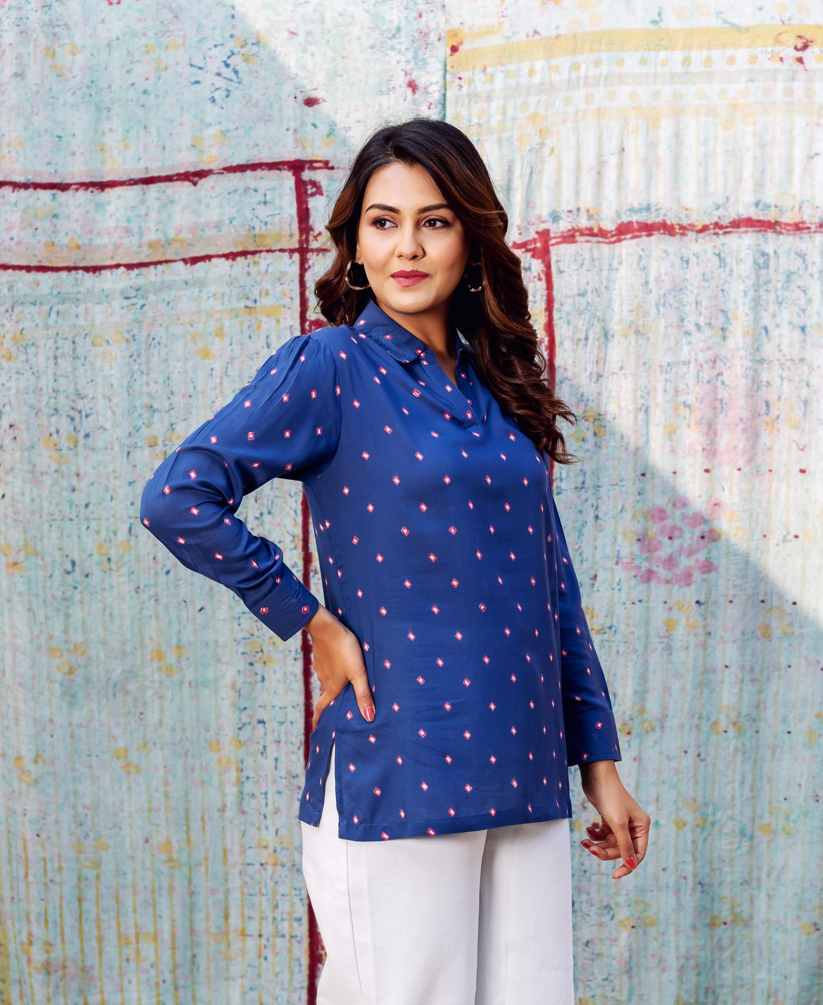 Product Description: Introducing our Azure Bandhej Hand Block Printed Modal Top, a fusion of elegance and tradition. Crafted from fine Modal fabric, this top features a captivating bandhej print in shades of blue, hand block printed for authenticity. Adorned with a stylish collar exudes sophistication. With flattering 3/4 sleeves, this top offers both style and comfort. Elevate your ensemble with this versatile piece that seamlessly blends tradition with contemporary flair.