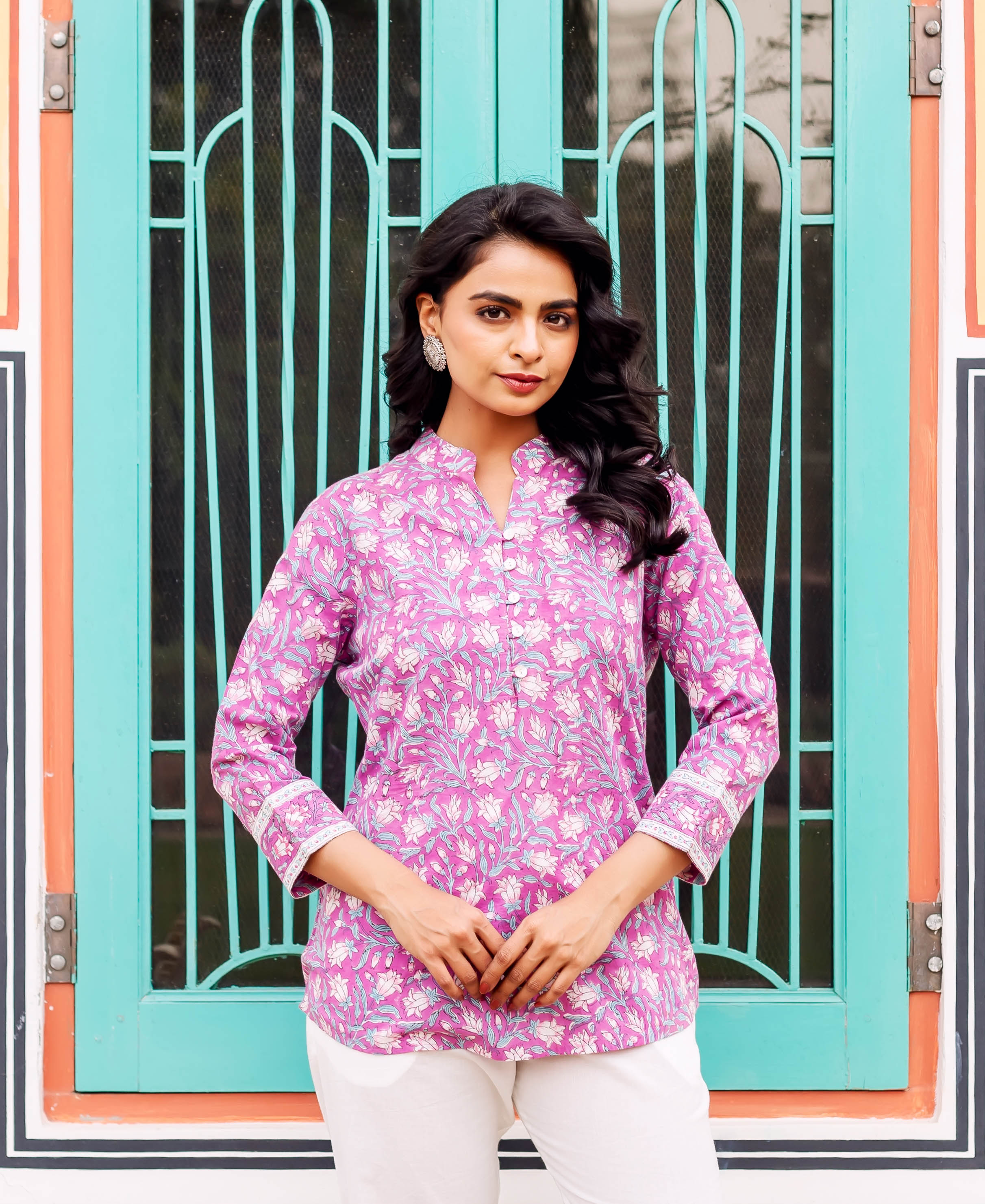 • Color: Purple with a floral pattern of small white and light blue flowers, adding a charming, artisanal touch to the tunic.