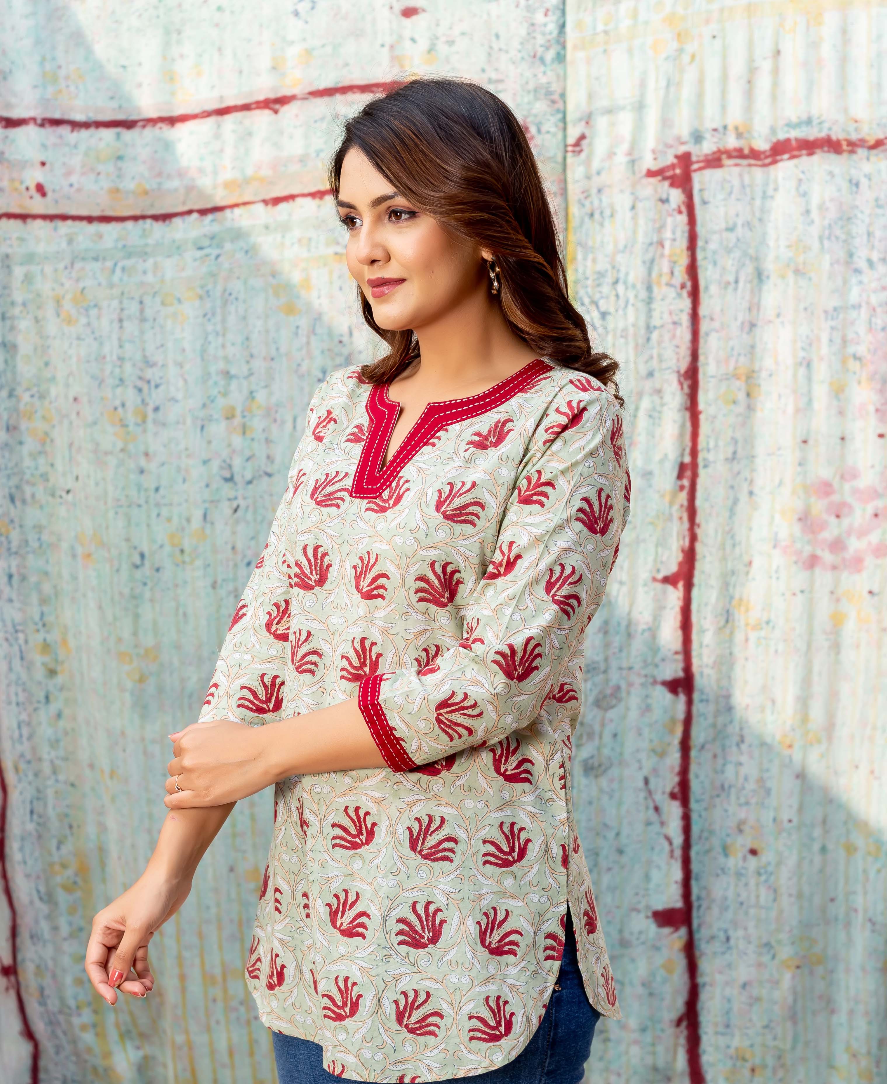 Product Description: Emanate elegance with our Oceanic Breeze Hand Block Printed Cotton Top. This charming sea green top features a stylish collar, button-down V-neckline, and comfortable 3/4 sleeves. Adorned with intricate hand block printed booti print, crafted from soft cotton, this top exudes sophistication and style. Elevate your wardrobe with this versatile piece that seamlessly transitions from day to night.