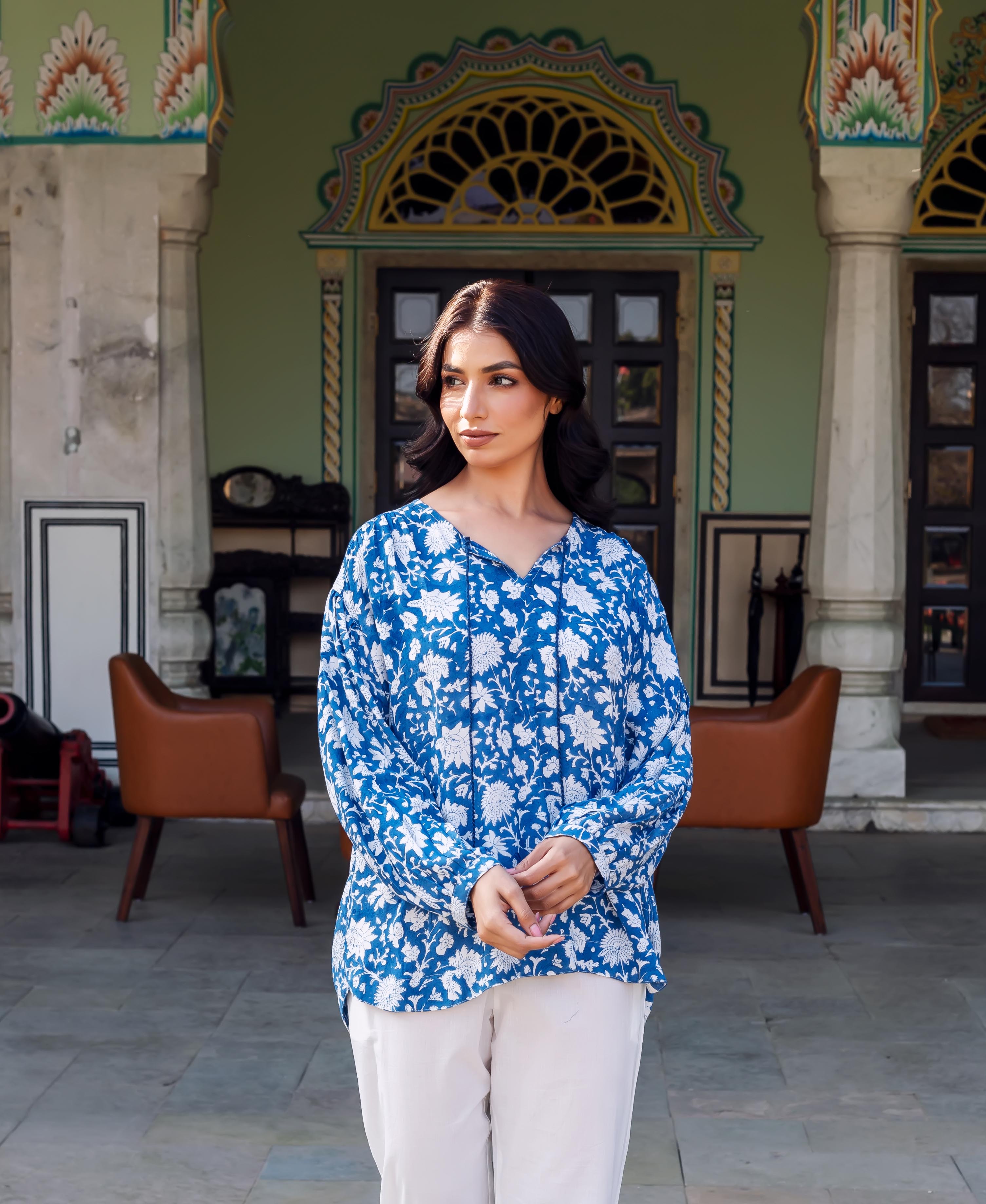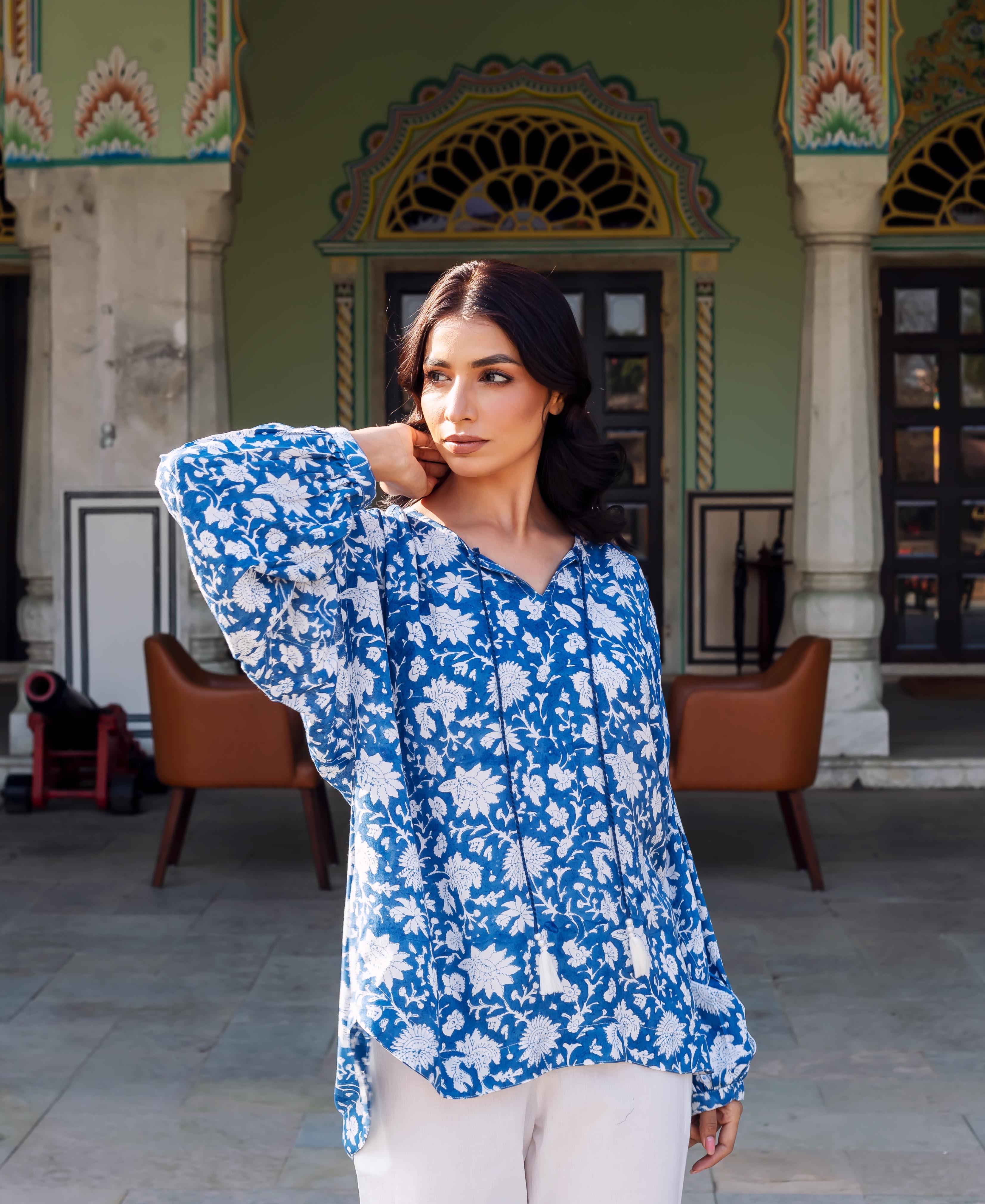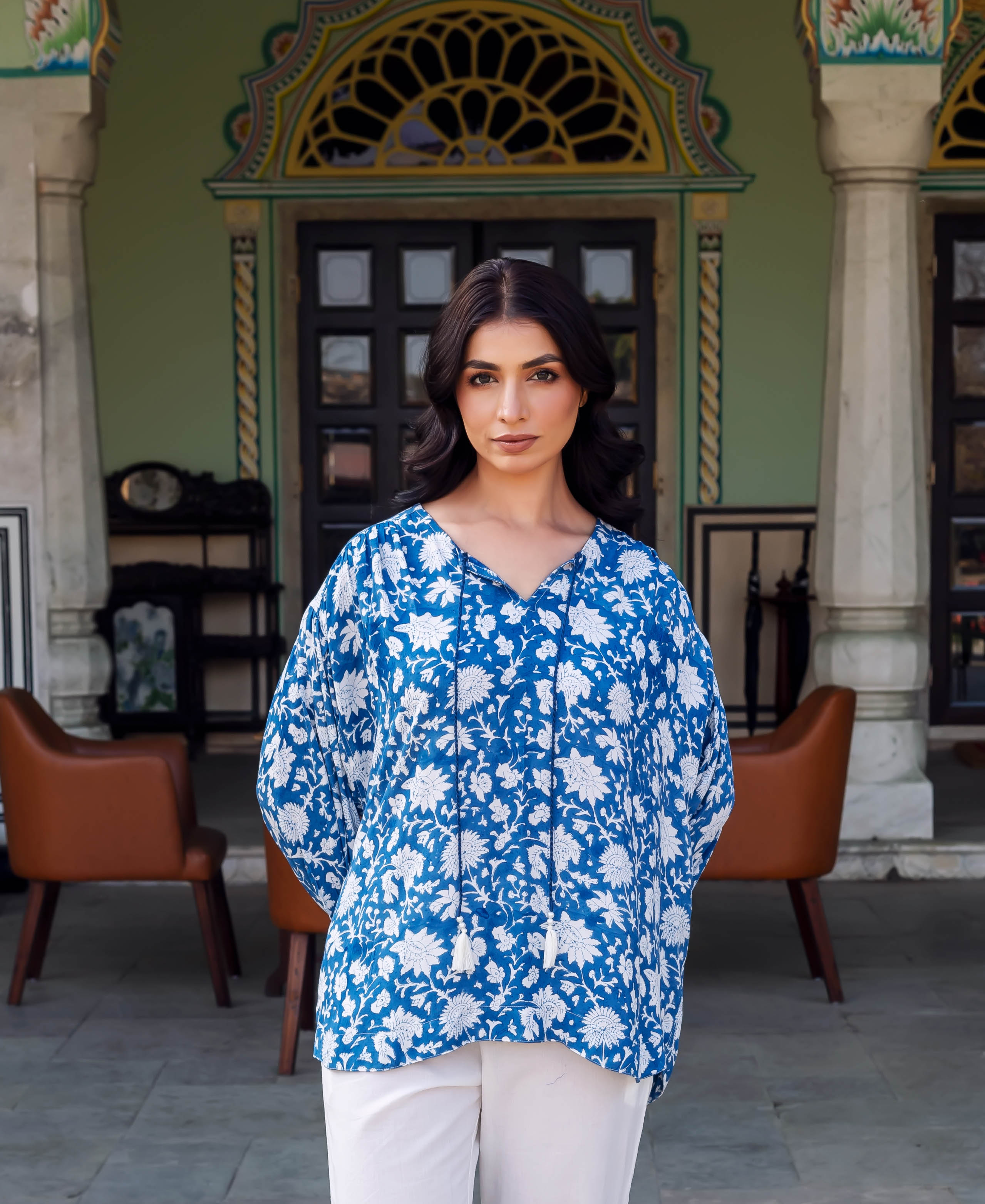 - Color: Blue with intricate hand-block printed floral patterns, offering a vibrant and elegant look to the tunic.