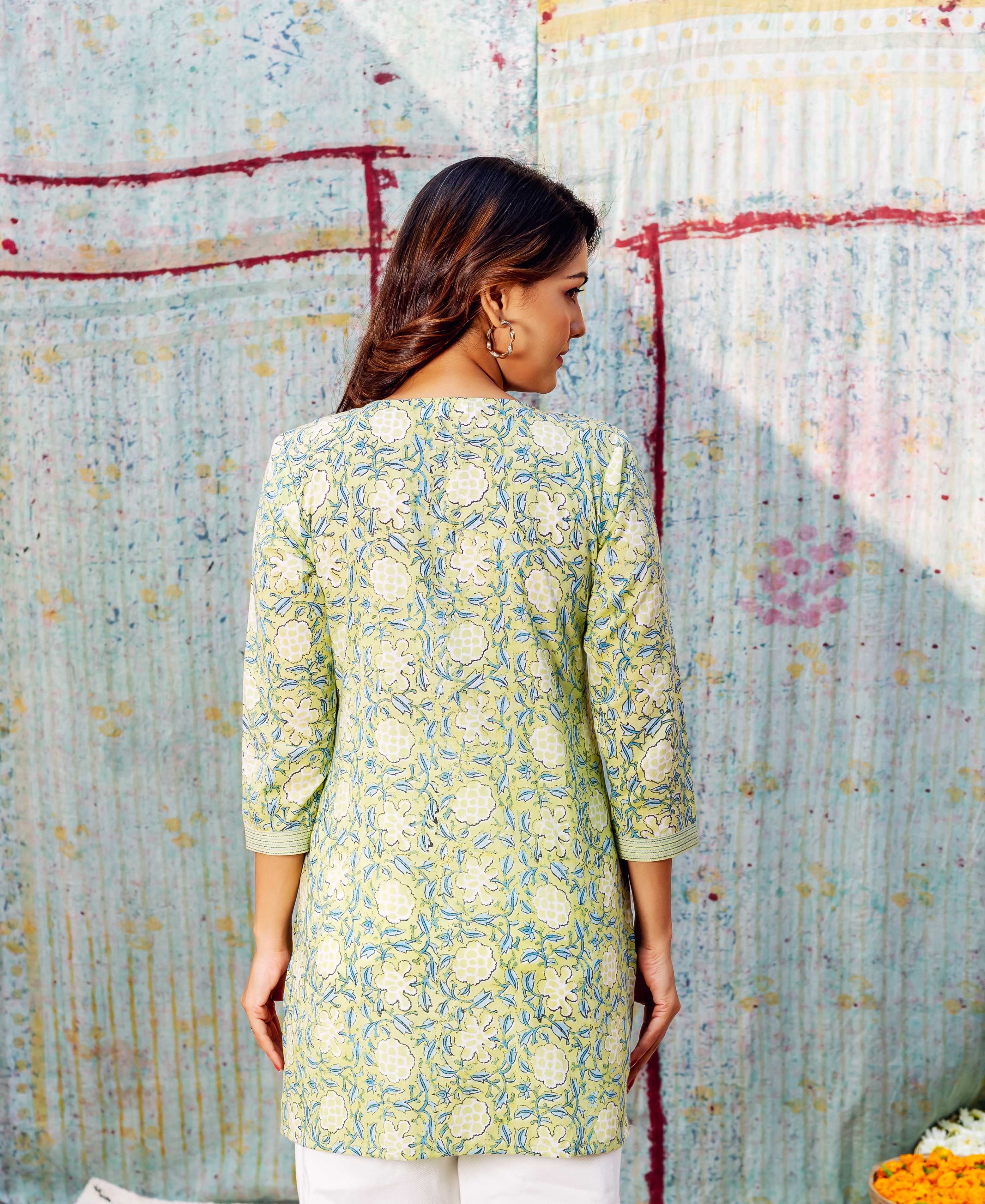 • Product Description: Step into the allure of nature with our Verdant Floral Hand Block Printed Cotton Top. This charming green top boasts a delightful floral print, hand block printed onto soft cotton fabric. Featuring elegant 3/4 sleeves adorned with intricate thread work and flattering pleats at the front, this top exudes grace and sophistication. Elevate your ensemble with this versatile piece that seamlessly blends style and comfort.
