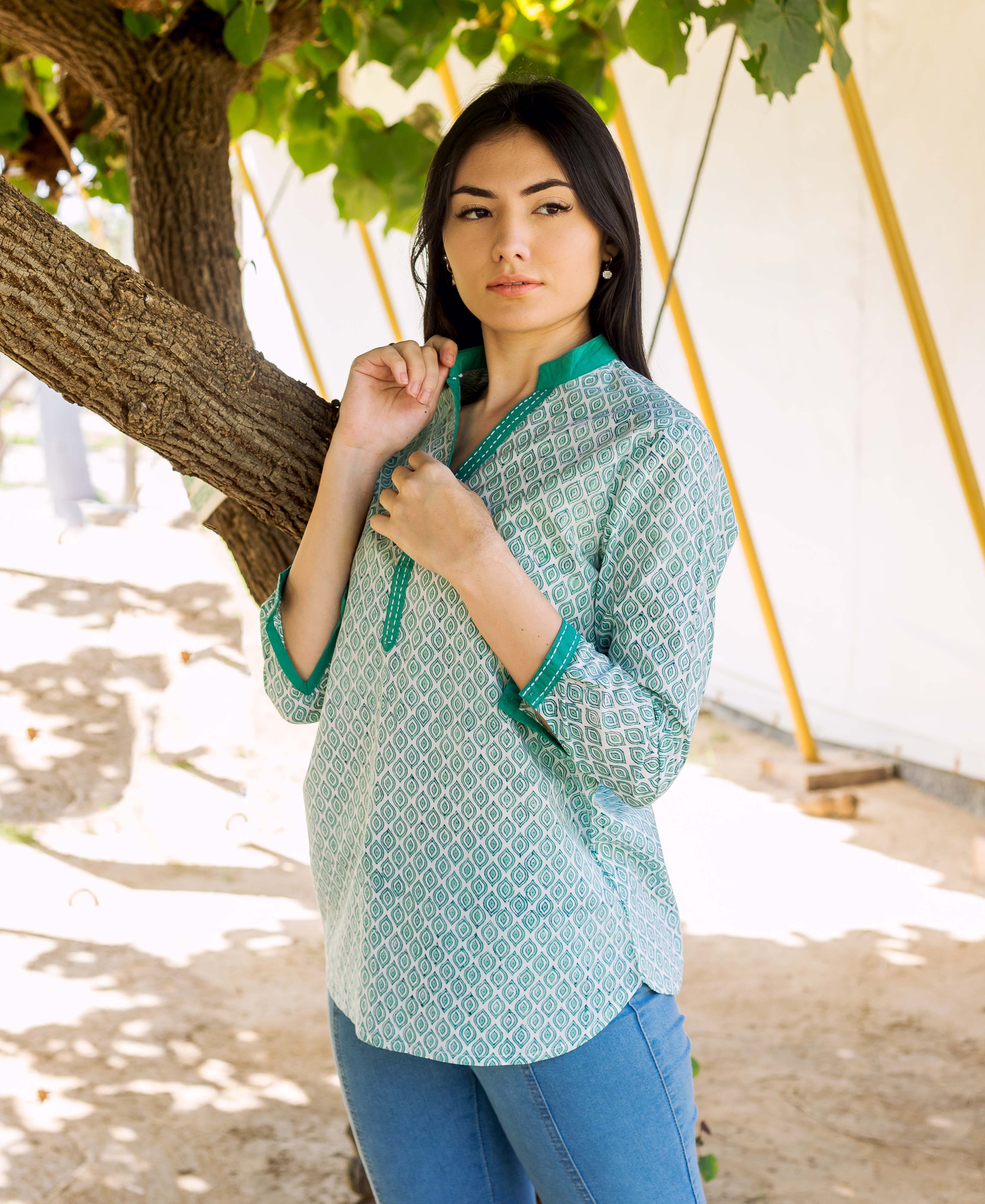 White and Green Hand Block Printed Top