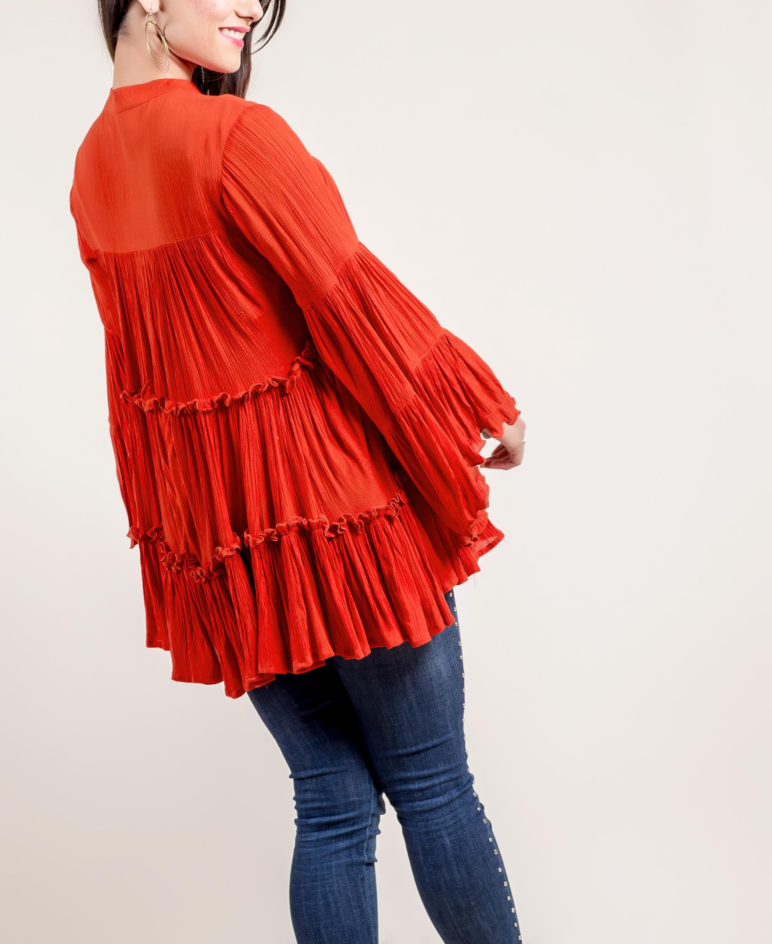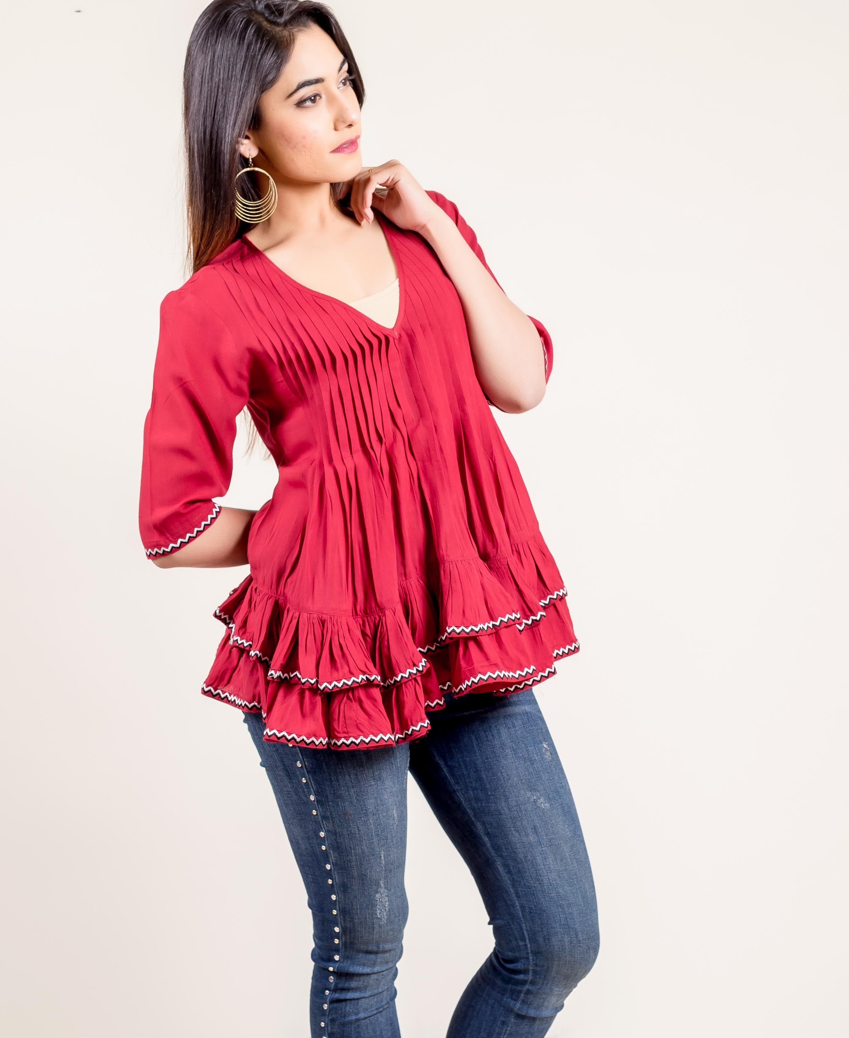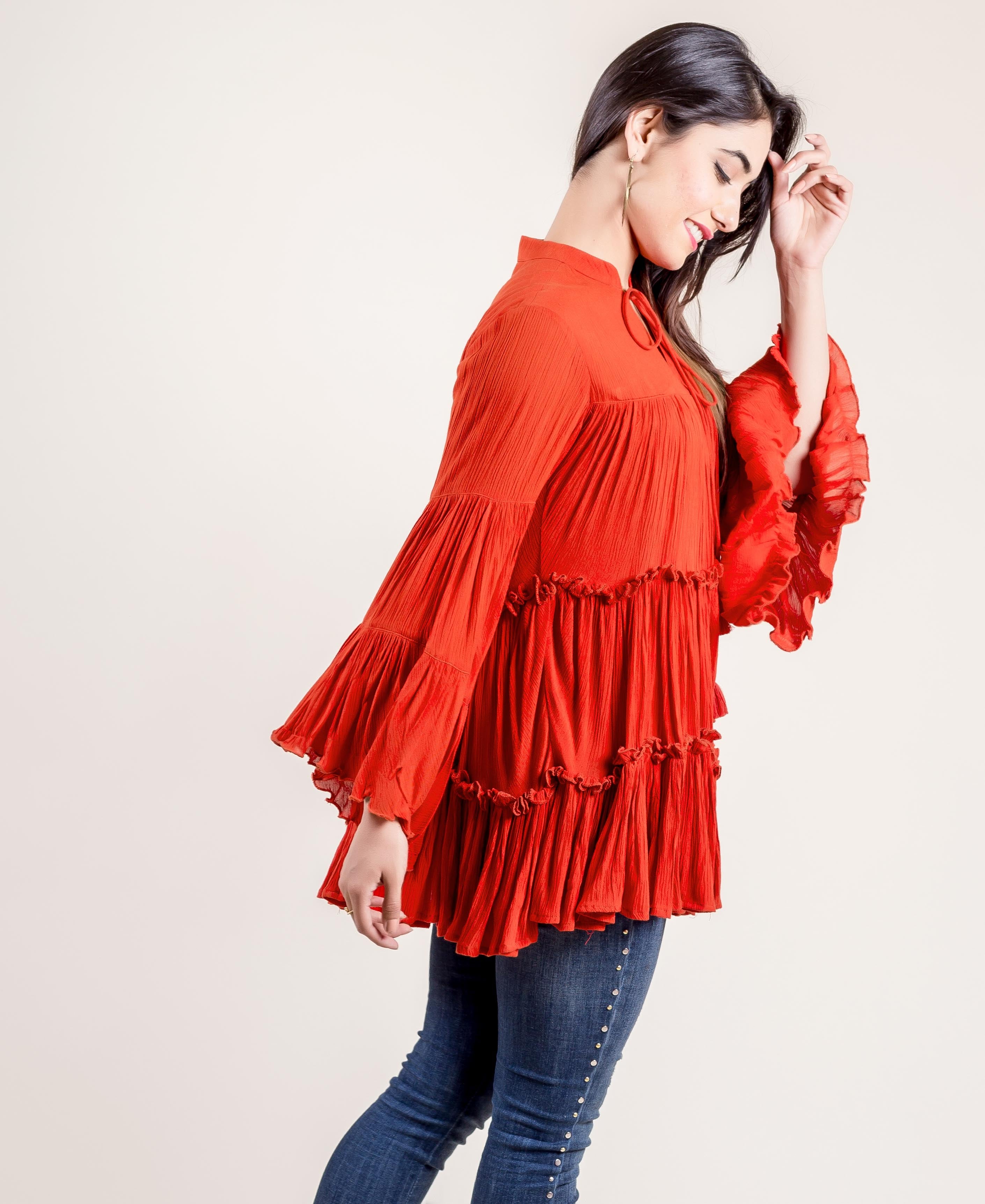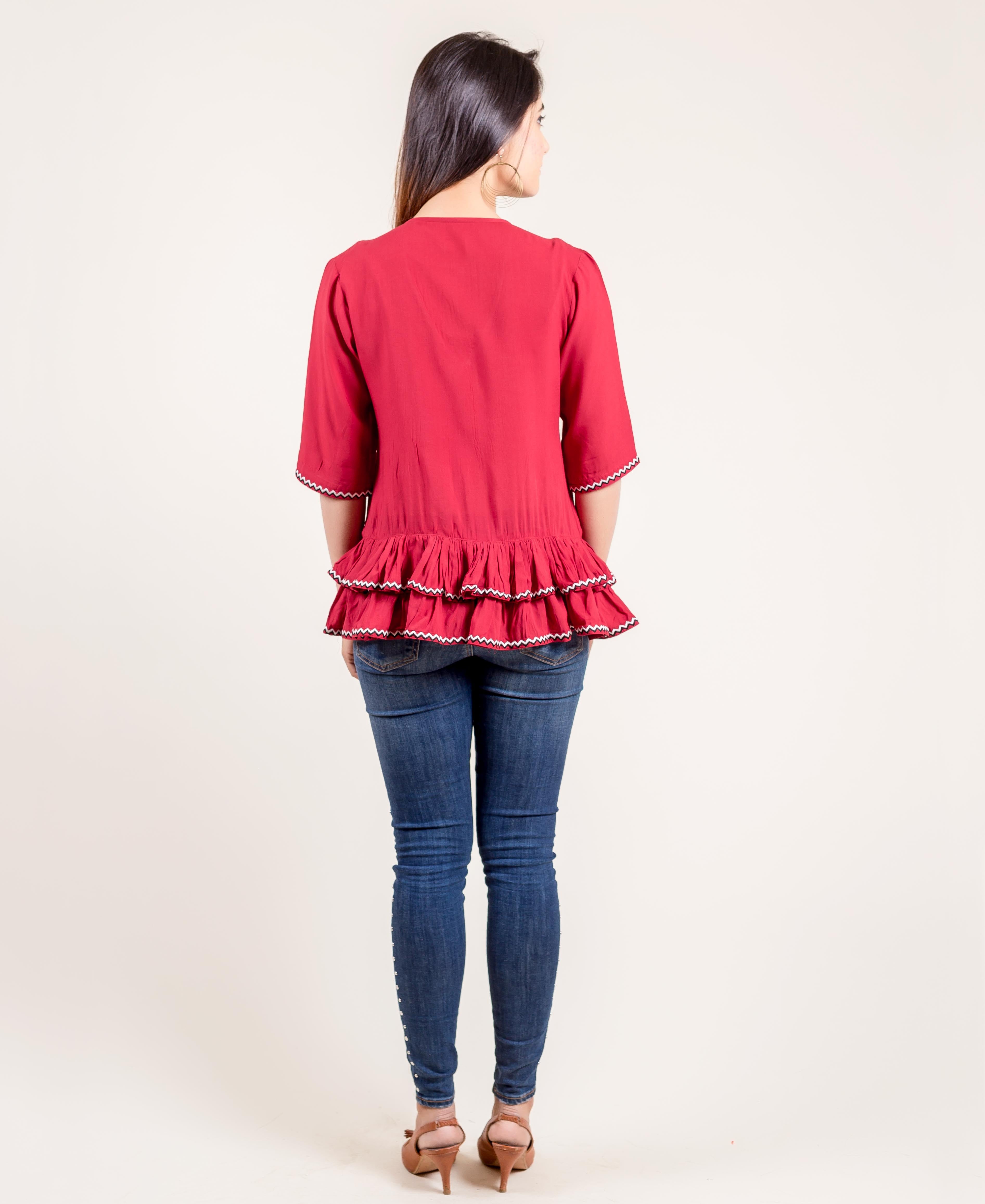 Embroidered Rayon Frilled Rust Top