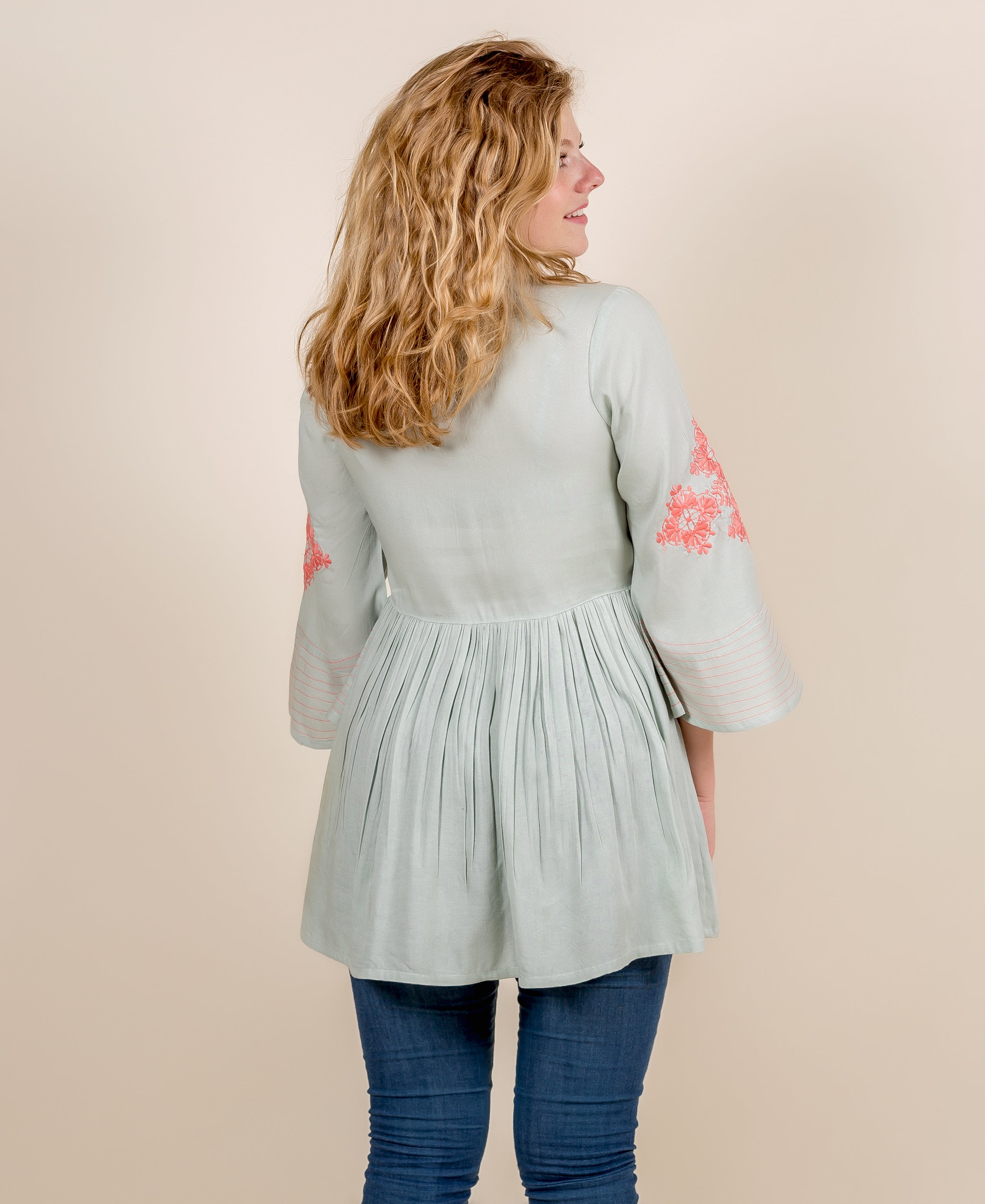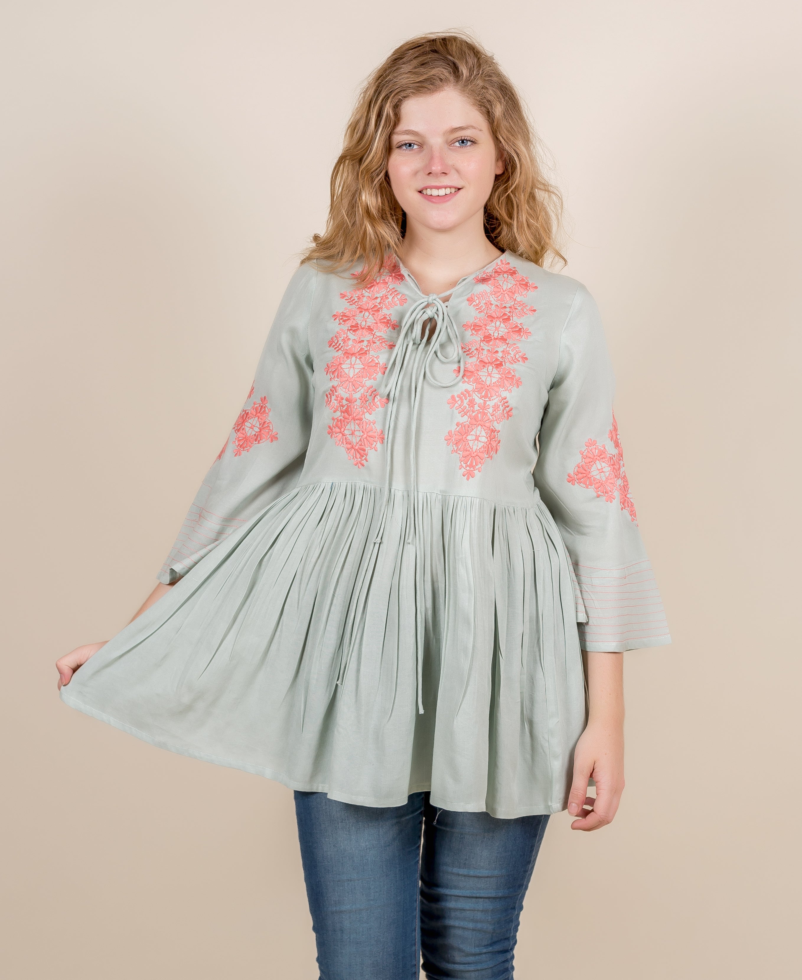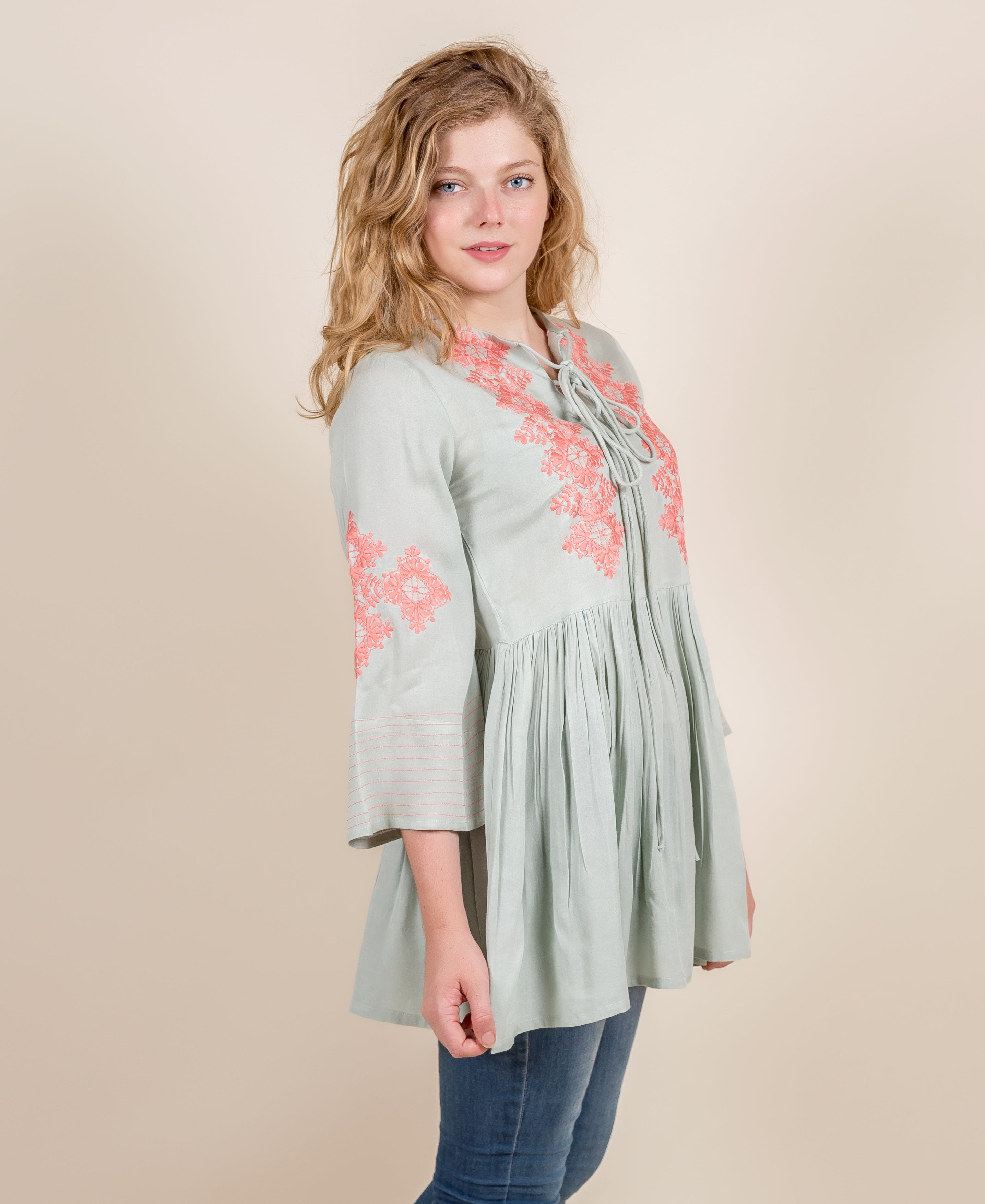Front Body Top In Mint Green With Peach Embroidery