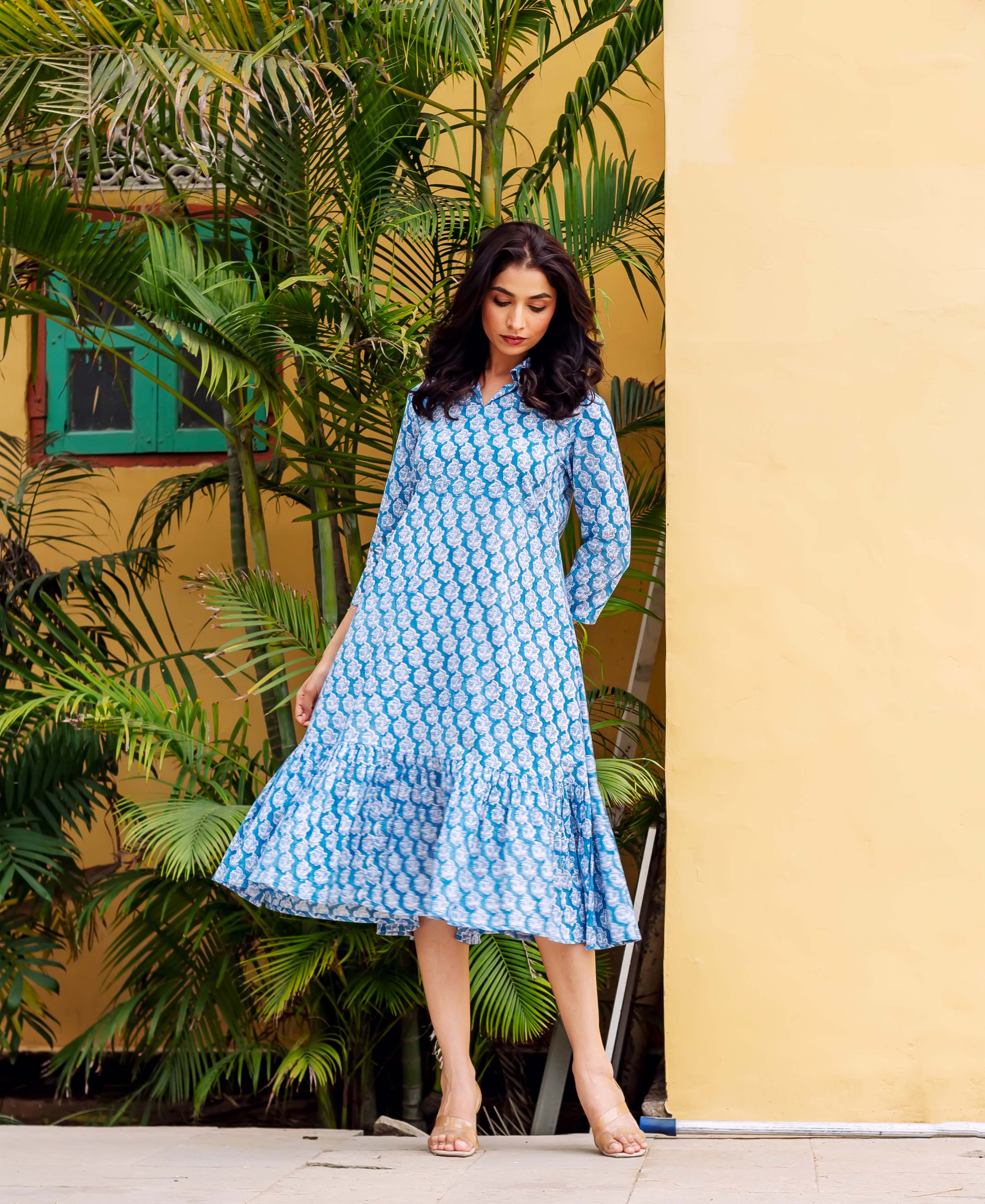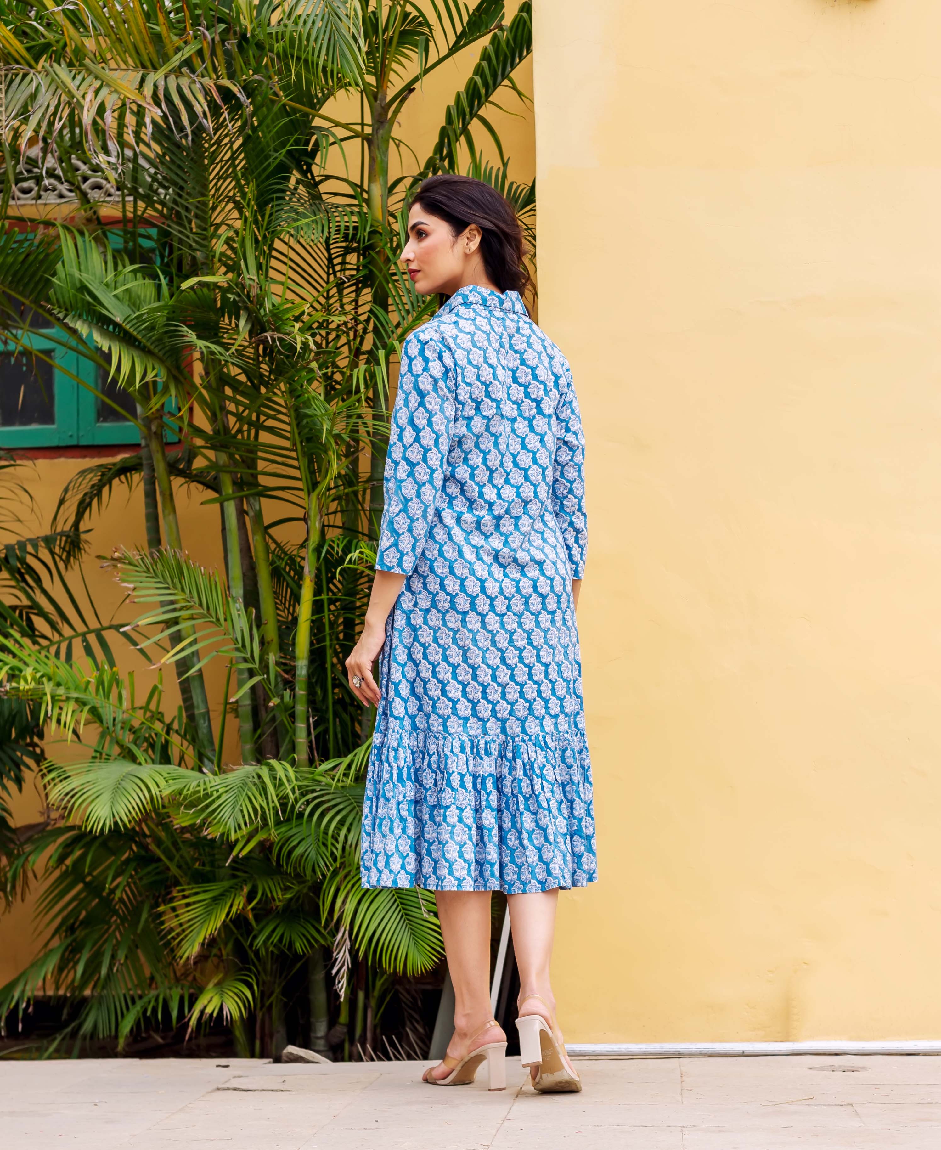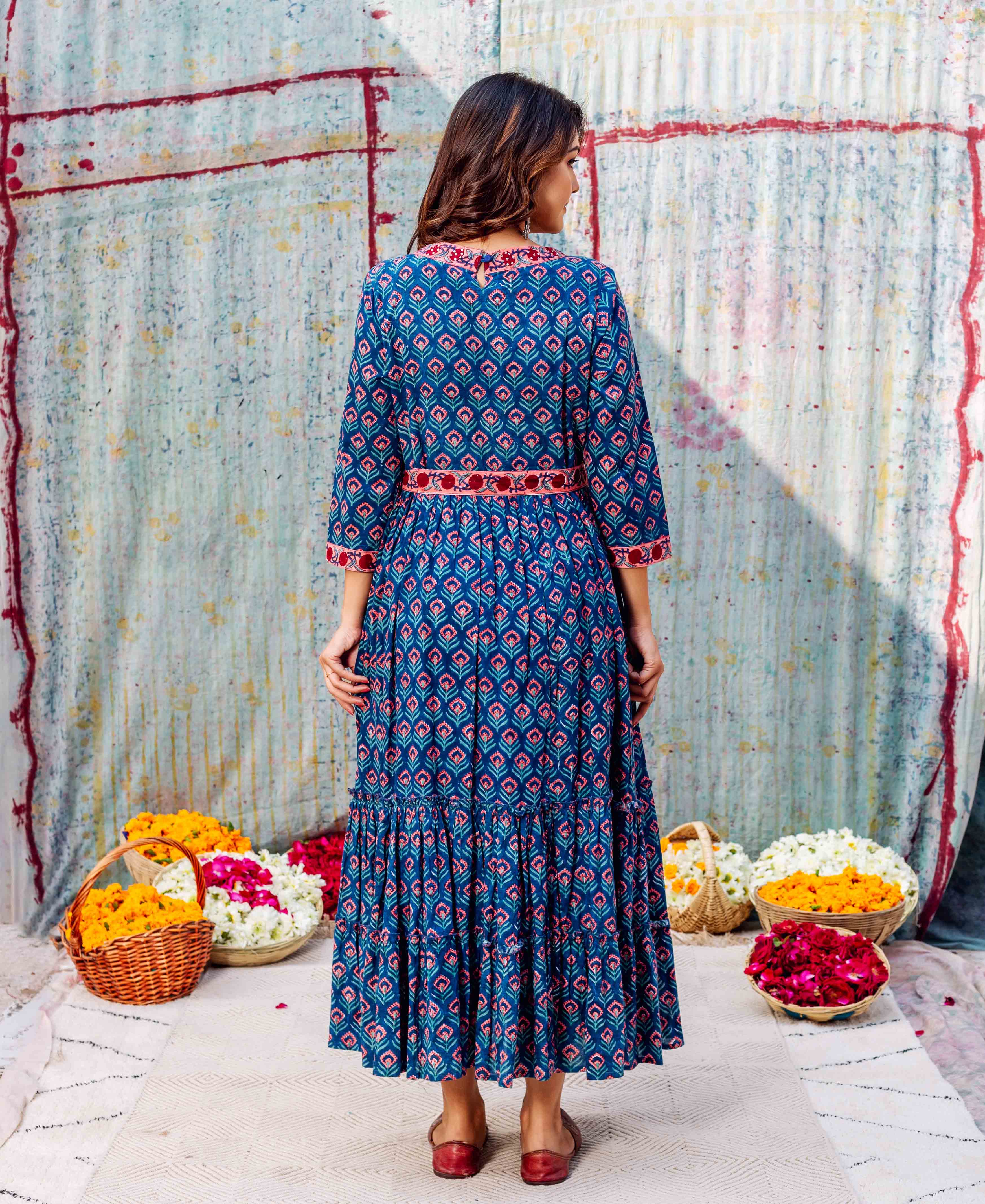 Blue Cotton Block-Printed Tiered Dress