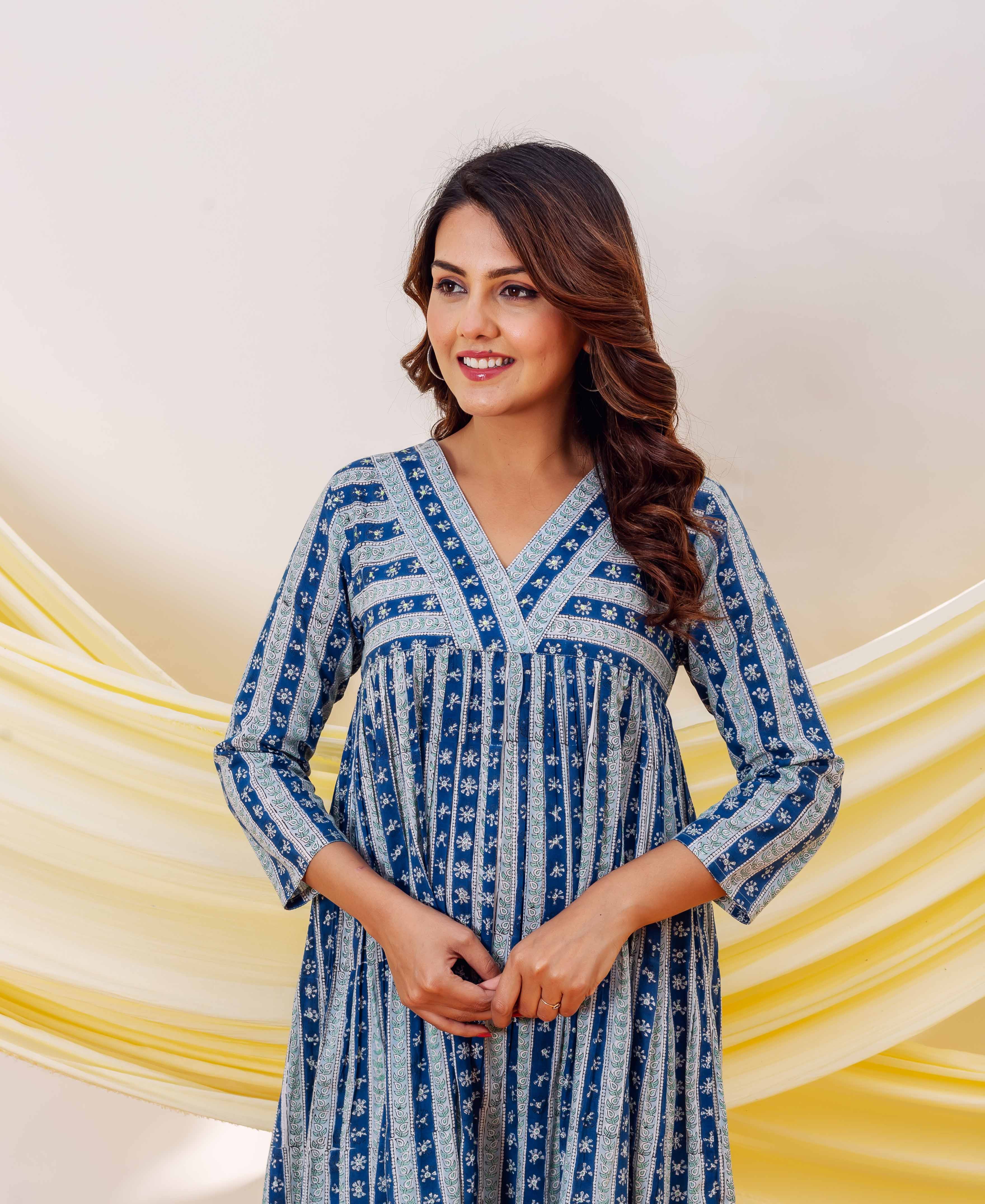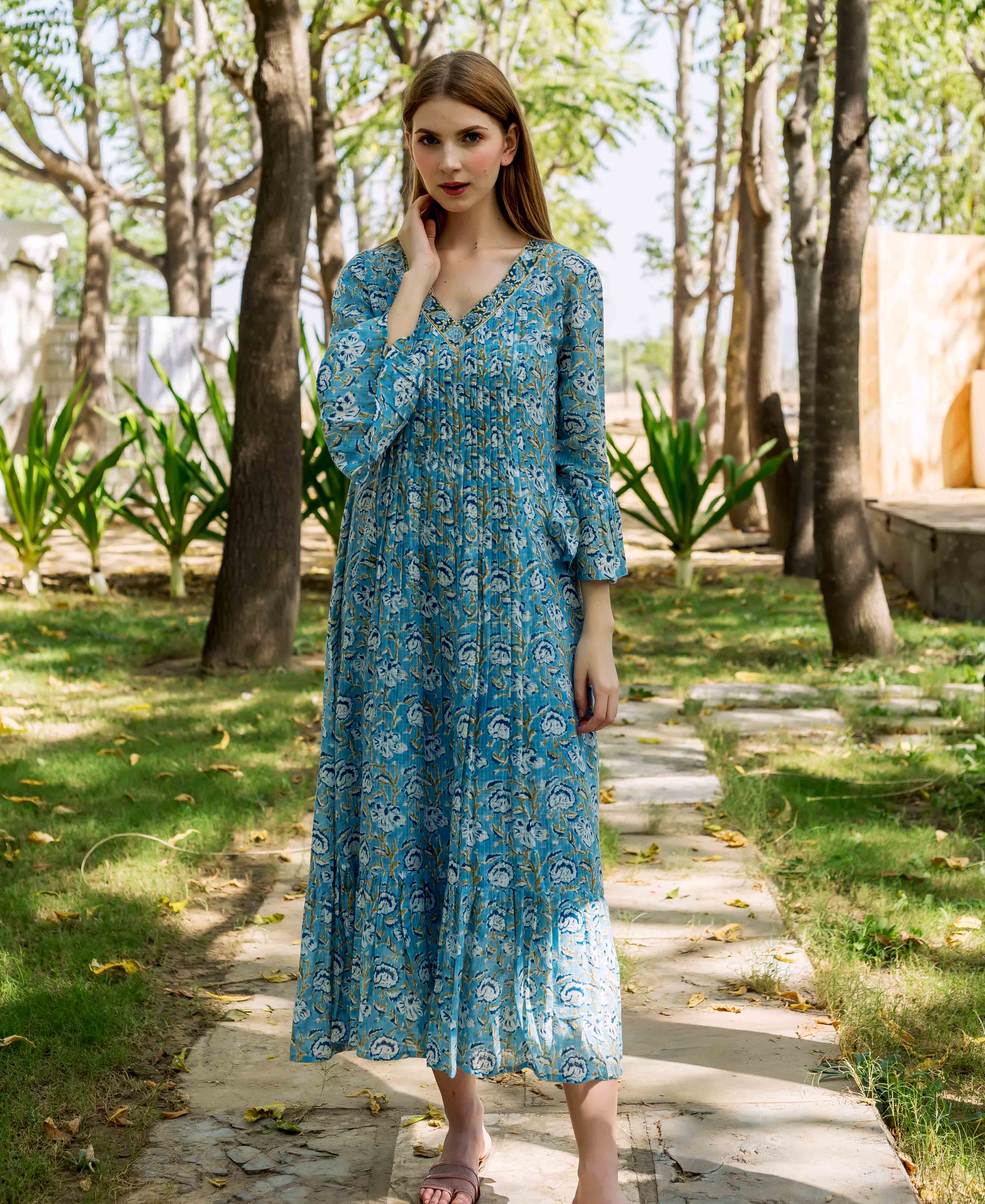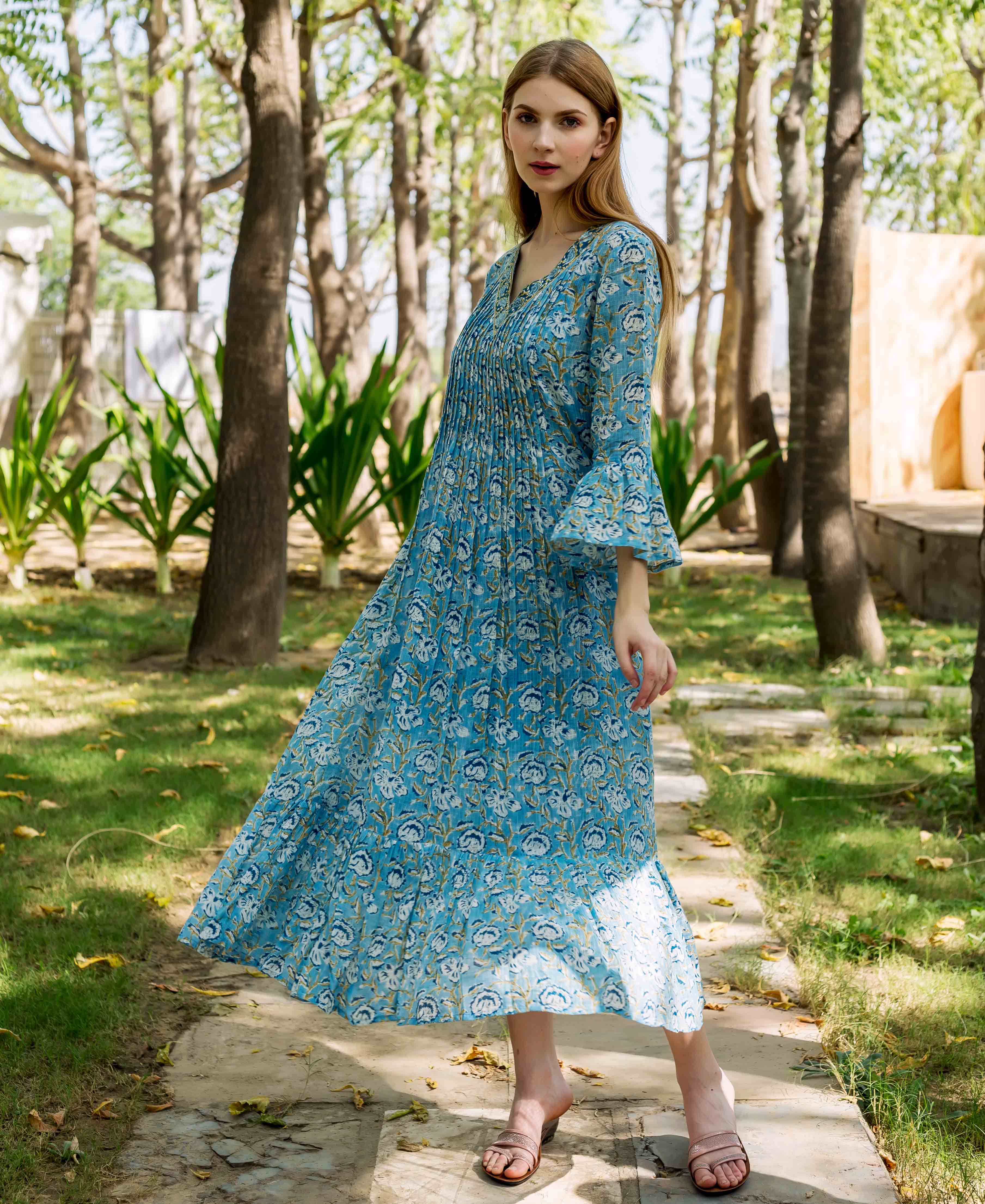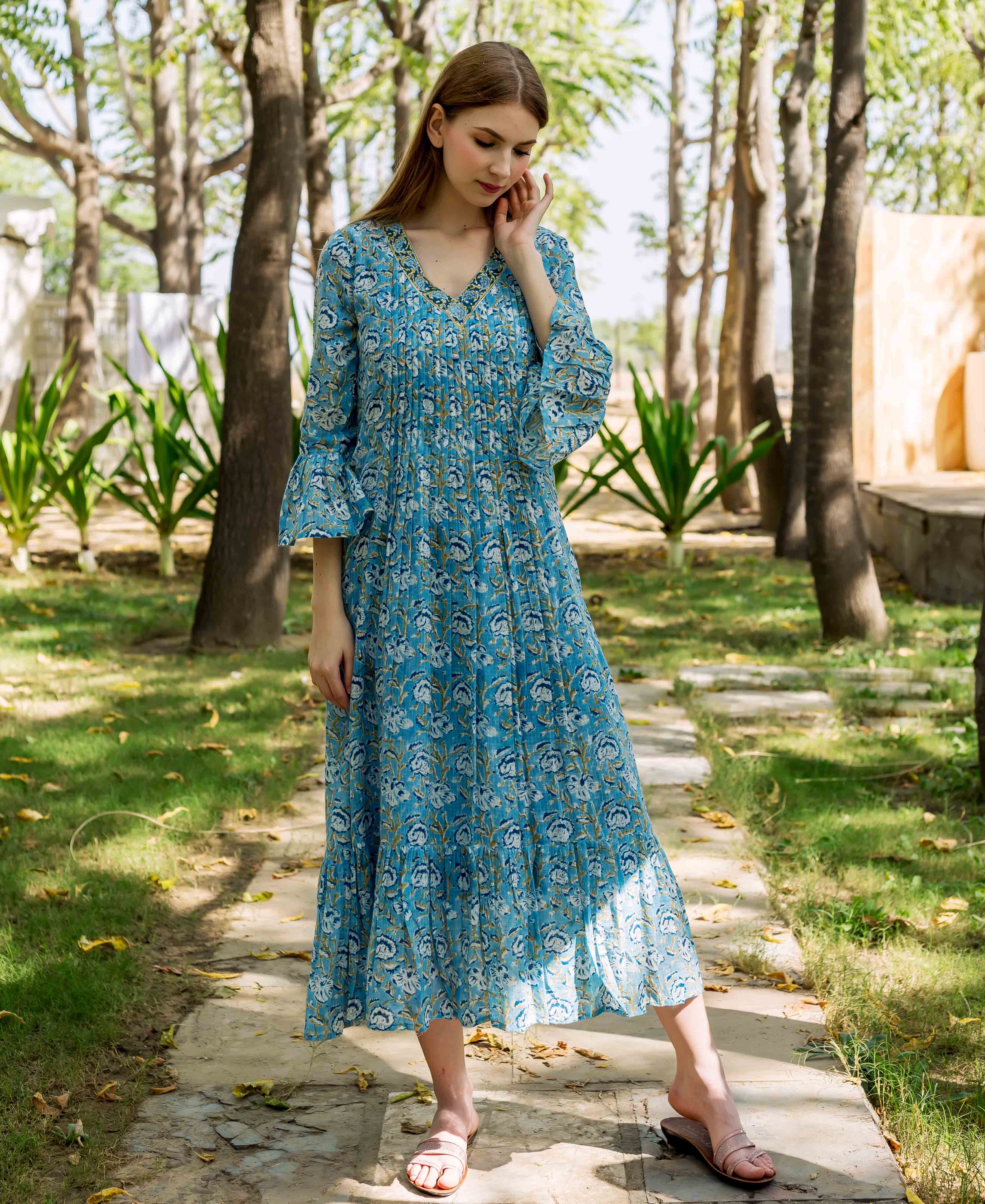 Azure Elegance Full-Length Hand Block Printed Dress