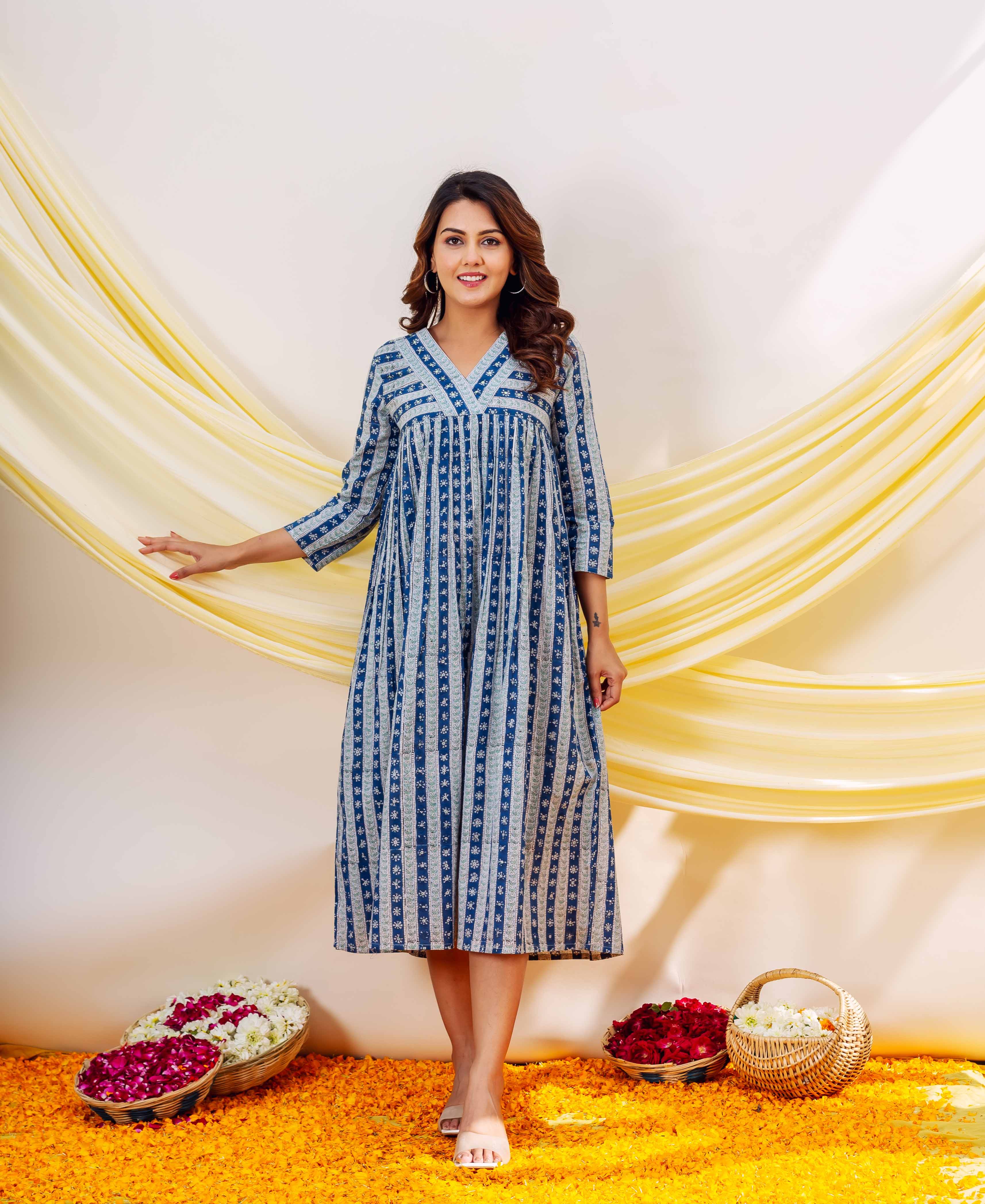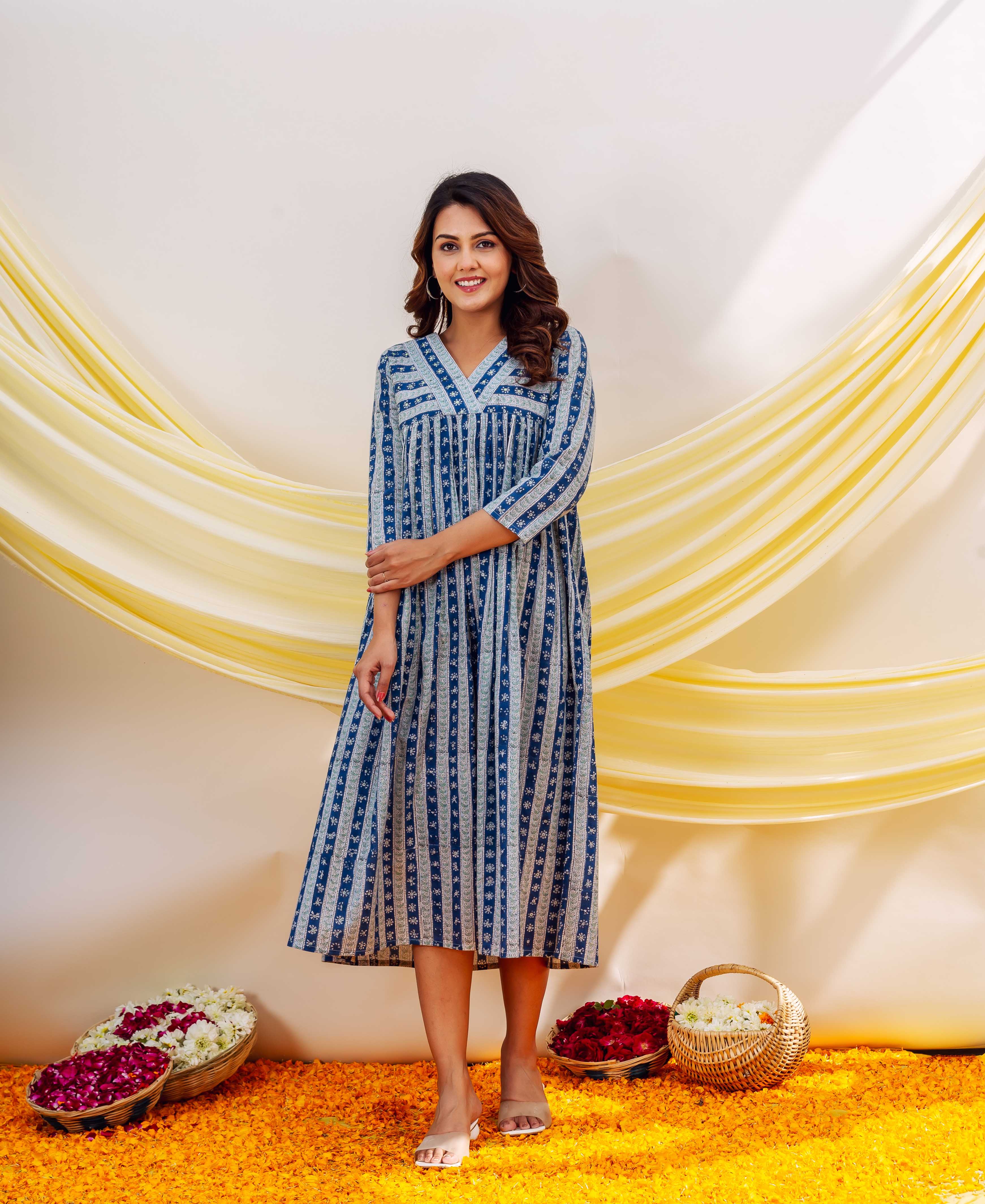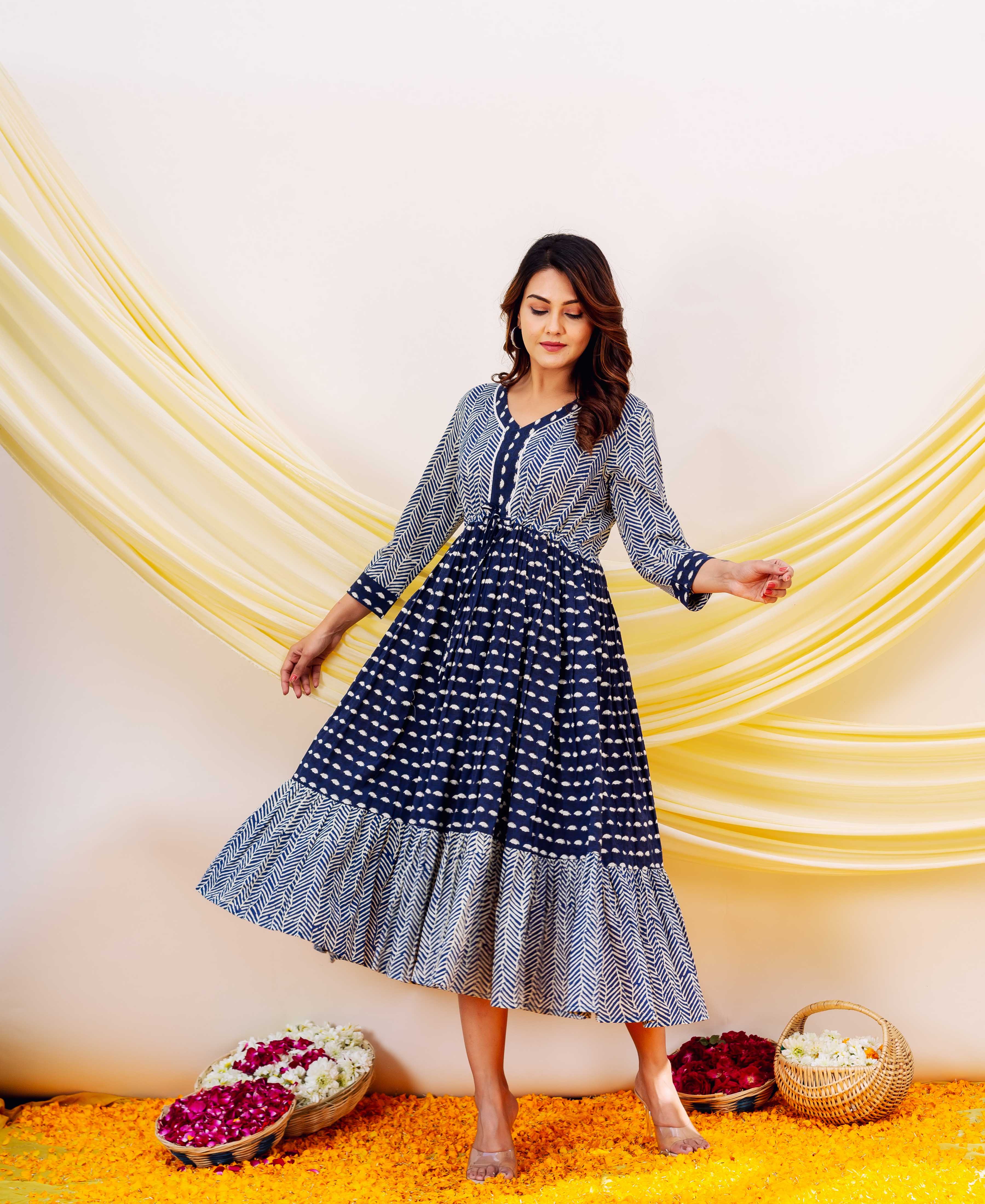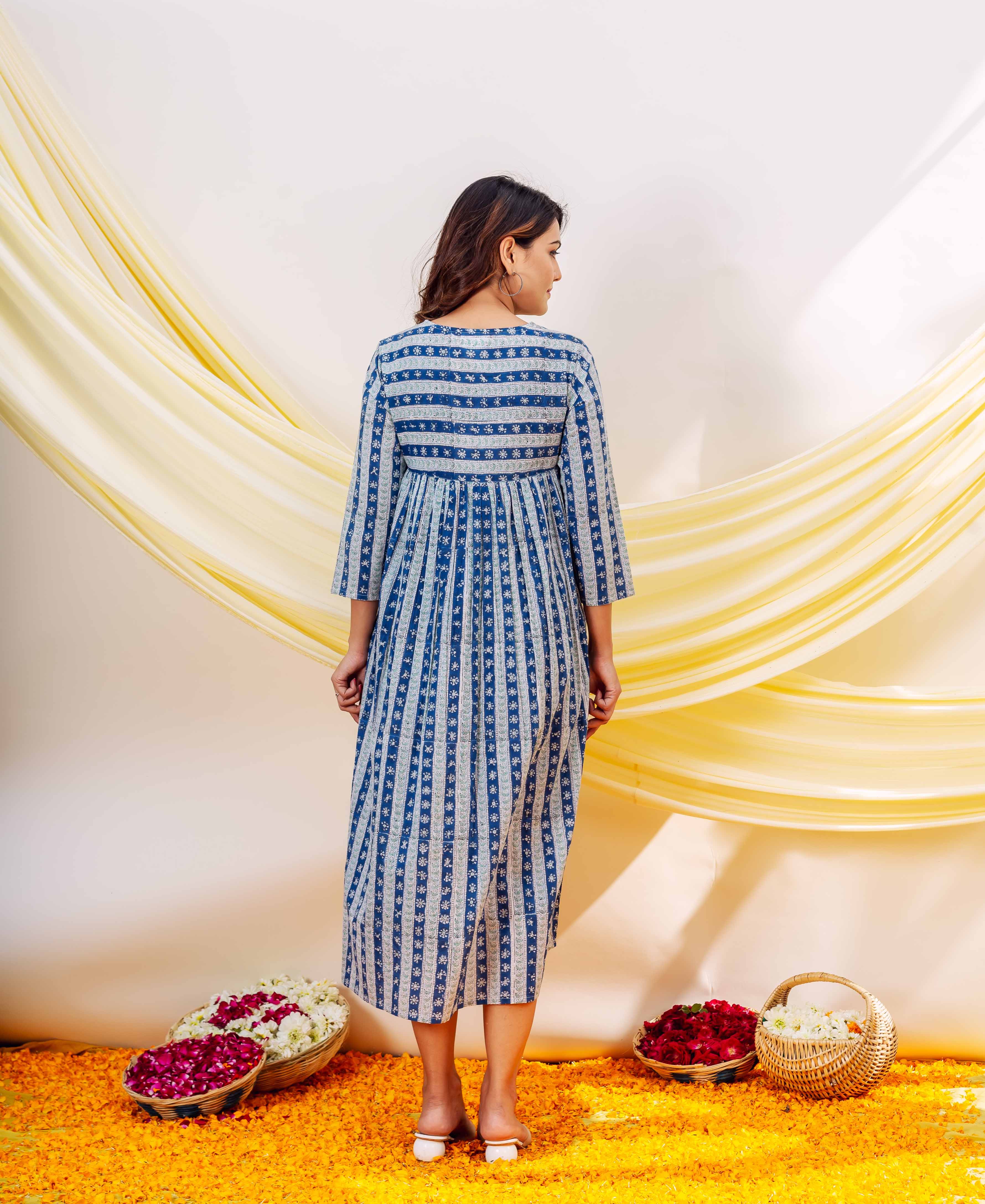 Azure Elegance Full-Length Hand Block Printed Dress