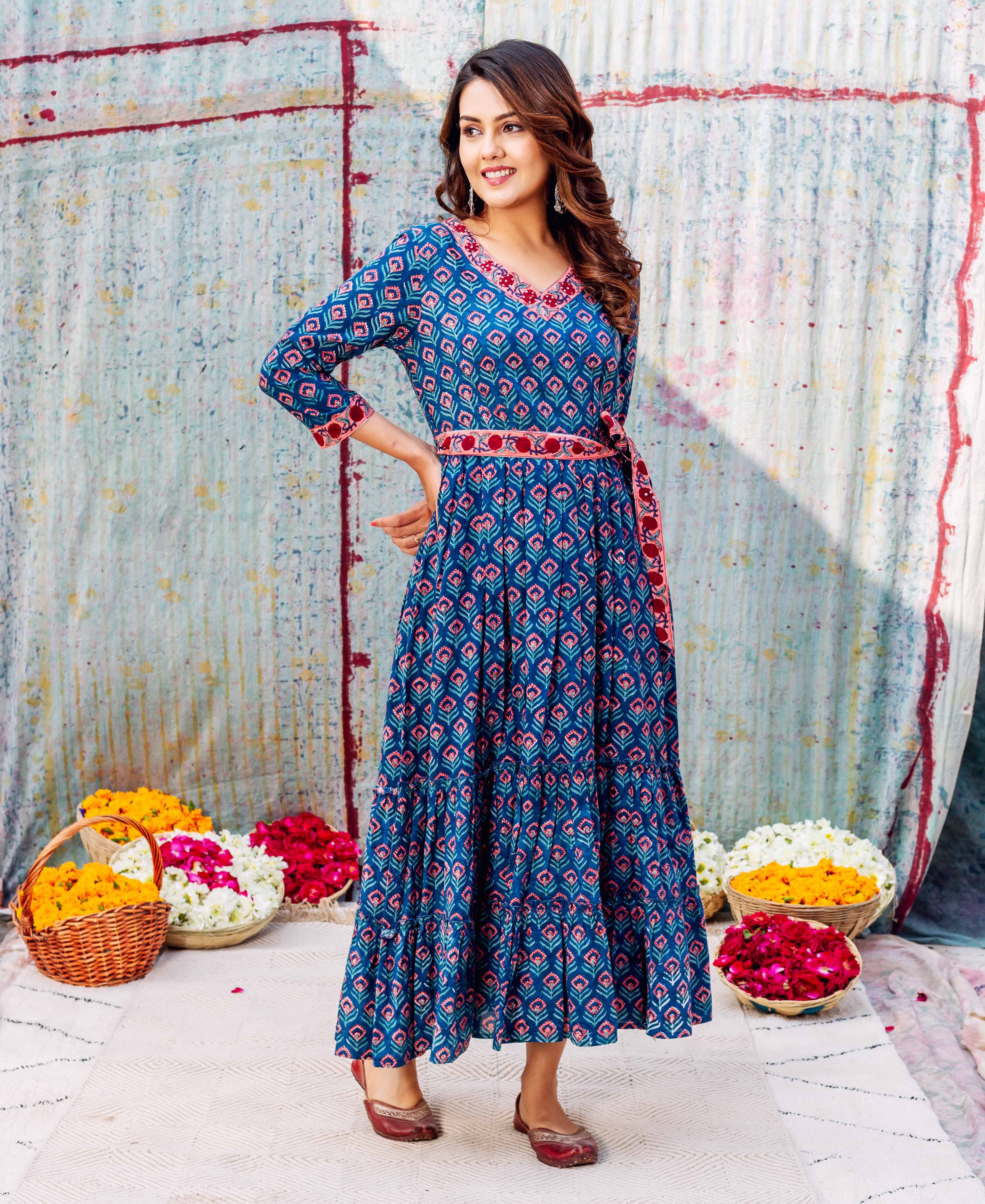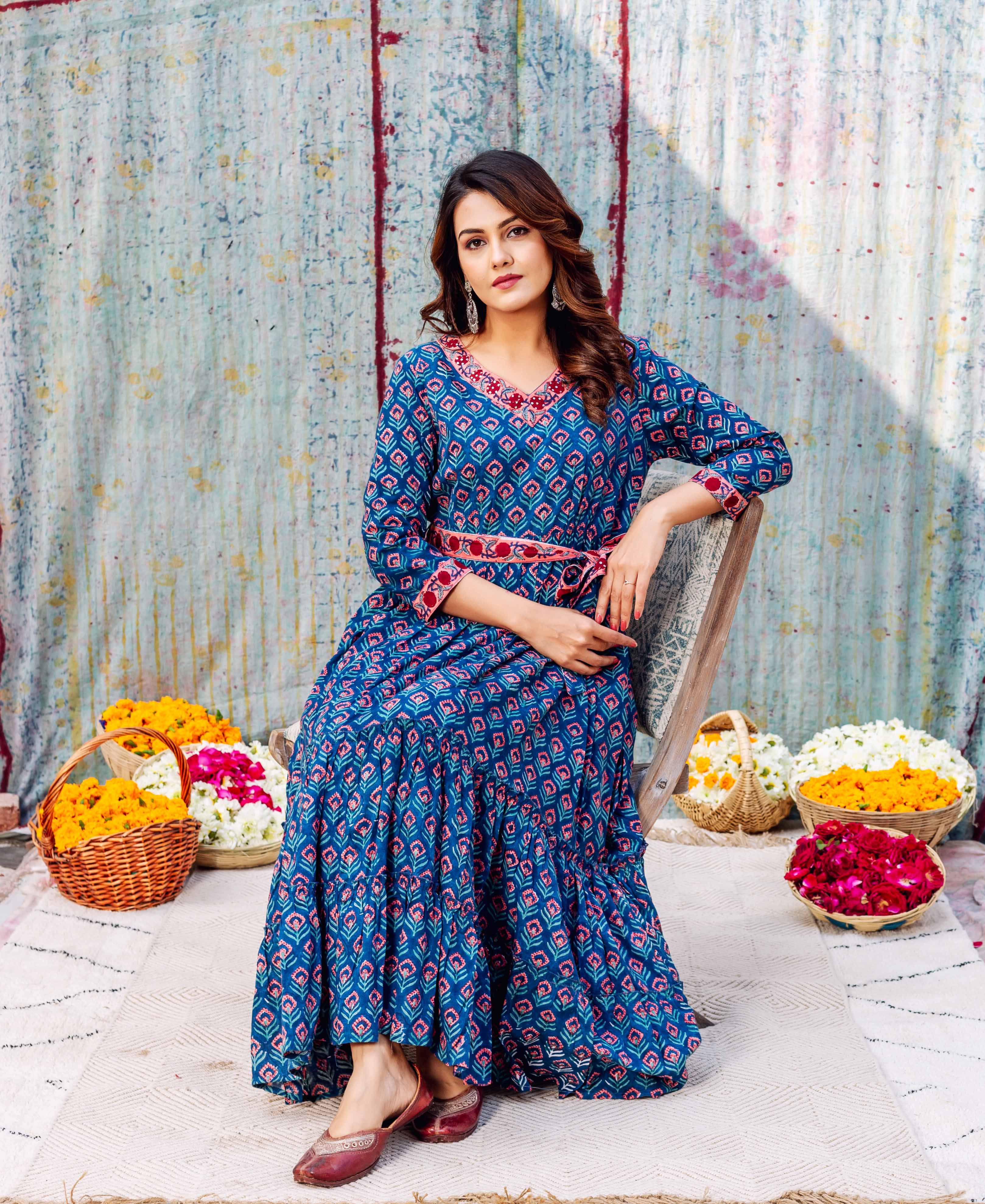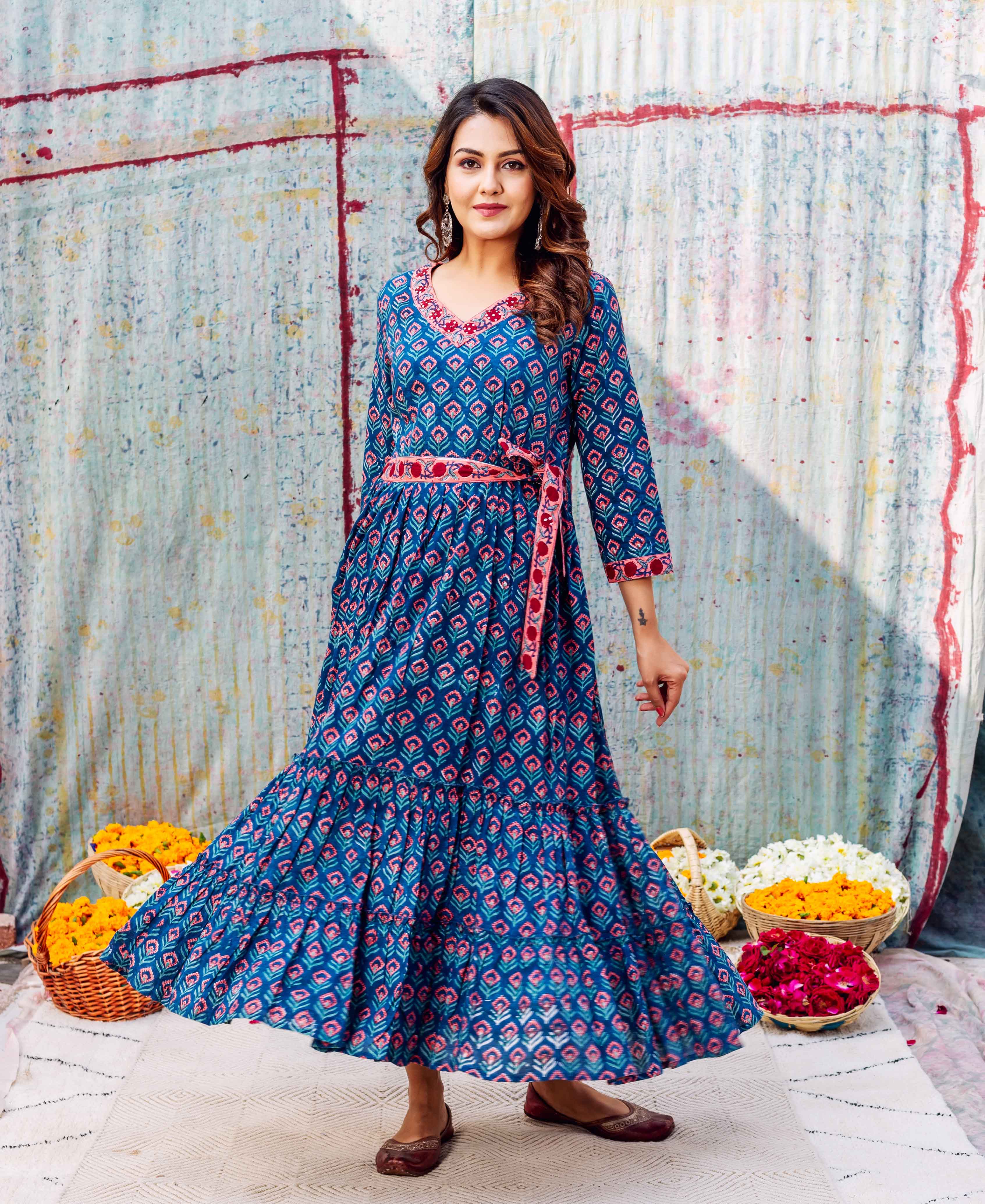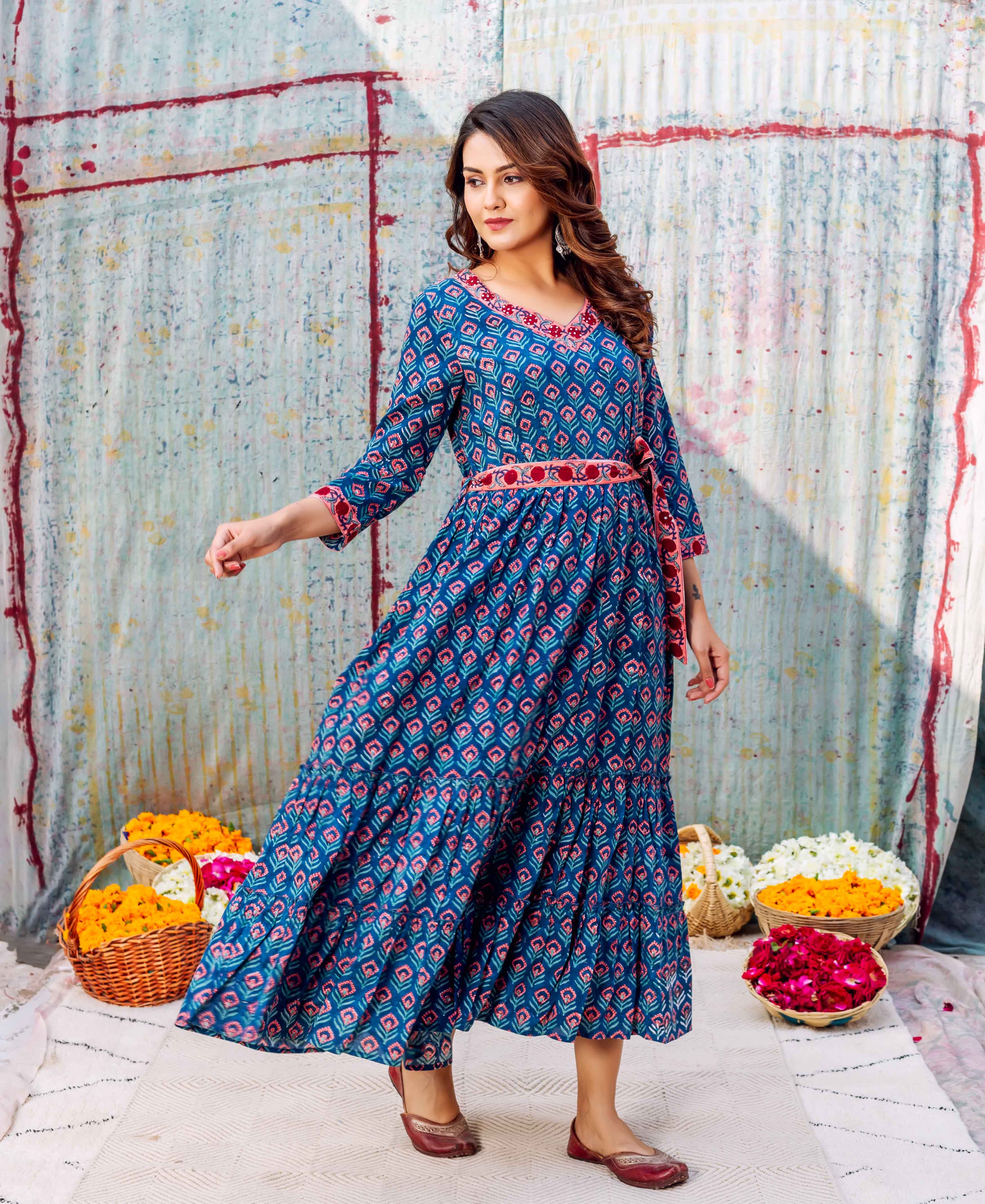 Azure Elegance Full-Length Hand Block Printed Dress