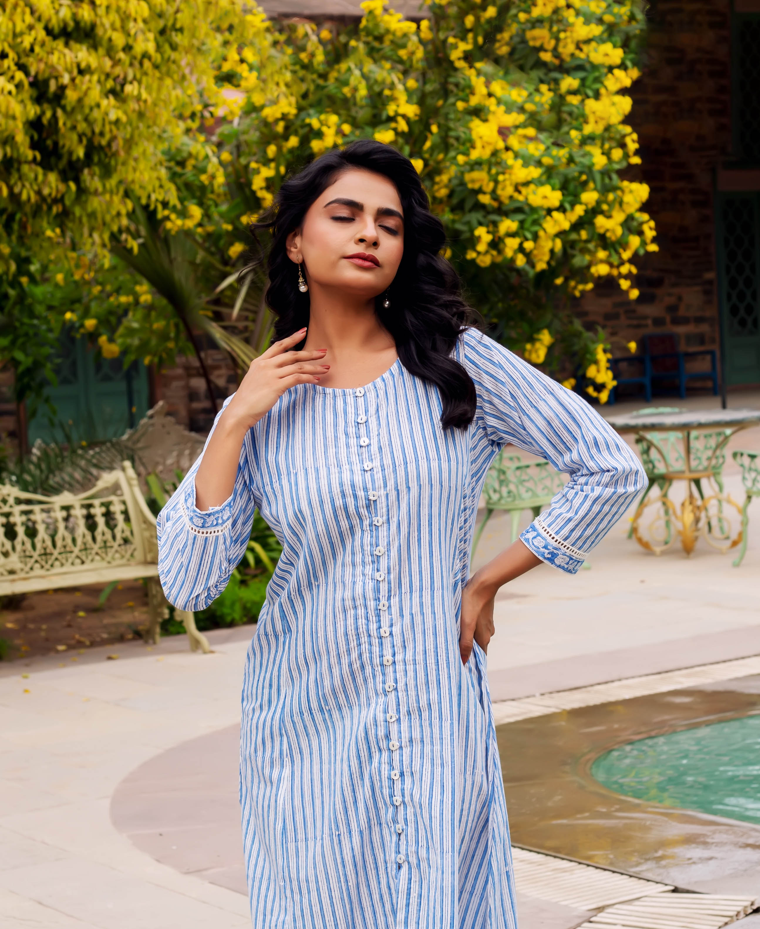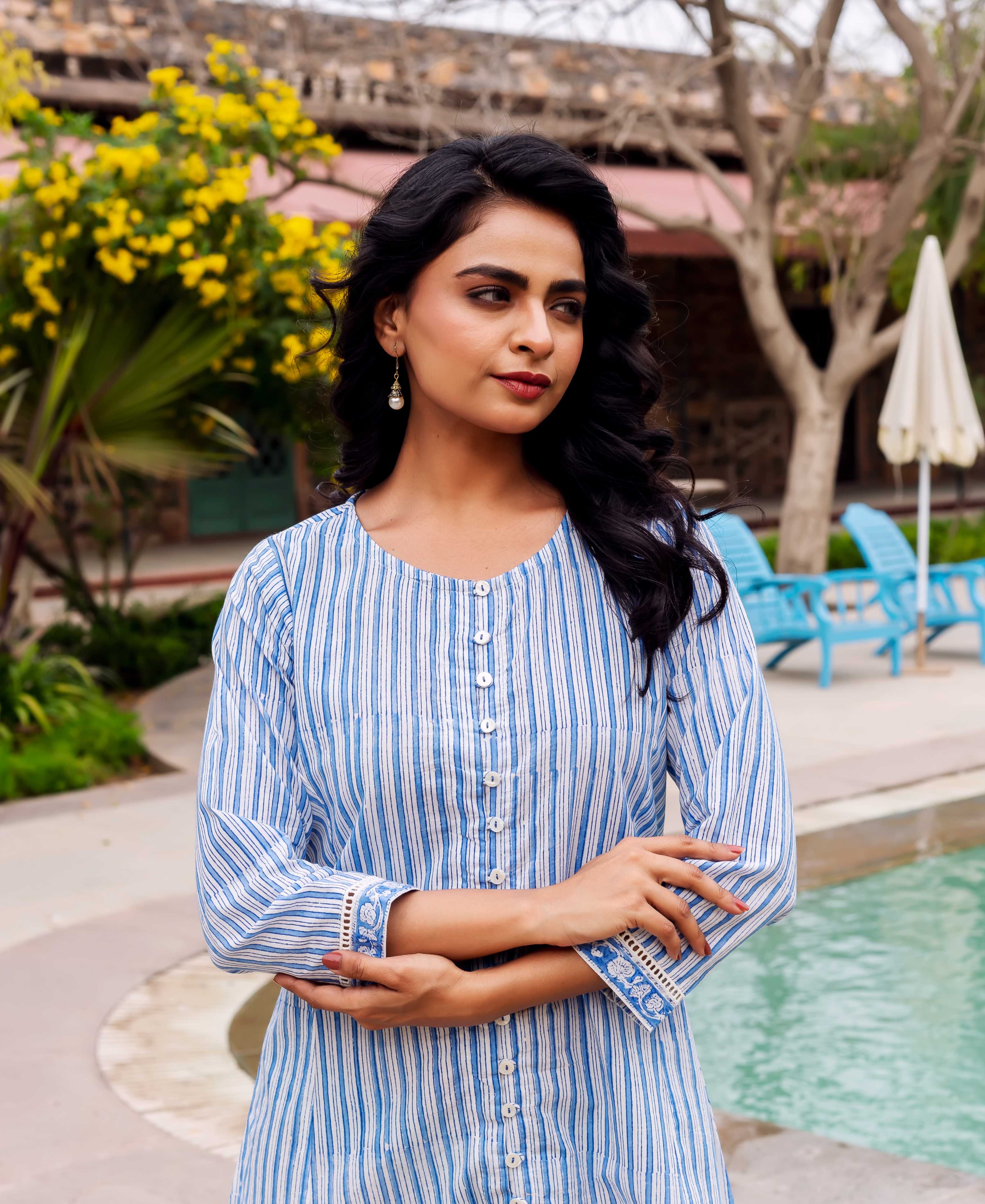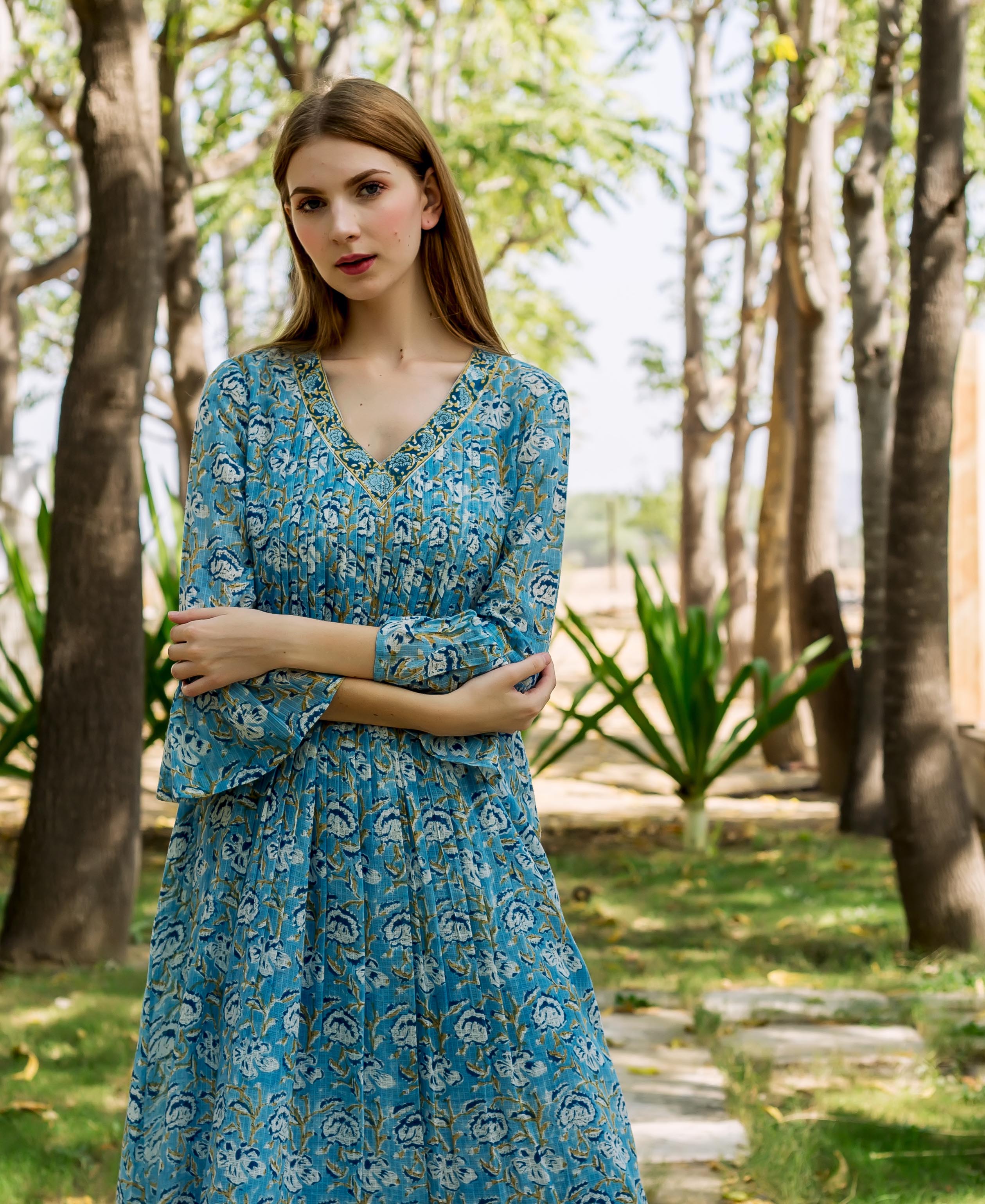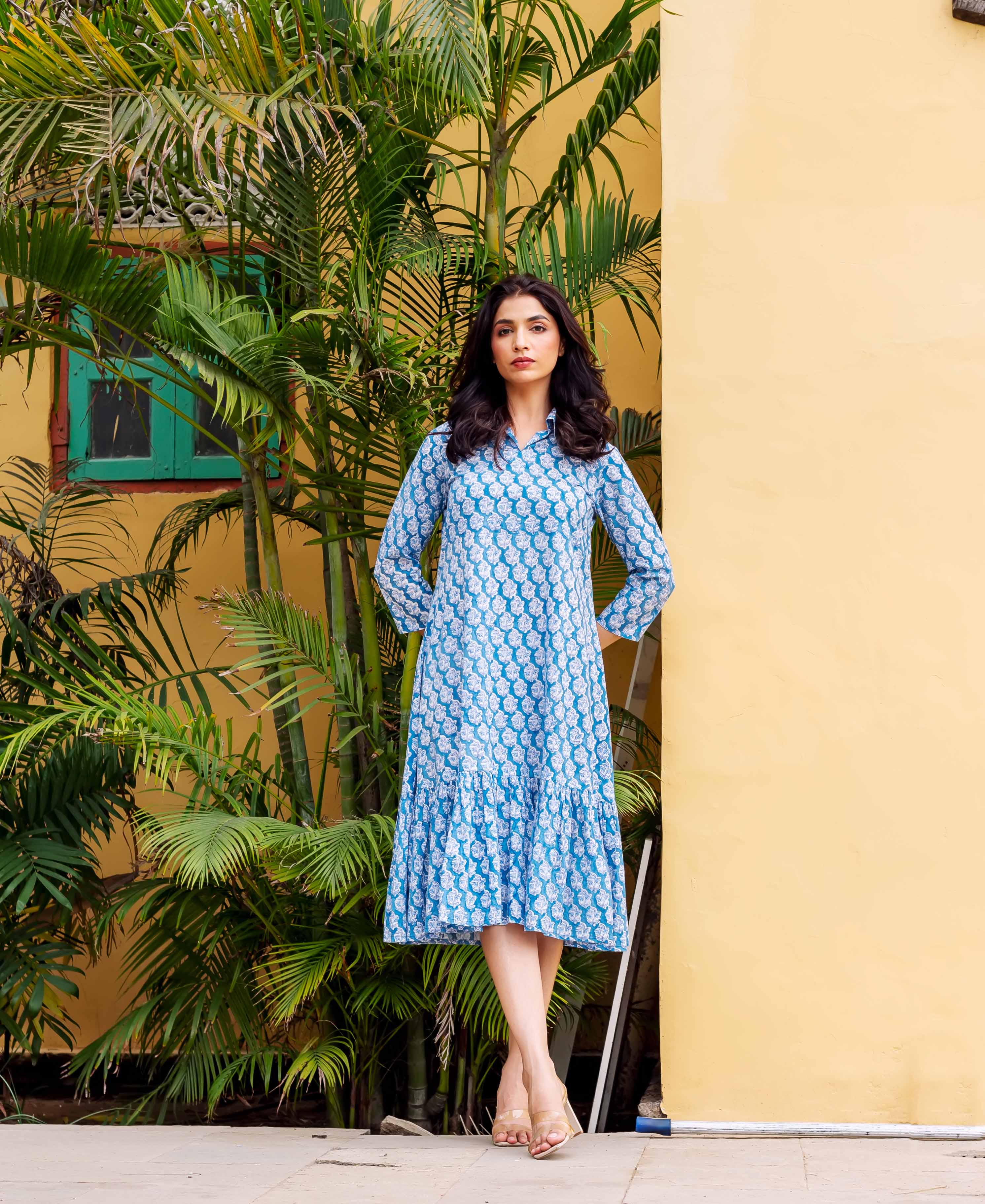 Azure Elegance Full-Length Hand Block Printed Dress