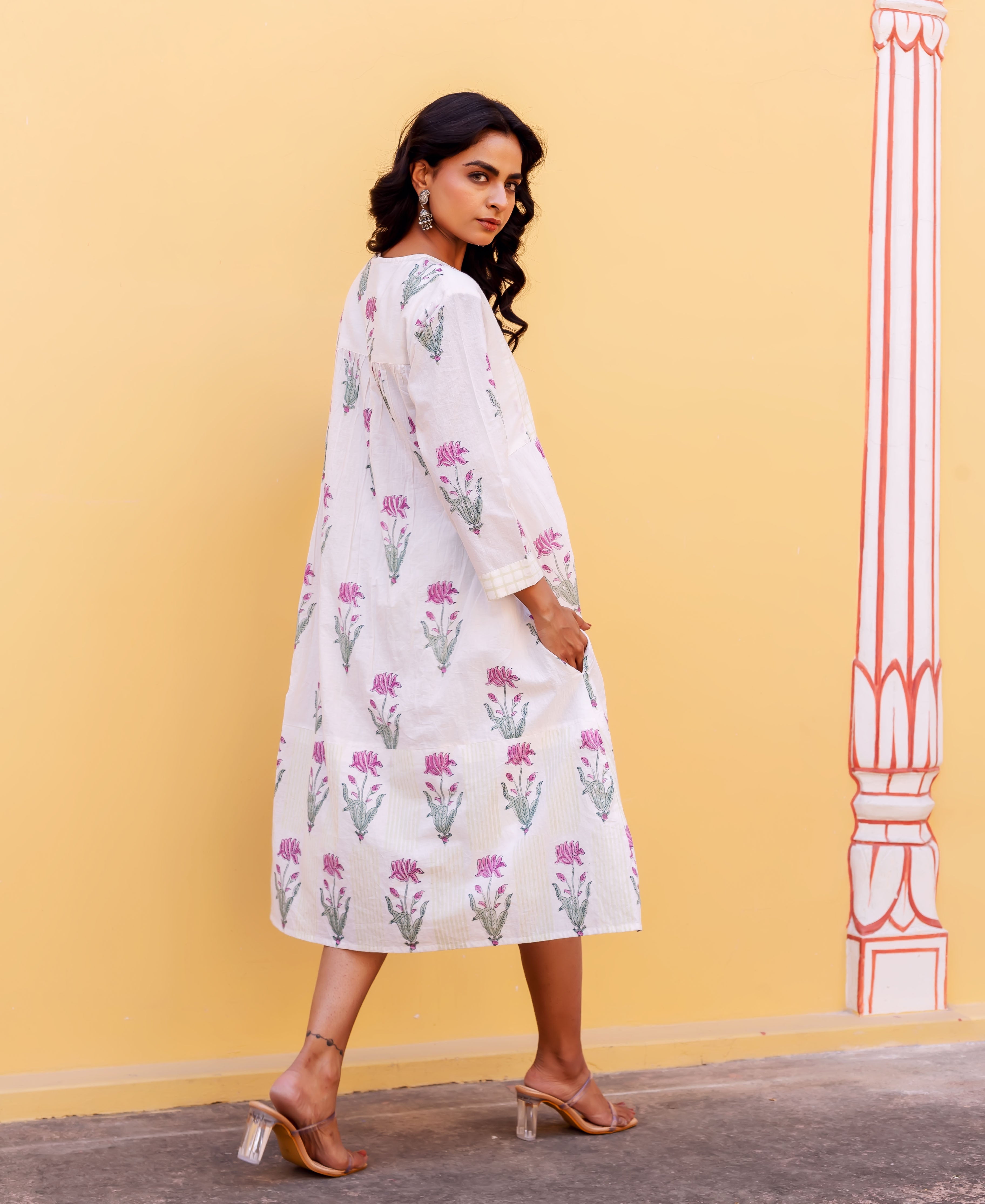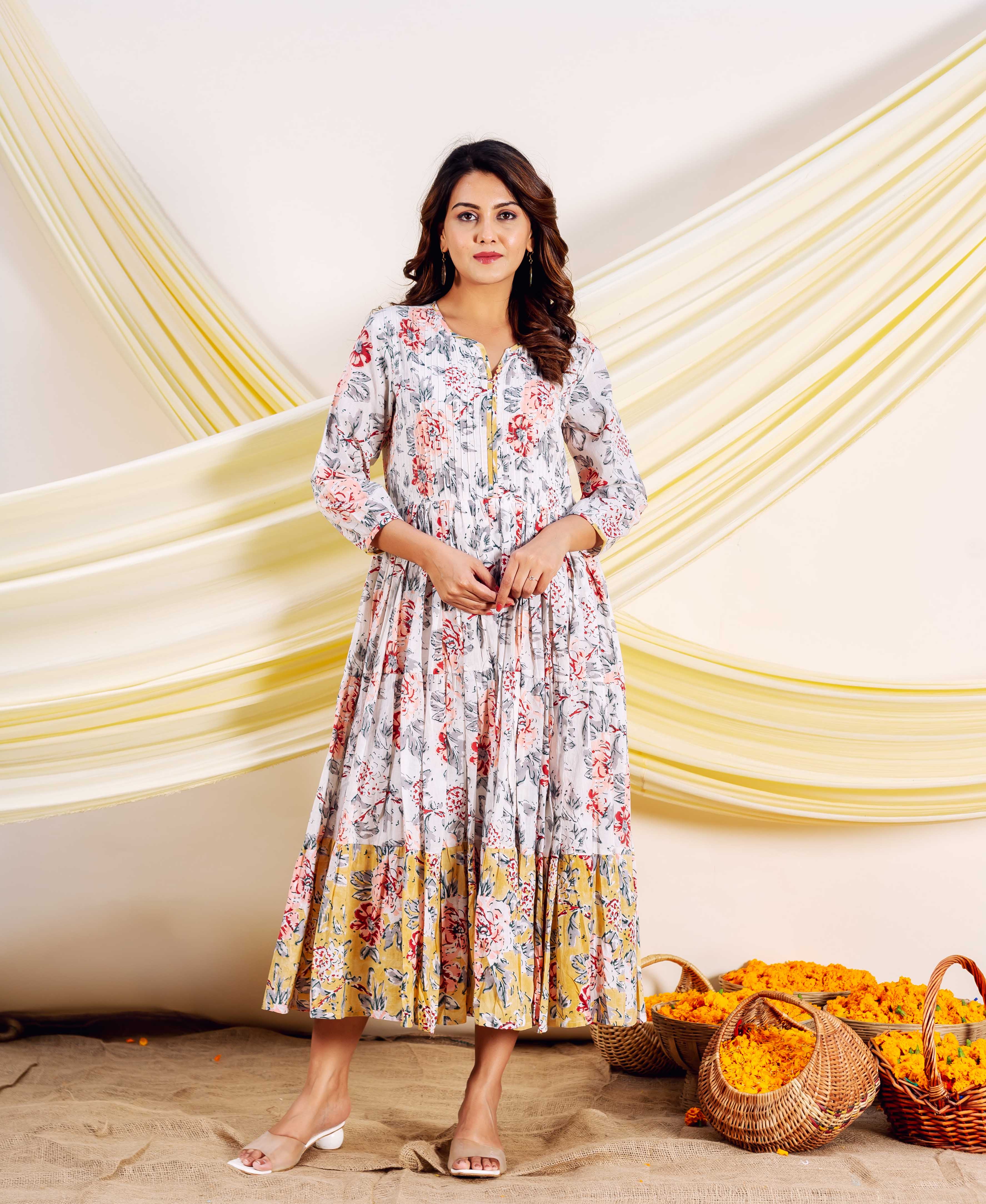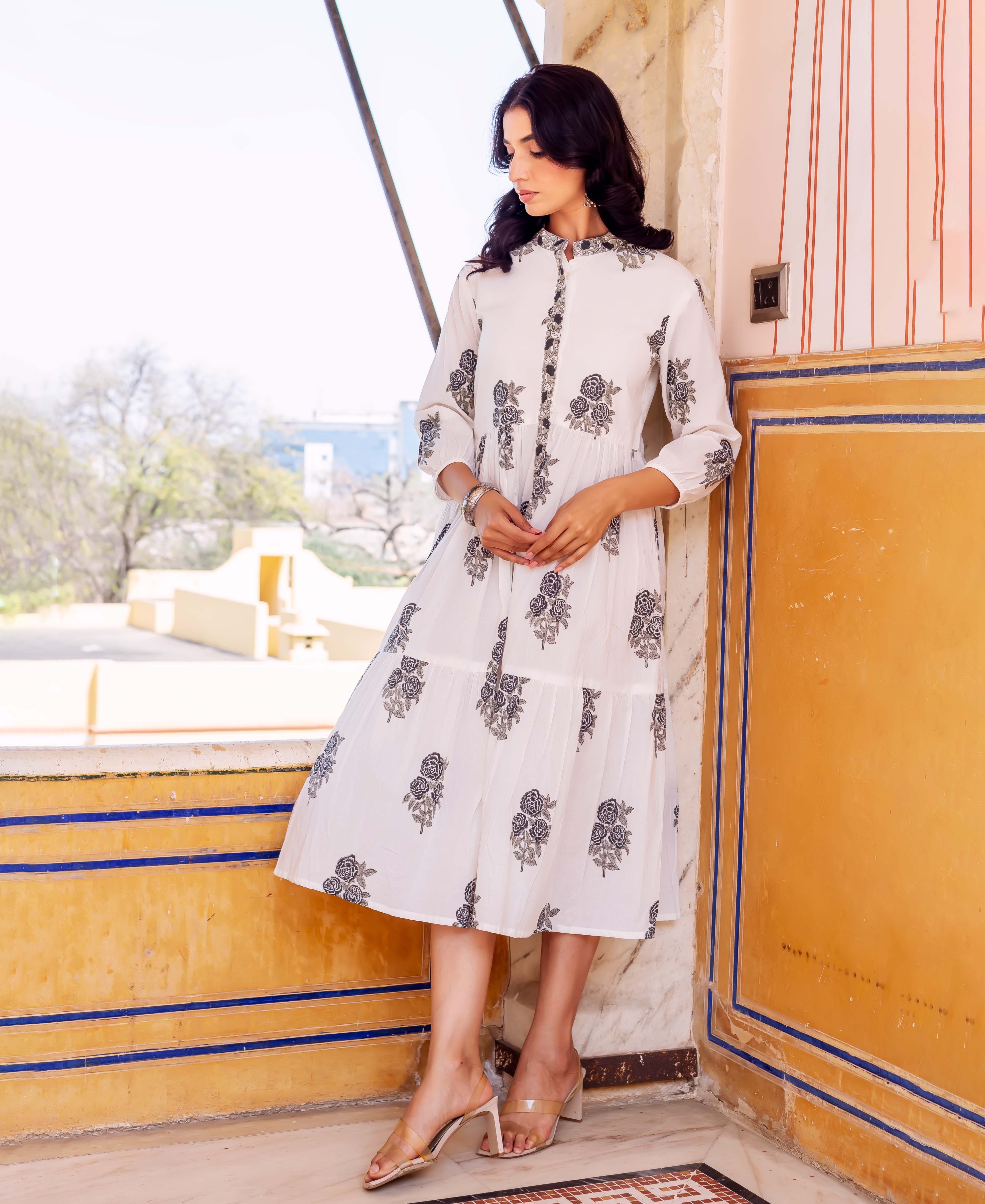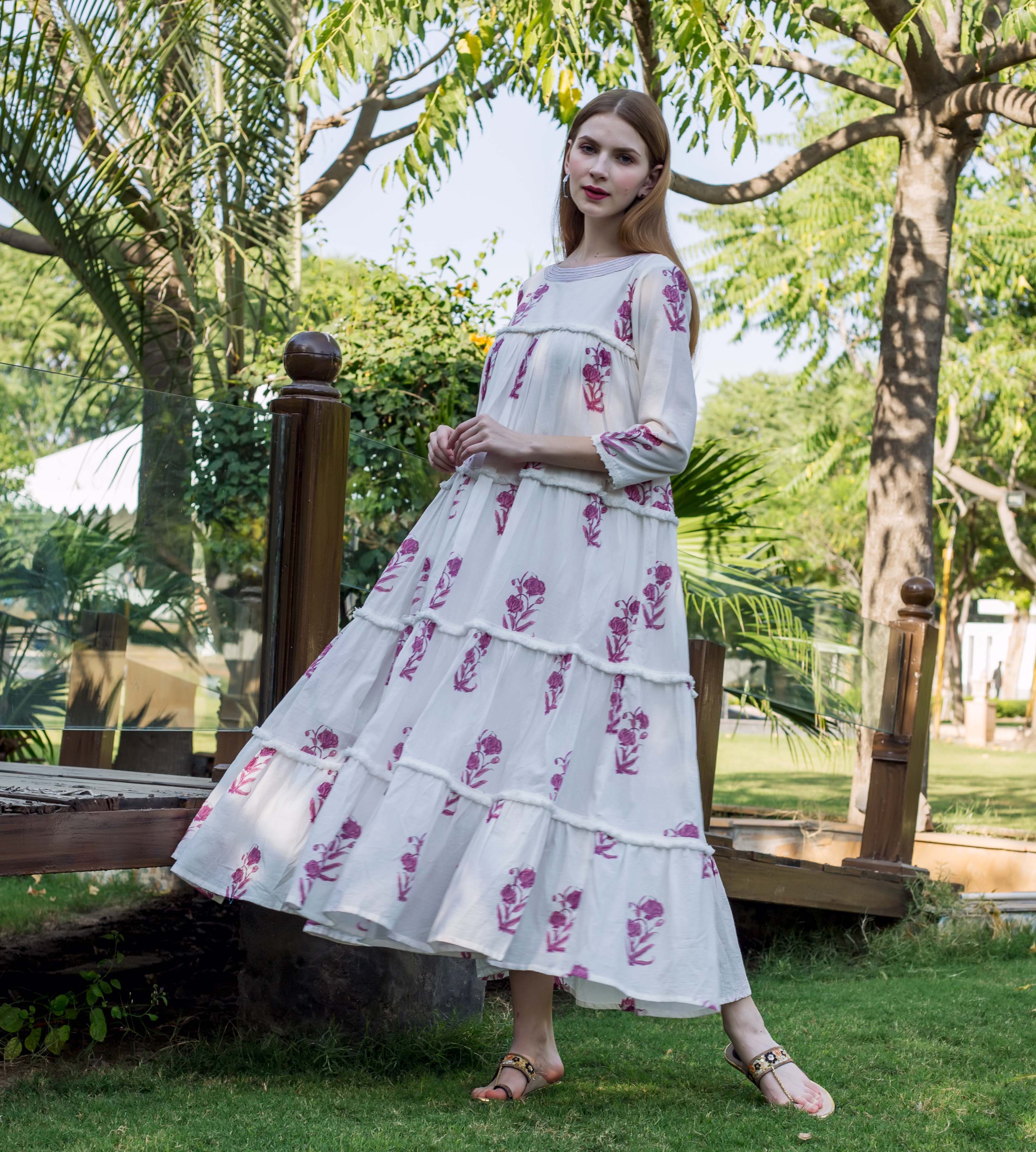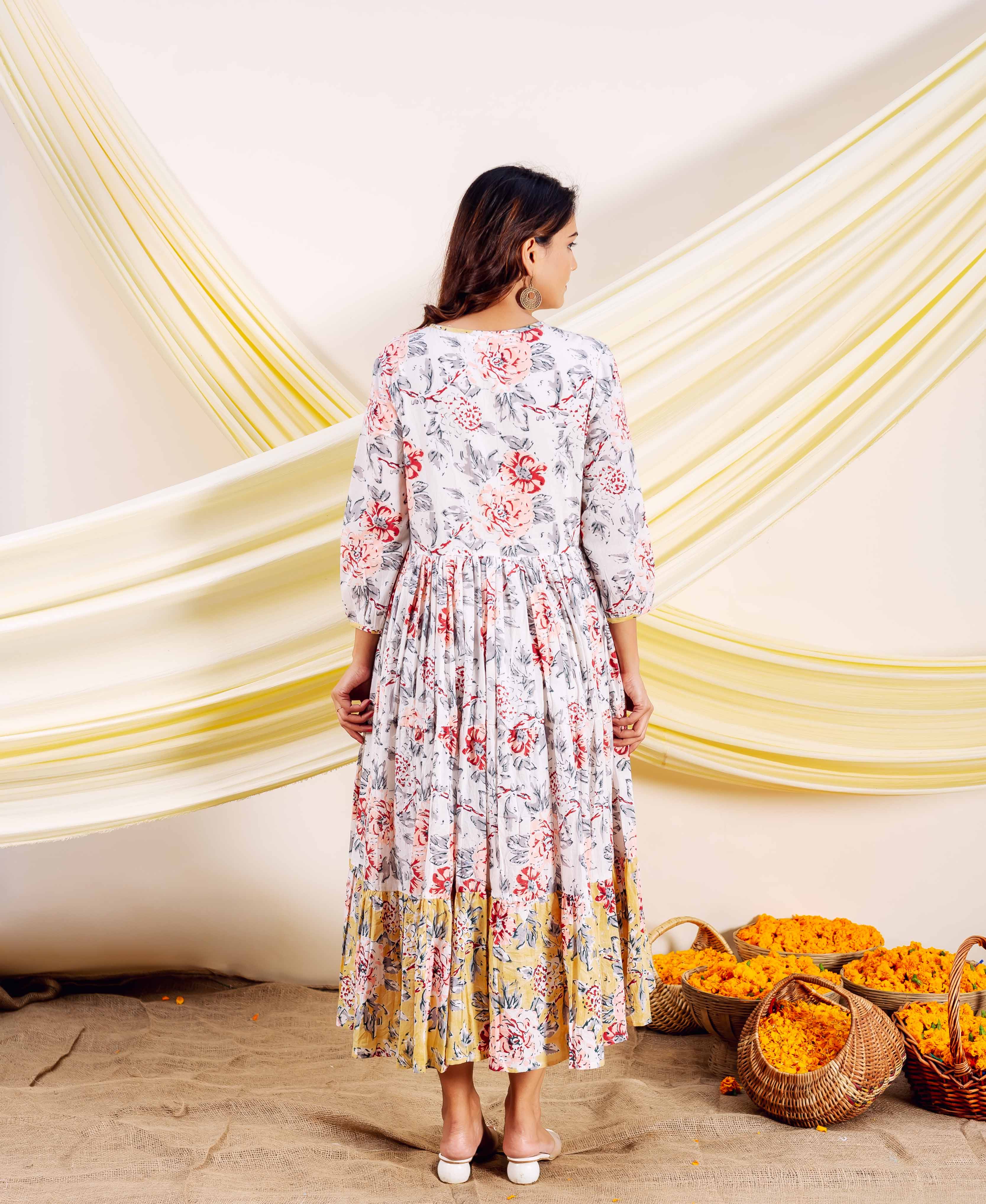 Ivory Petal Hand Block Printed Cotton Dress