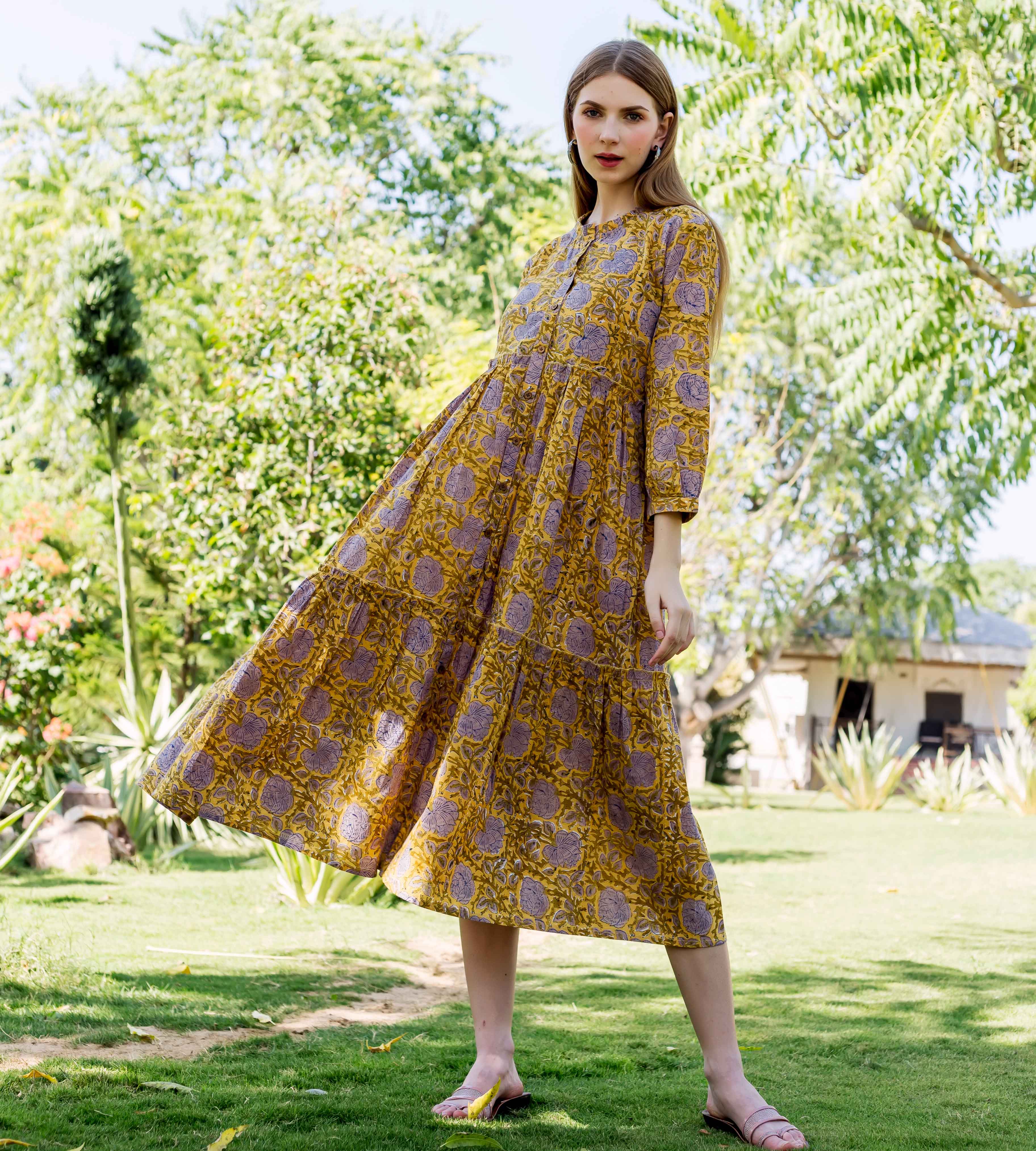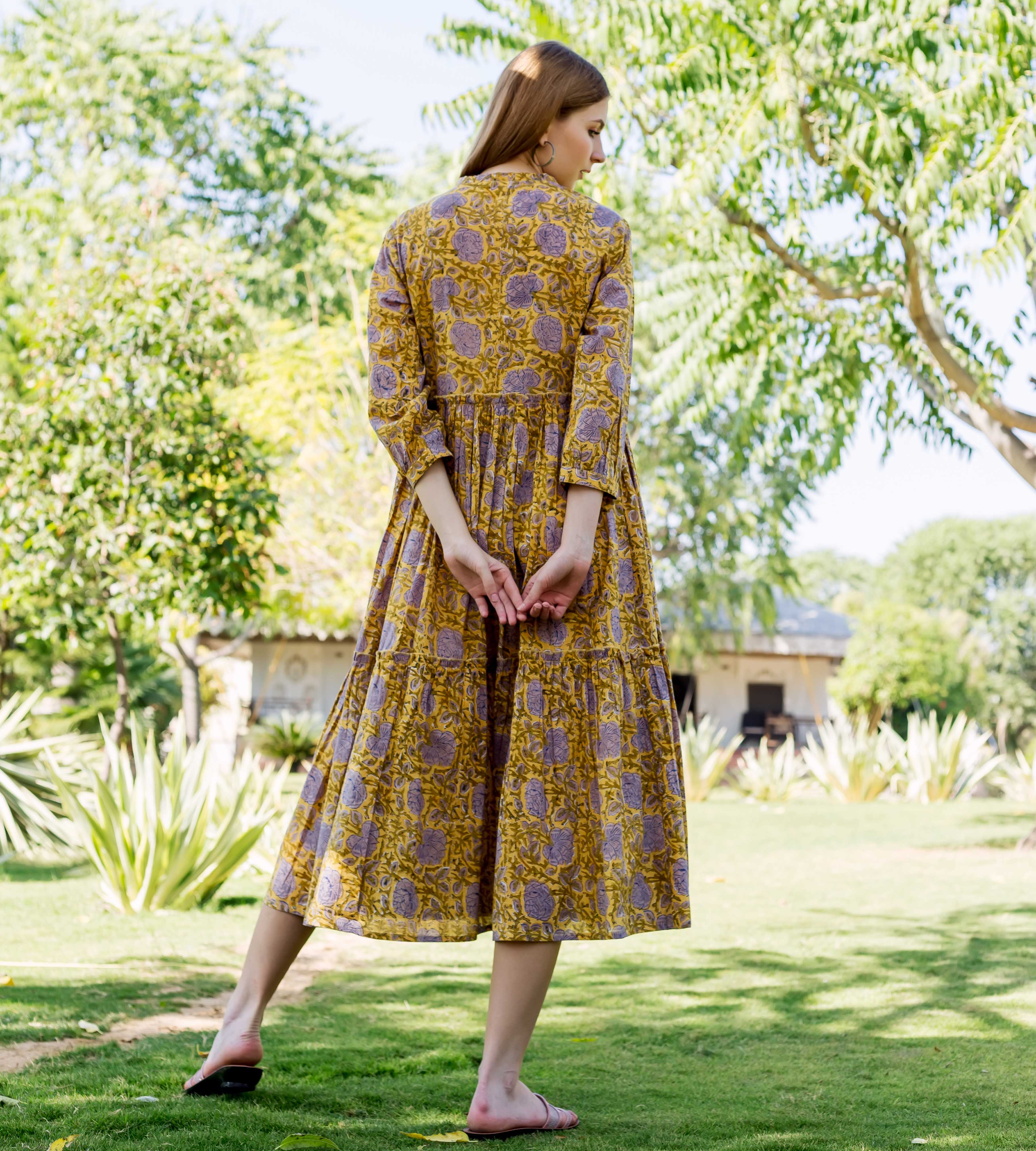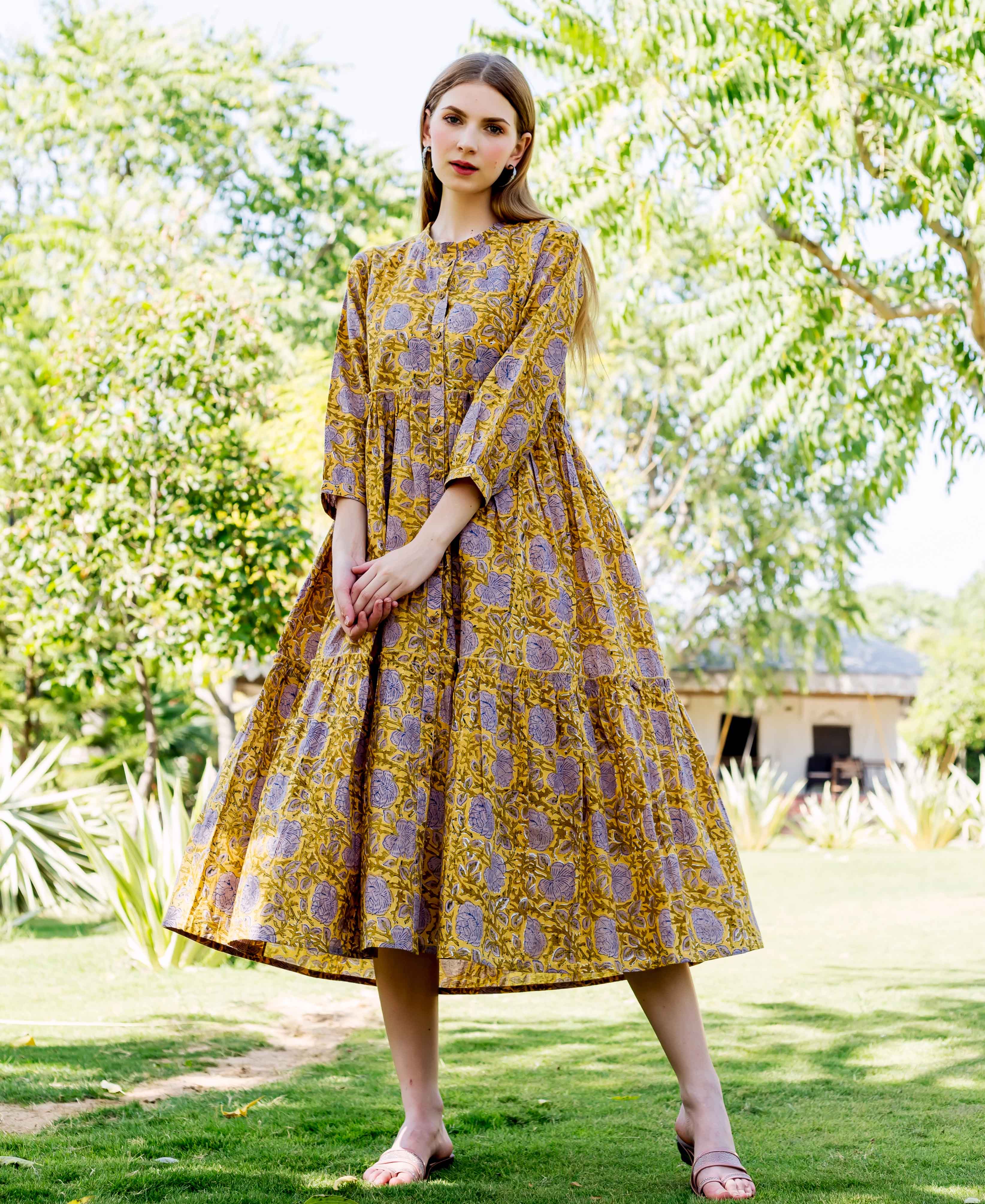 Ochre and Brown Hand Block Printed Tiered Button Down Dress