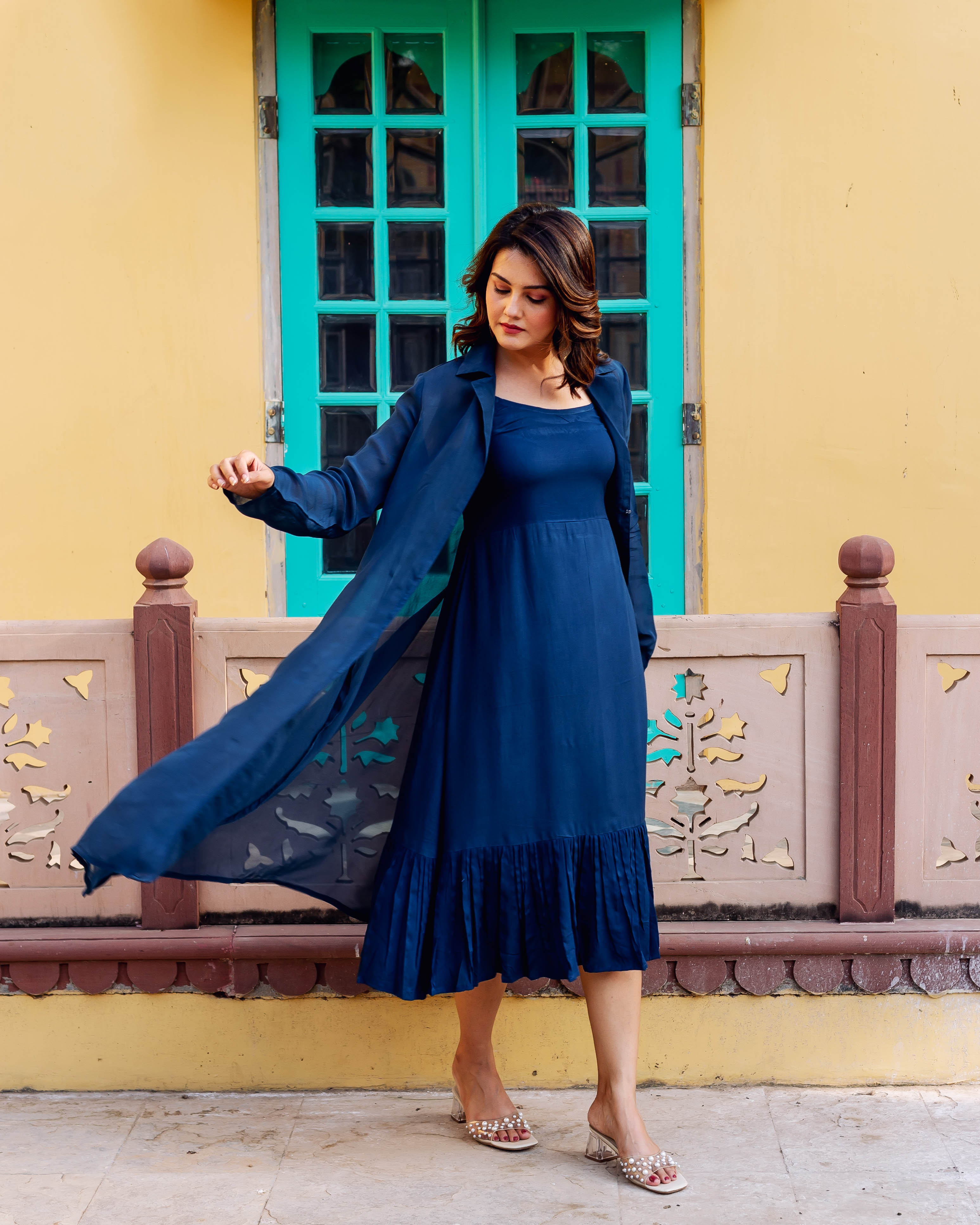 Discover sophistication with Shreya's Twilight Blue Ensemble: Modal Dress with Sheer Organza Jacket. The modal dress features a chic, strappy design with flattering gathers at the sweep, offering both comfort and style. Accompanied by a sheer organza jacket, this ensemble provides an ethereal layer perfect for layering over the dress or wearing separately. Versatile and elegant, it can be worn together for a sophisticated look or styled individually to suit various occasions.