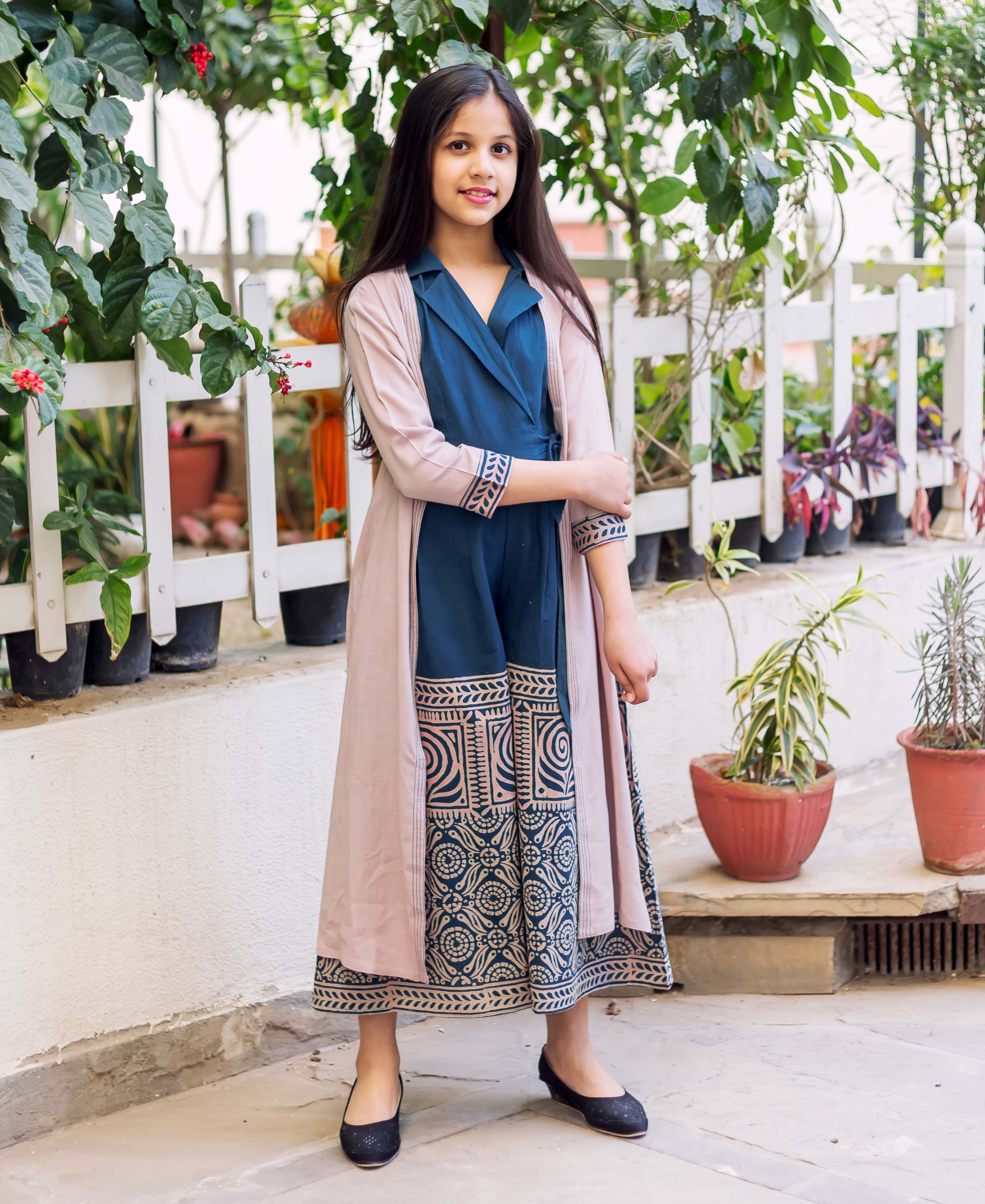 Indigo Blue Hand Block Printed Cotton Jumpsuit with Detachable Jacket for Baby Girl