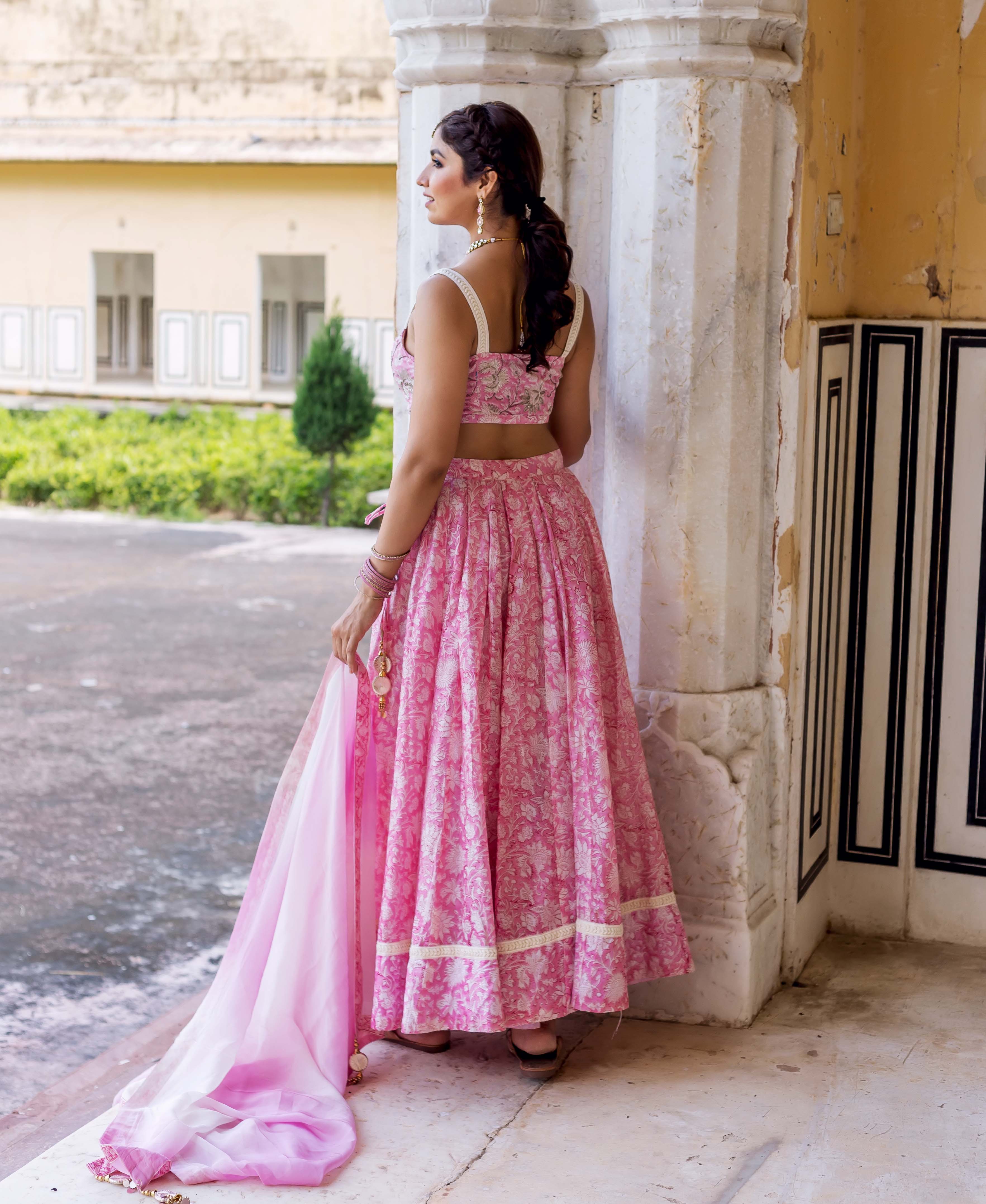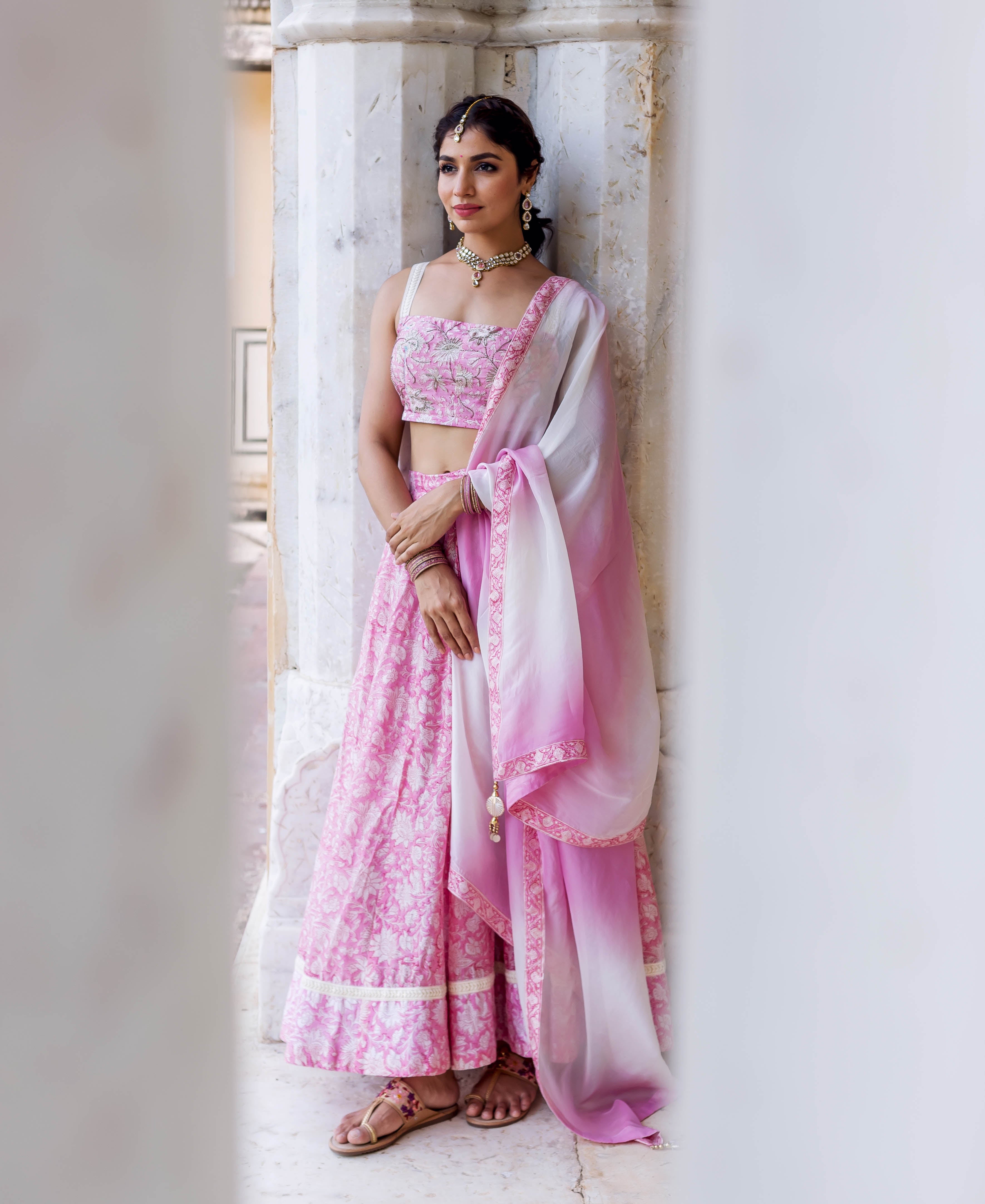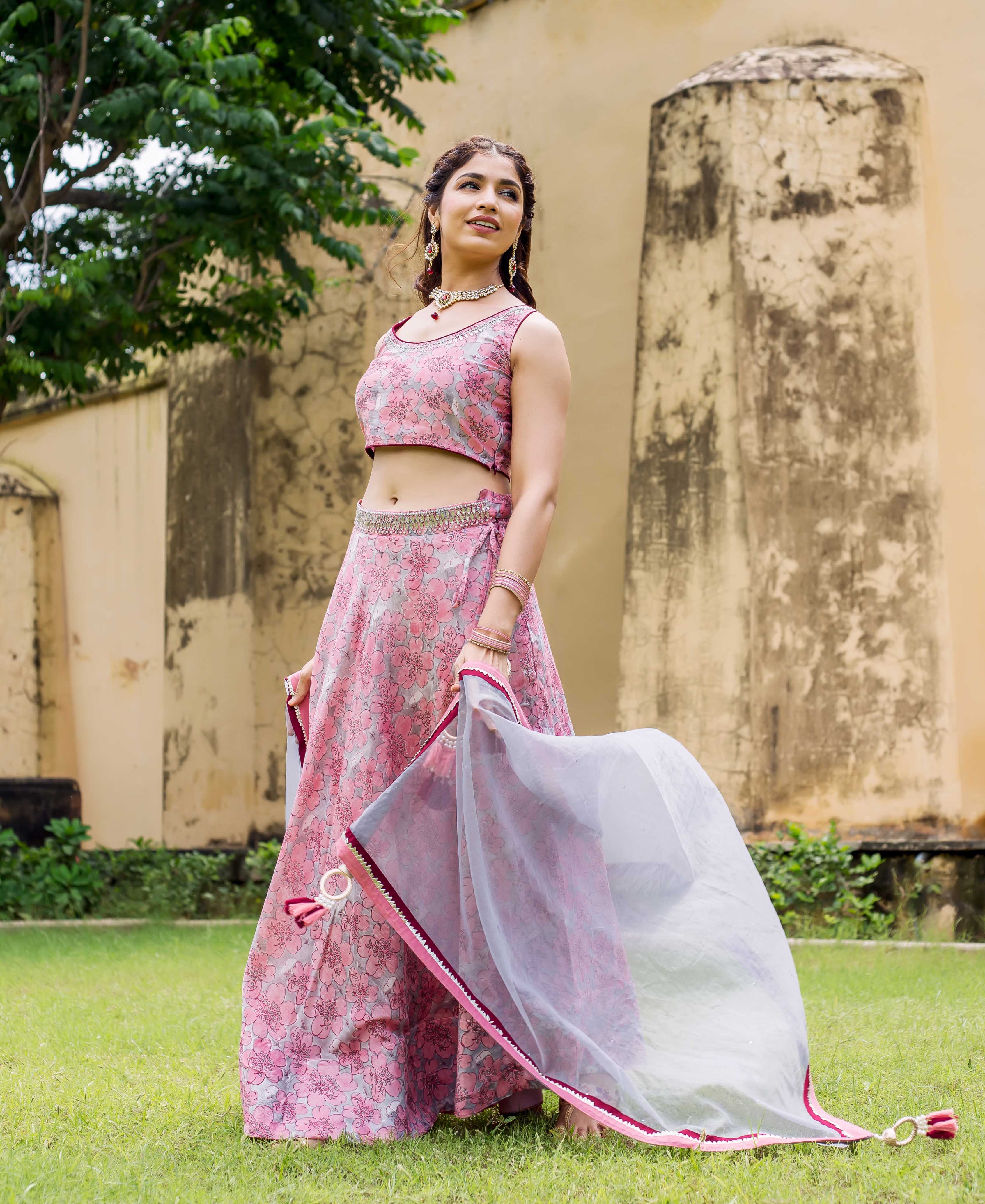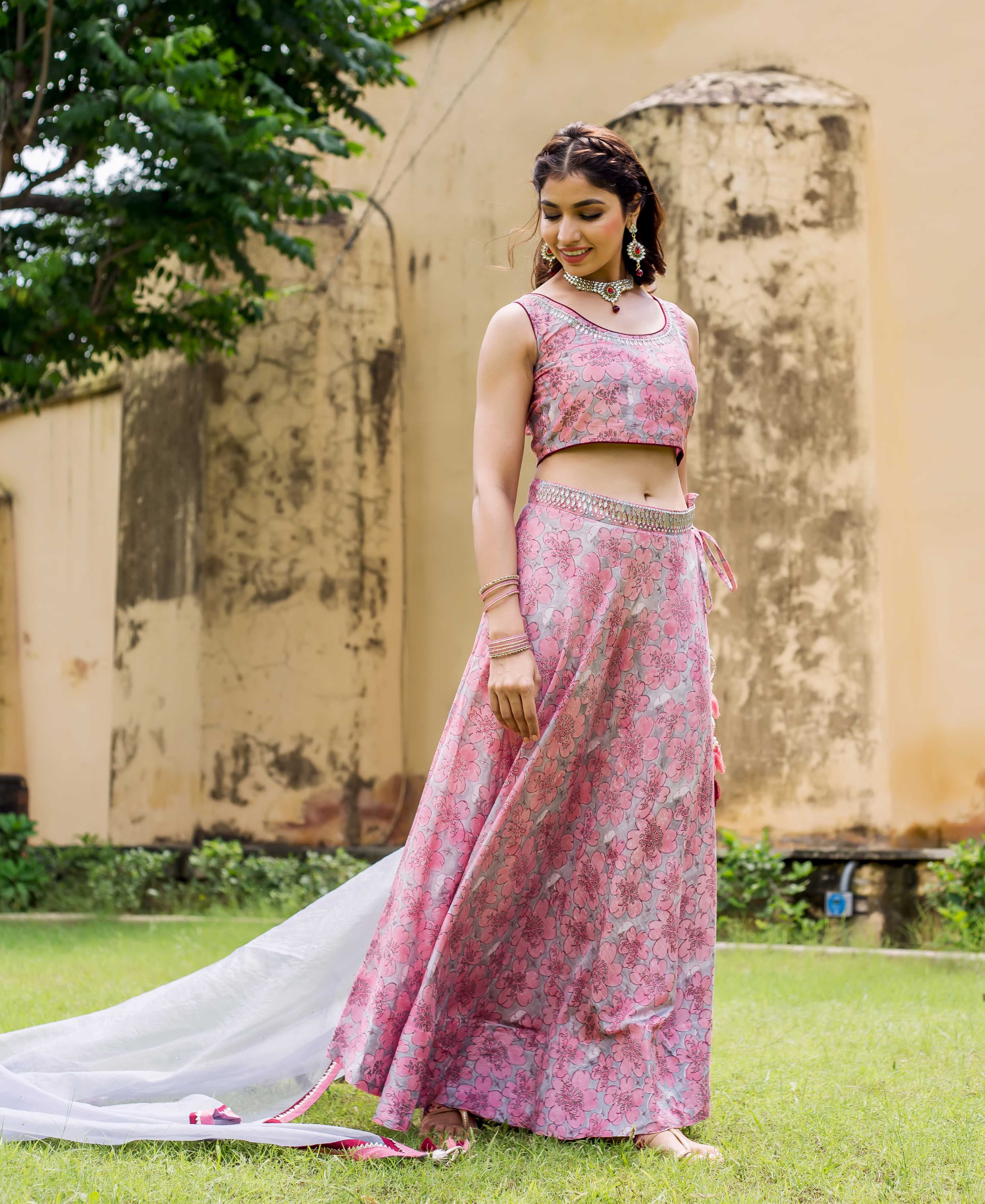 Aayesha Pink and Grey Hand Block Printed Lehenga Set