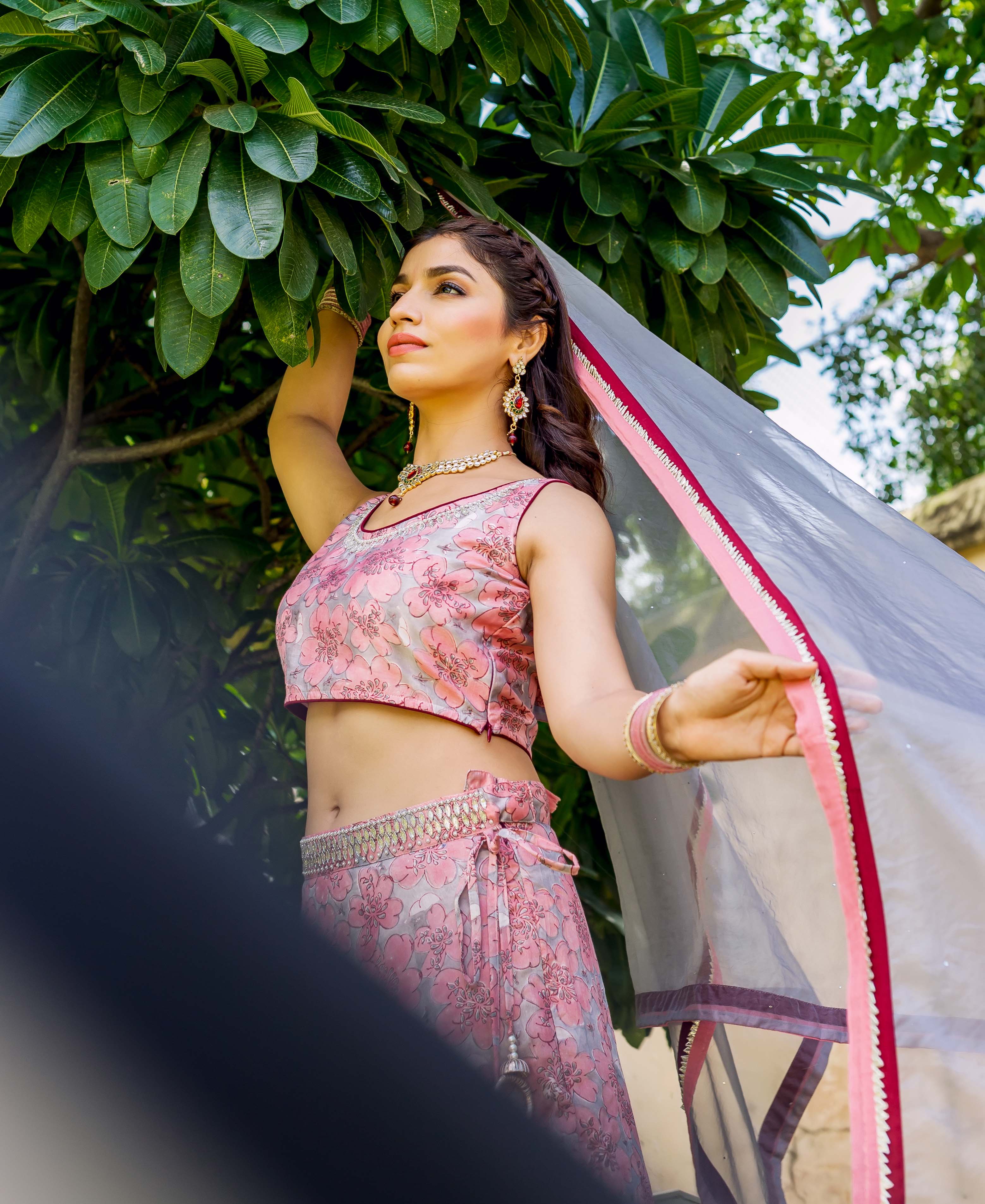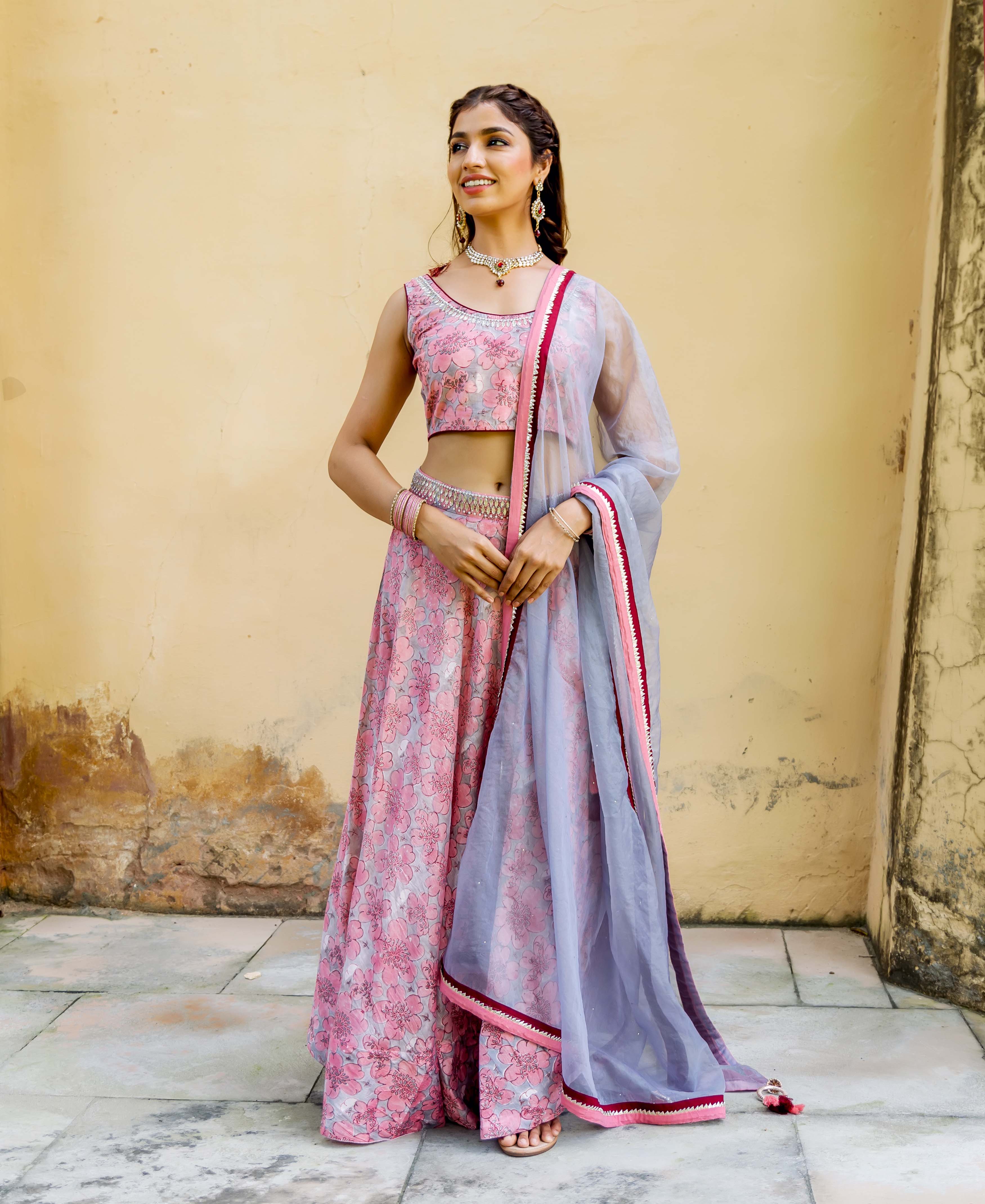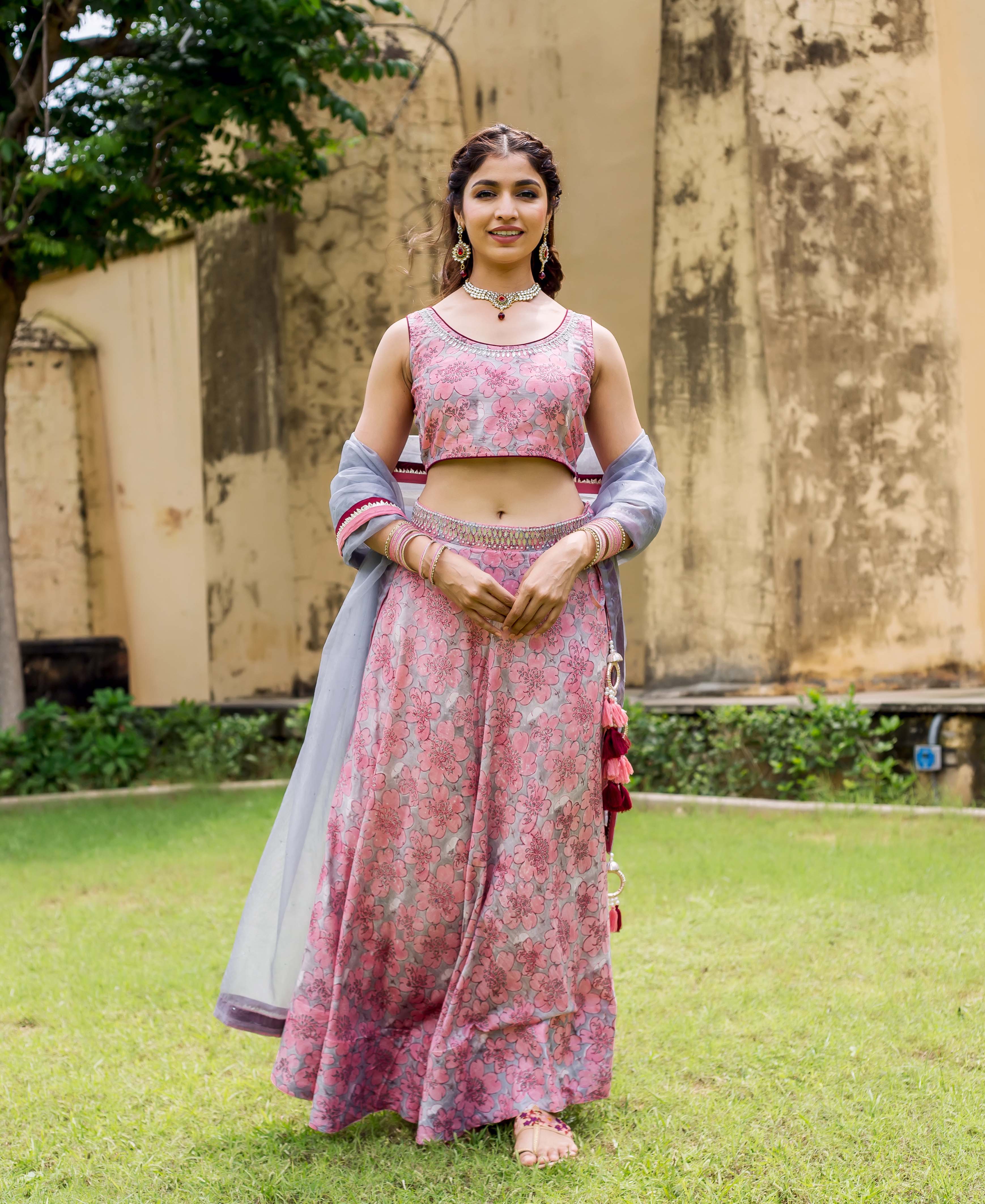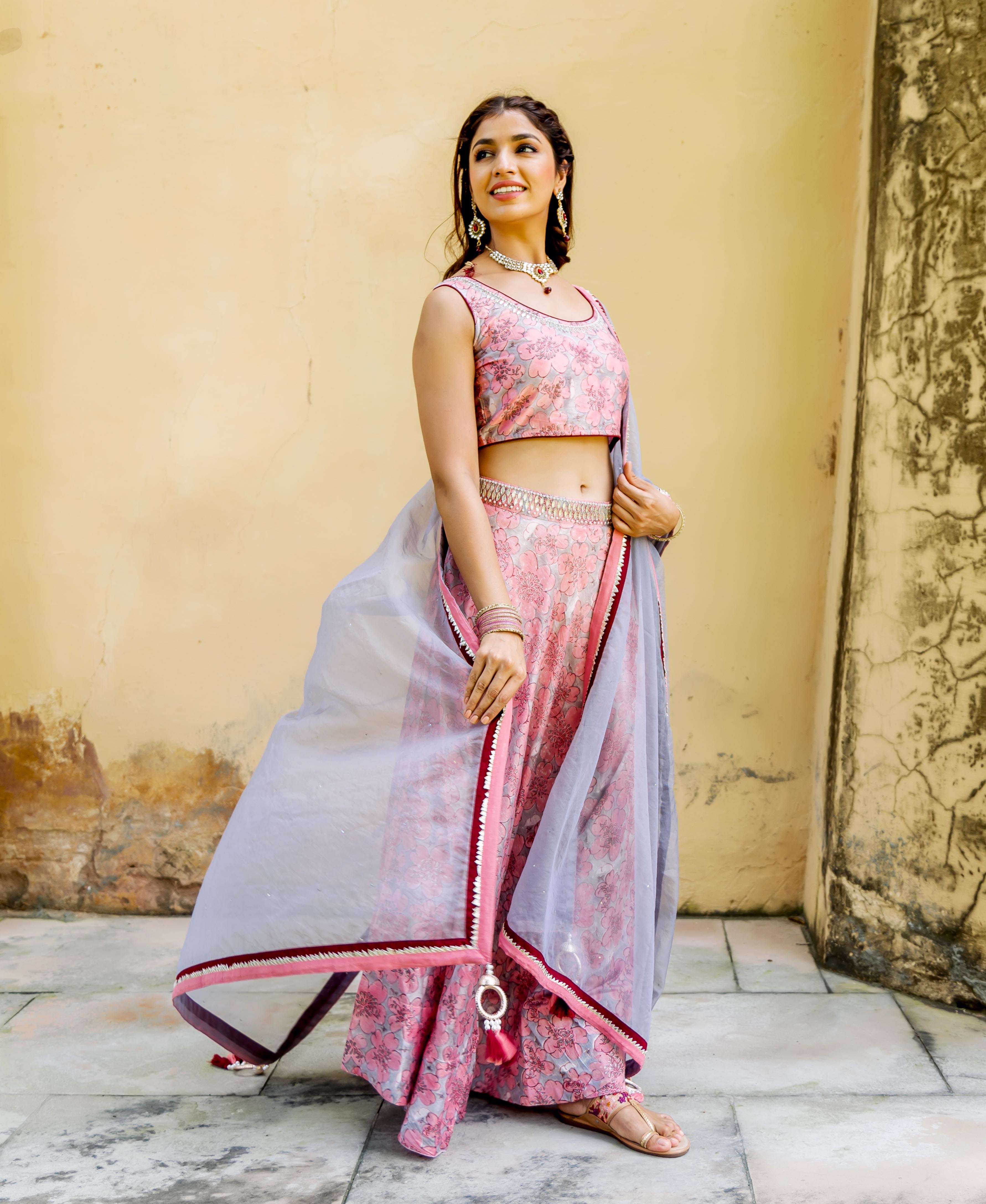 Aayesha Pink and Grey Hand Block Printed Lehenga Set